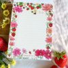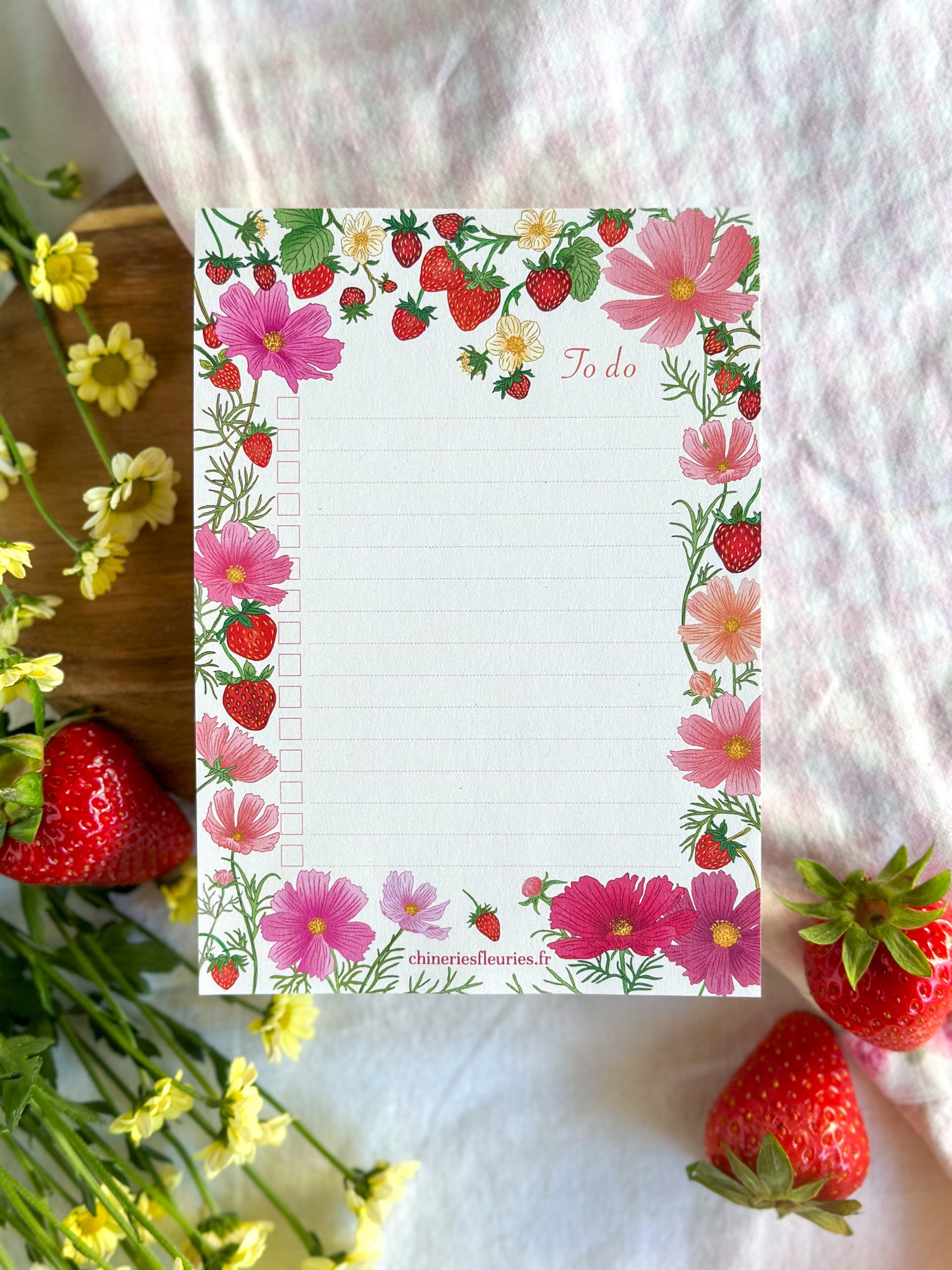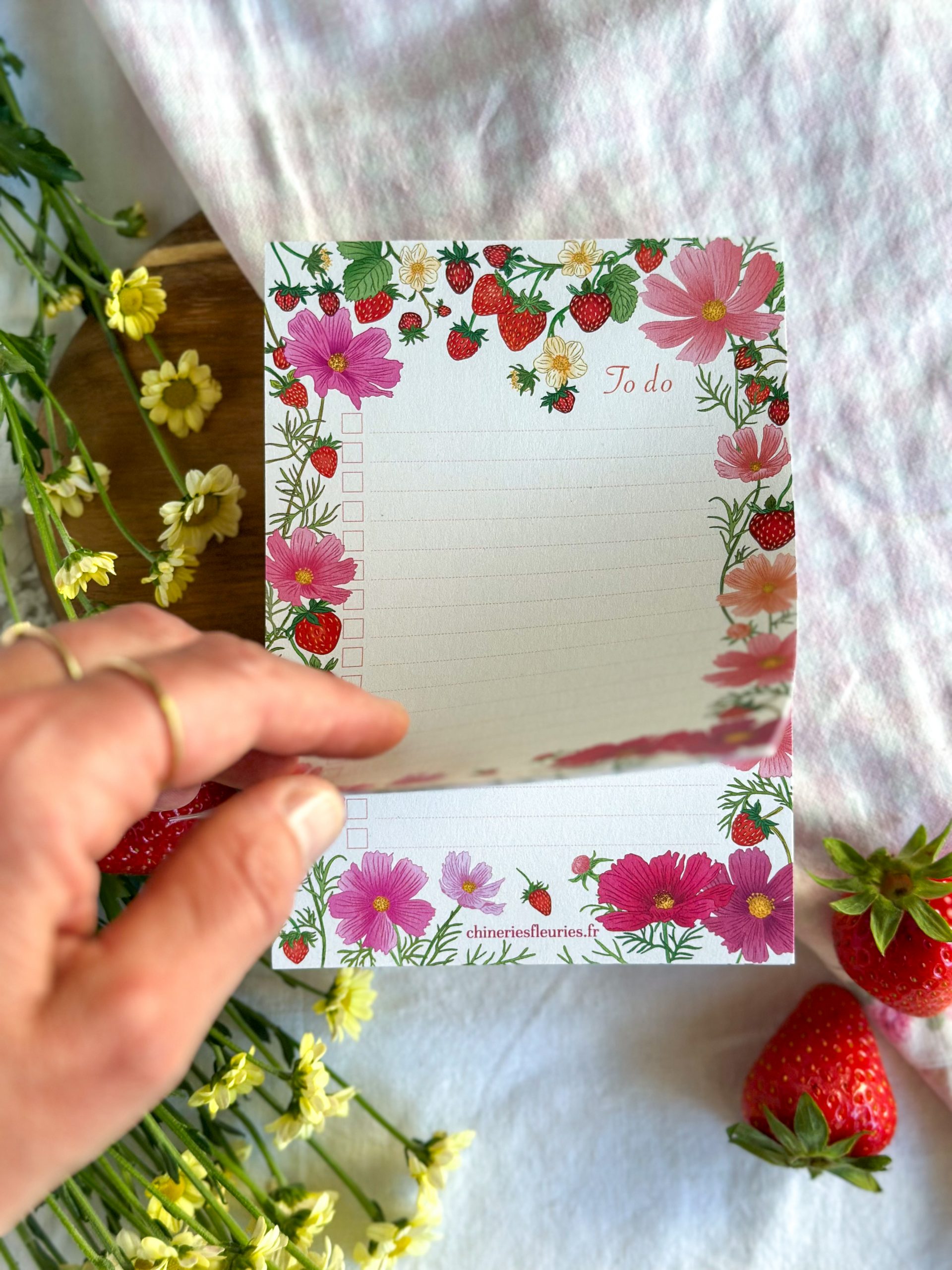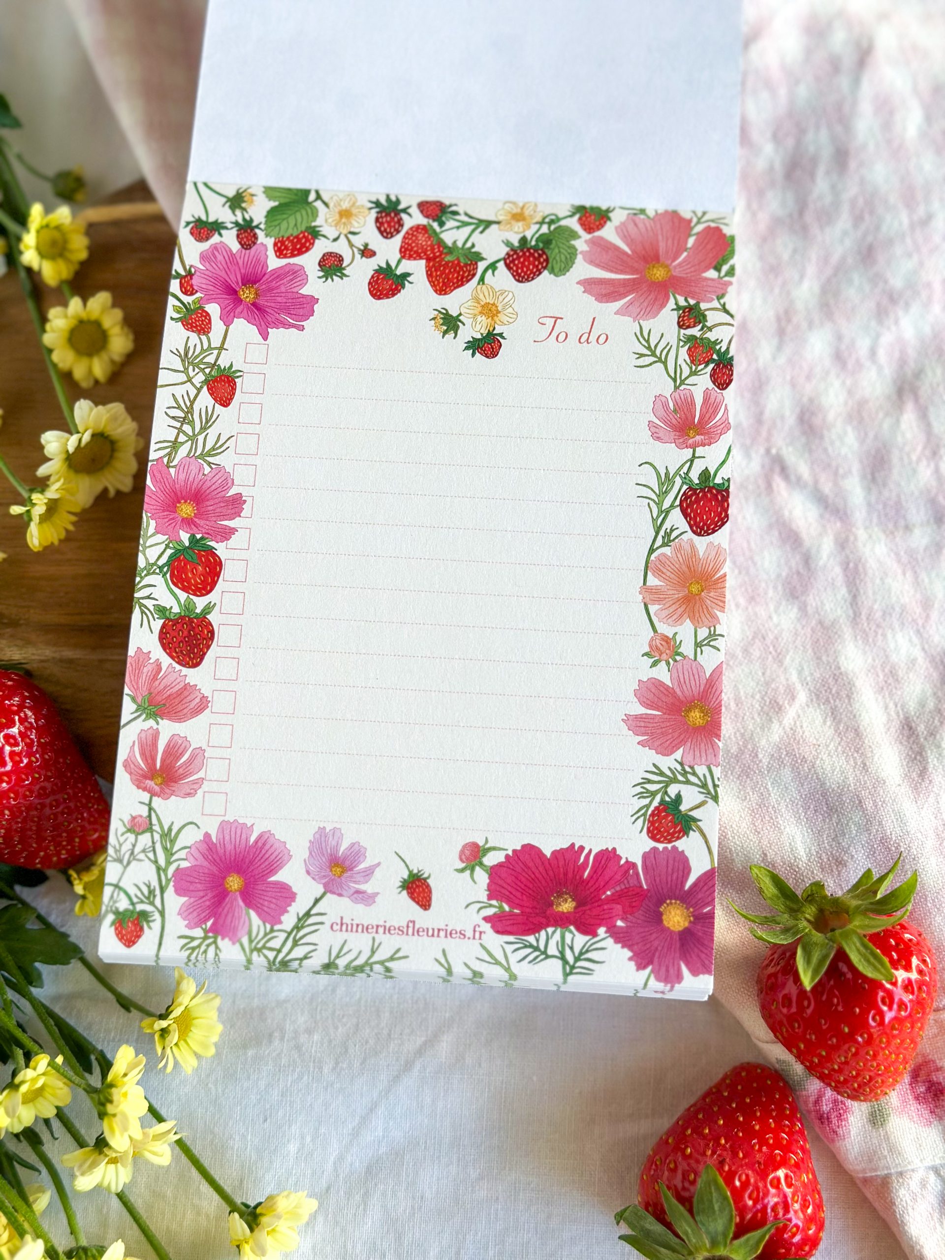 Ce bloc-notes met à l’honneur les fleurs et saveurs estivales : cosmos et fraises se mêlent dans un joli ensemble coloré.