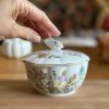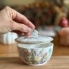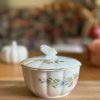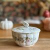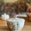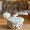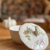 Une superbe boite en porcelaine anglaise ! Coup de cœur pour la finesse de ses dessins et sa porcelaine si délicate. Ce pot avec couvercle est décoré de fleurs aux couleurs douces. Le couvercle a une jolie poignée en forme de papillon et est réhaussé avec de belles dorures.