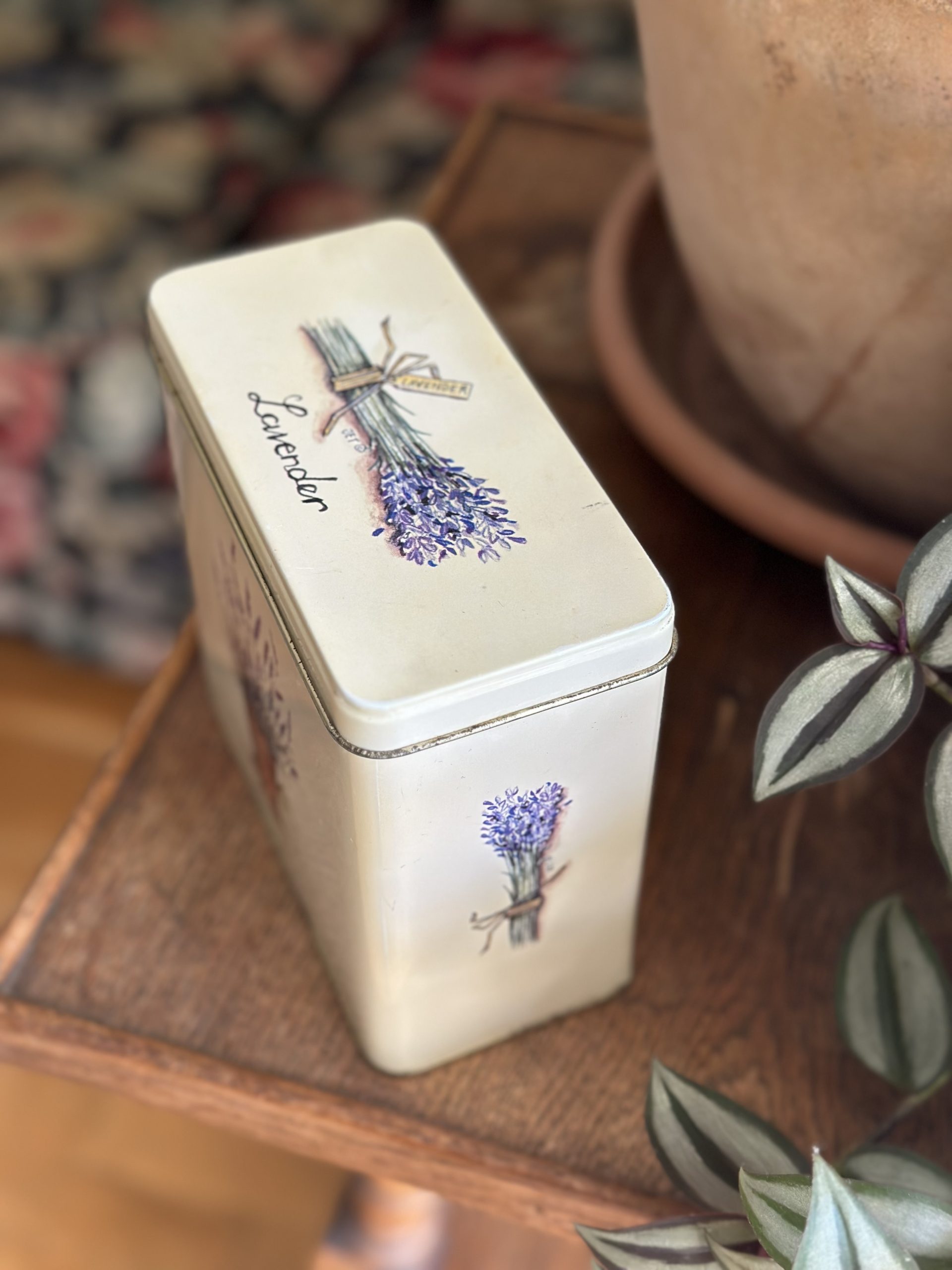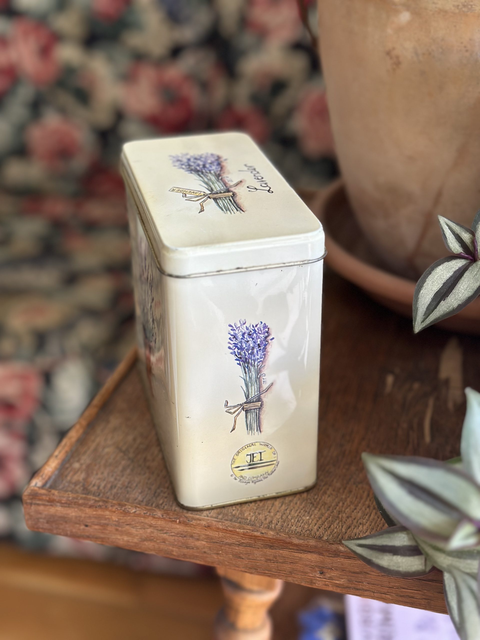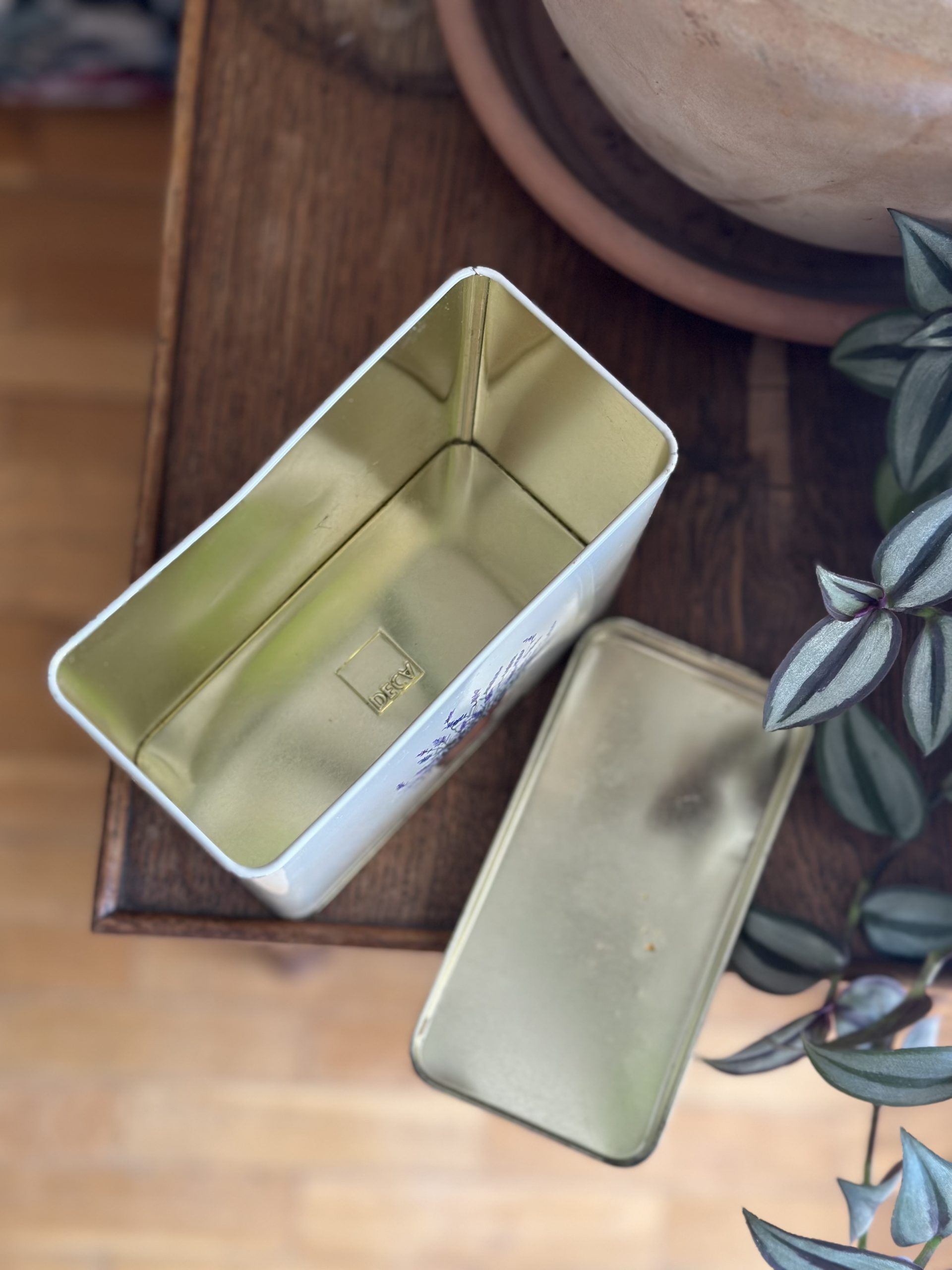 Superbe boite vintage en métal ! On adore ses dessins qui nous plongent en été : une jolie potée et des petits bouquets de lavande.