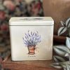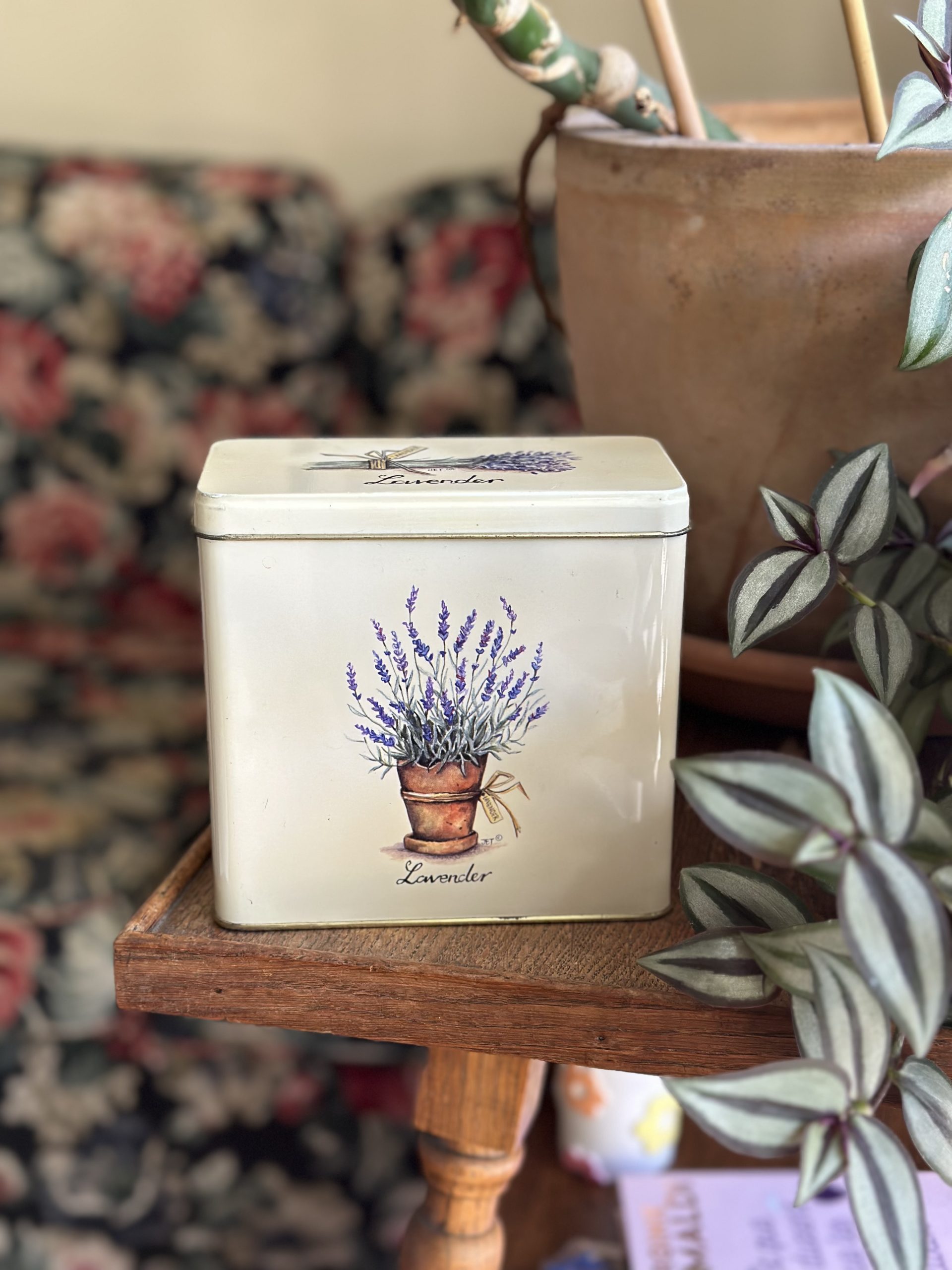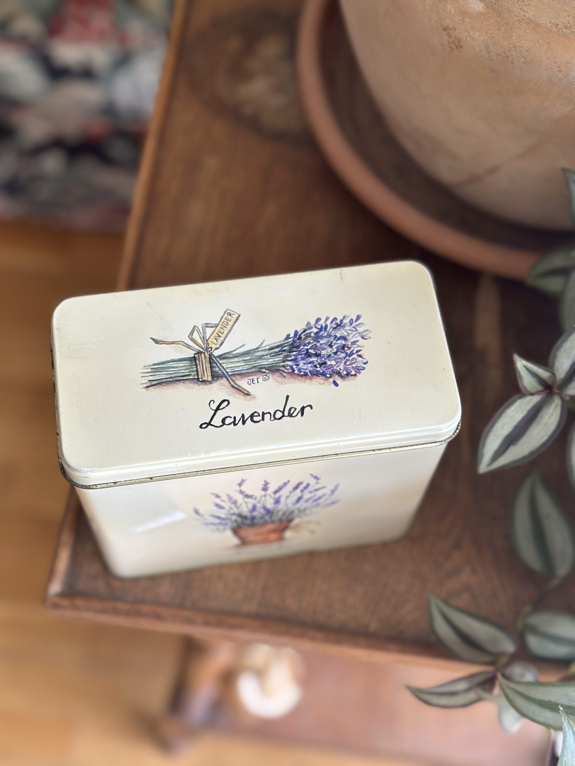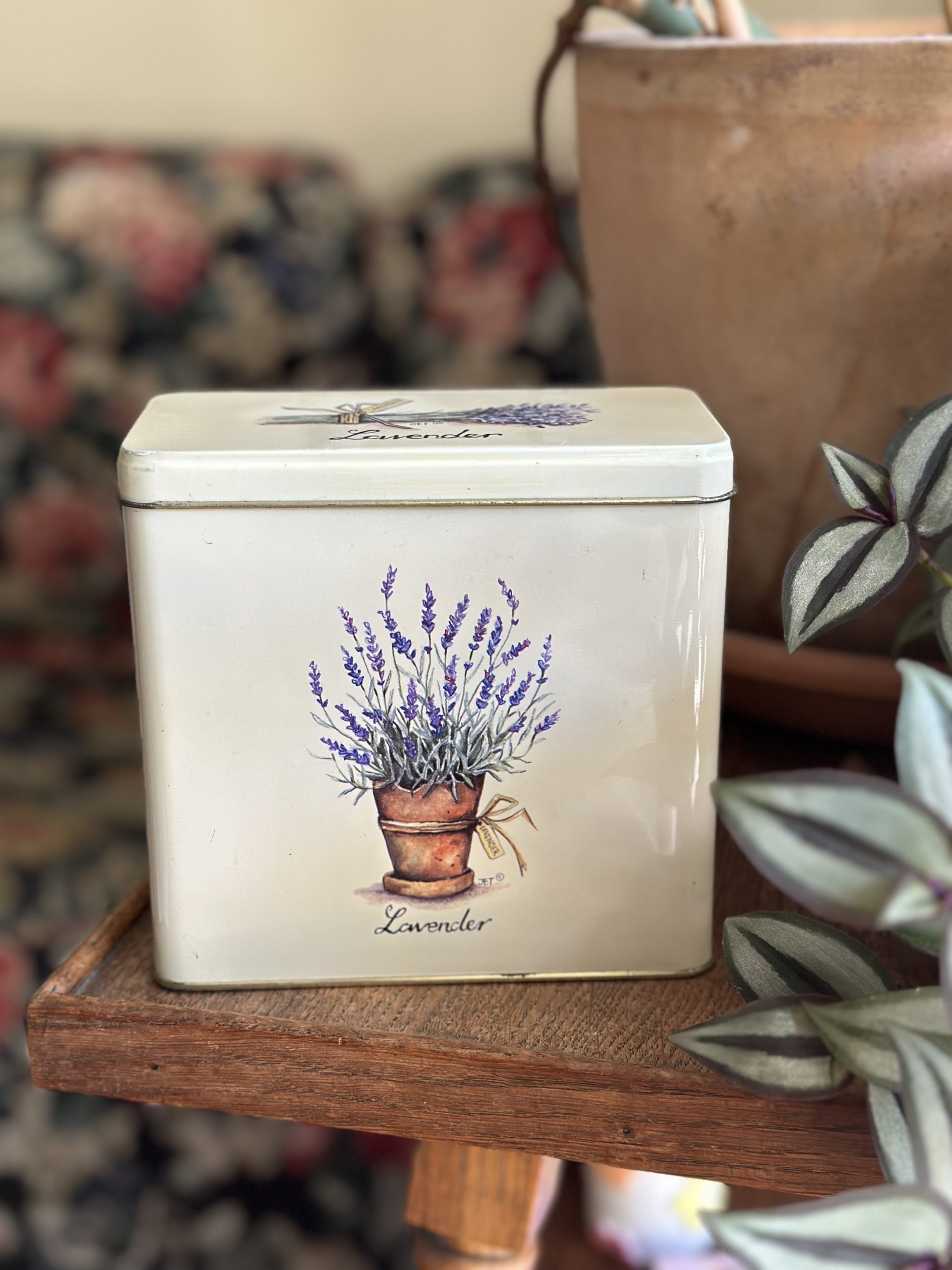 Superbe boite vintage en métal ! On adore ses dessins qui nous plongent en été : une jolie potée et des petits bouquets de lavande.