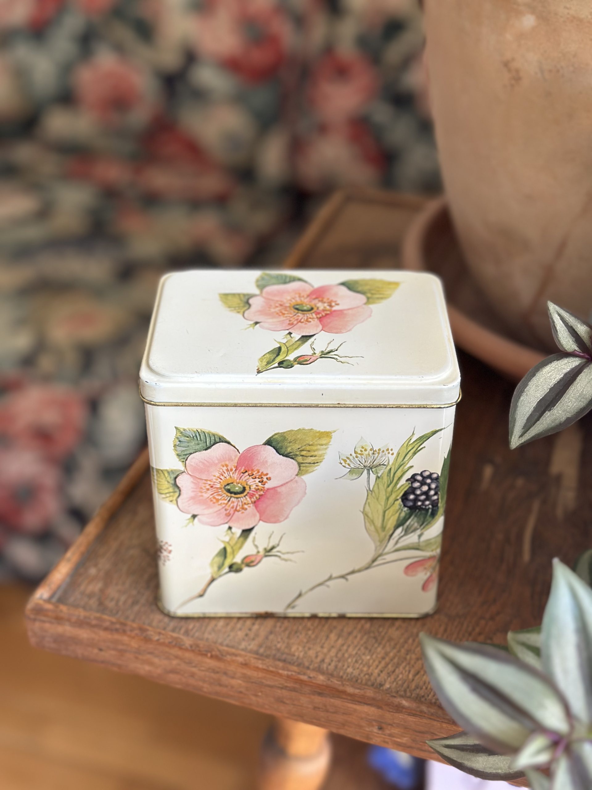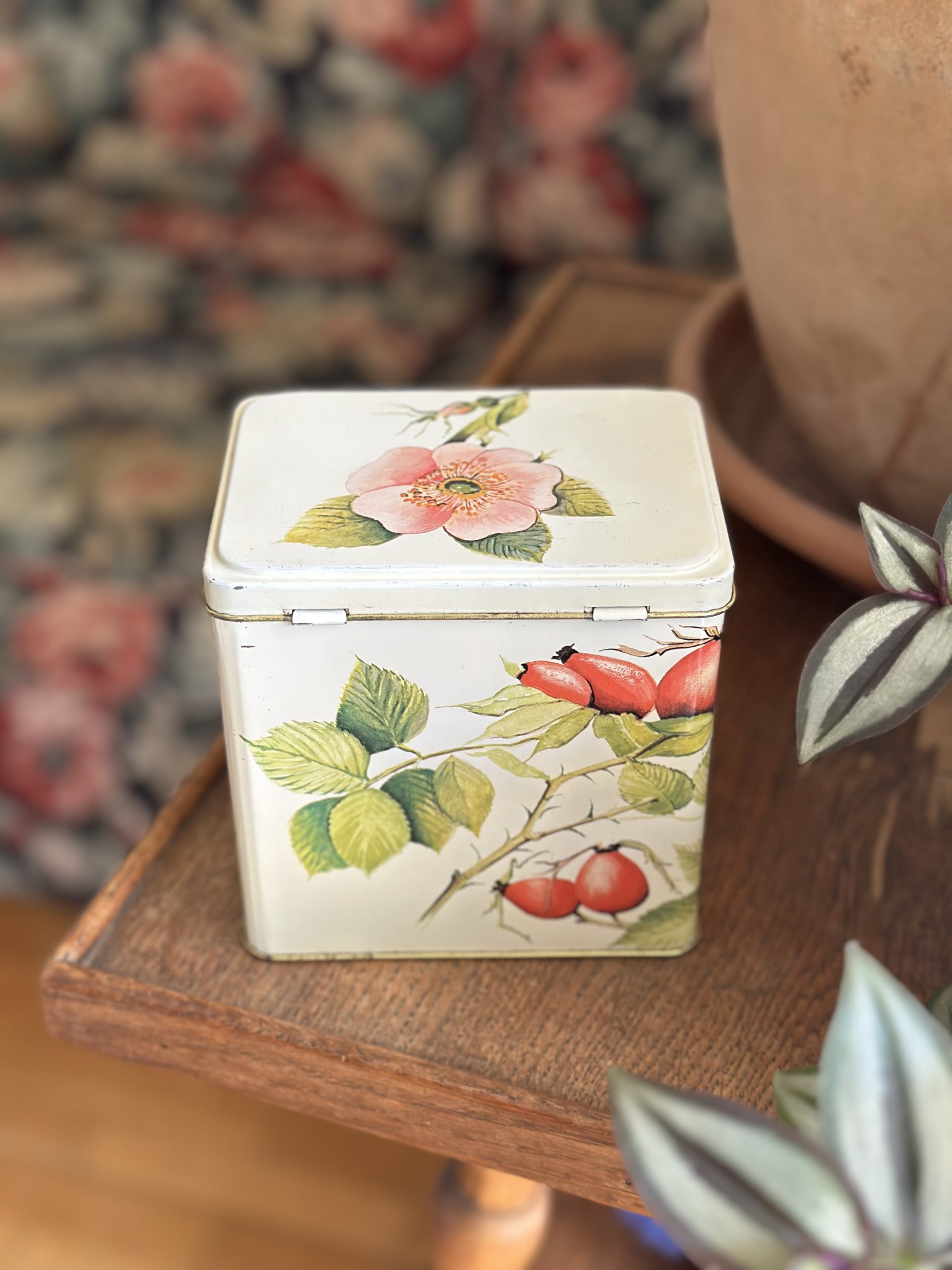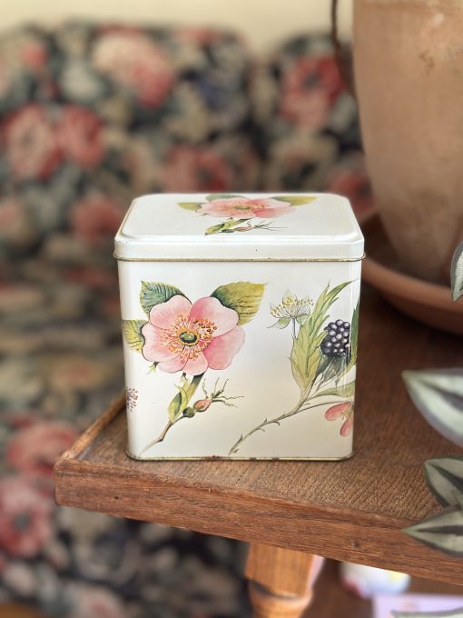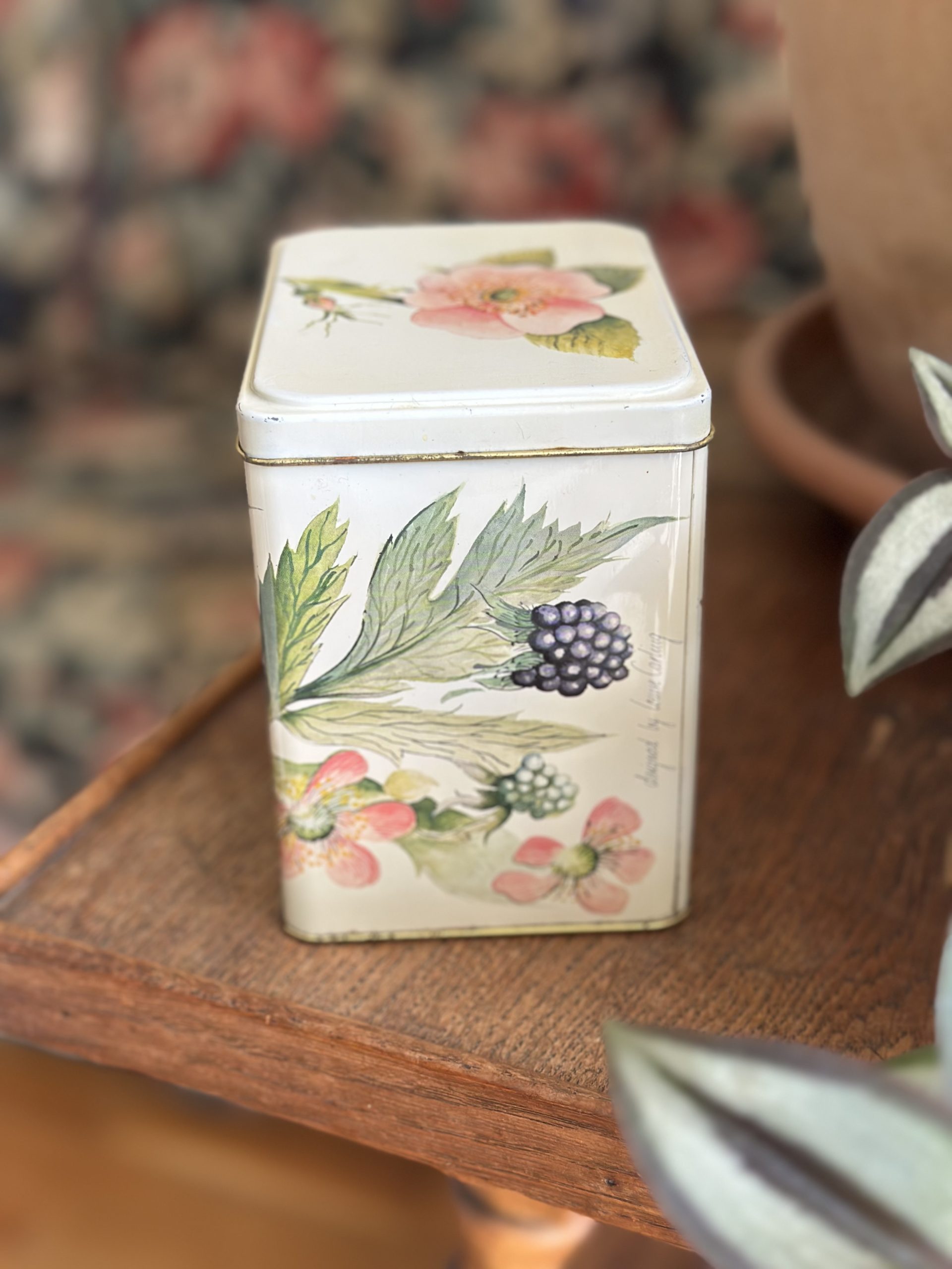 Très jolie boite vintage ! Cette boite rectangulaire faite en Angleterre est décorée de fleurs d’églantiers et de mûres. Parfaite pour une déco !
