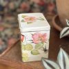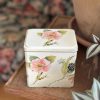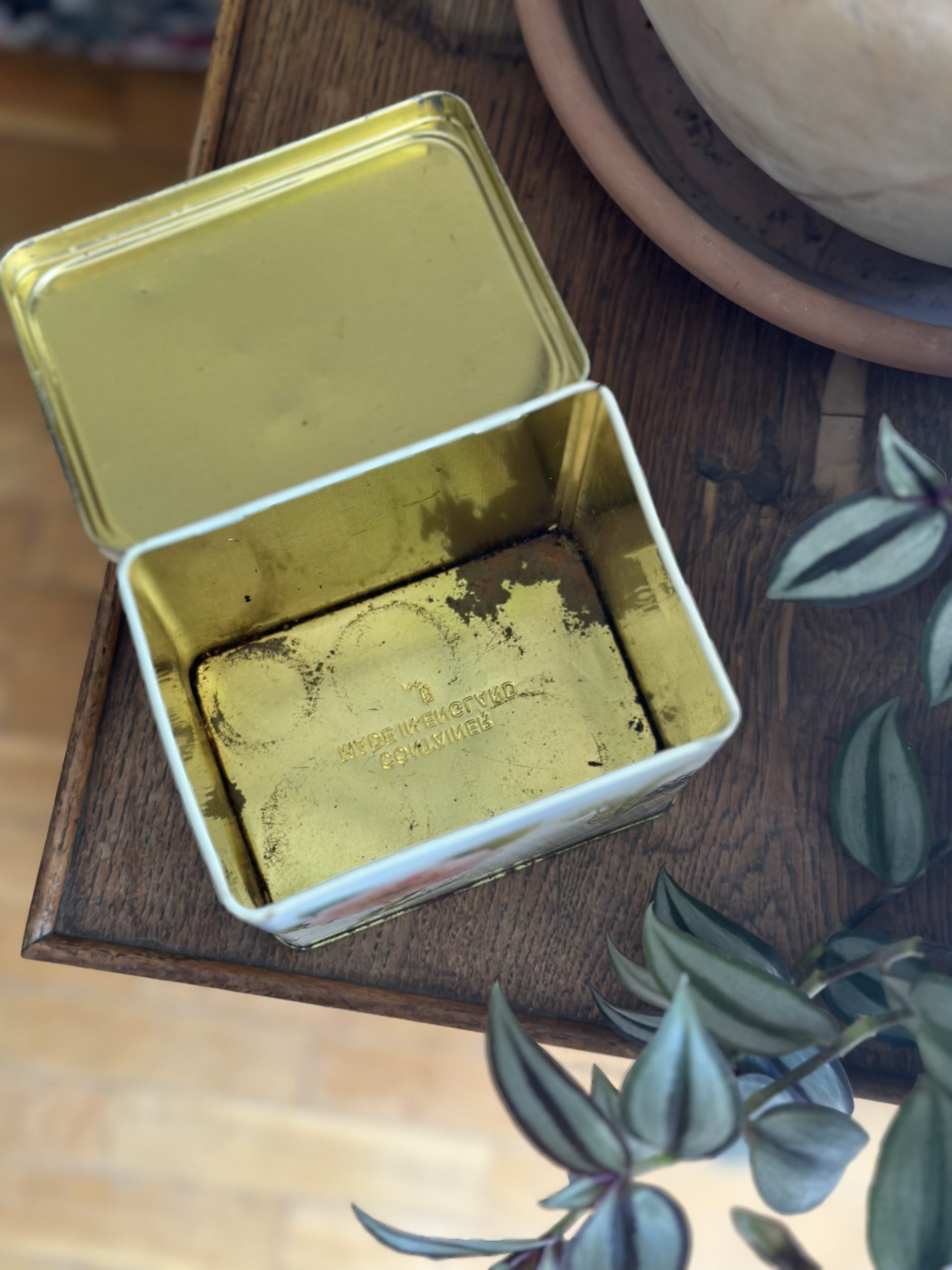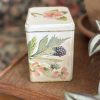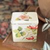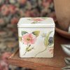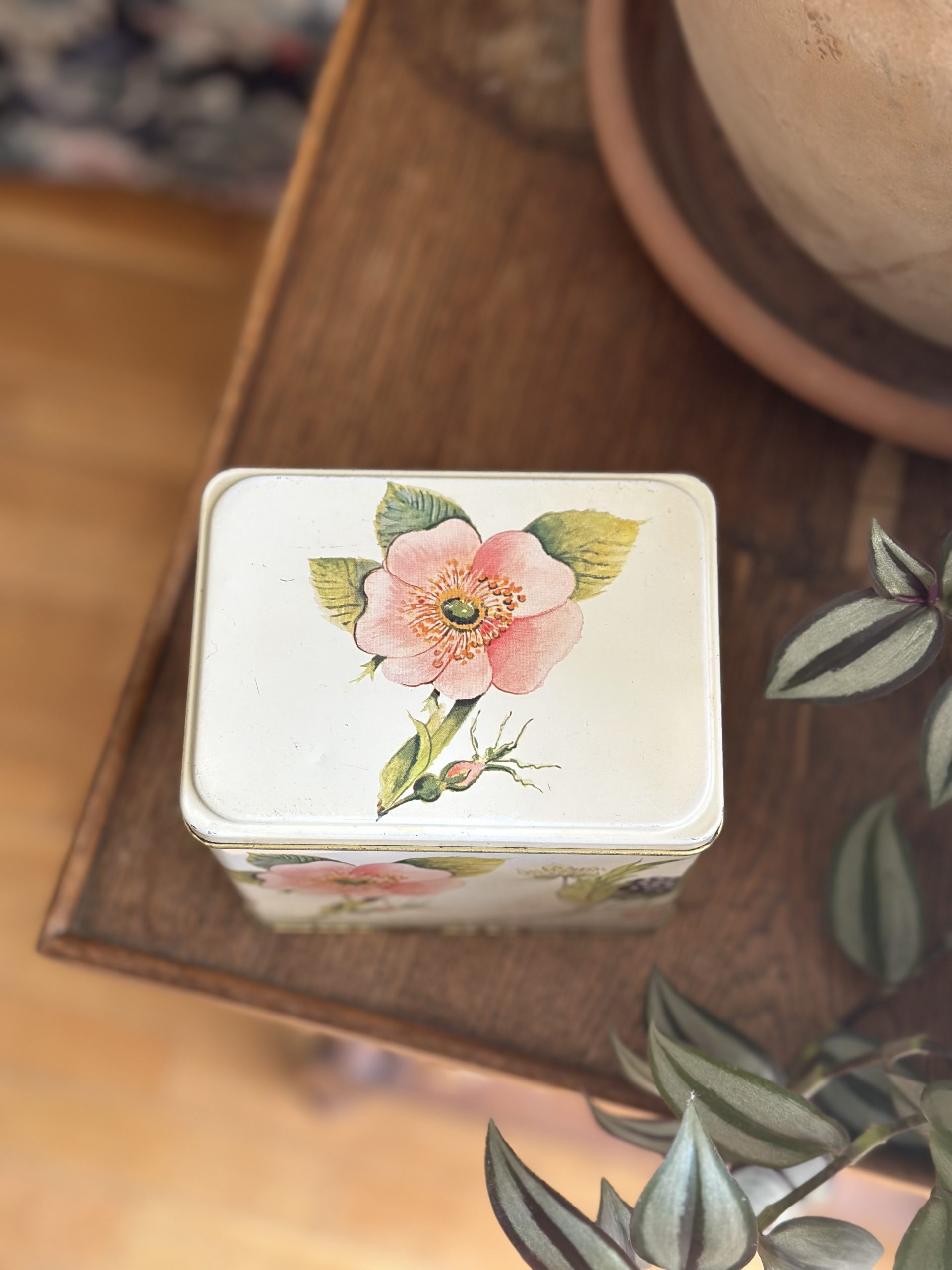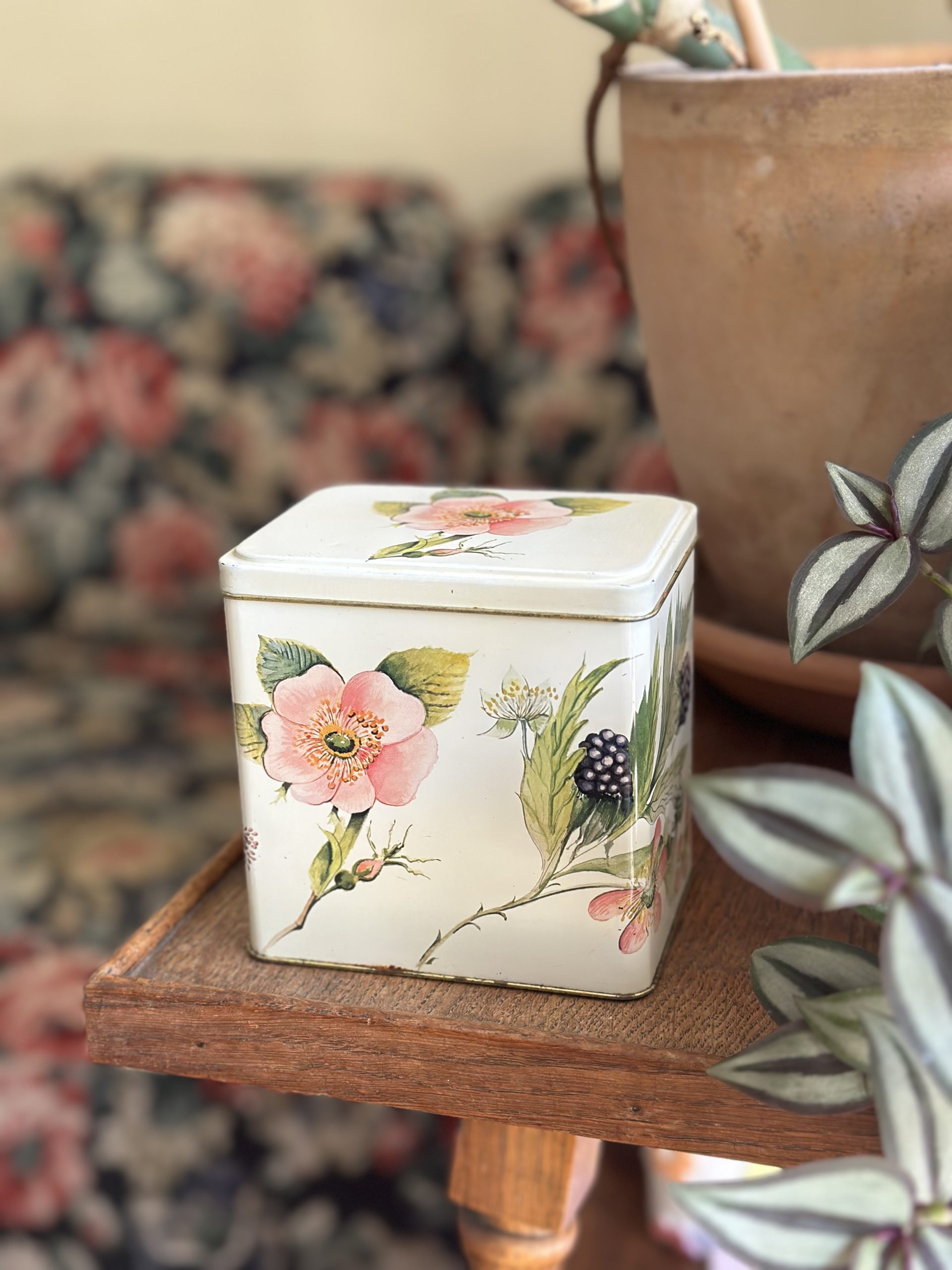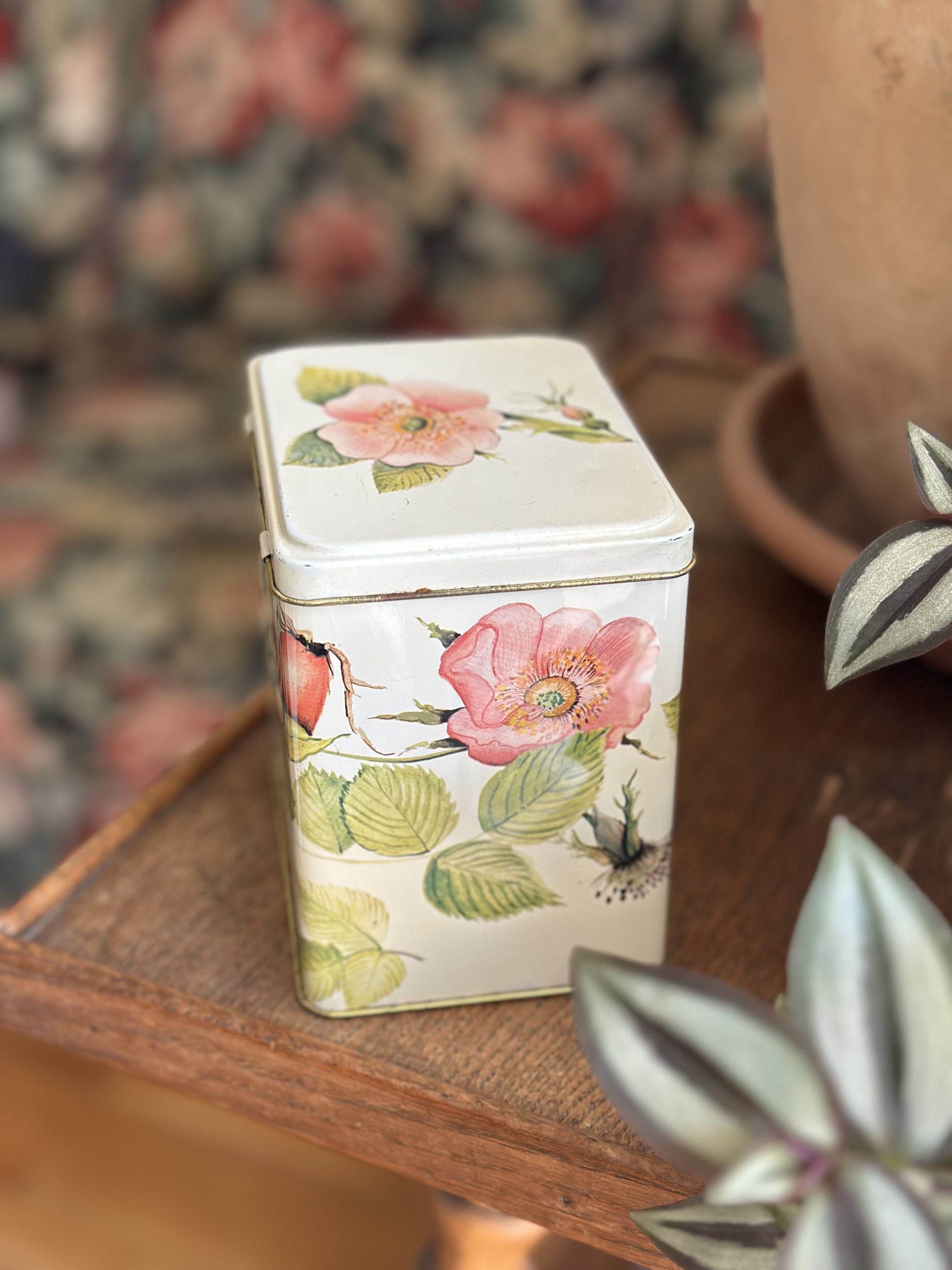 Très jolie boite vintage ! Cette boite rectangulaire faite en Angleterre est décorée de fleurs d’églantiers et de mûres. Parfaite pour une déco !