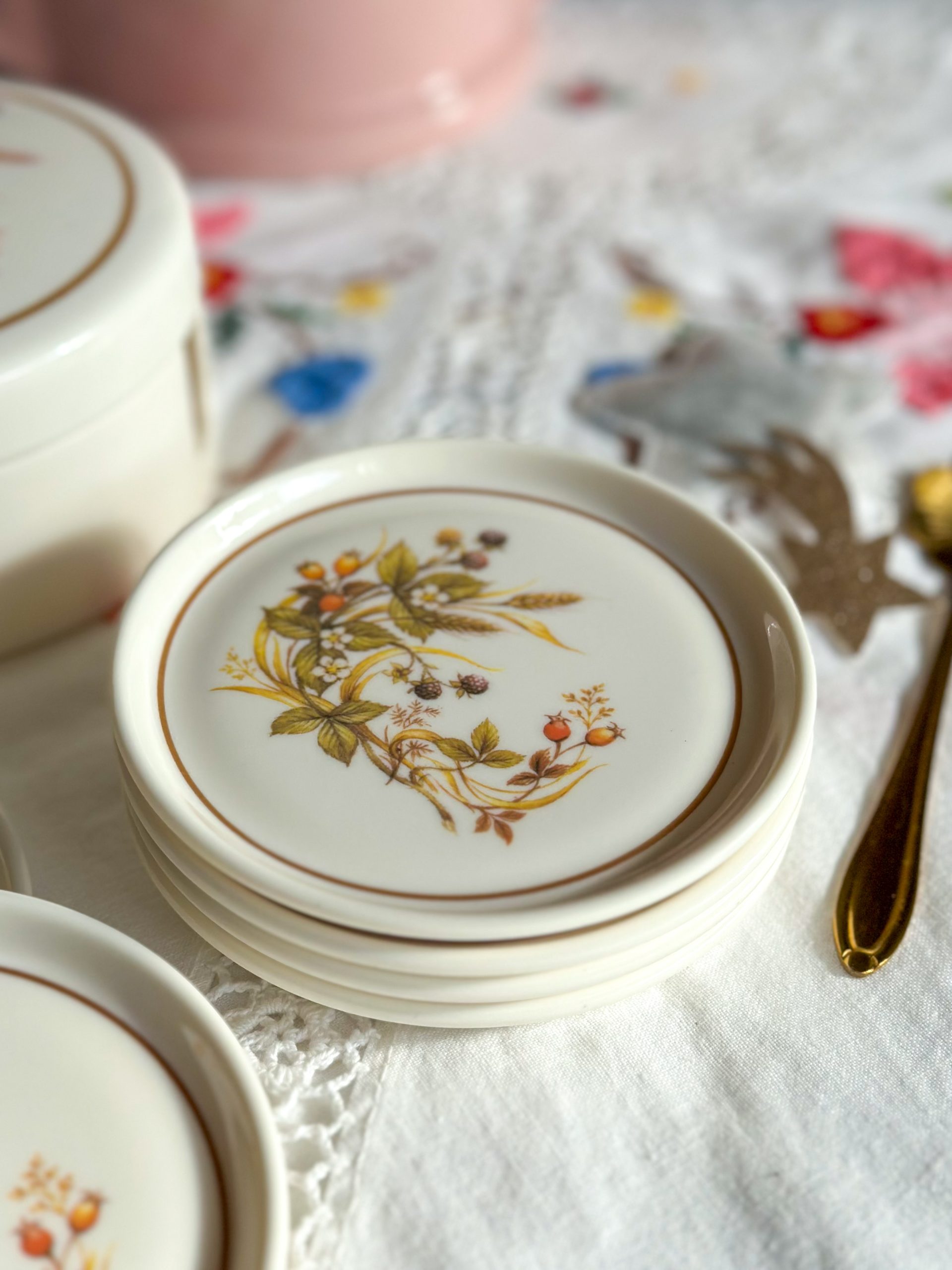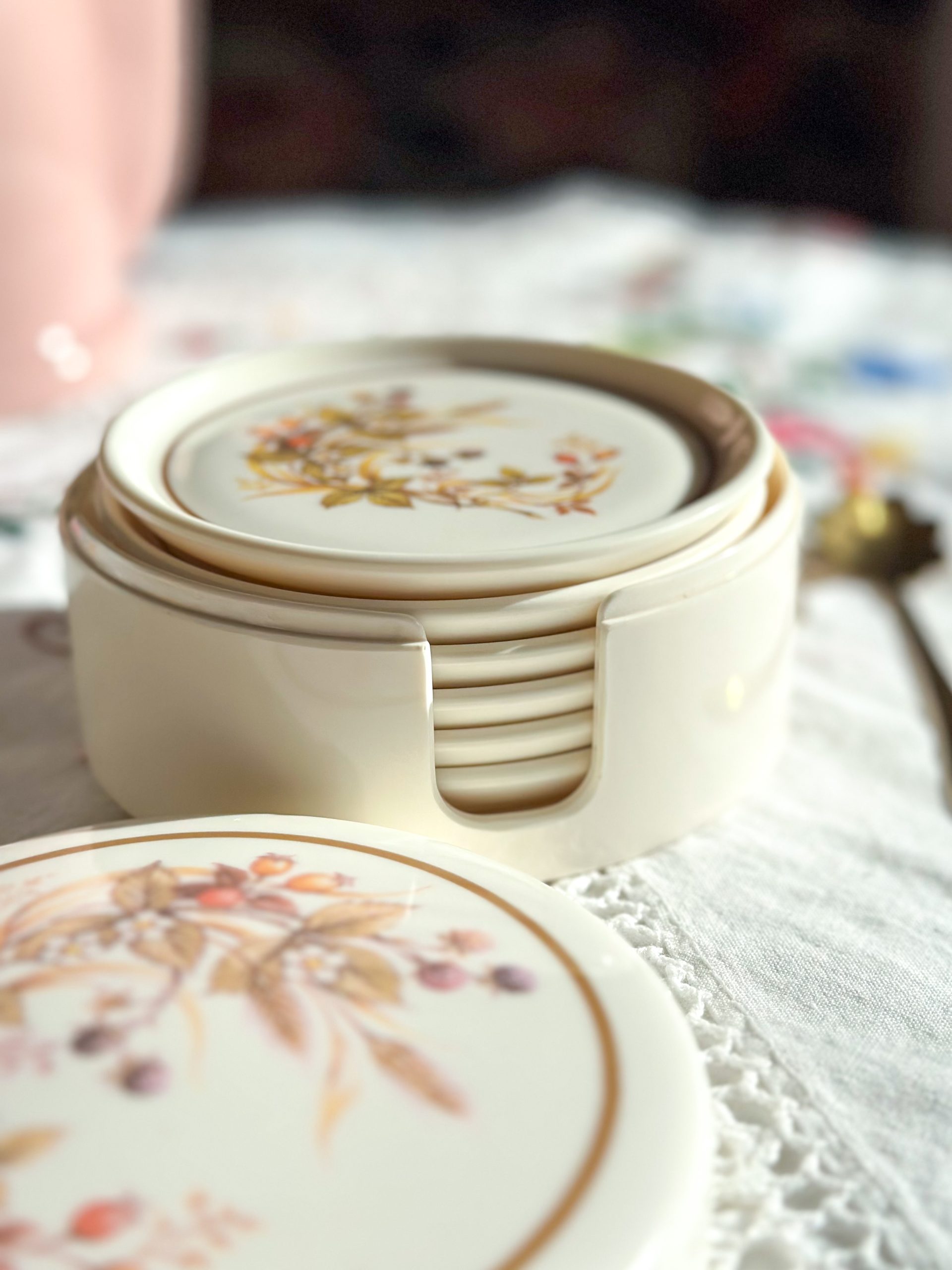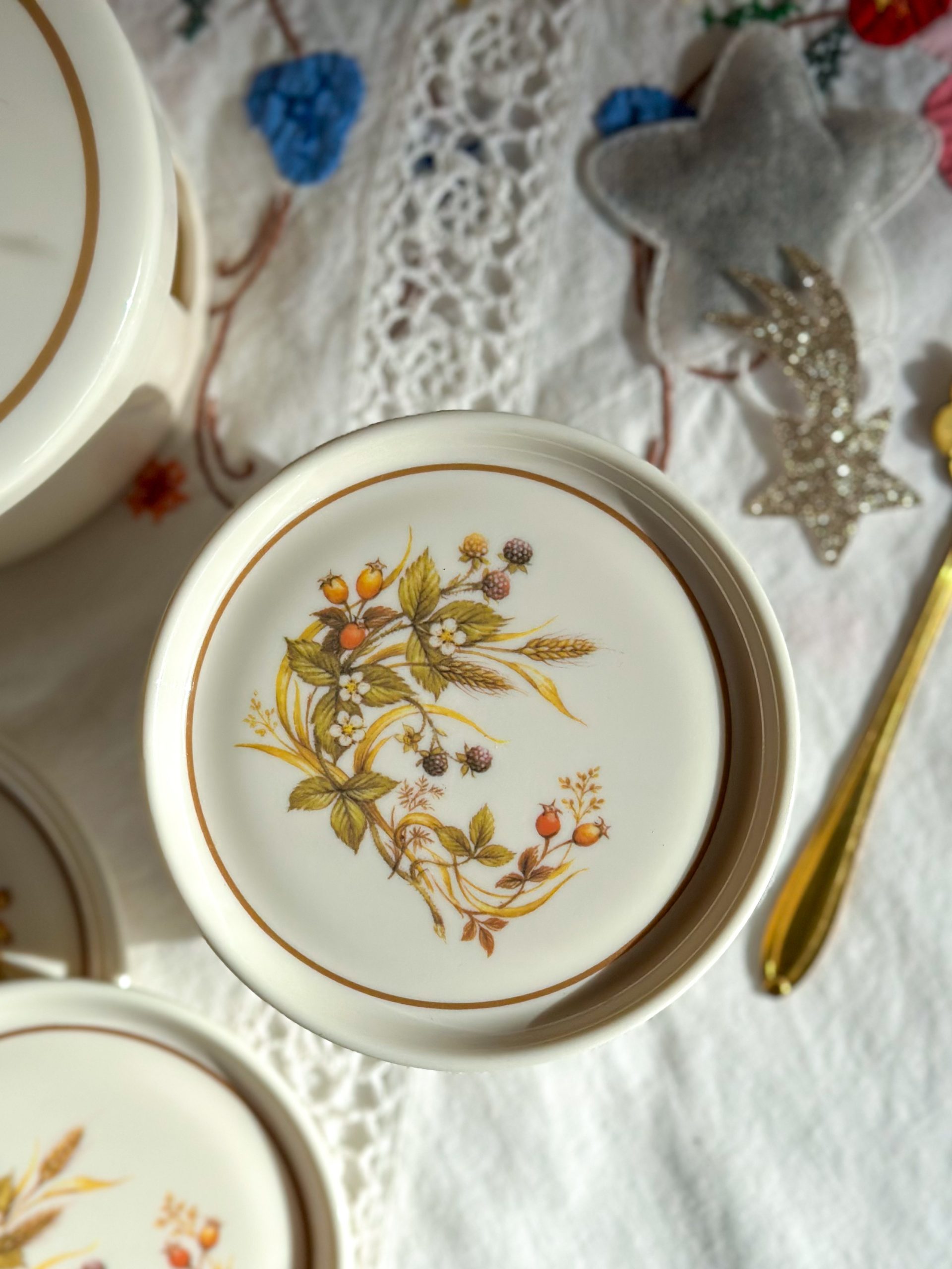 Superbe coffret vintage ! Ces 6 dessous de verres ronds ont de superbes dessins de mûres et baies d’églantiers. En mélamine, ils seront parfaits pour protéger et décorer votre table avec poésie.
