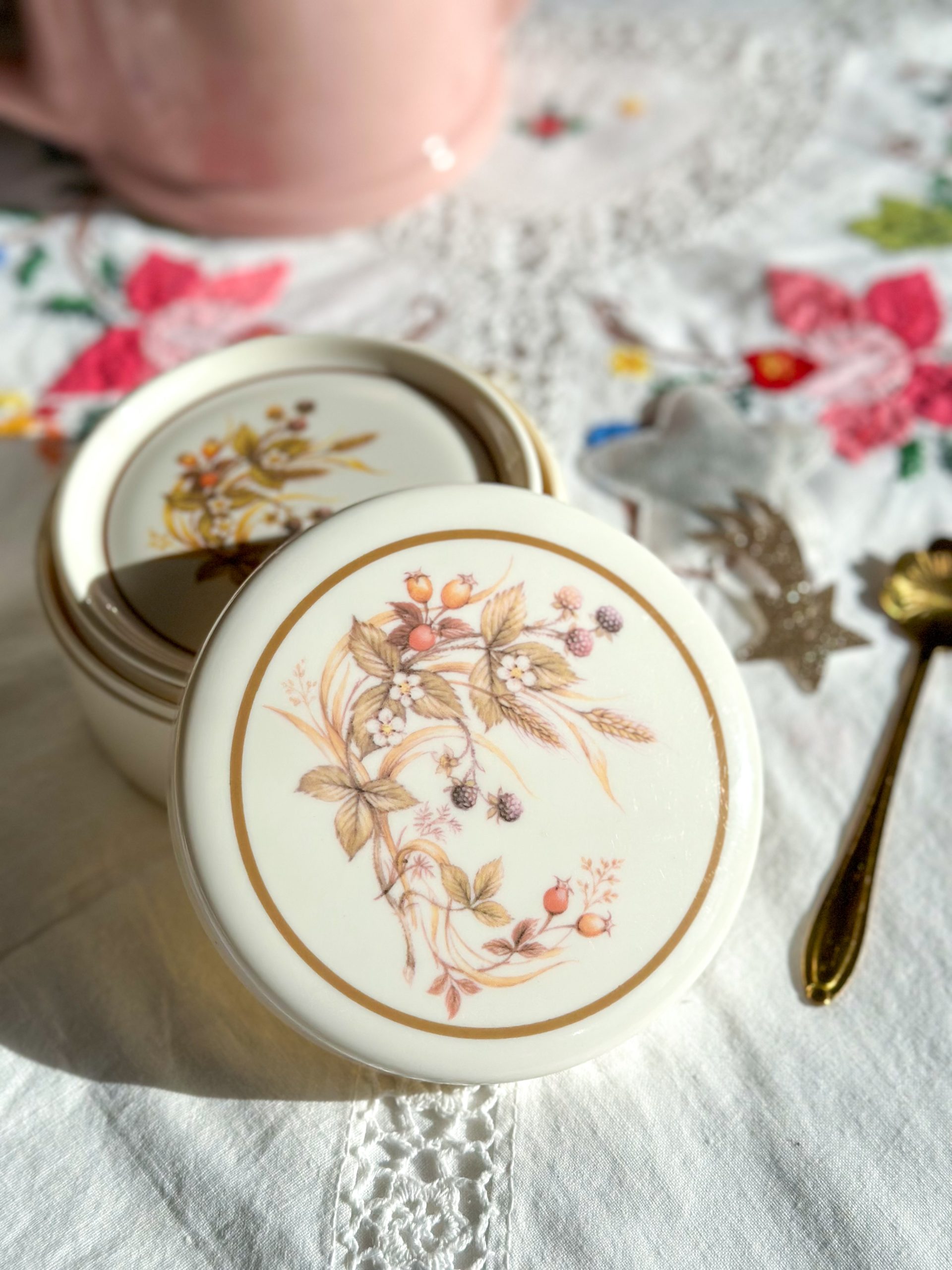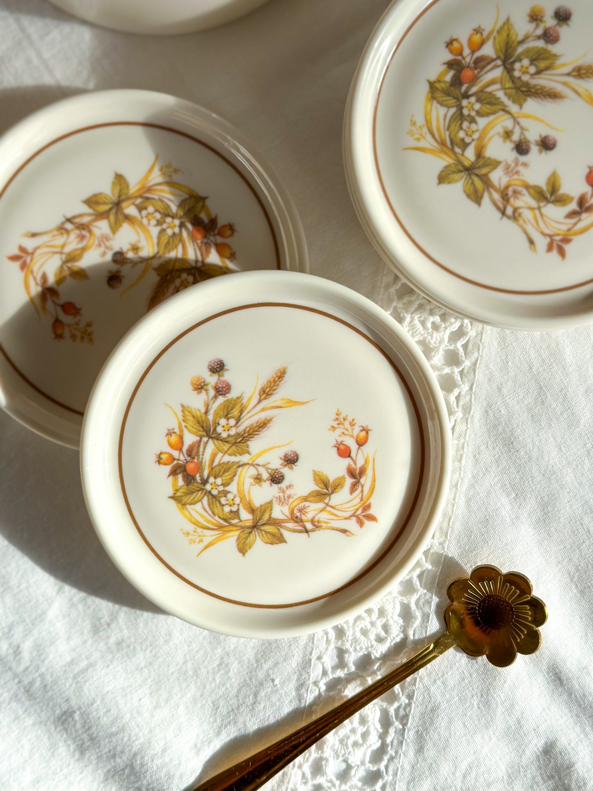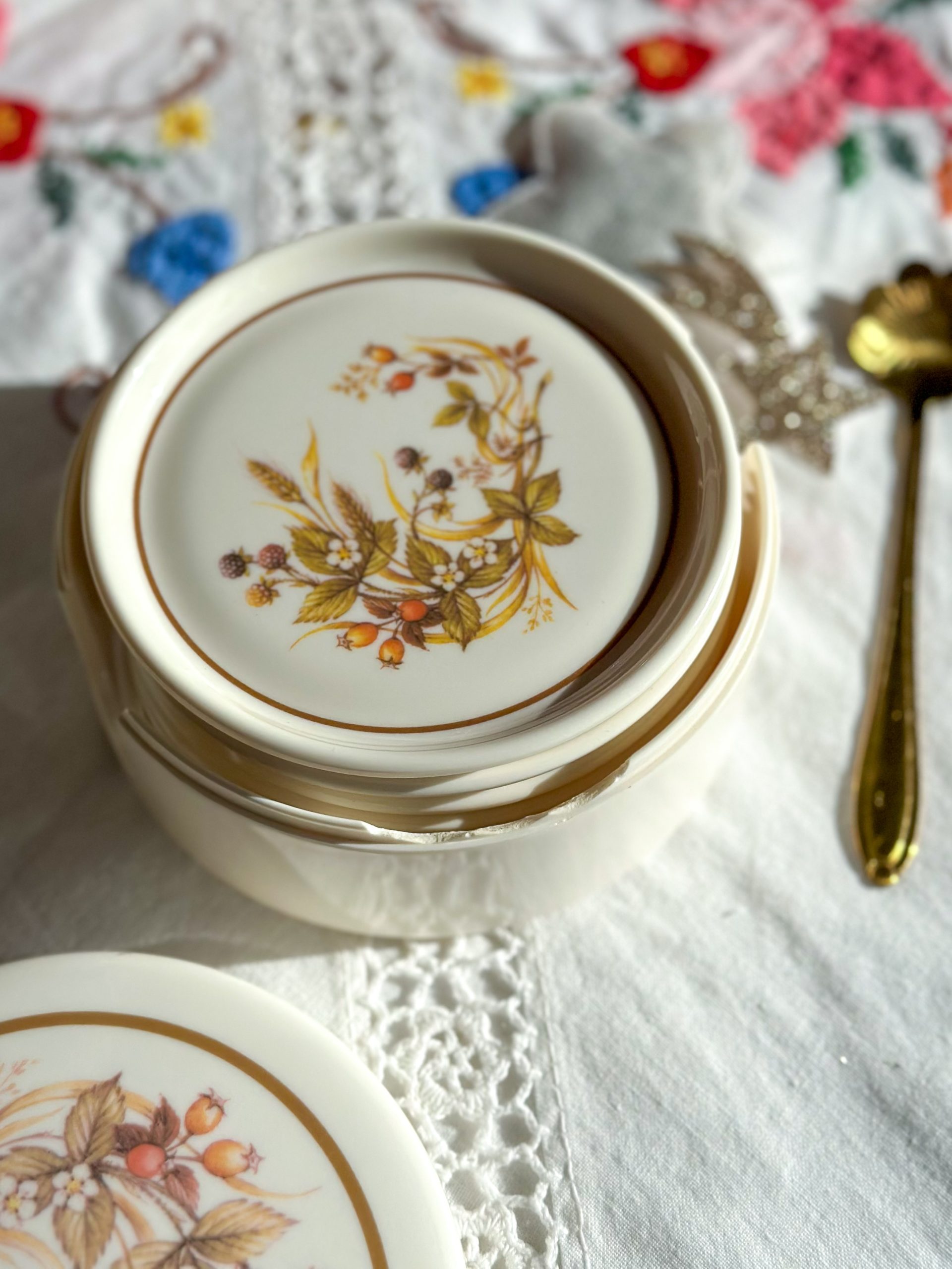 Superbe coffret vintage ! Ces 6 dessous de verres ronds ont de superbes dessins de mûres et baies d’églantiers. En mélamine, ils seront parfaits pour protéger et décorer votre table avec poésie.