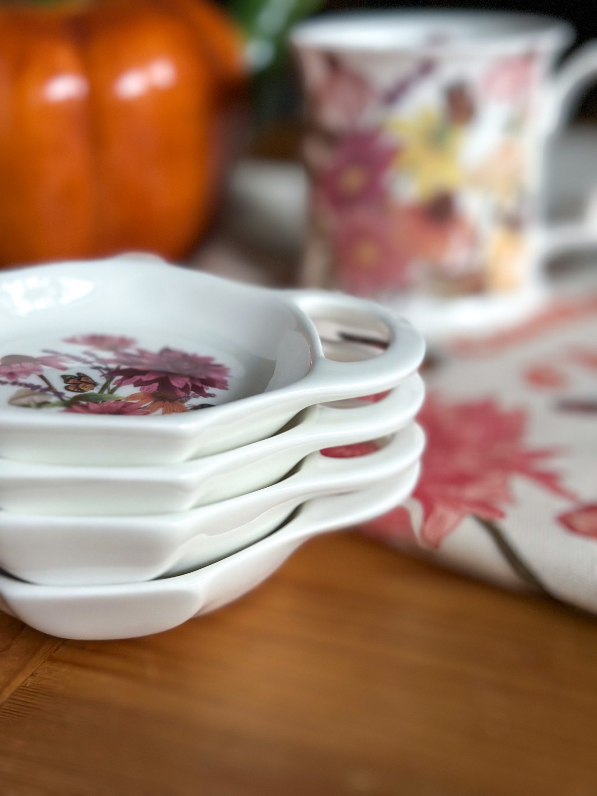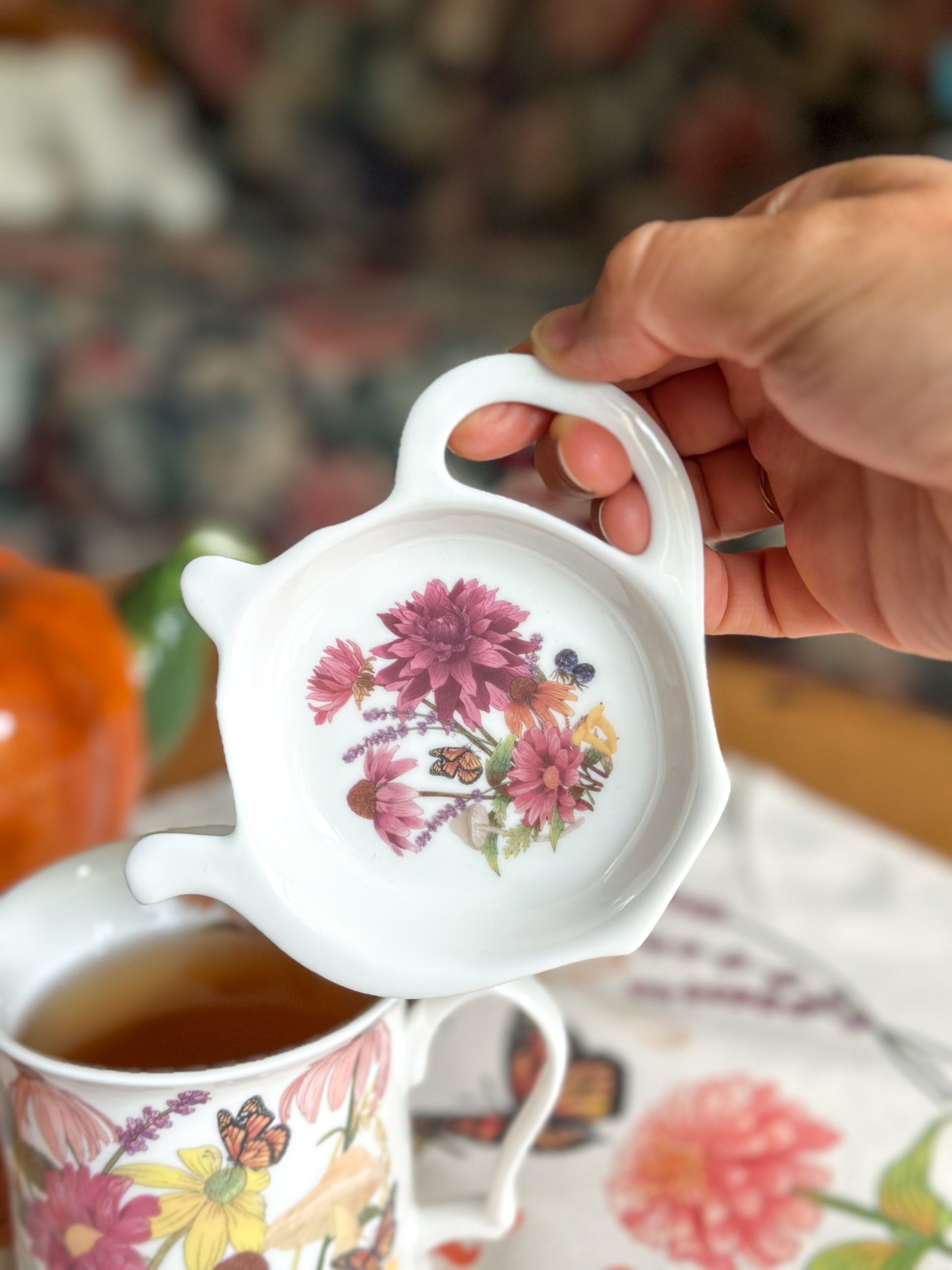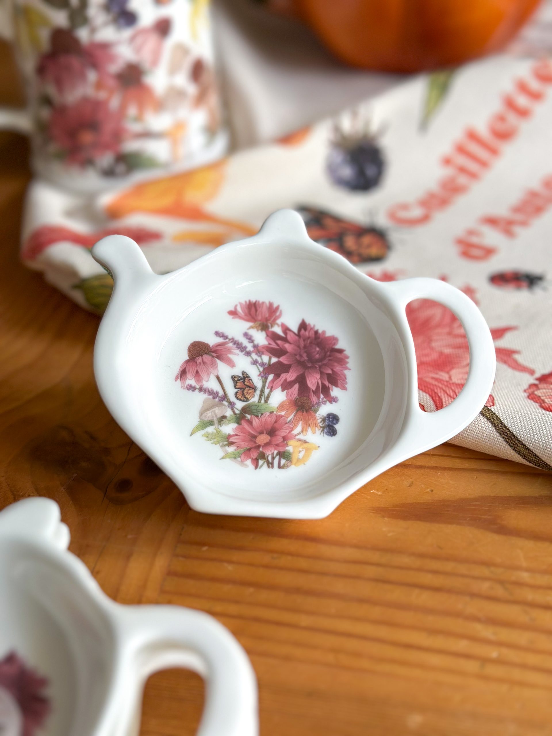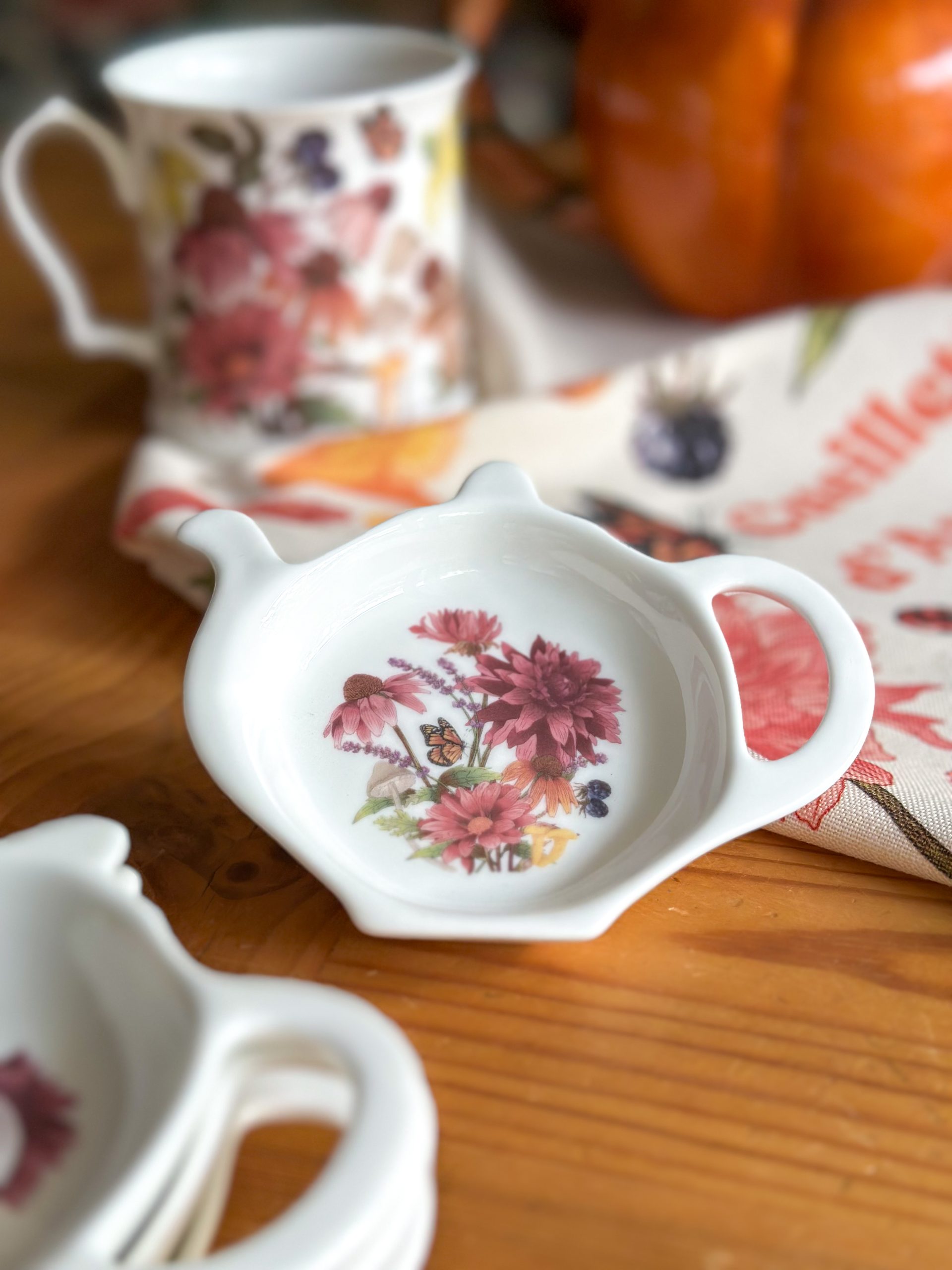 Avec son joli bouquet automnal et sa porcelaine anglaise si fine et brillante, cette coupelle à thé accompagnera vos doux moments thé.