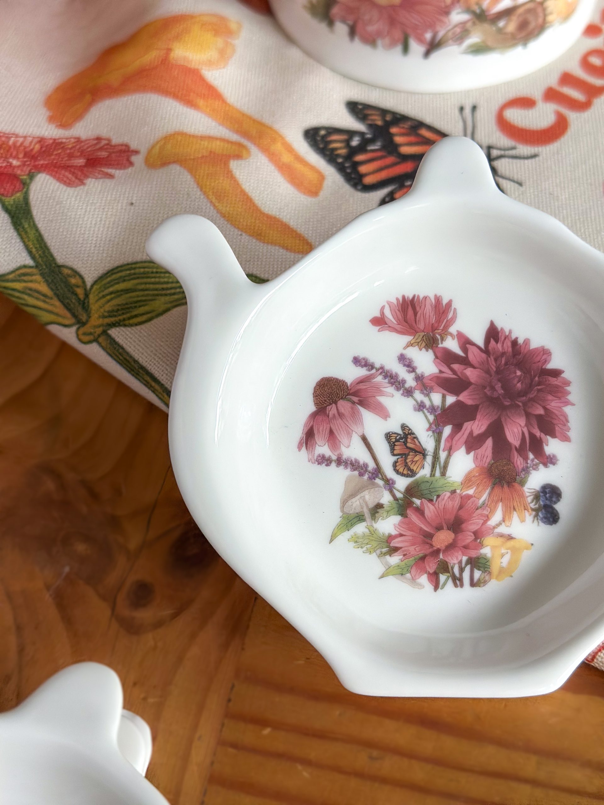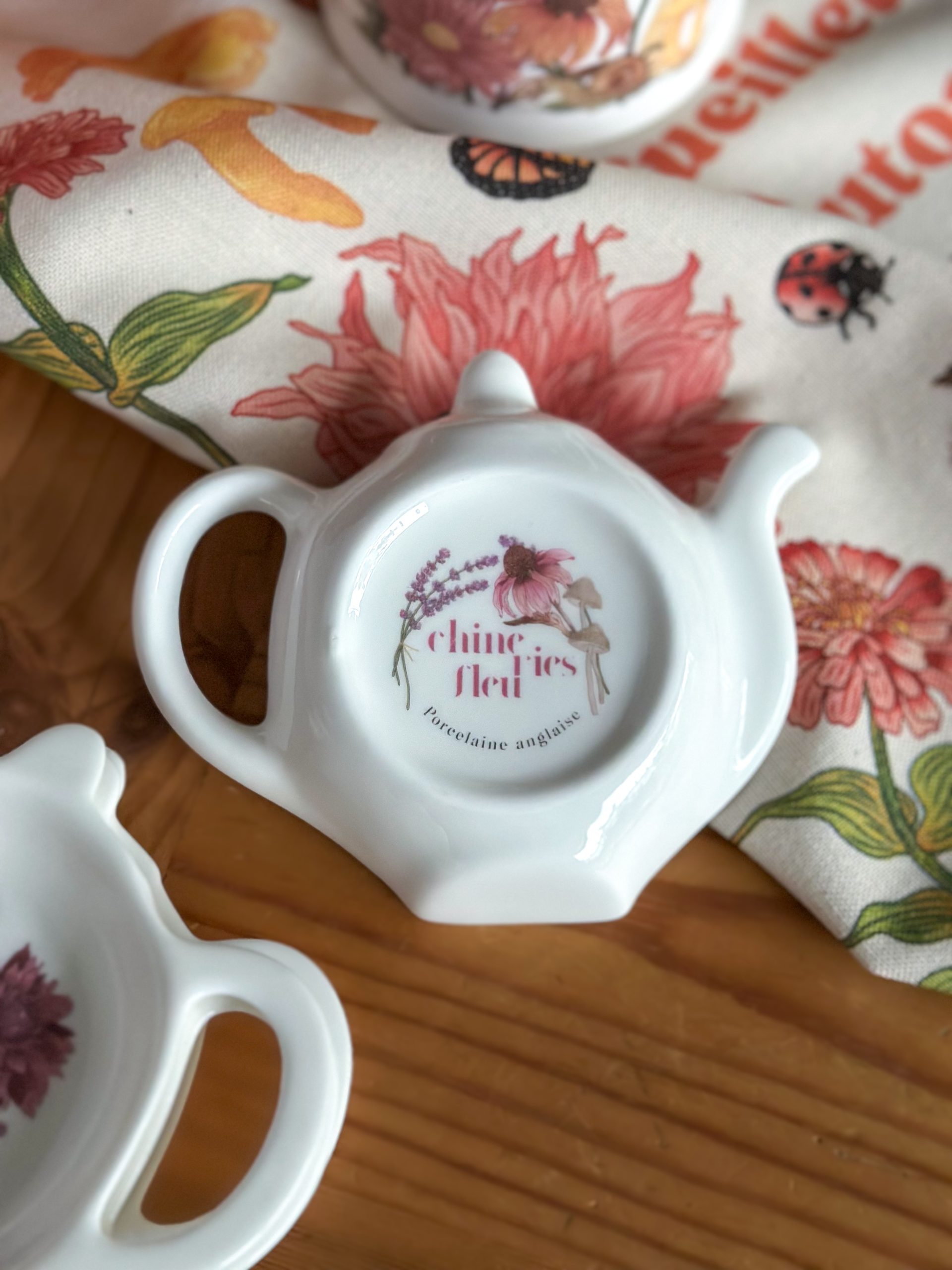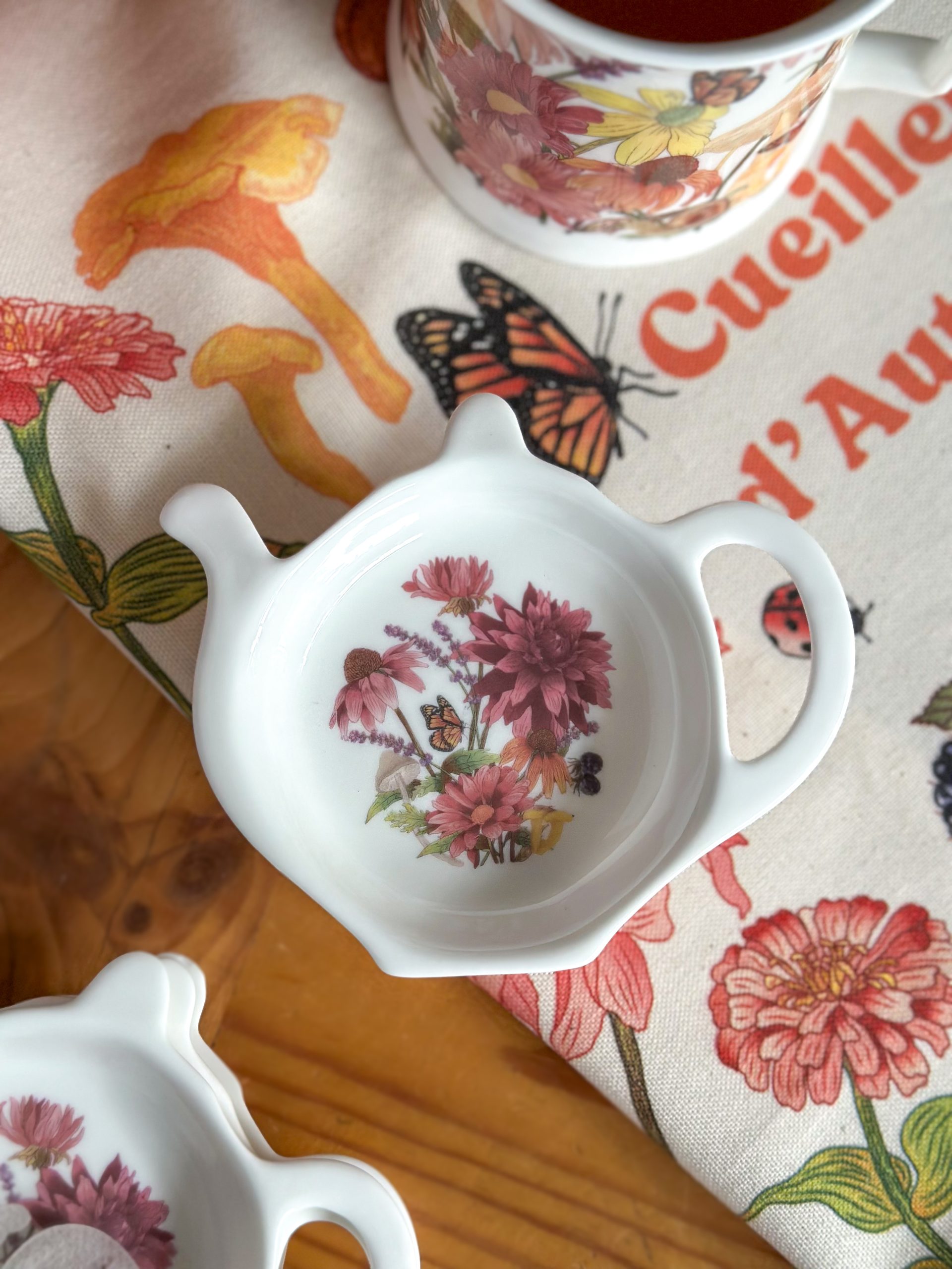 En forme de thĂ©iĂšre, cette coupelle est parsemĂ©e de fleurs colorĂ©es et de trĂ©sors de l’automne : dahlias, Ă©chinacĂ©es, lavandes, champignons, mĂ»res, papillon…