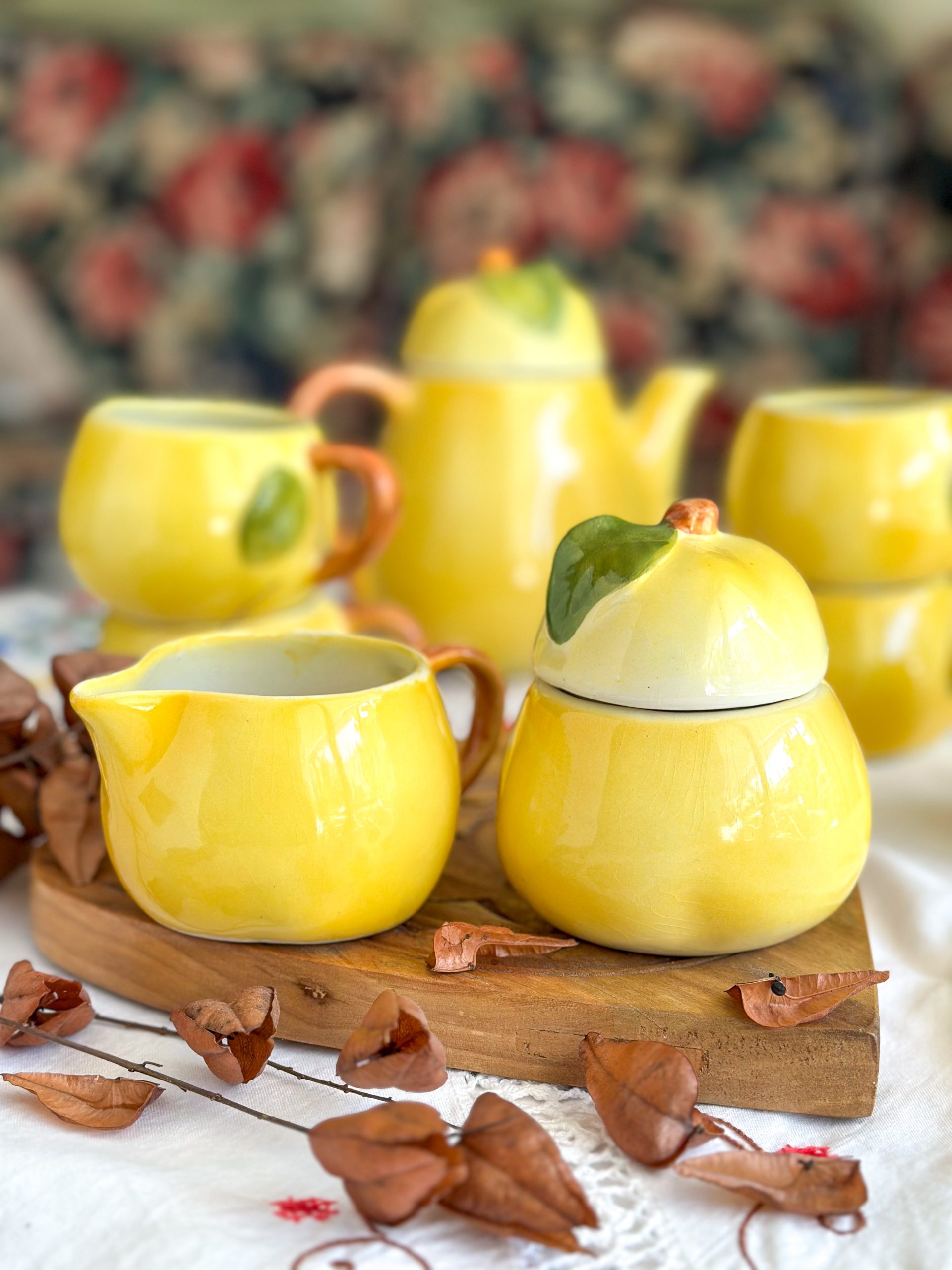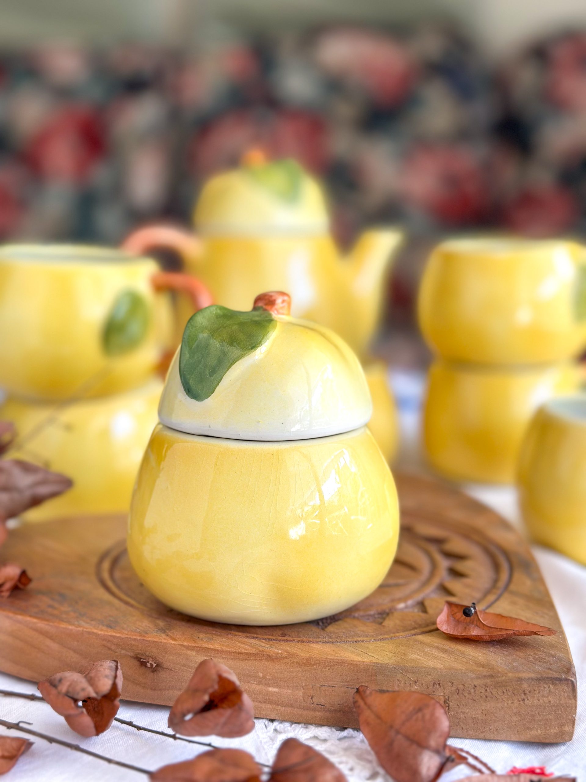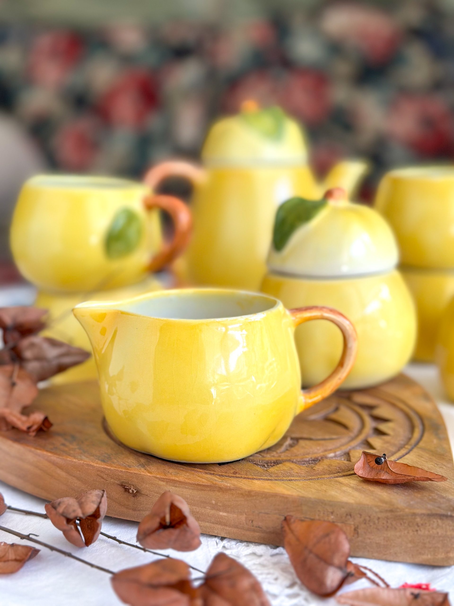 Un très bel ensemble pour un tea time d’automne en douceur ! On adore cet ensemble vintage en forme de Poire : une douce couleur jaune, une anse marron sur le pot à lait, et une petite feuille verte posée sur le couvercle du sucrier. Ces deux pots égaieront votre table d’automne pour un joli moment thé.