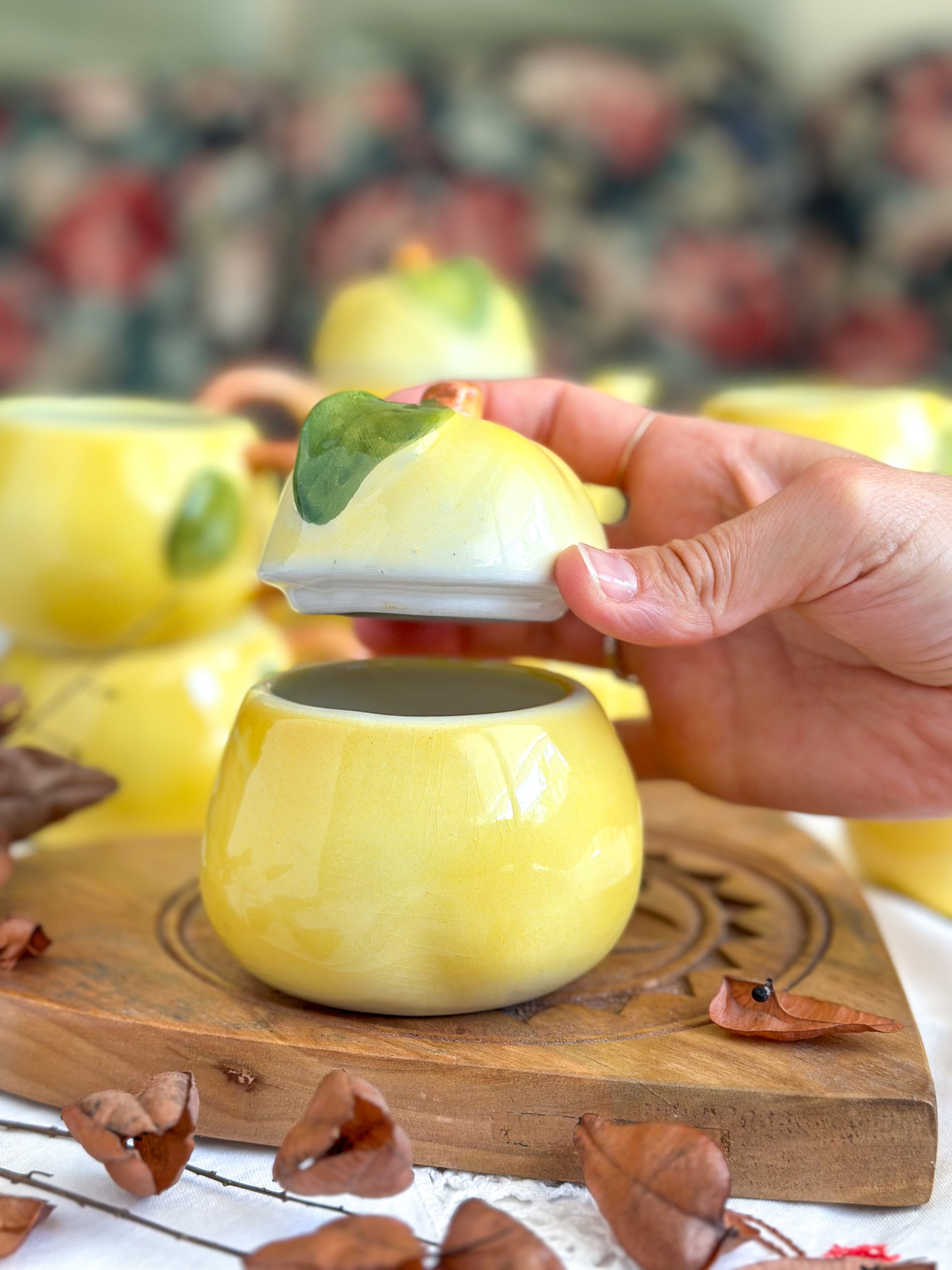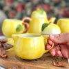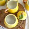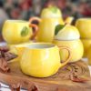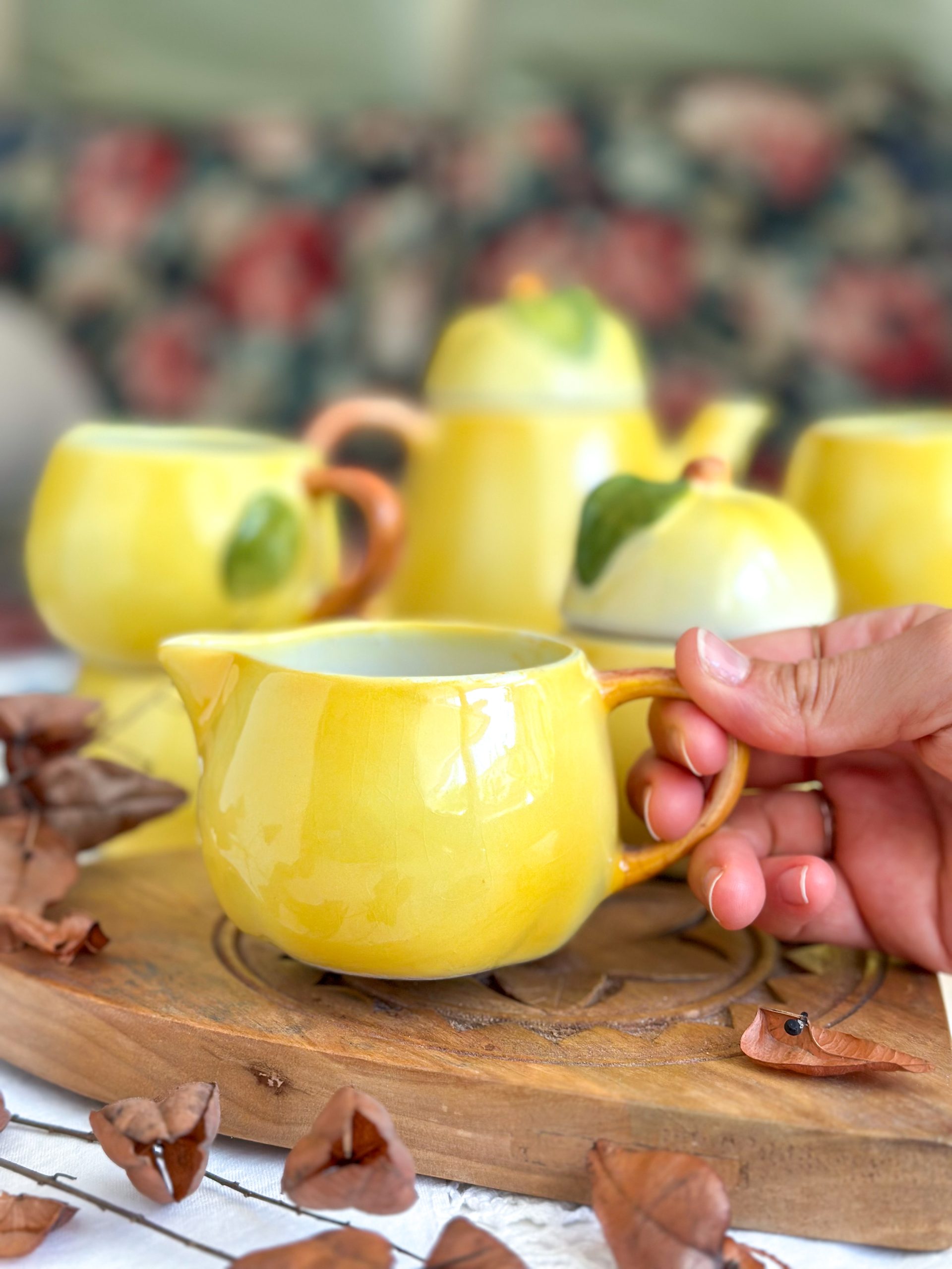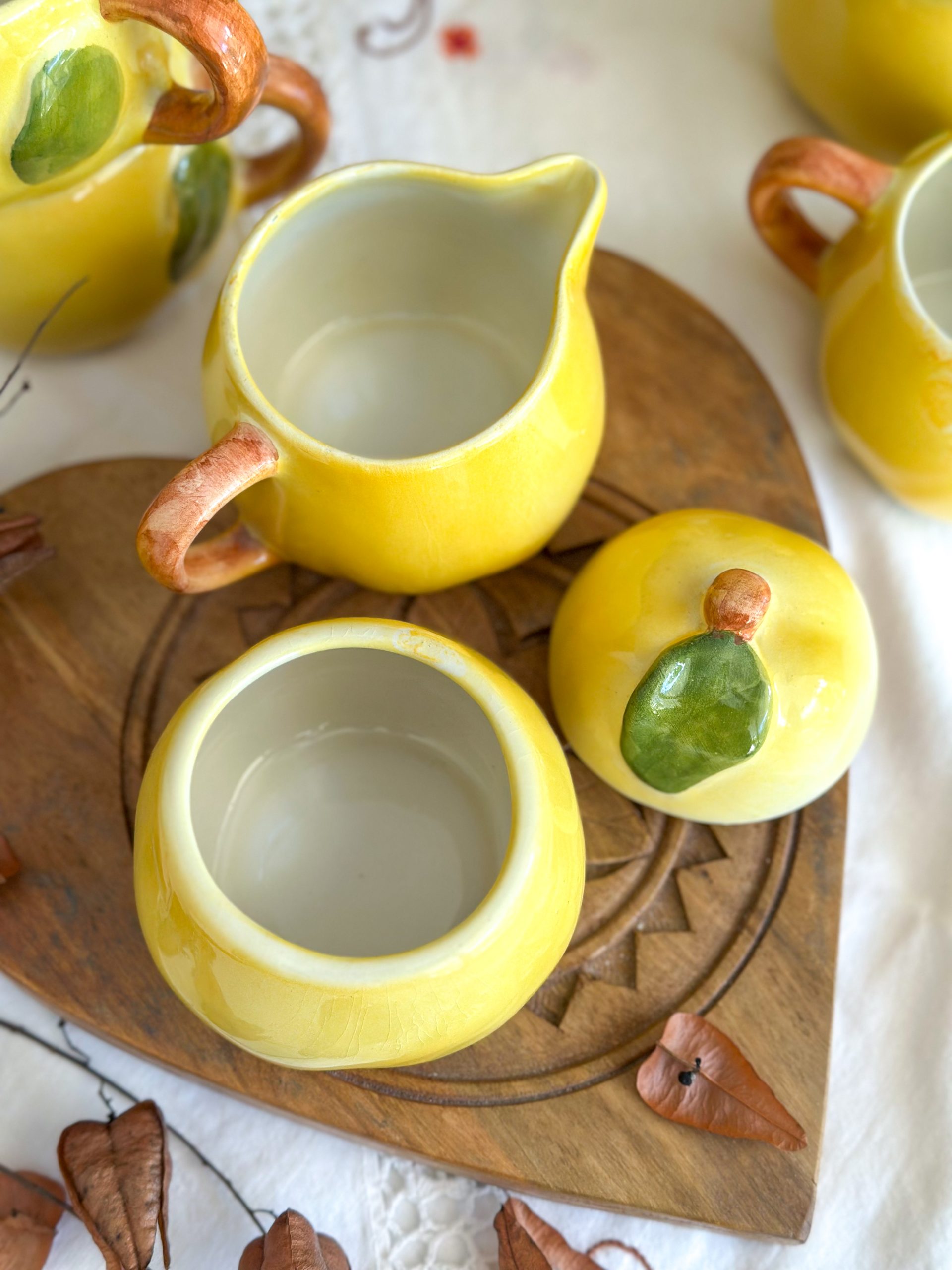 Un très bel ensemble pour un tea time d’automne en douceur ! On adore cet ensemble vintage en forme de Poire : une douce couleur jaune, une anse marron sur le pot à lait, et une petite feuille verte posée sur le couvercle du sucrier. Ces deux pots égaieront votre table d’automne pour un joli moment thé.