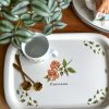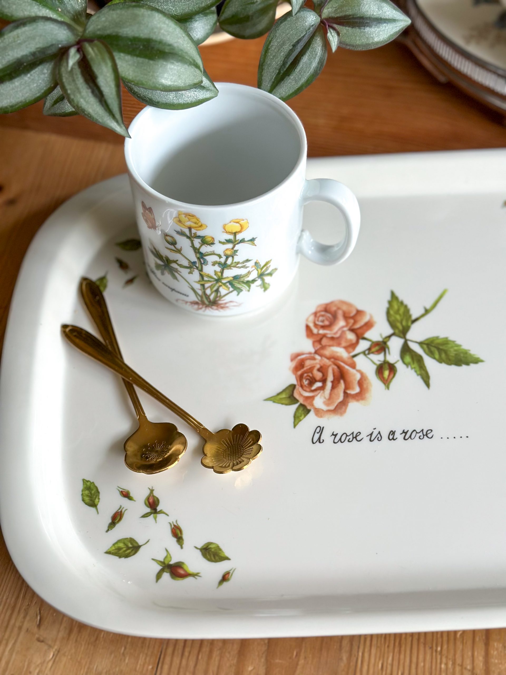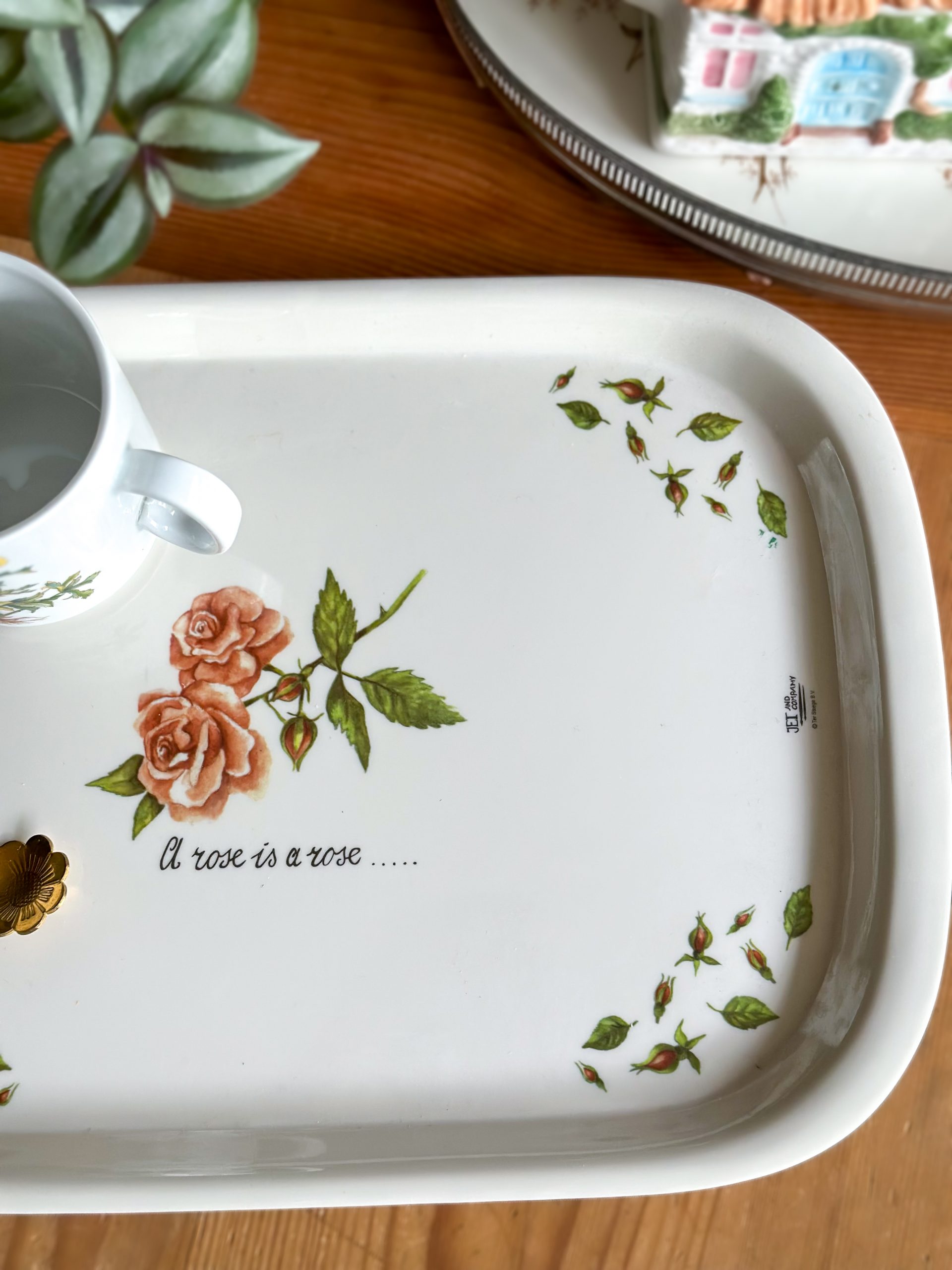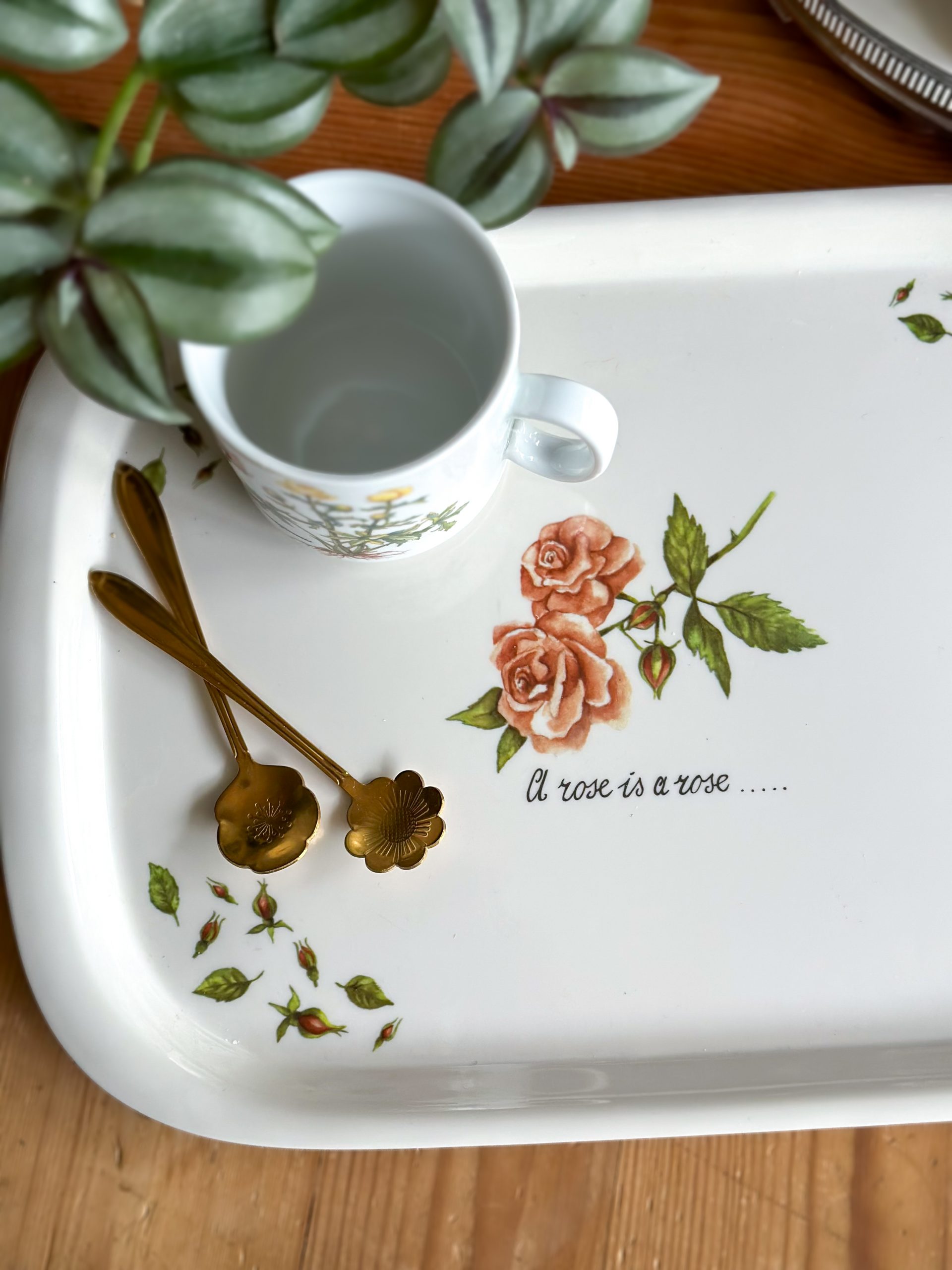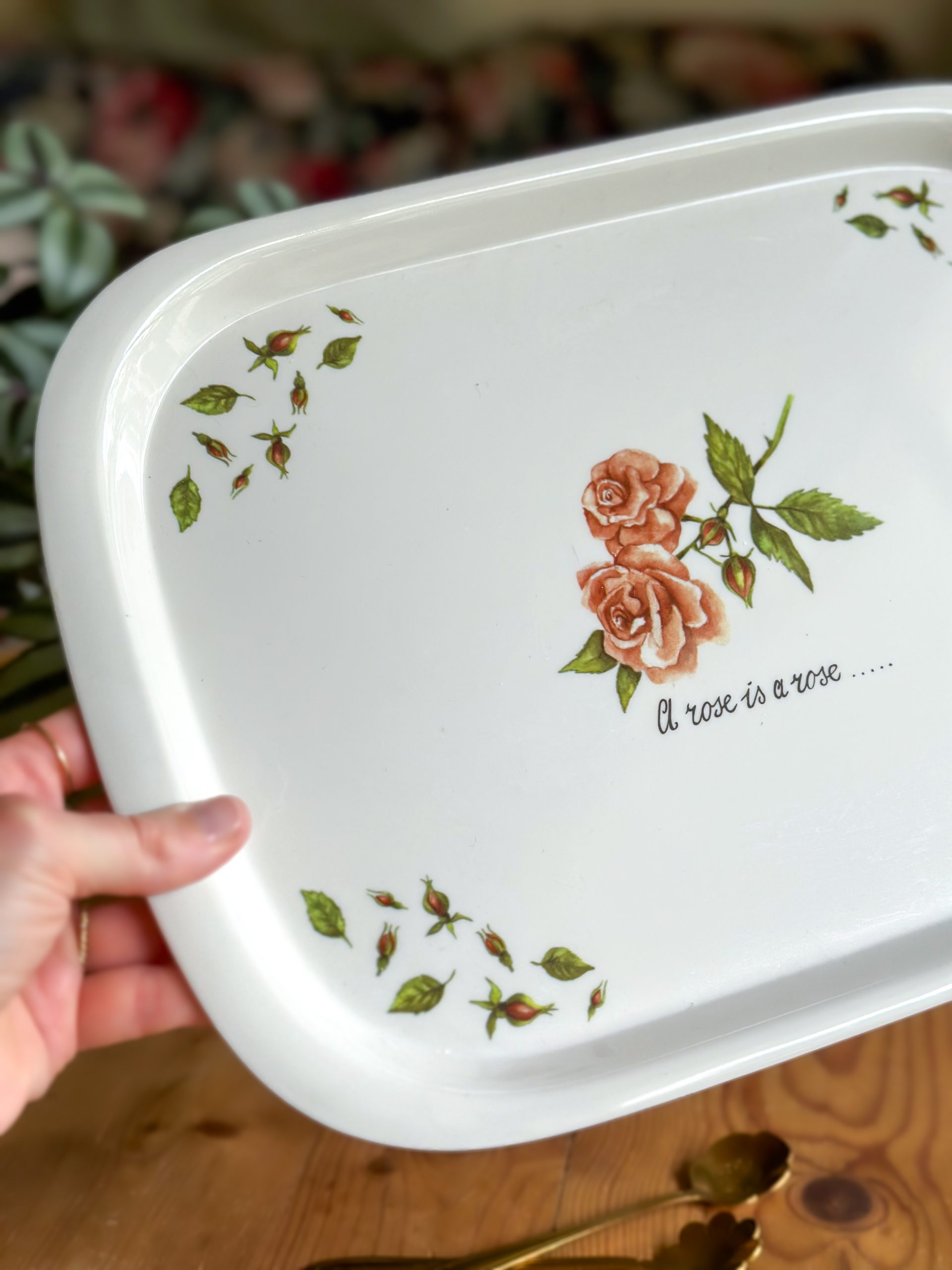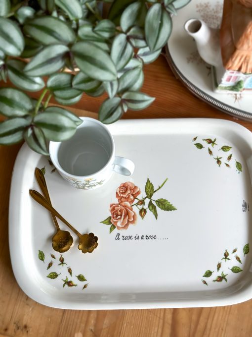 Superbe plateau vintage ! Coup de coeur pour ses jolis dessins de rosiers et leurs boutons, nous plongeant directement au jardin en été. Avec son inscription » A rose is a rose… « , ce grand plateau en mélaminé vous servira pour vos pauses gourmandes autour d’un thé, et décorera joliment votre table ou votre cuisine.