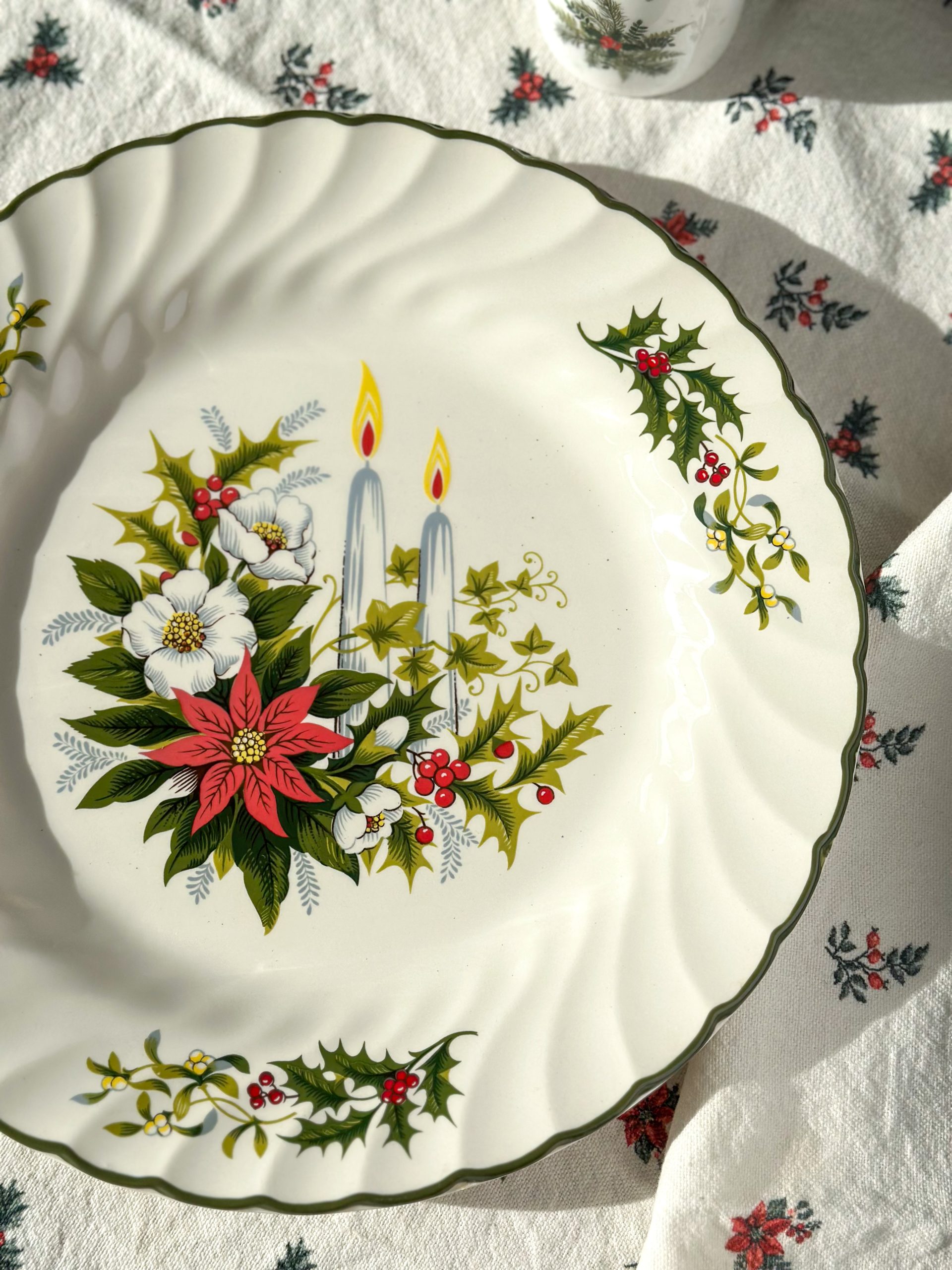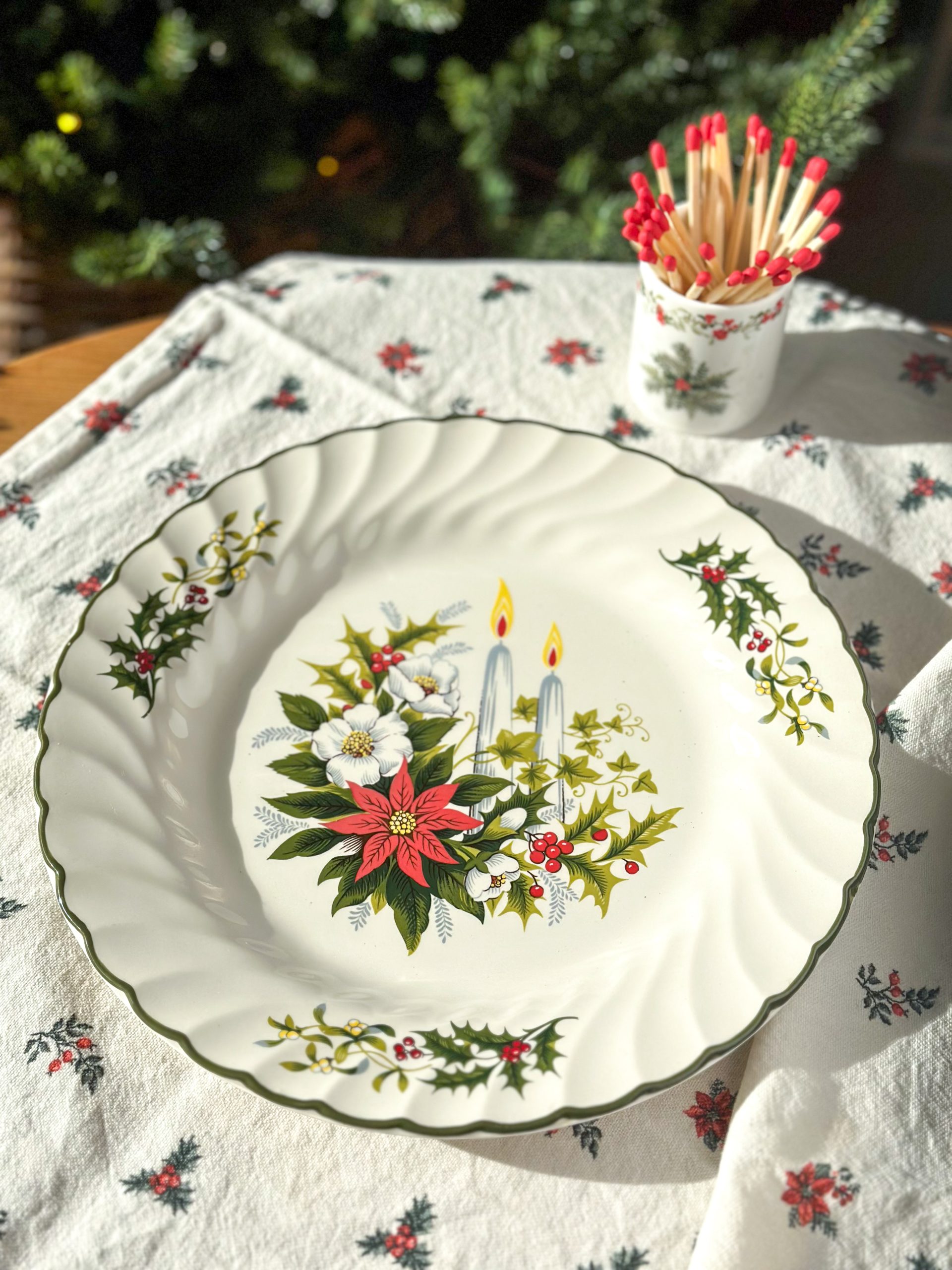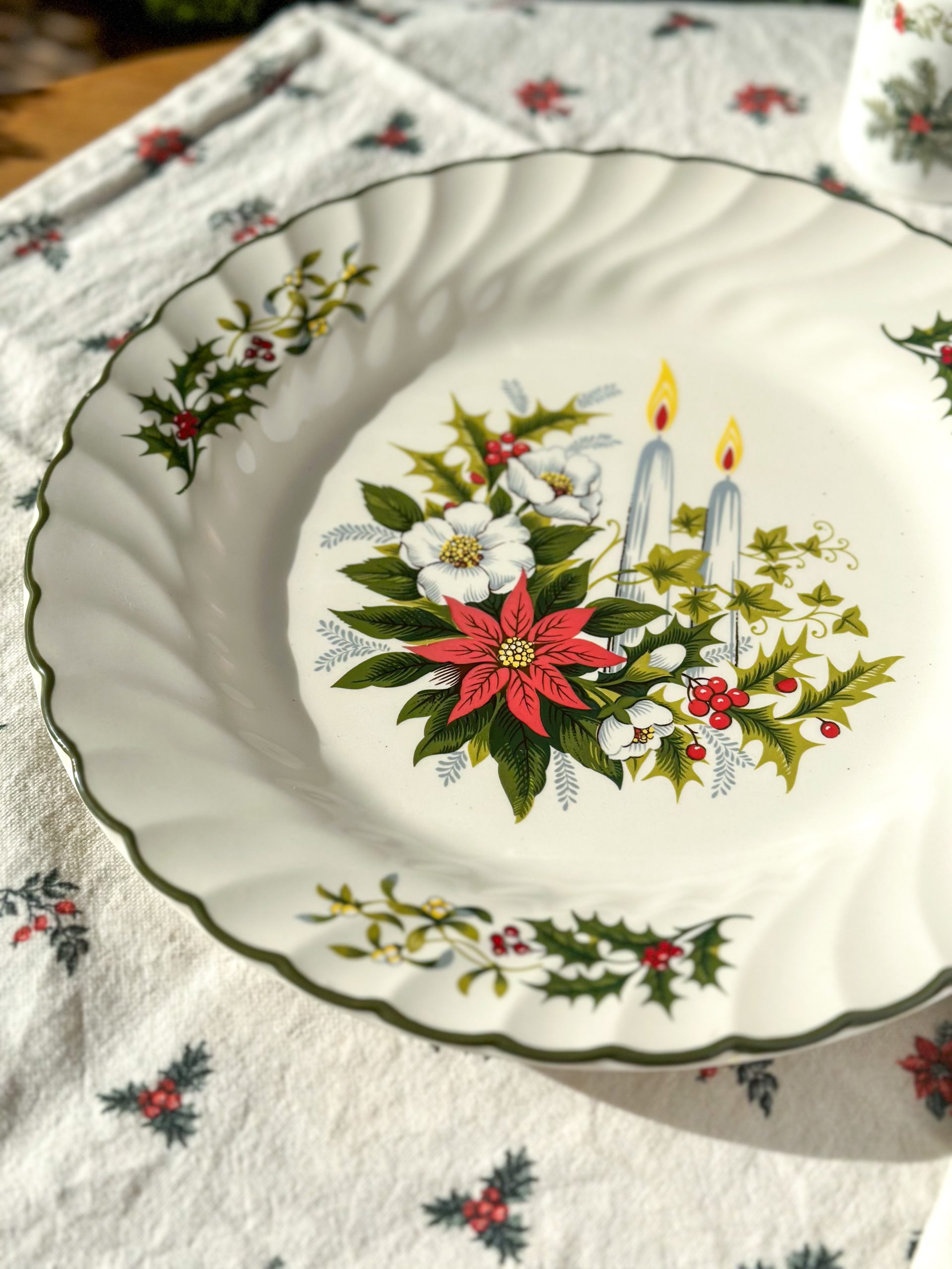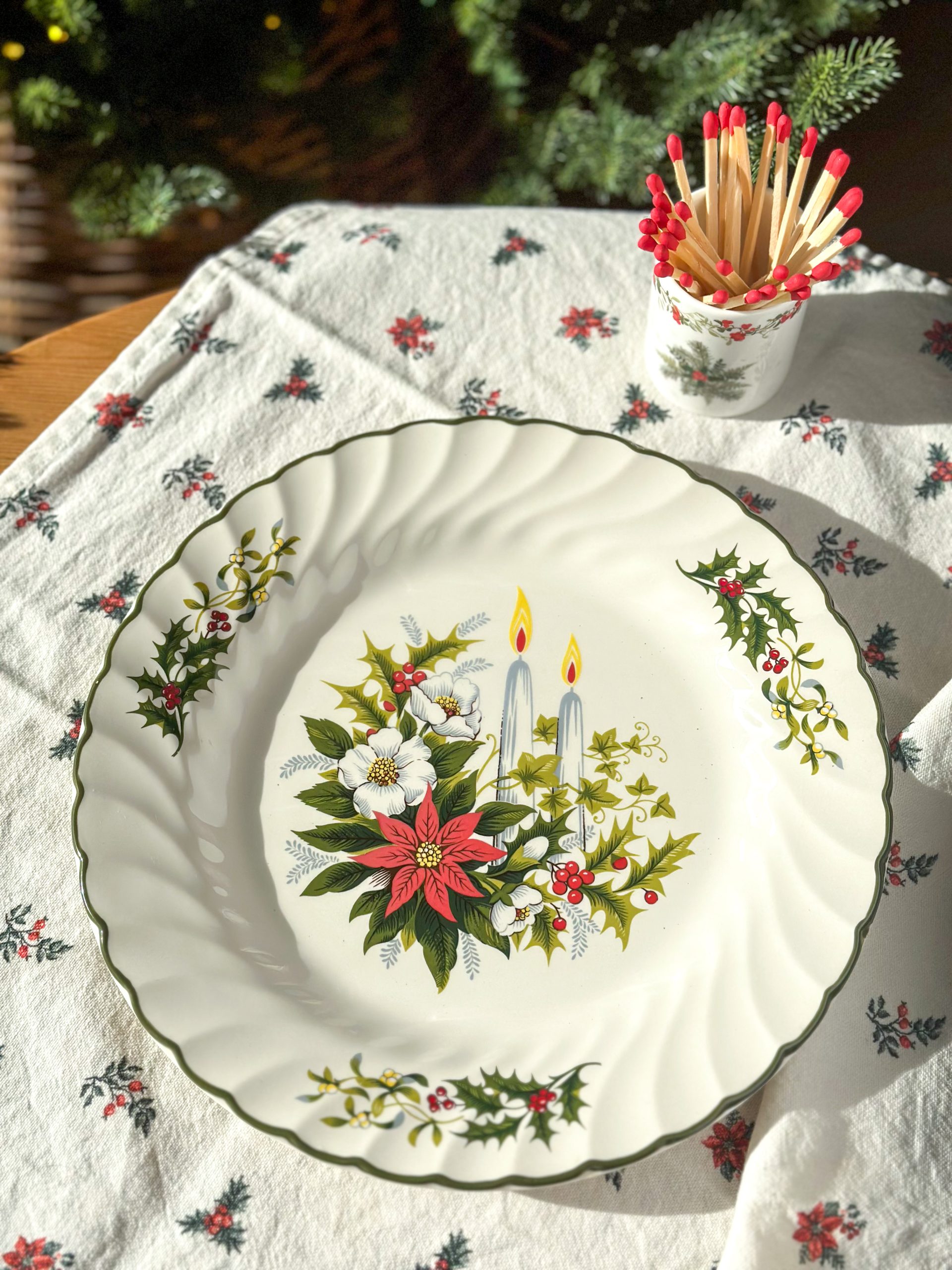 Une superbe assiette vintage pour décorer votre table à Noël ! On adore cette grande assiette anglaise : décorée d’un bouquet de Noël, de bougies au centre, du houx et du gui tout autour et un joli liseré vert. Elle est magnifique !