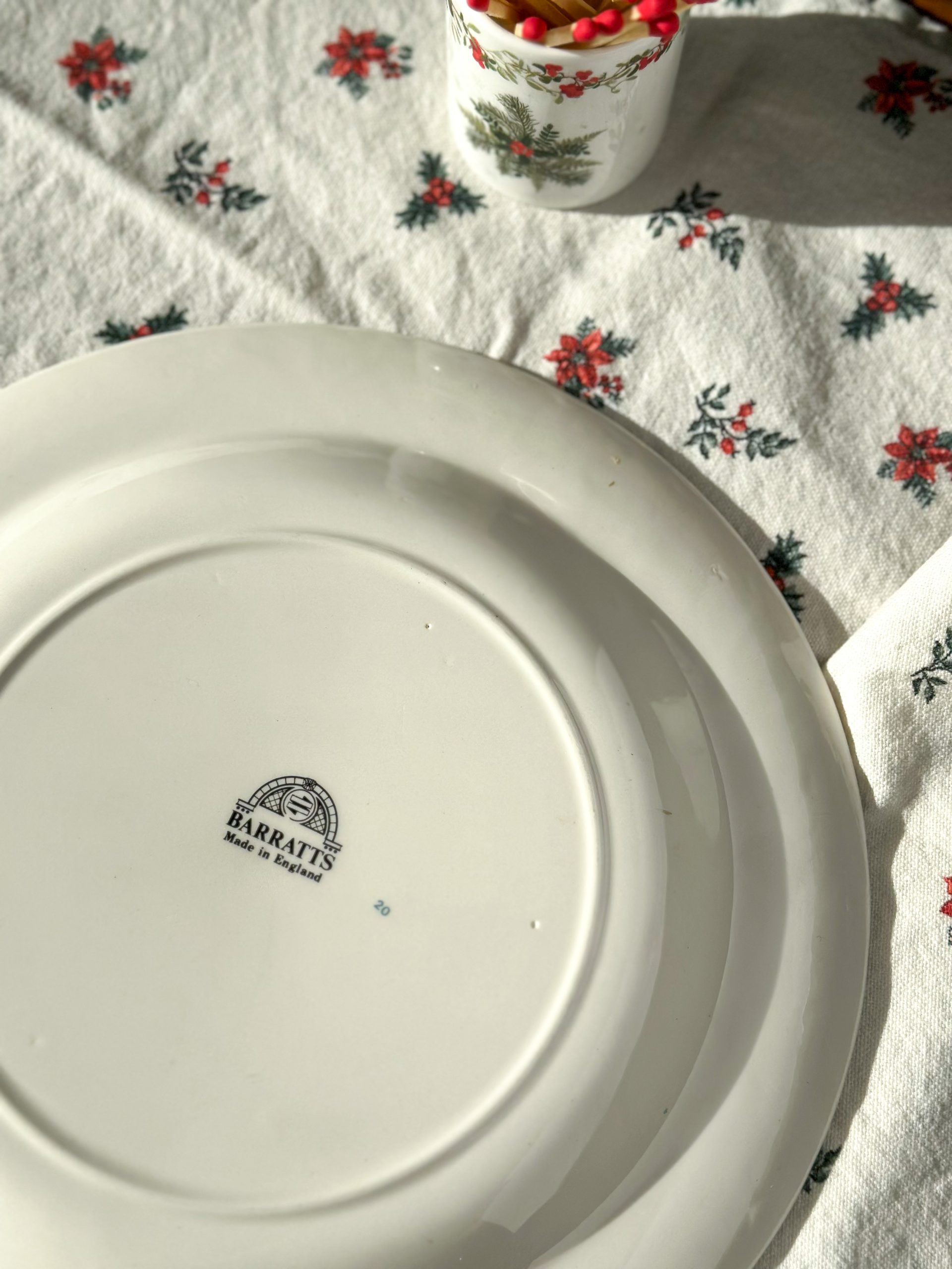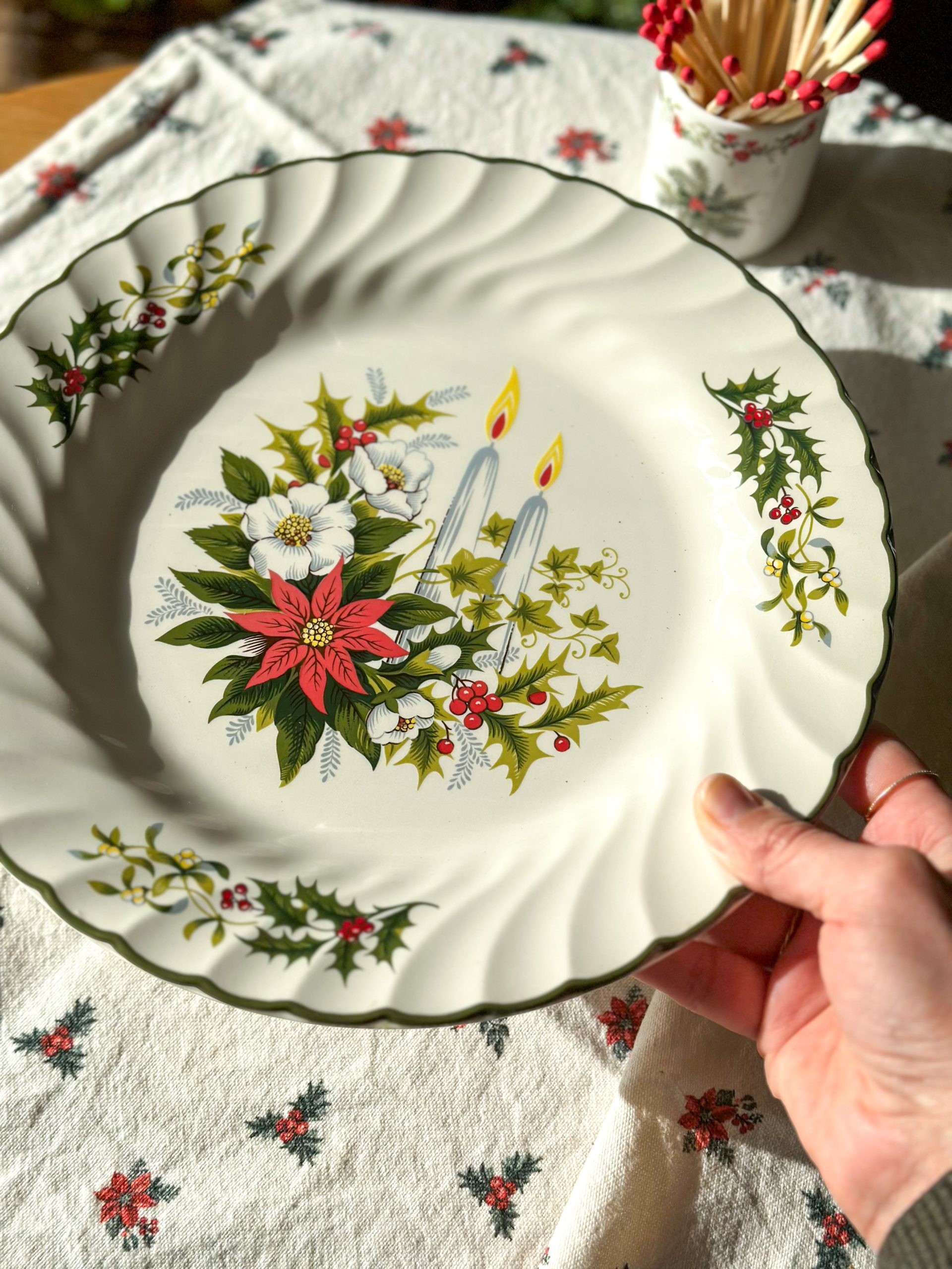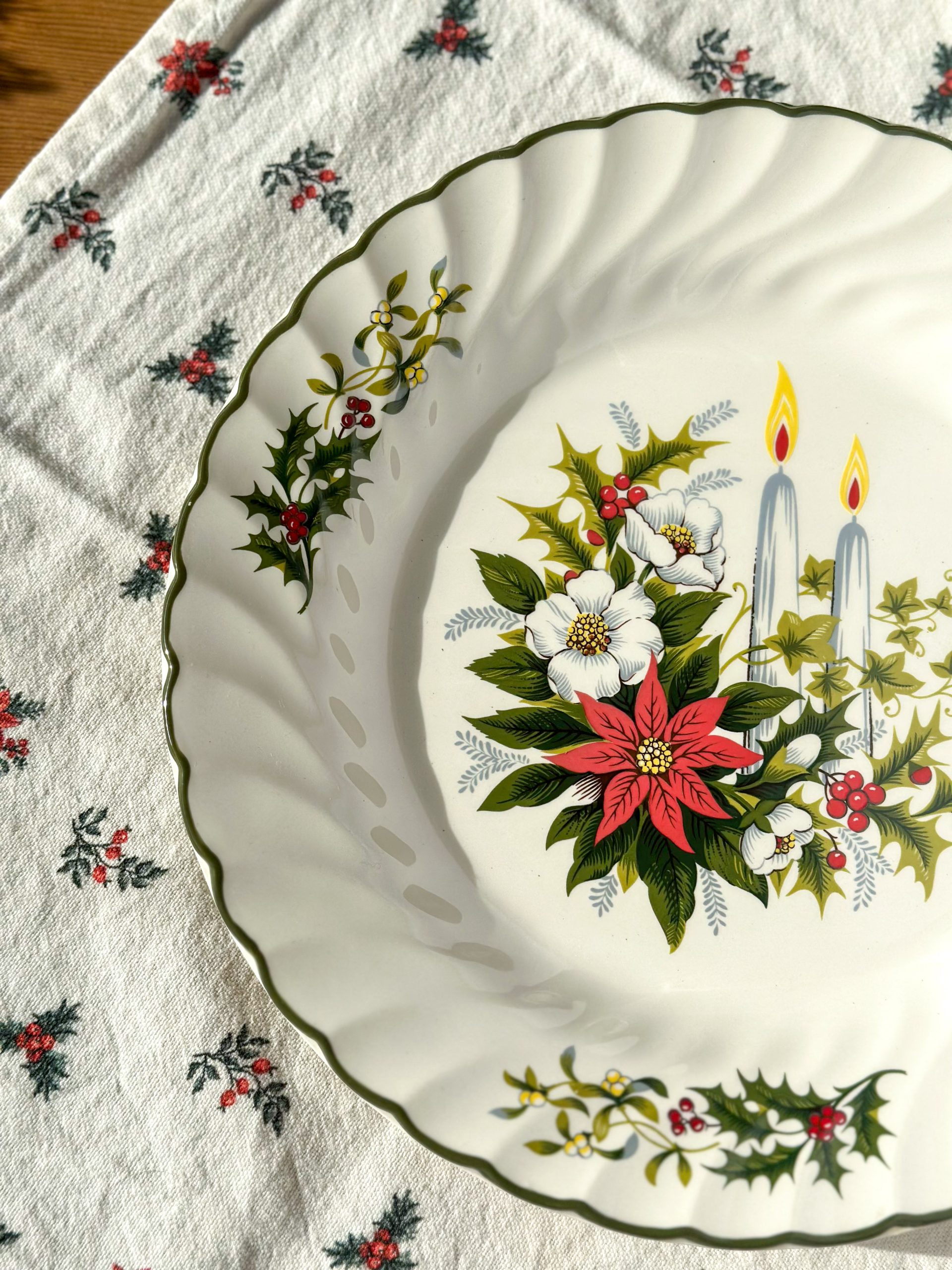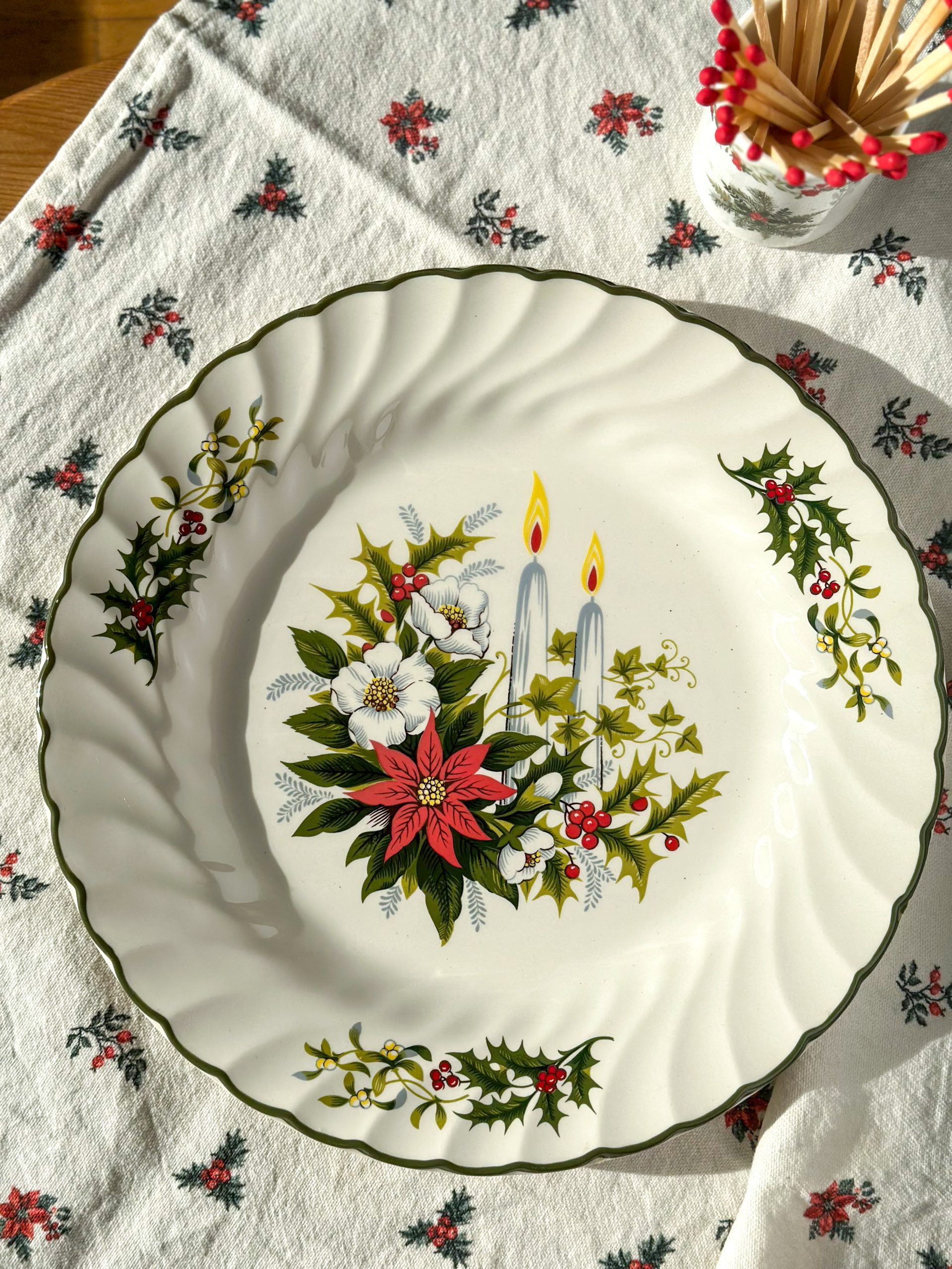 Une superbe assiette vintage pour décorer votre table à Noël ! On adore cette grande assiette anglaise : décorée d’un bouquet de Noël, de bougies au centre, du houx et du gui tout autour et un joli liseré vert. Elle est magnifique !