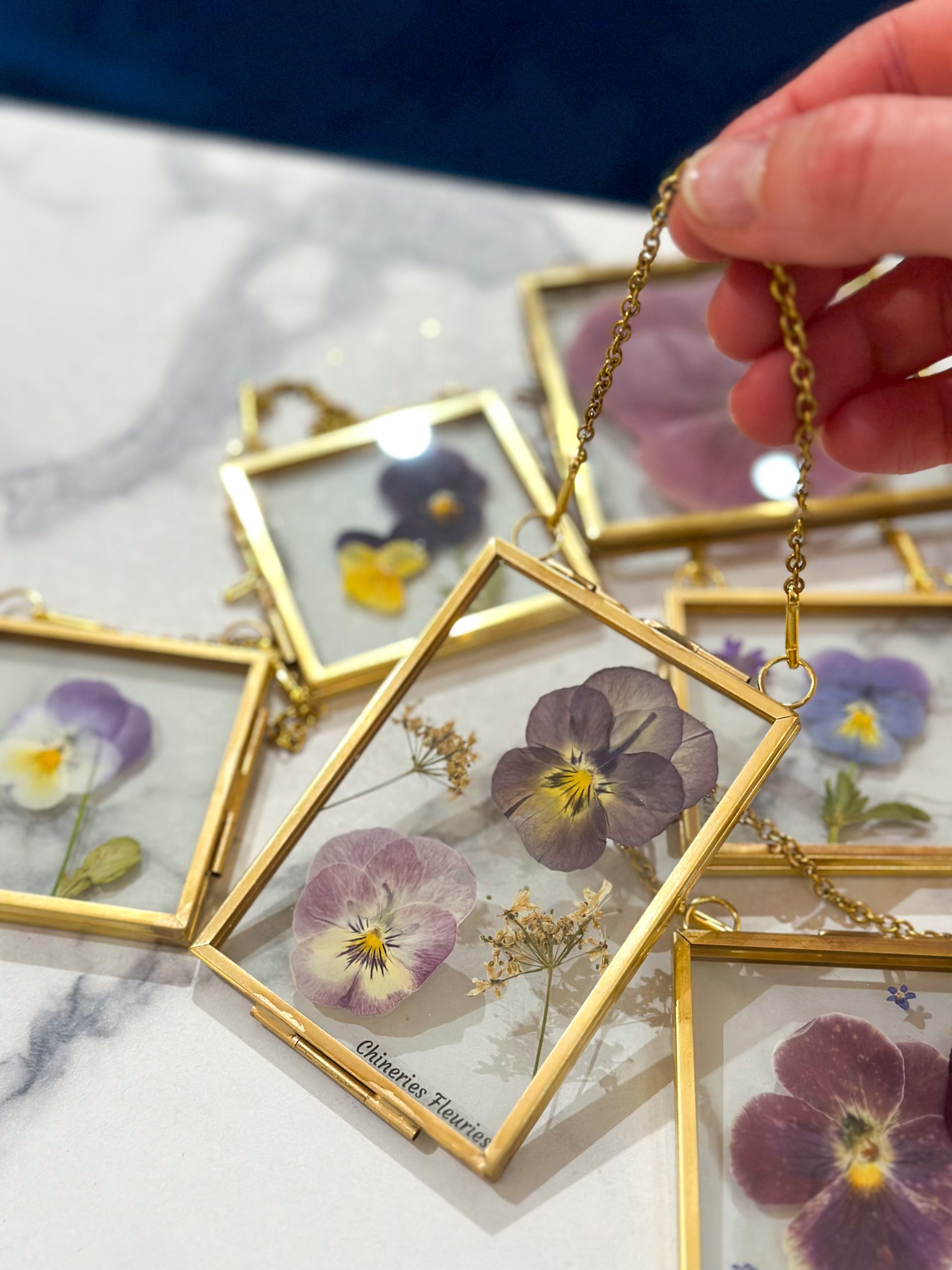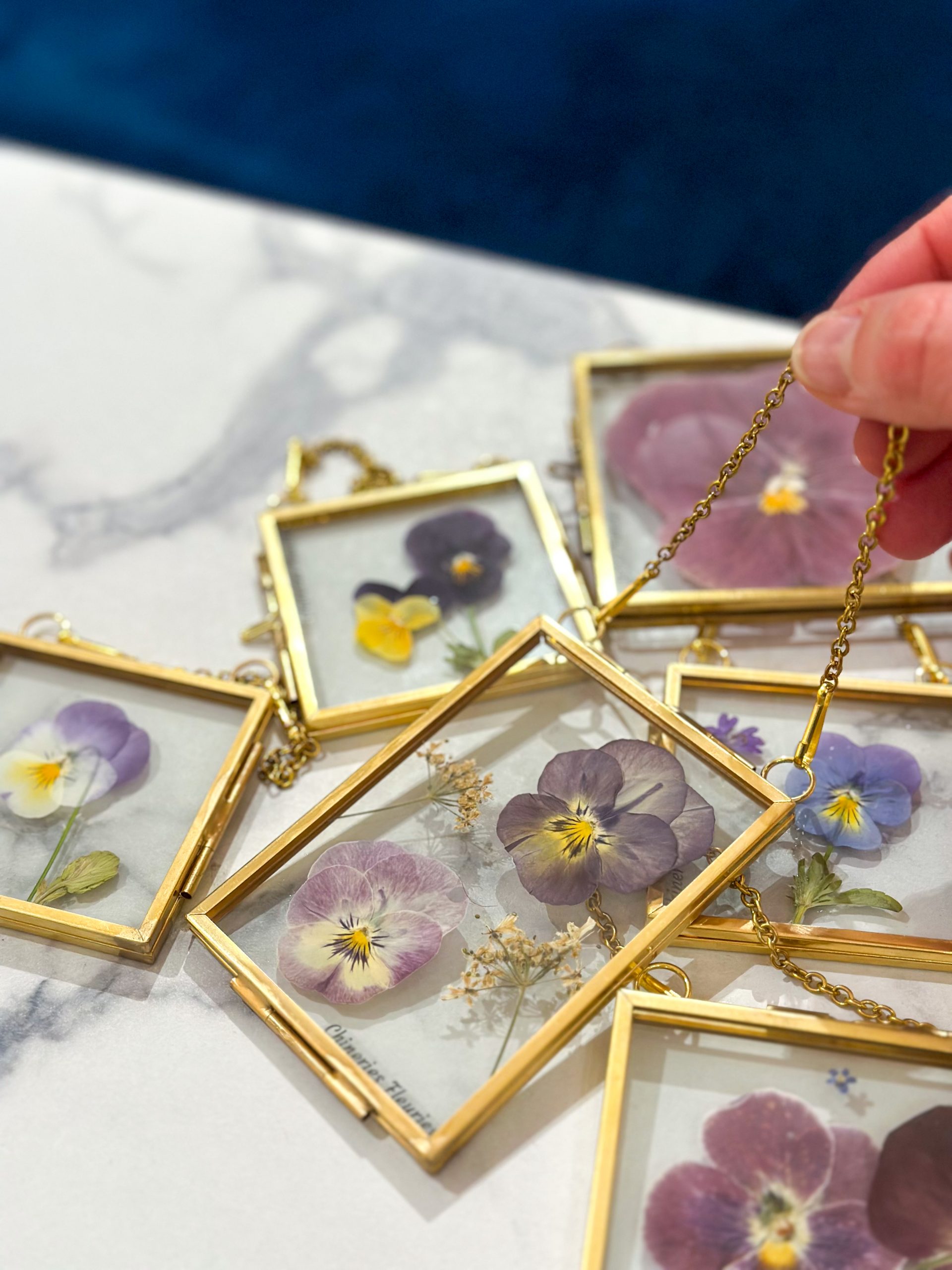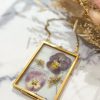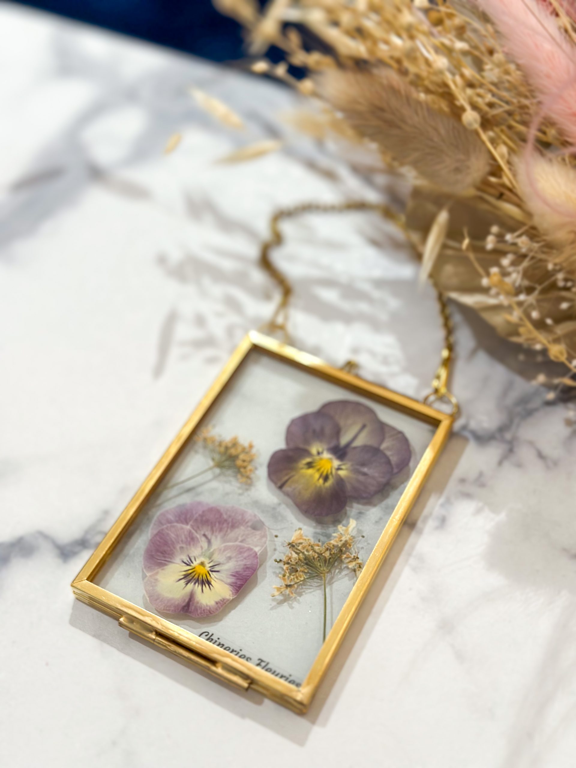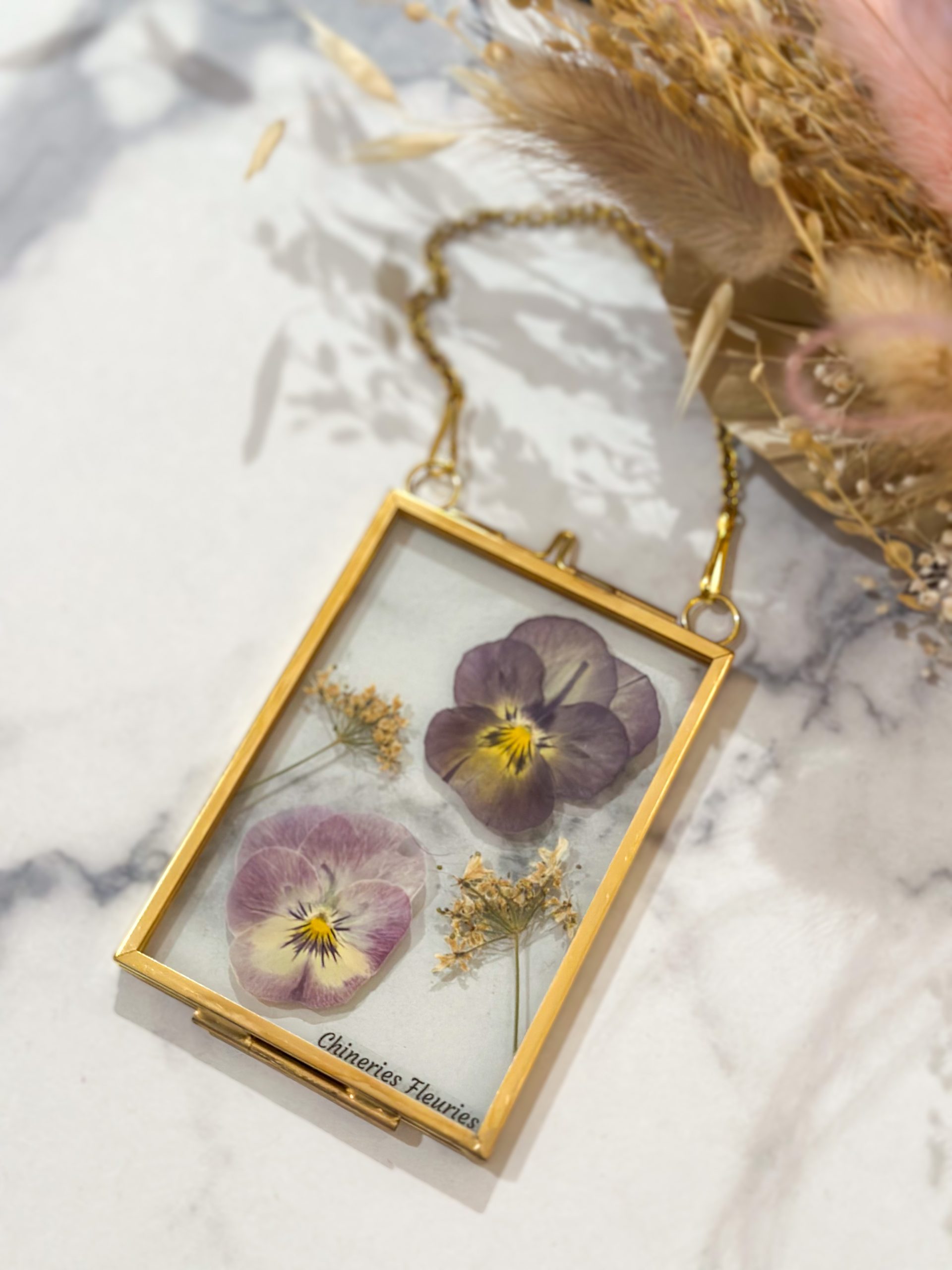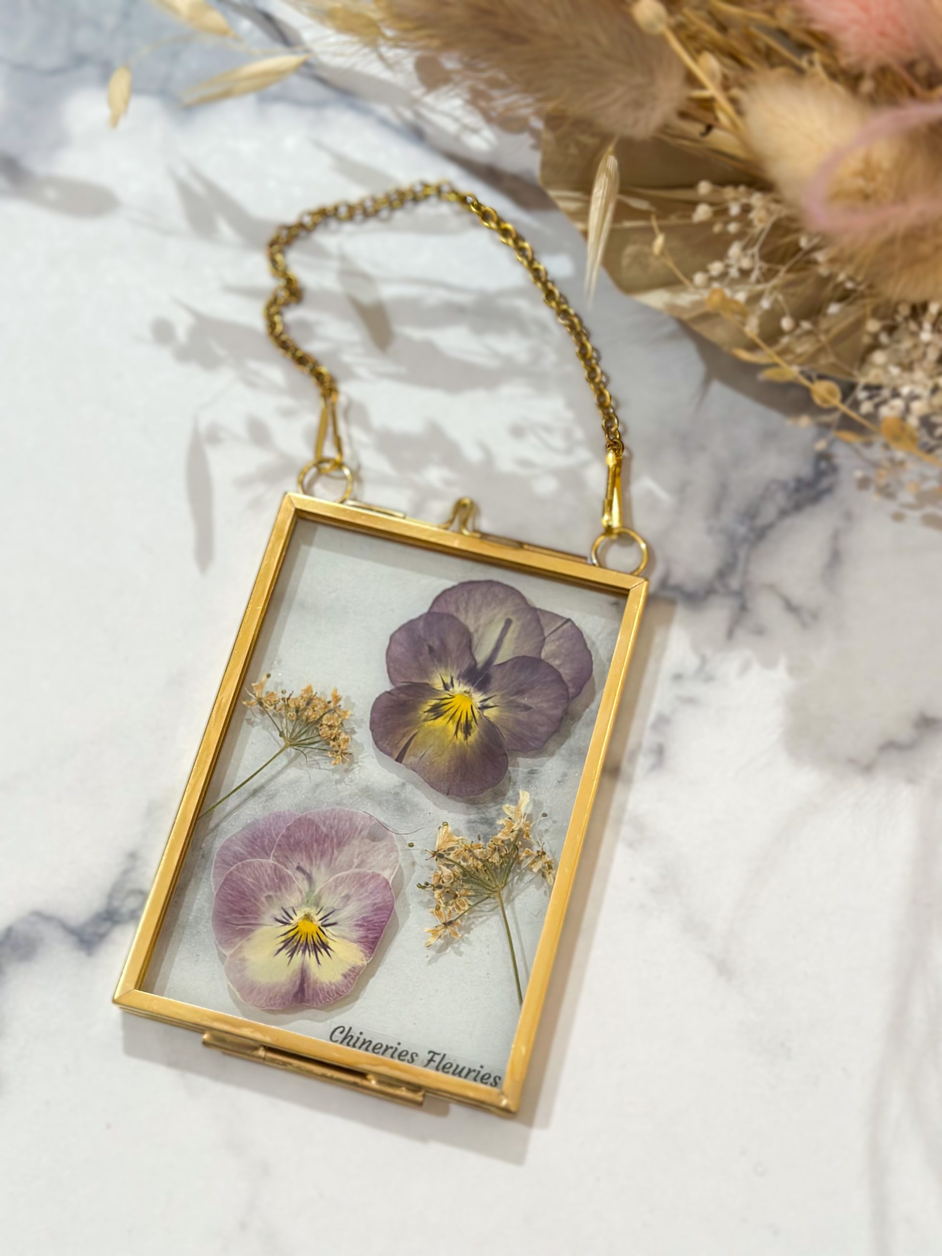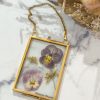 L’herbier Bloom est une création unique et artisanale de fleurs pressées, réalisée dans mon atelier lyonnais. Il présente deux fleurs de pensées aux jolis tons violets doux, accompagnées de fleurs d’ombelles, dans un petit cadre en laiton à suspendre.