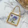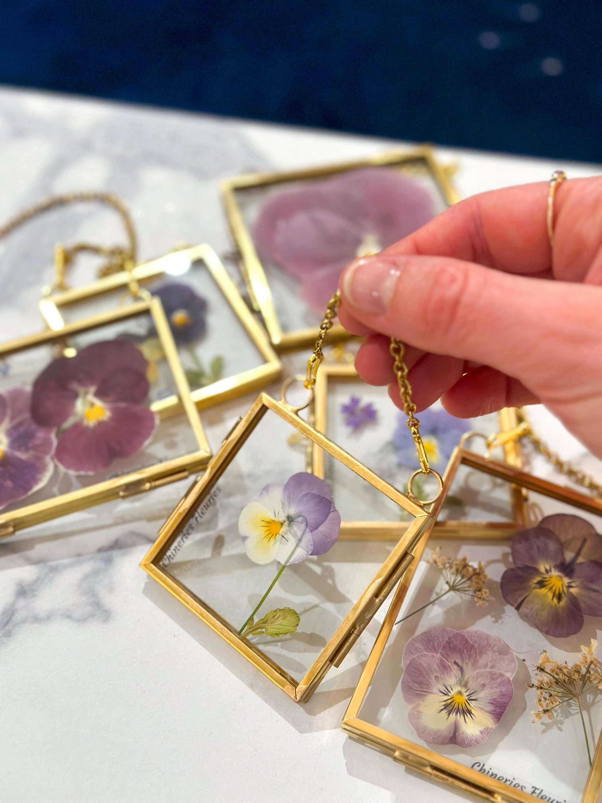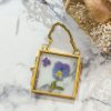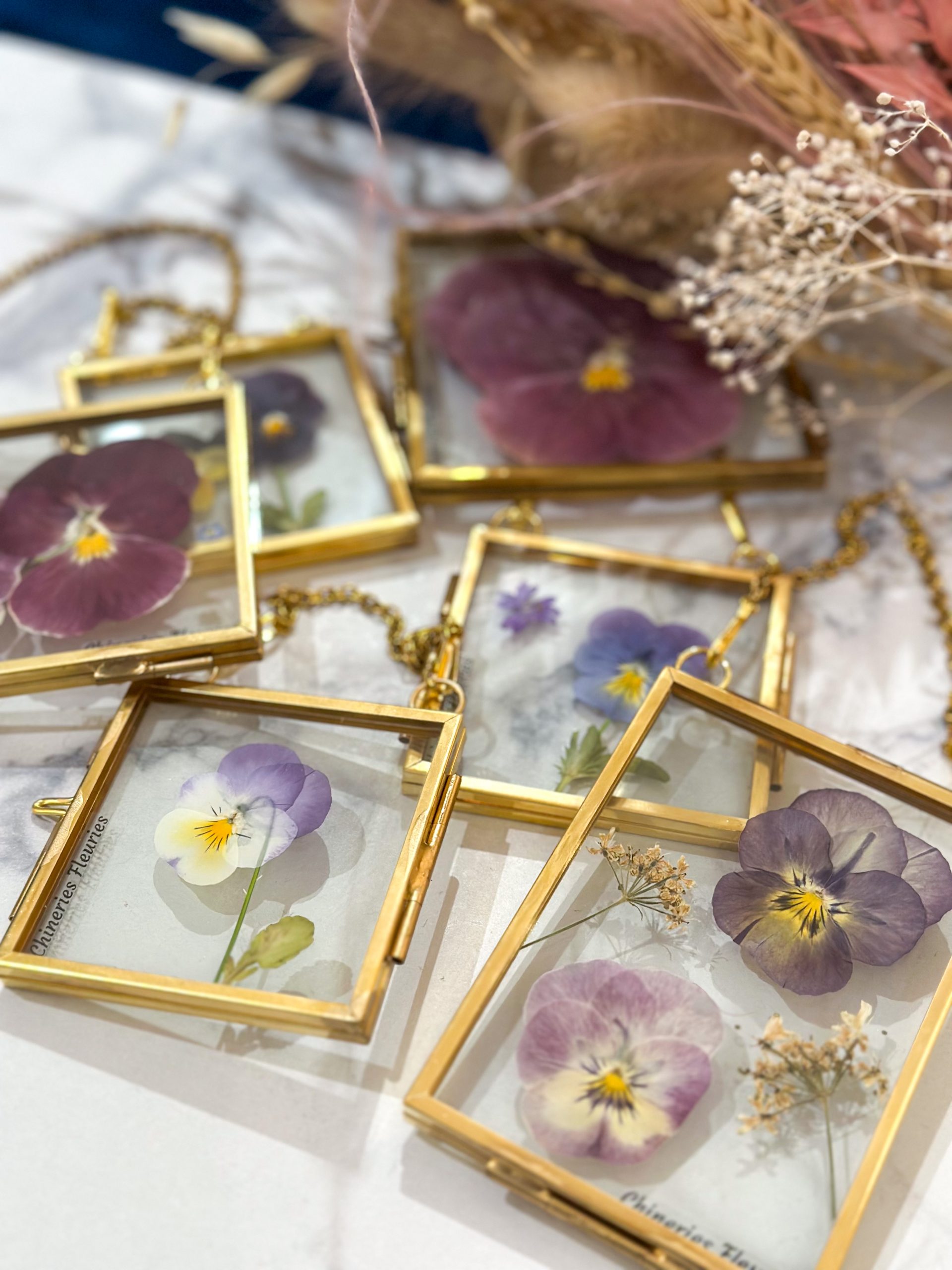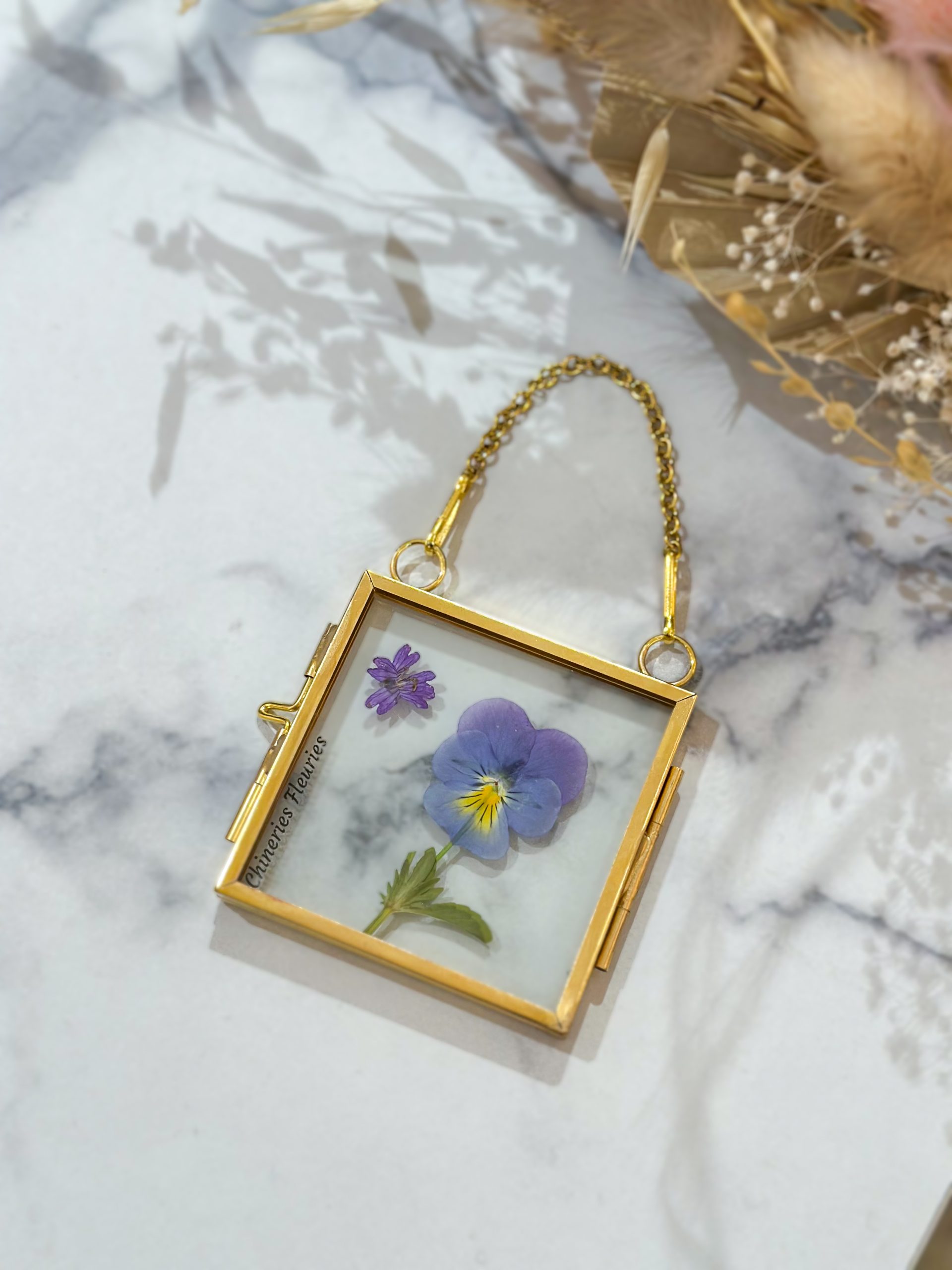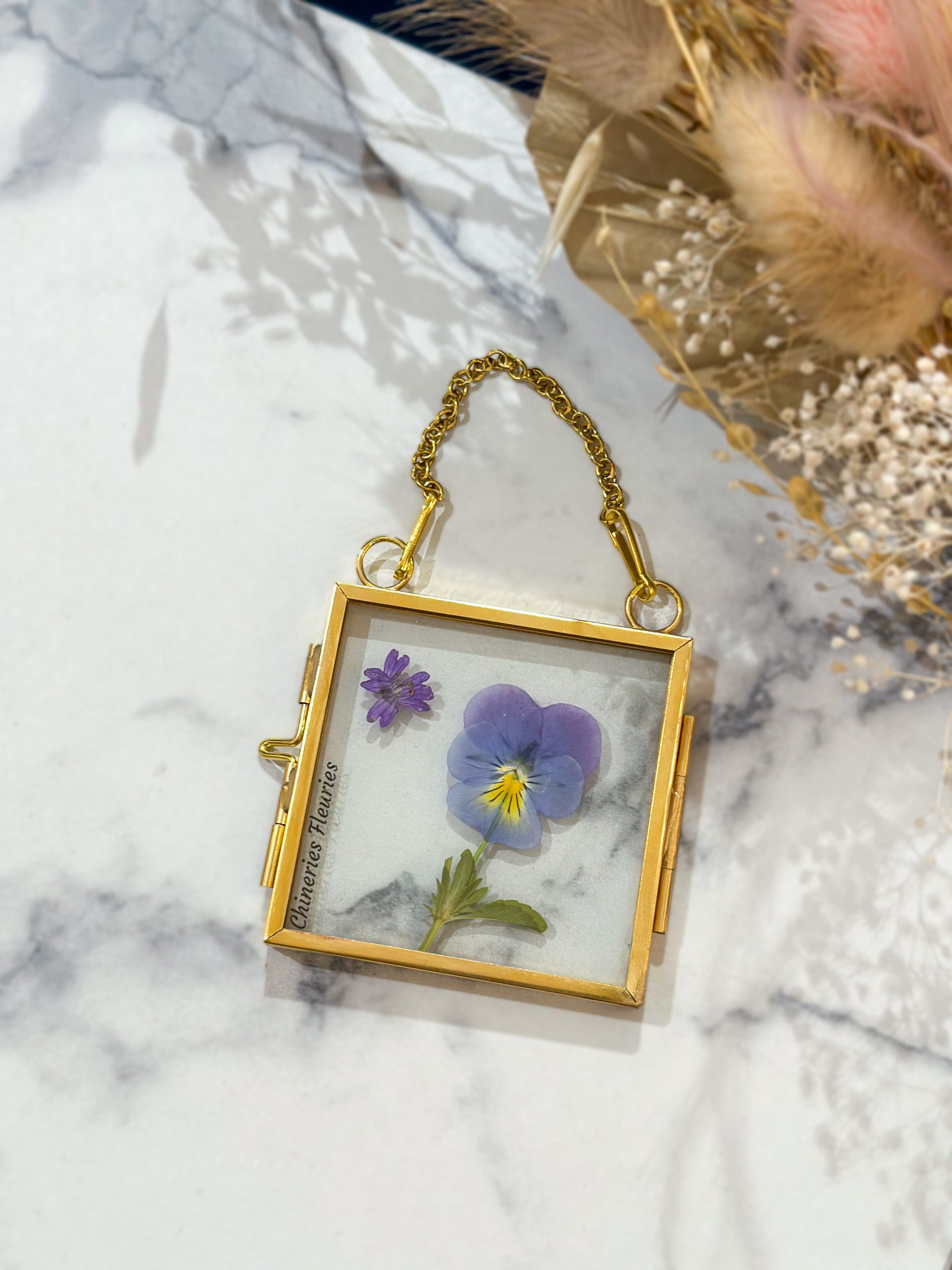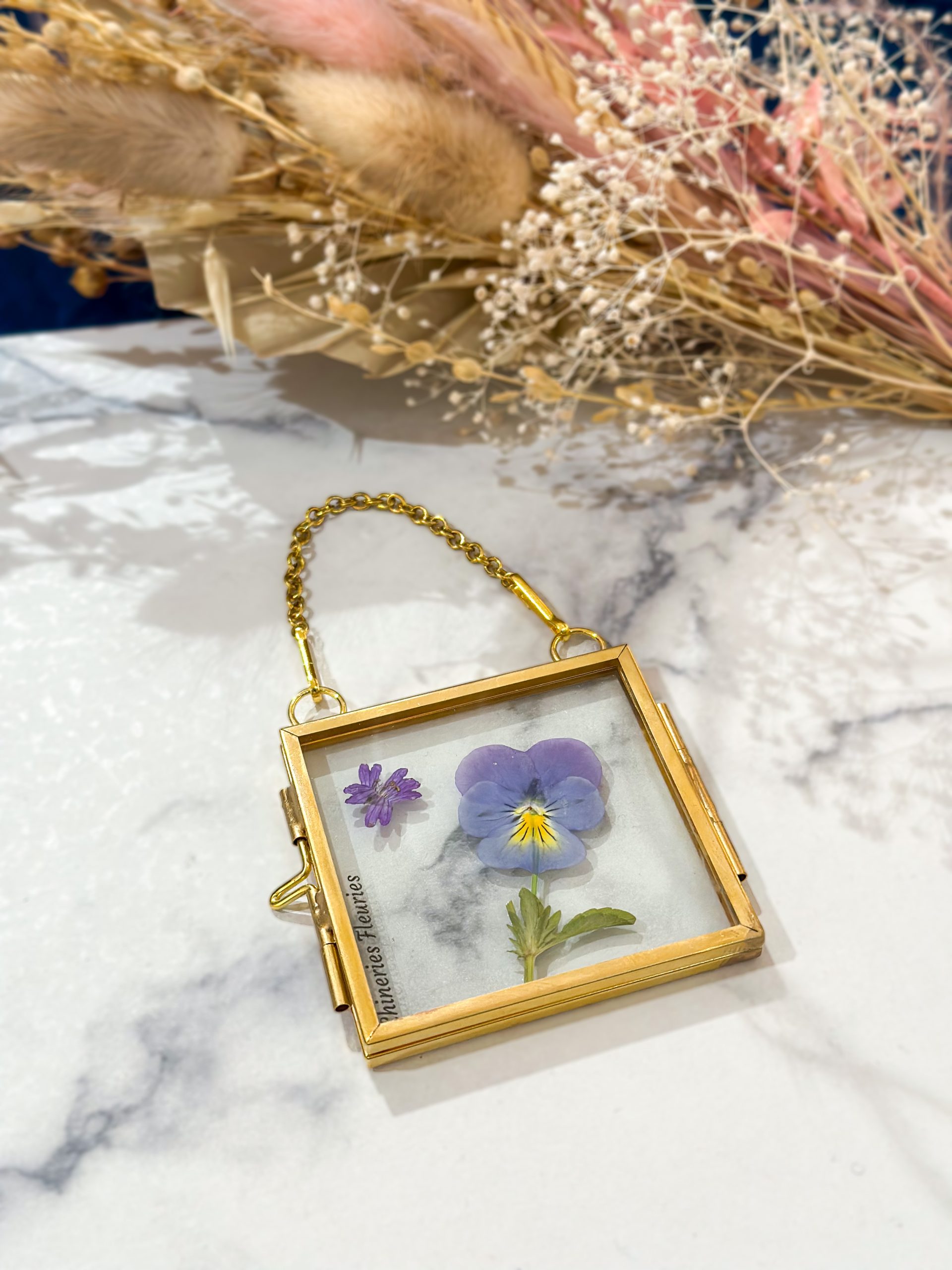 L’herbier Ephéméride est une création unique et artisanale de fleurs pressées, réalisée dans mon atelier lyonnais. Il présente une fleur de pensée aux tons violet pervenche, dans un petit cadre en métal doré, à suspendre.