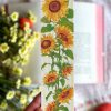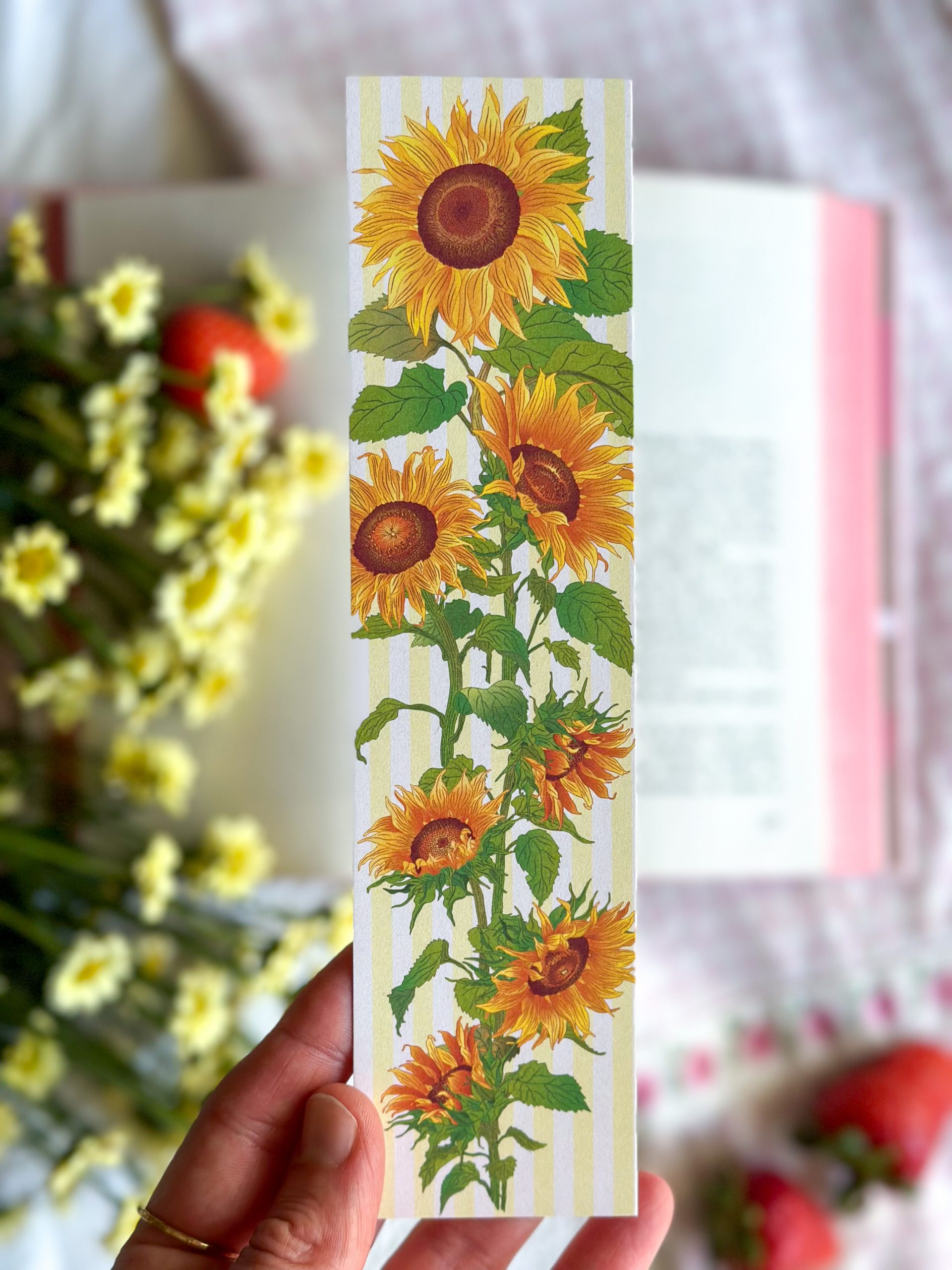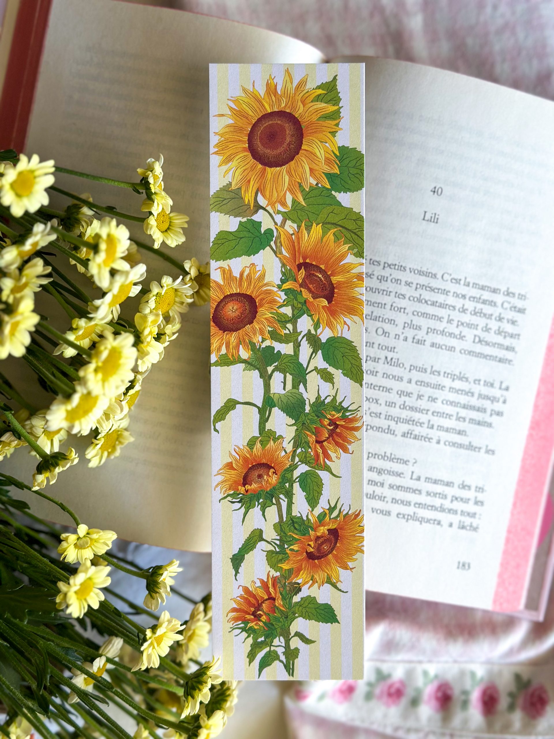 De grands tournesols s’entremêlent sur un fond rayé jaune, nous plongeant dans l’été et le soleil.