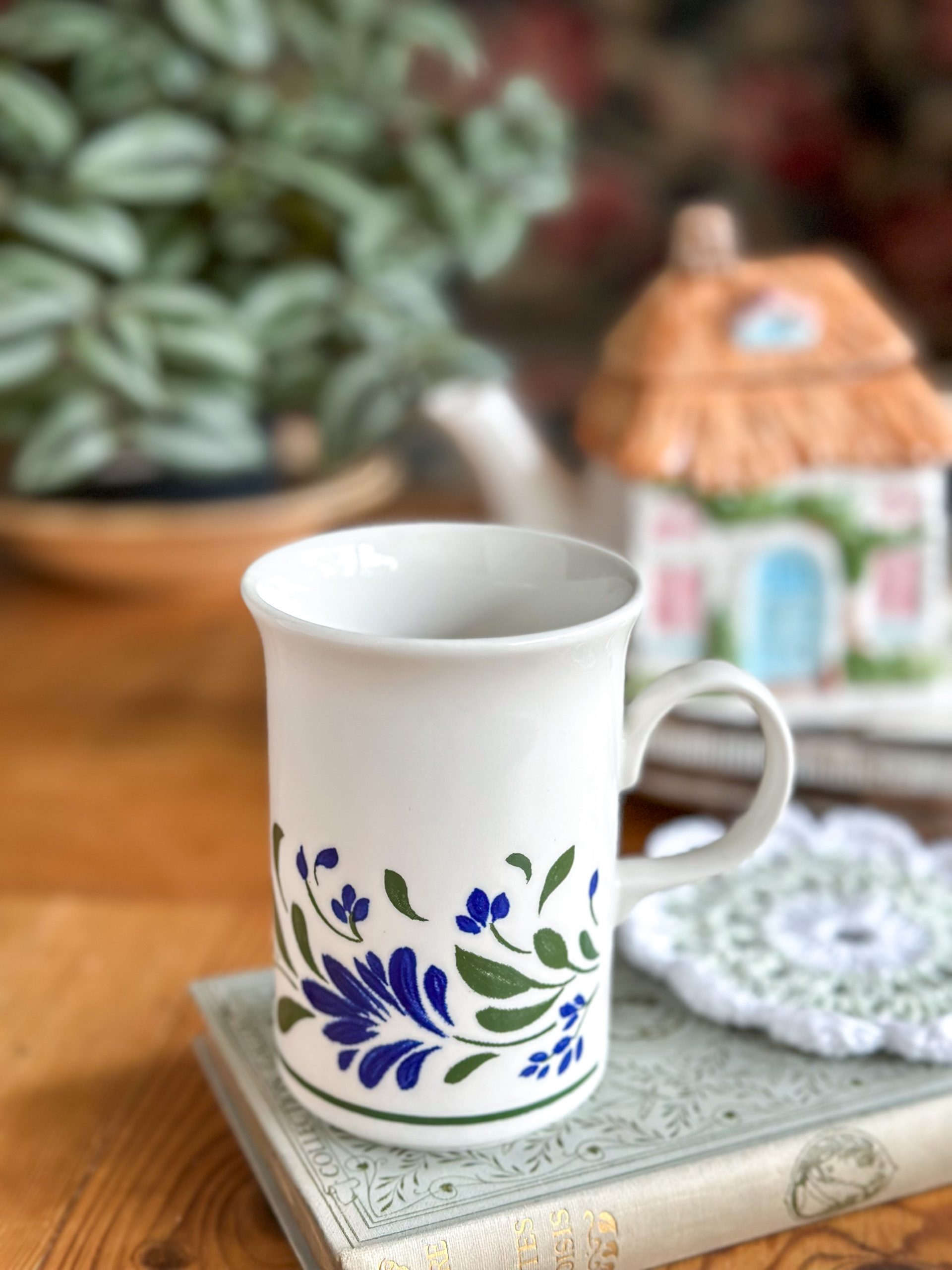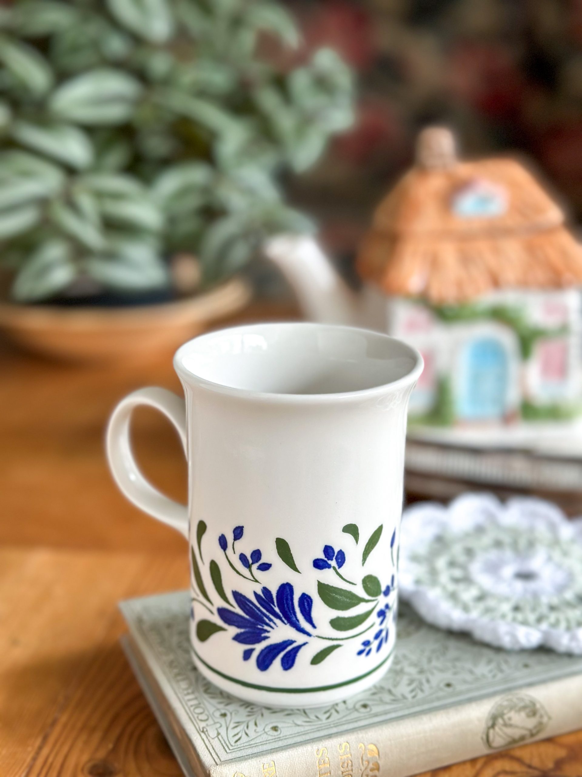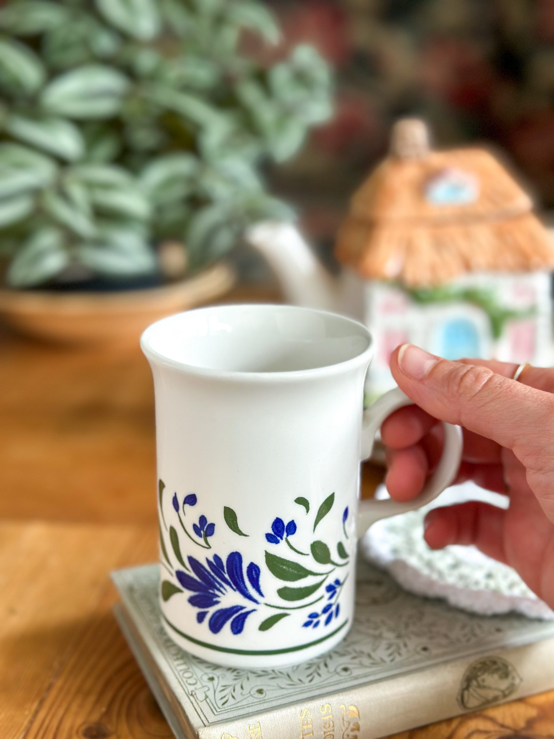 Un beau mug anglais vintage ! On aime beaucoup sa jolie forme et son décor peint en liseré, de fleurs bleues et leurs feuillages. Un mug qui deviendra votre chouchou pour les pauses thé ou café !