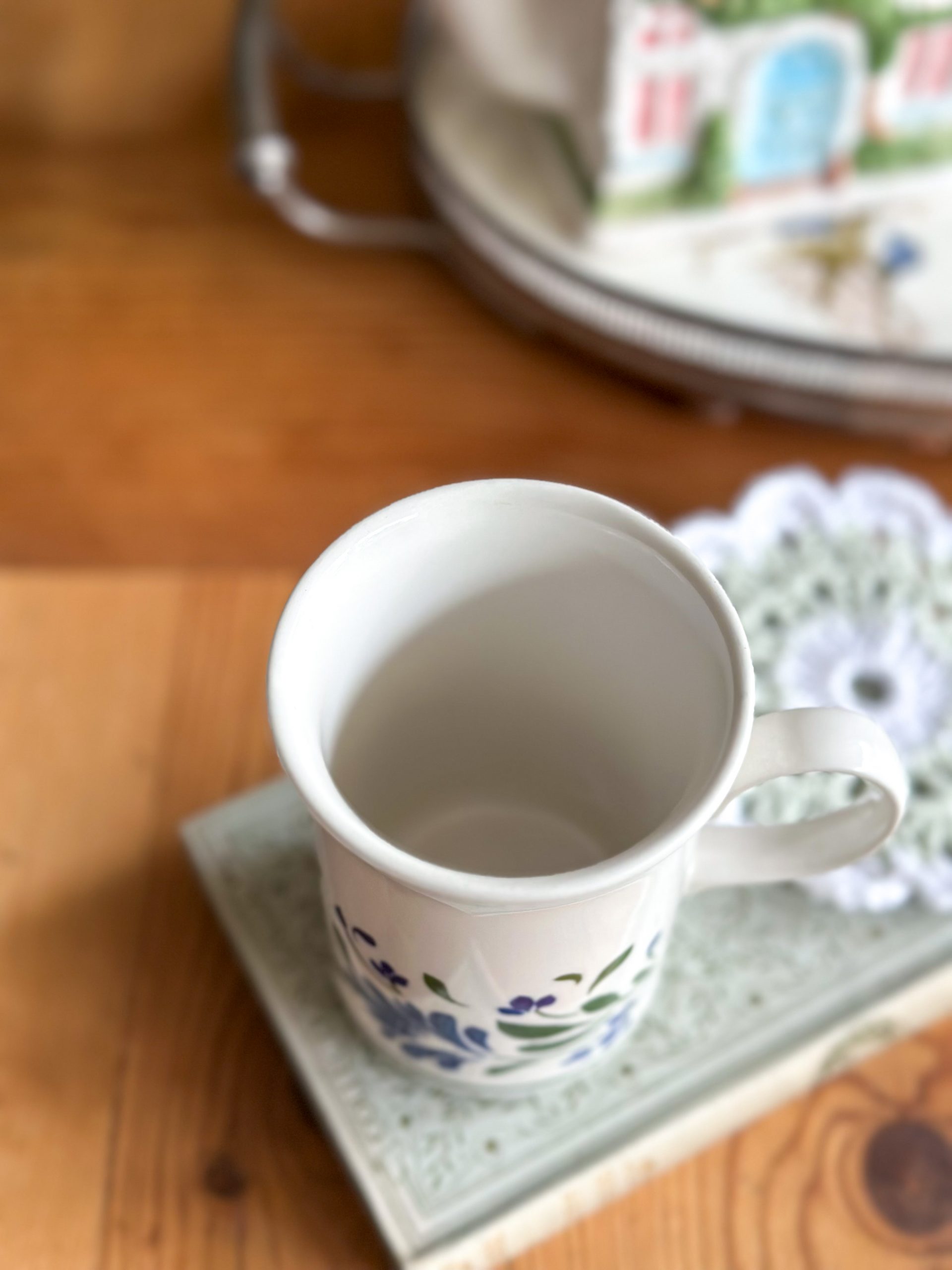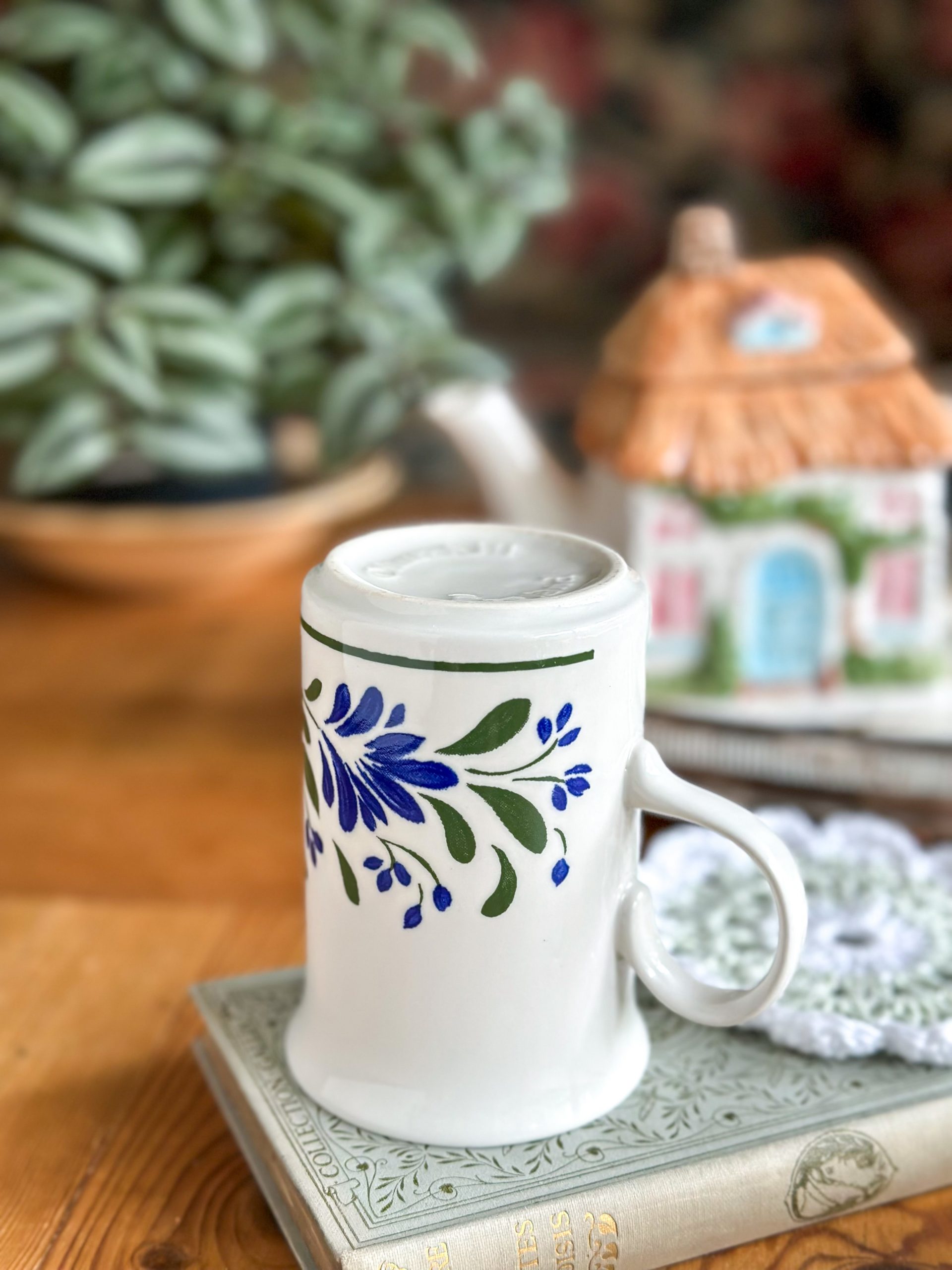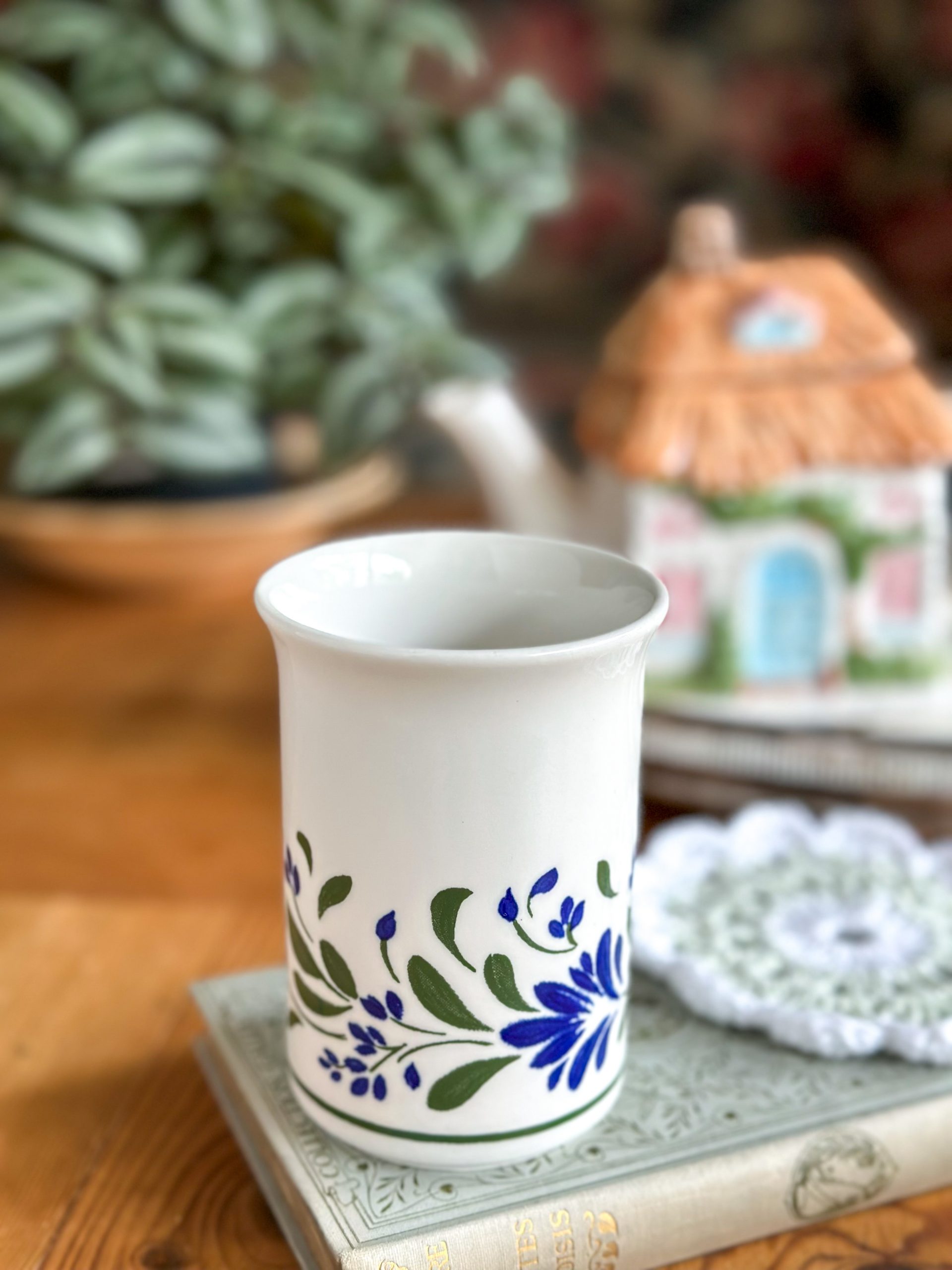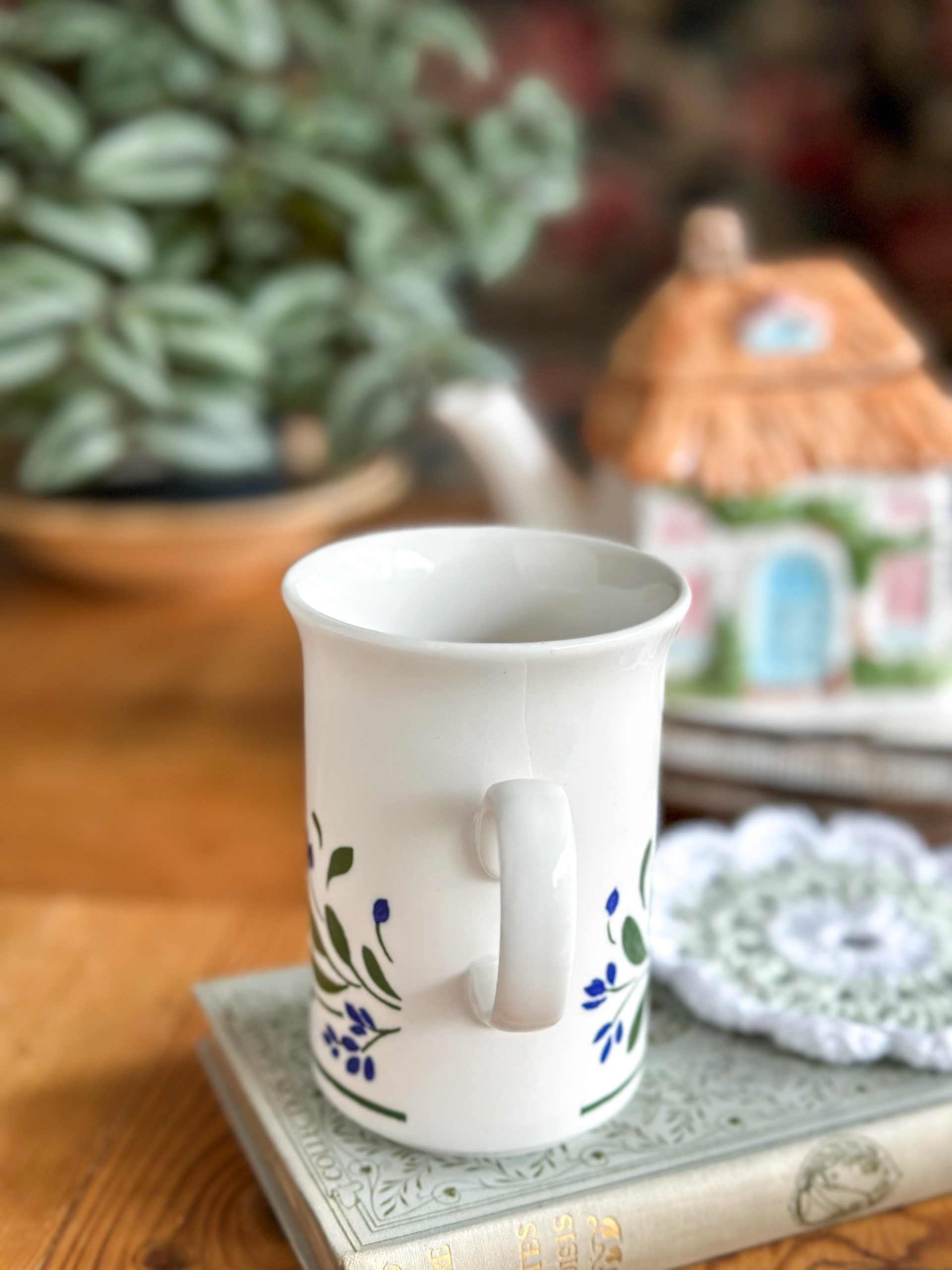 Un beau mug anglais vintage ! On aime beaucoup sa jolie forme et son décor peint en liseré, de fleurs bleues et leurs feuillages. Un mug qui deviendra votre chouchou pour les pauses thé ou café !