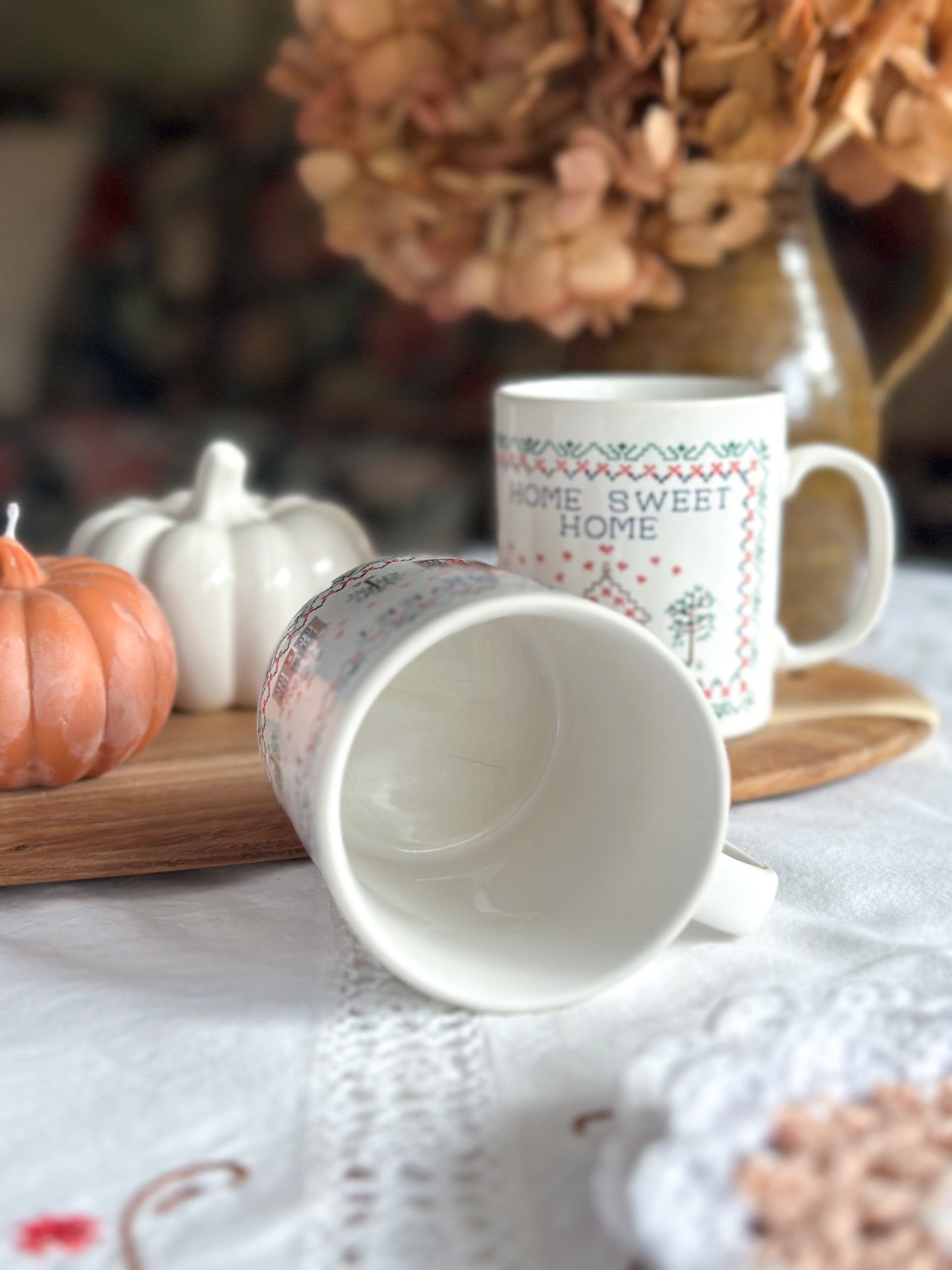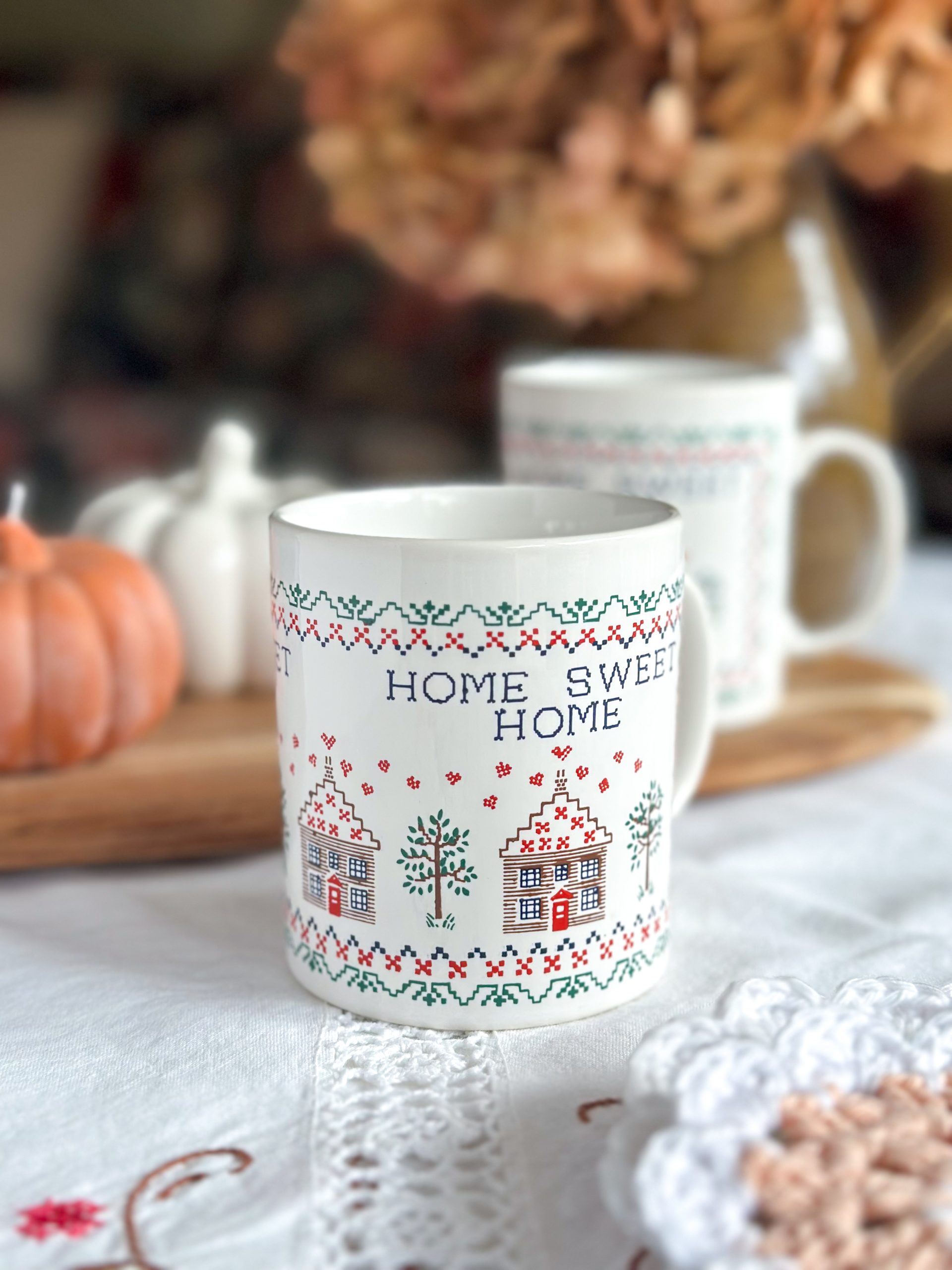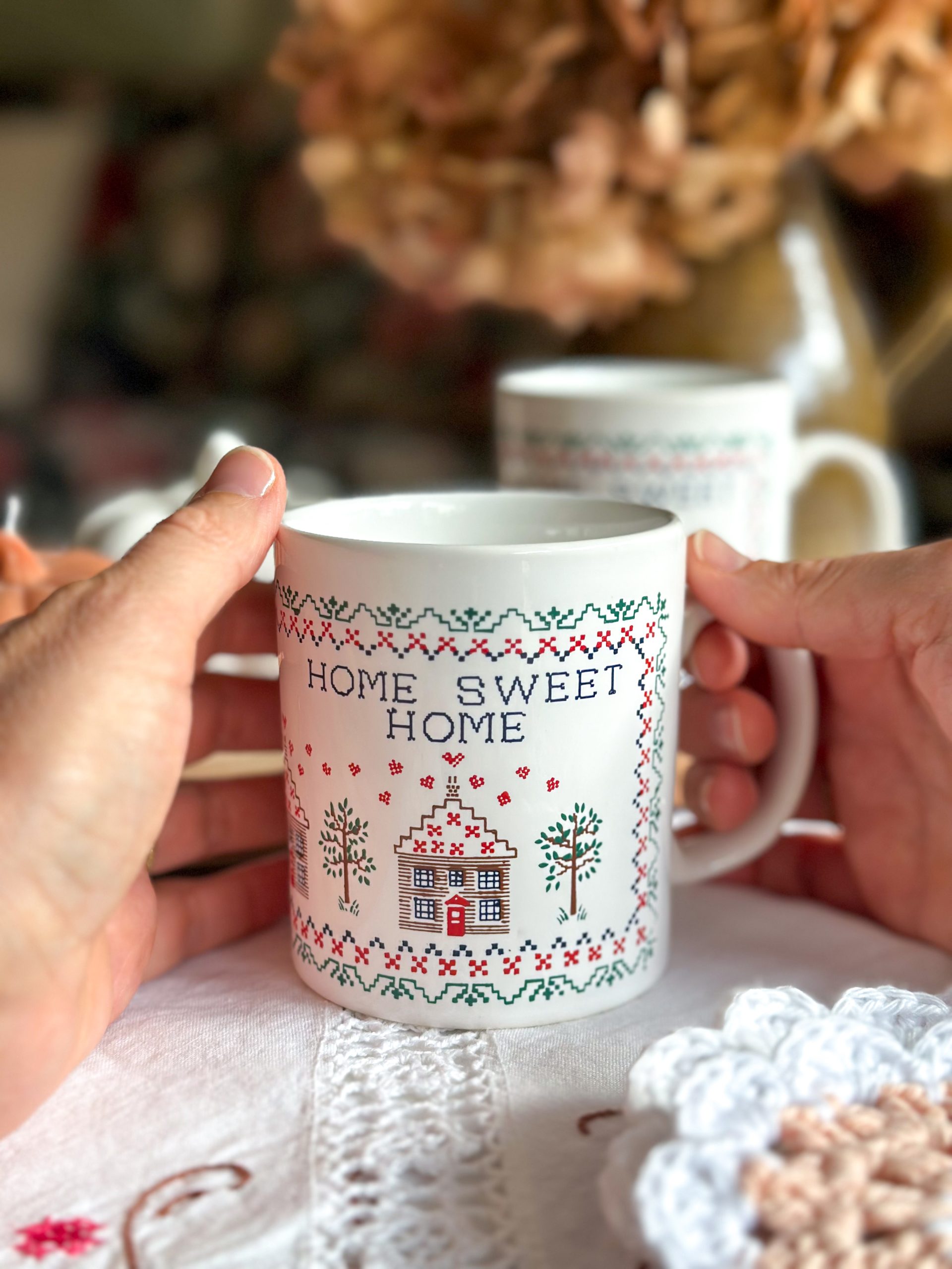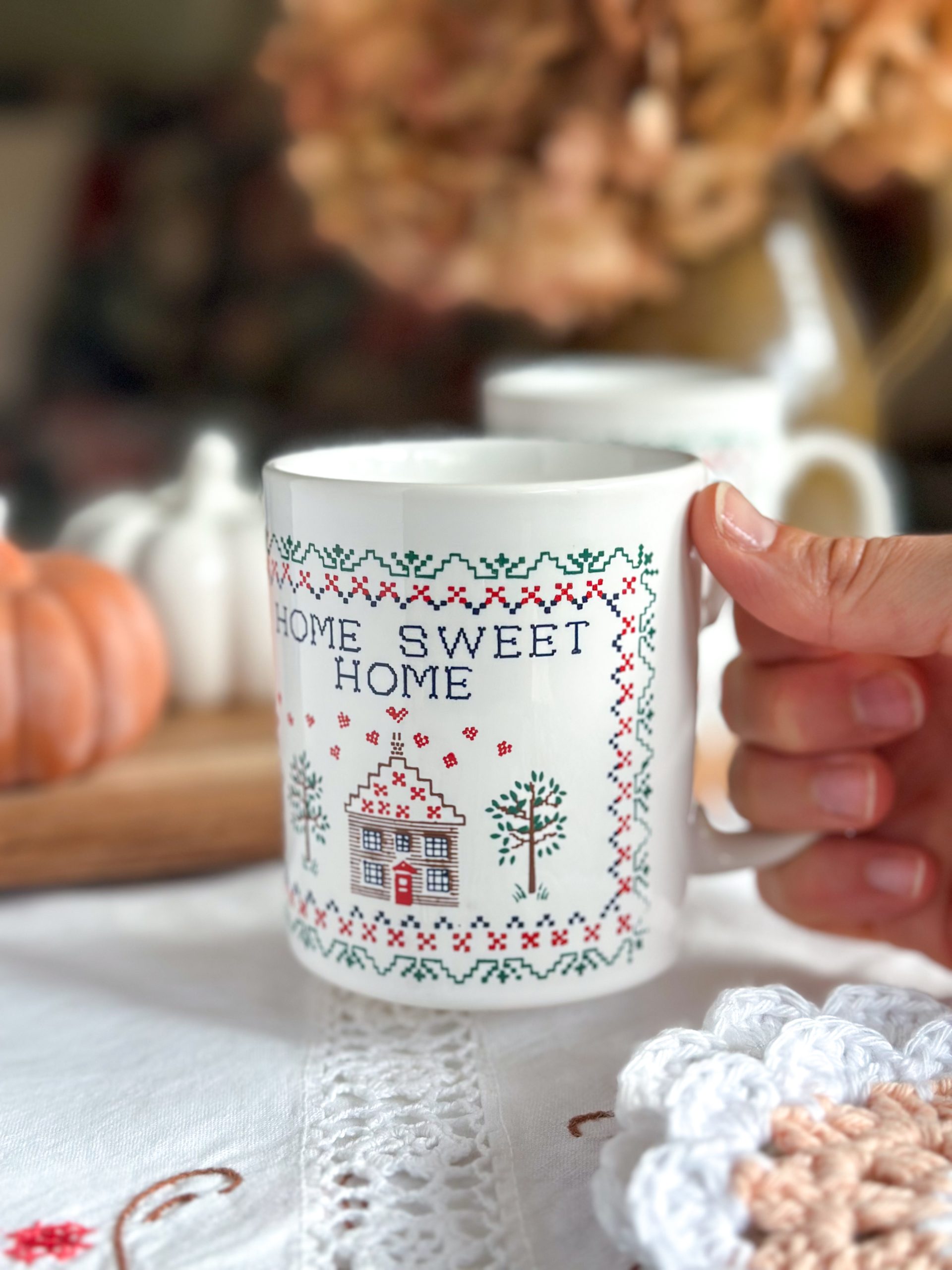 Coup de cœur pour ce mug si cosy ! On adore son joli motif style point de croix et son inscription Home Sweet Home.