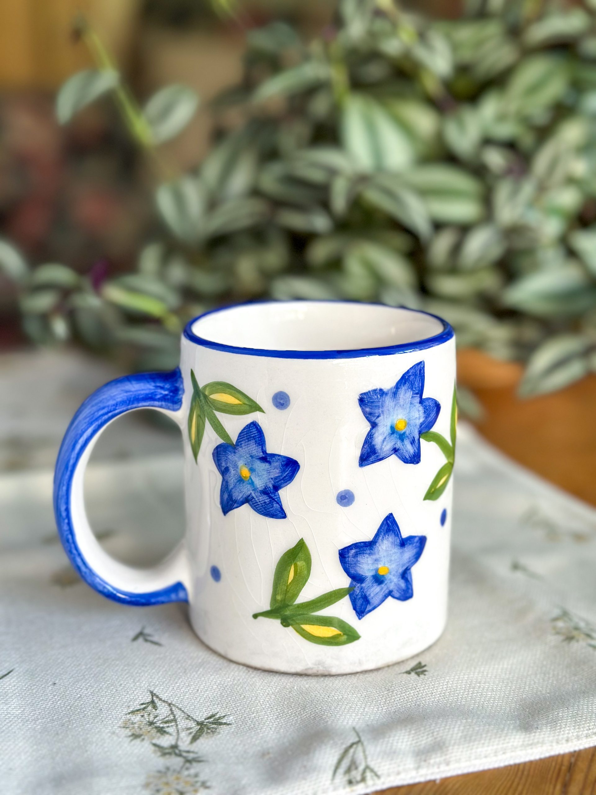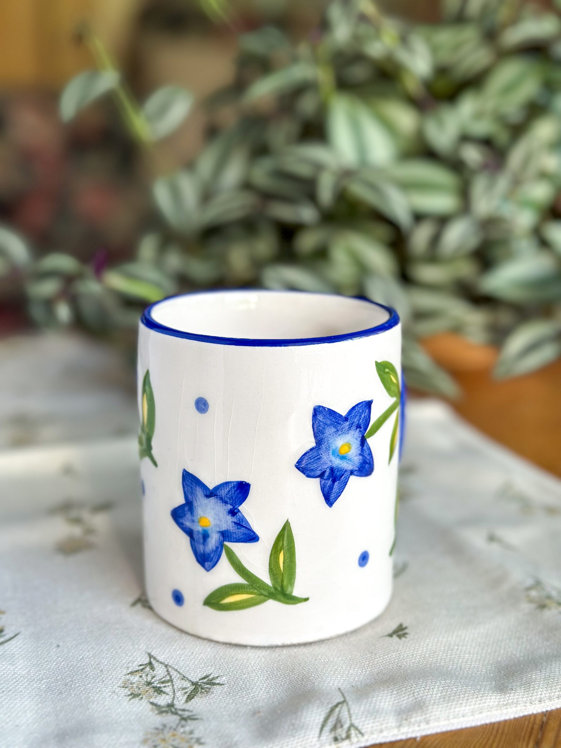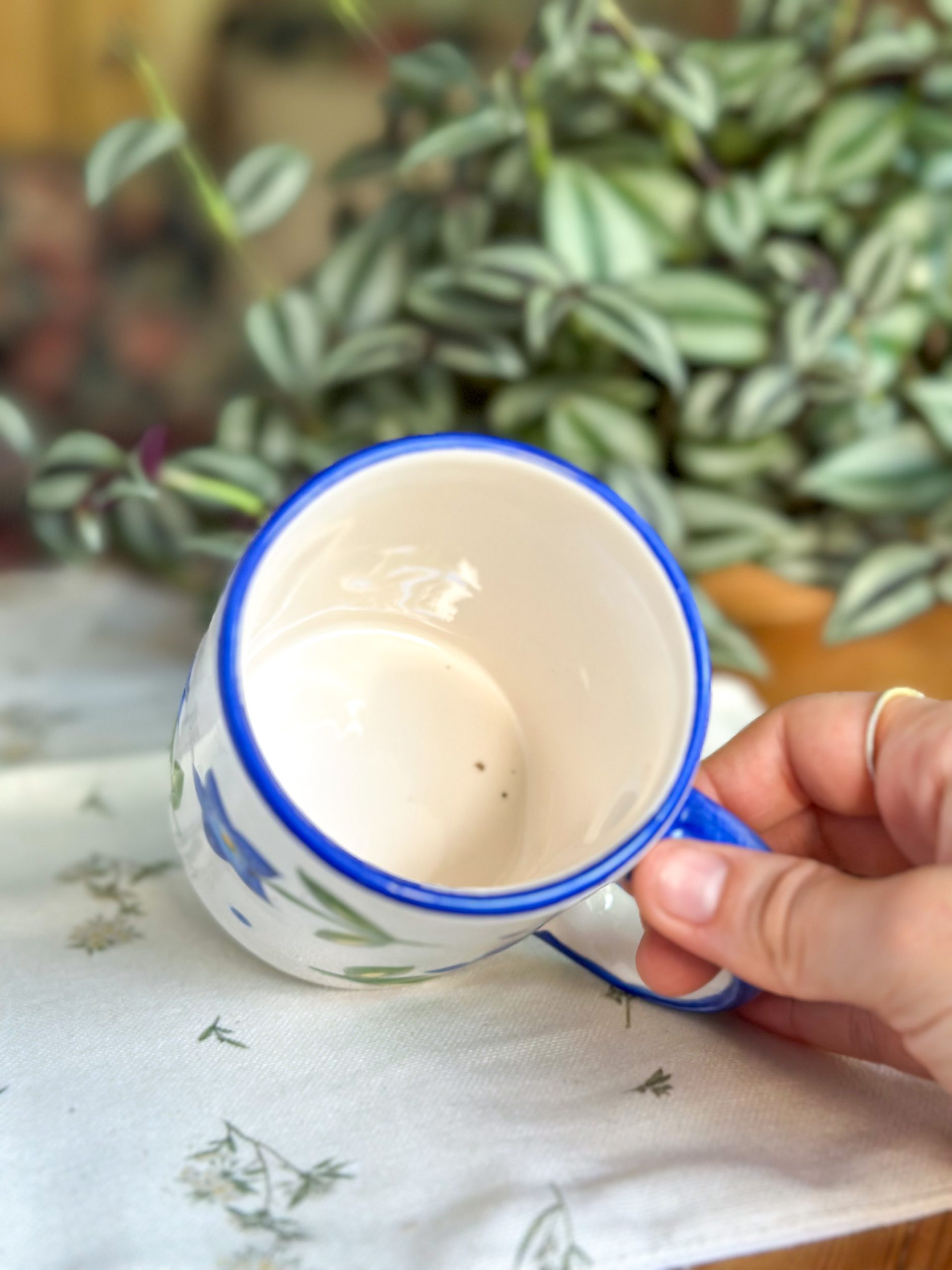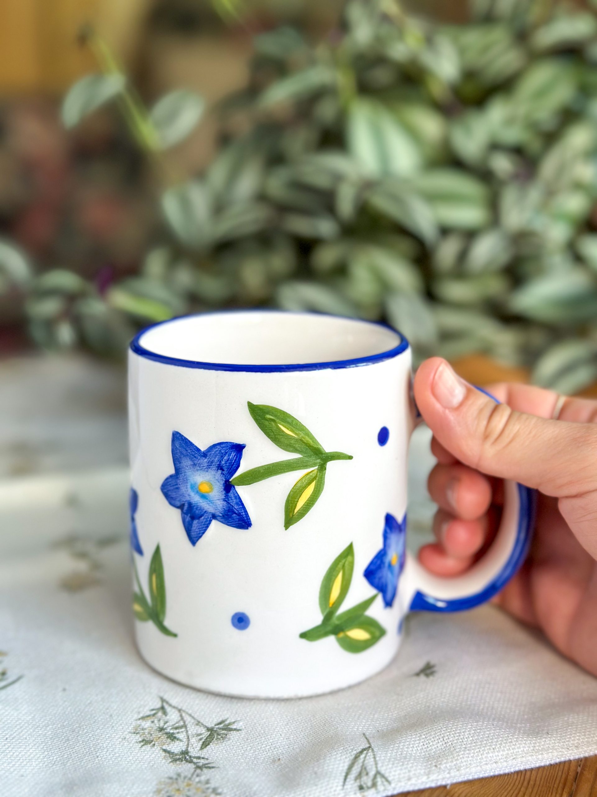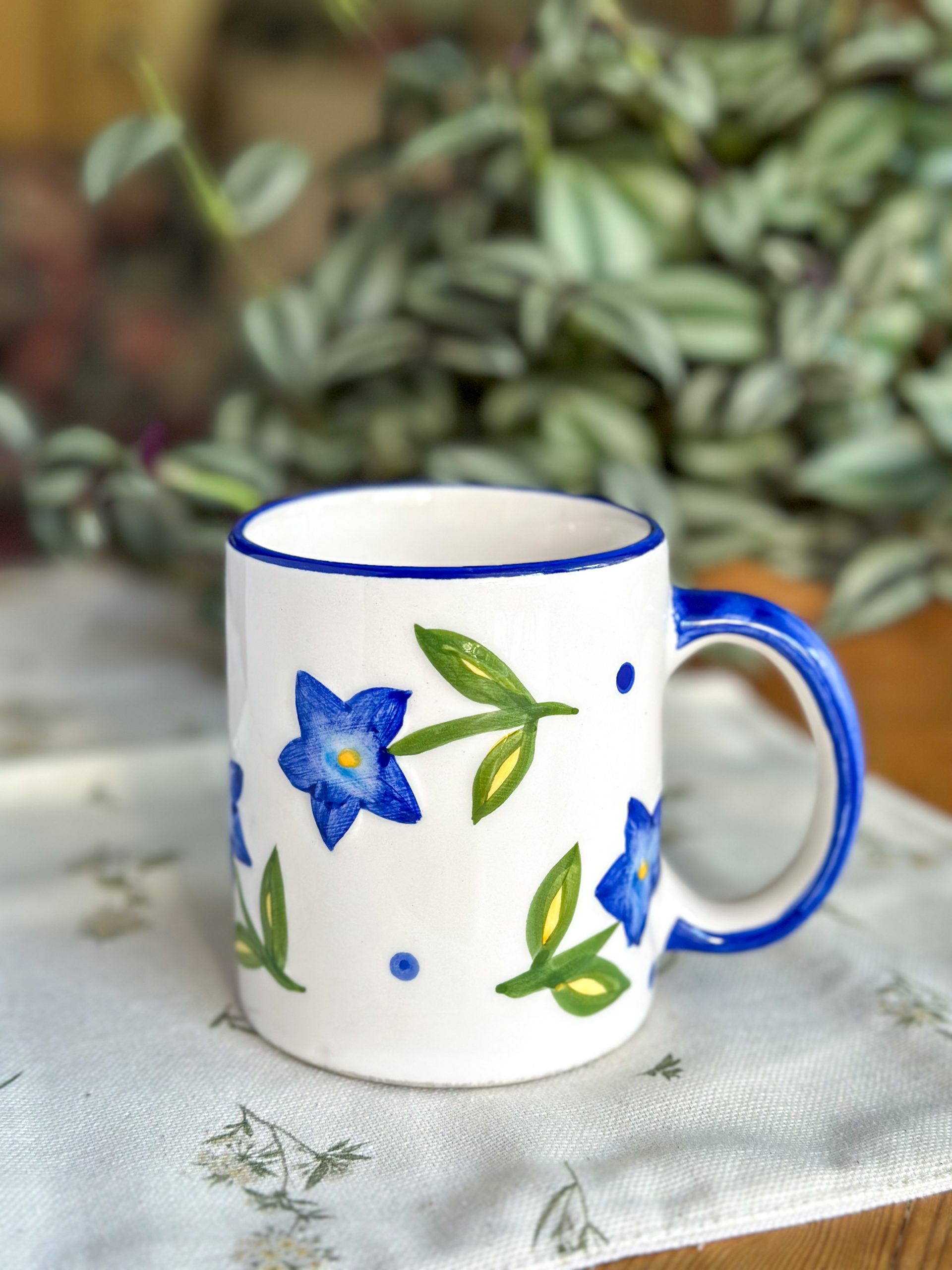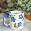 Un joli mug en céramique ! Des fleurs bleues peintes et en relief, des liserés d’un joli bleu, ce mug sera parfait pour vos pauses thé ou café !