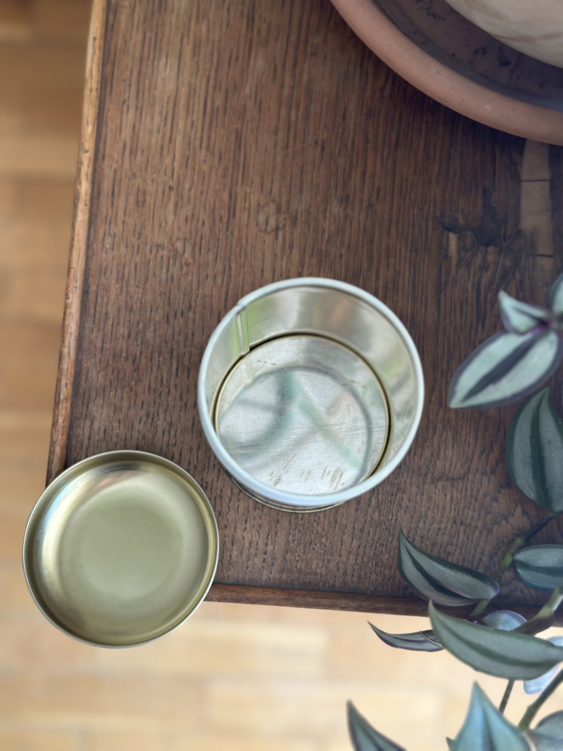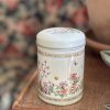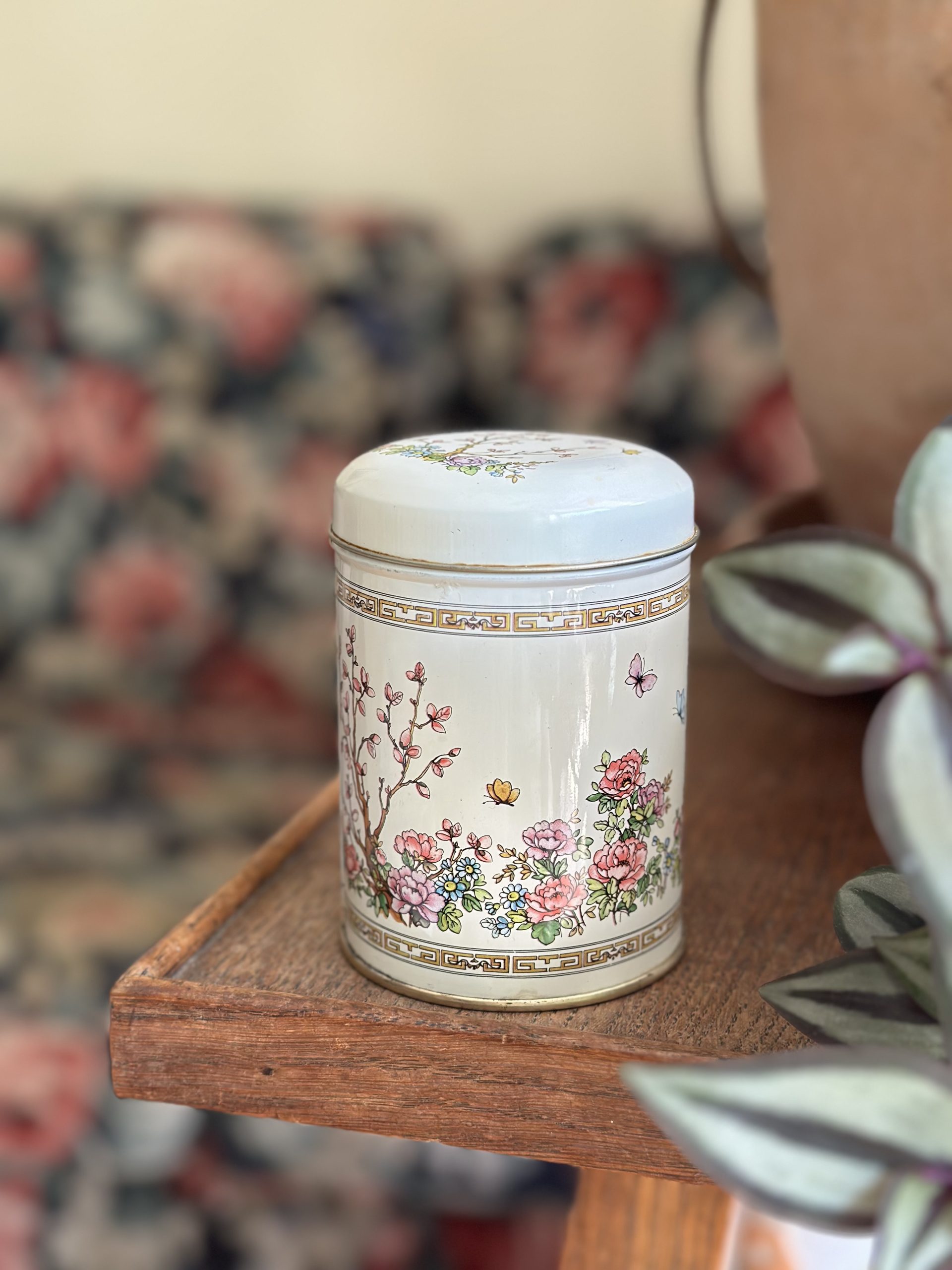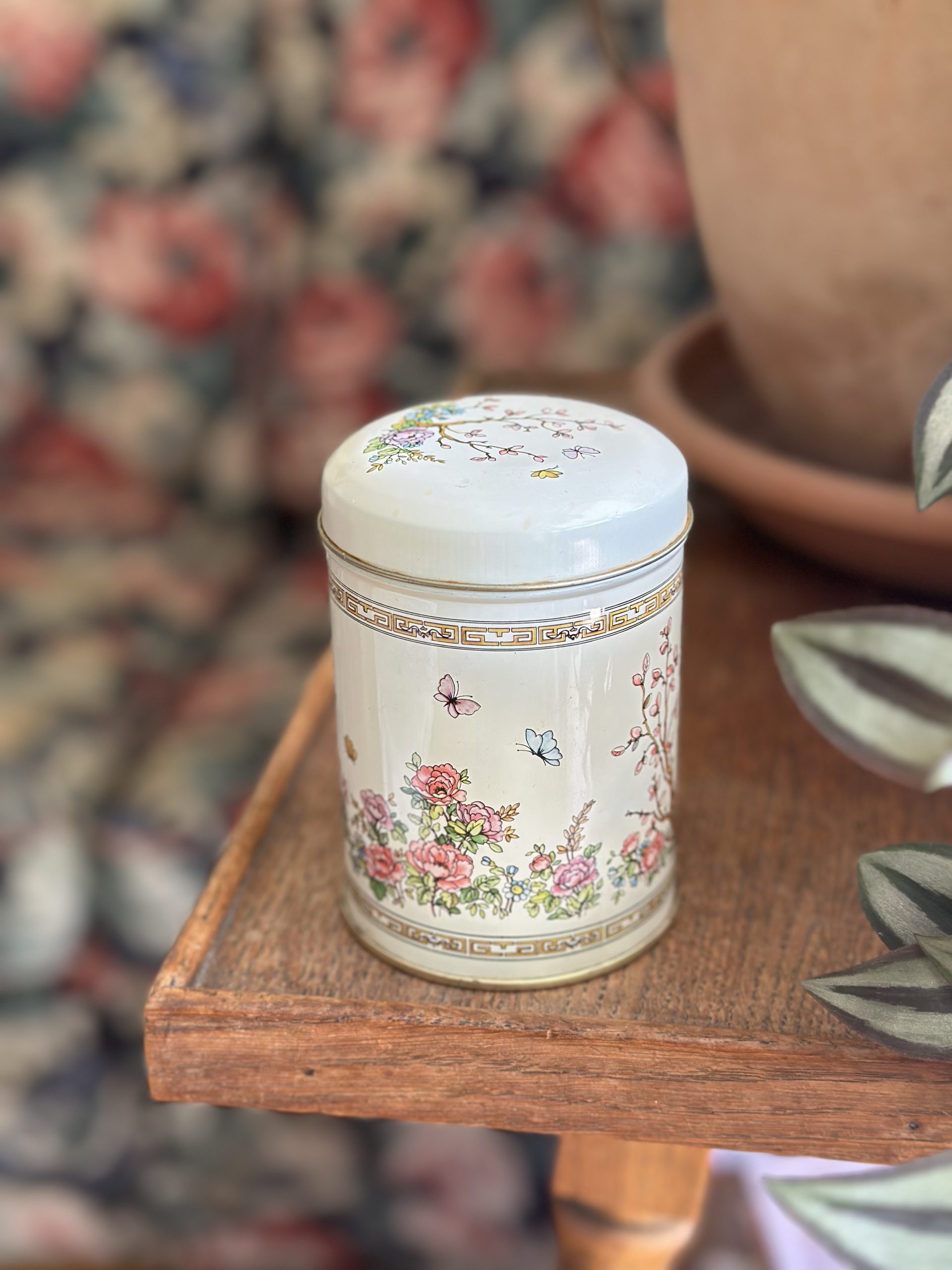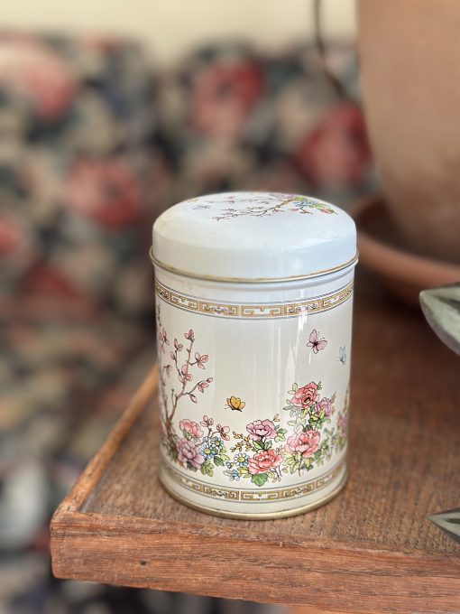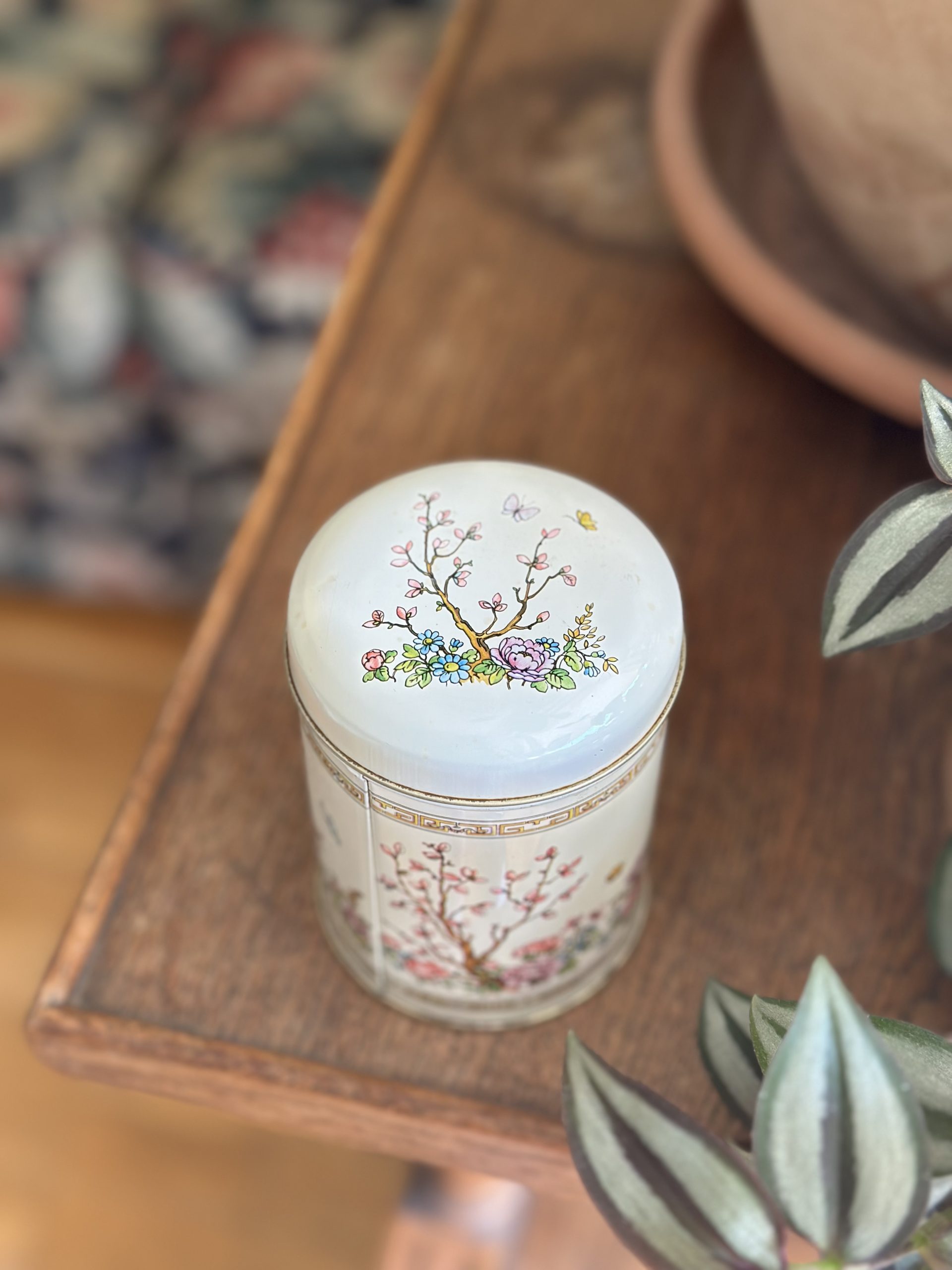 Jolie boite fleurie en métal ! Forme cylindrique et décor fleuri, on adore sa petite taille pour ranger nos petits objets partout dans la maison.