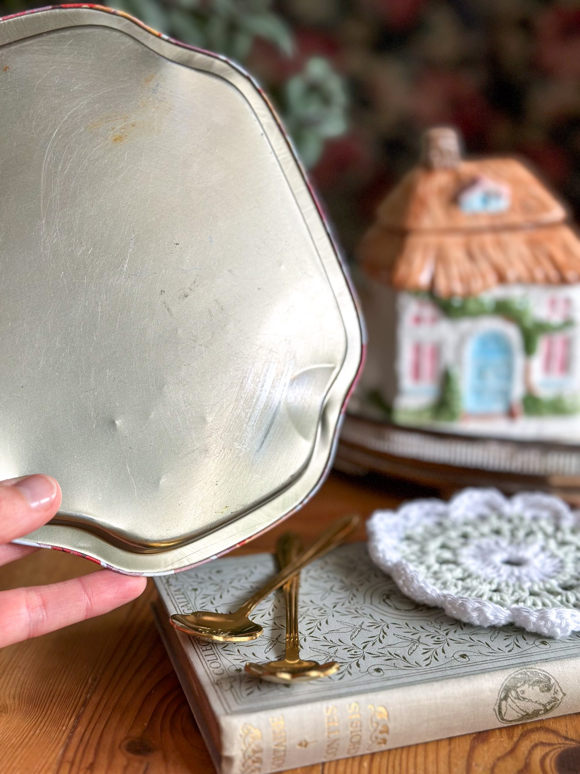 Un joli plateau en métal vintage ! Avec son petit format et ses jolis dessins de fleurs colorées, il sera parfait pour y déposer votre mug et quelques gourmandises. Vous pourrez aussi l’utiliser comme vide-poches, ou comme petit plateau de cuisine, à vous de voir !