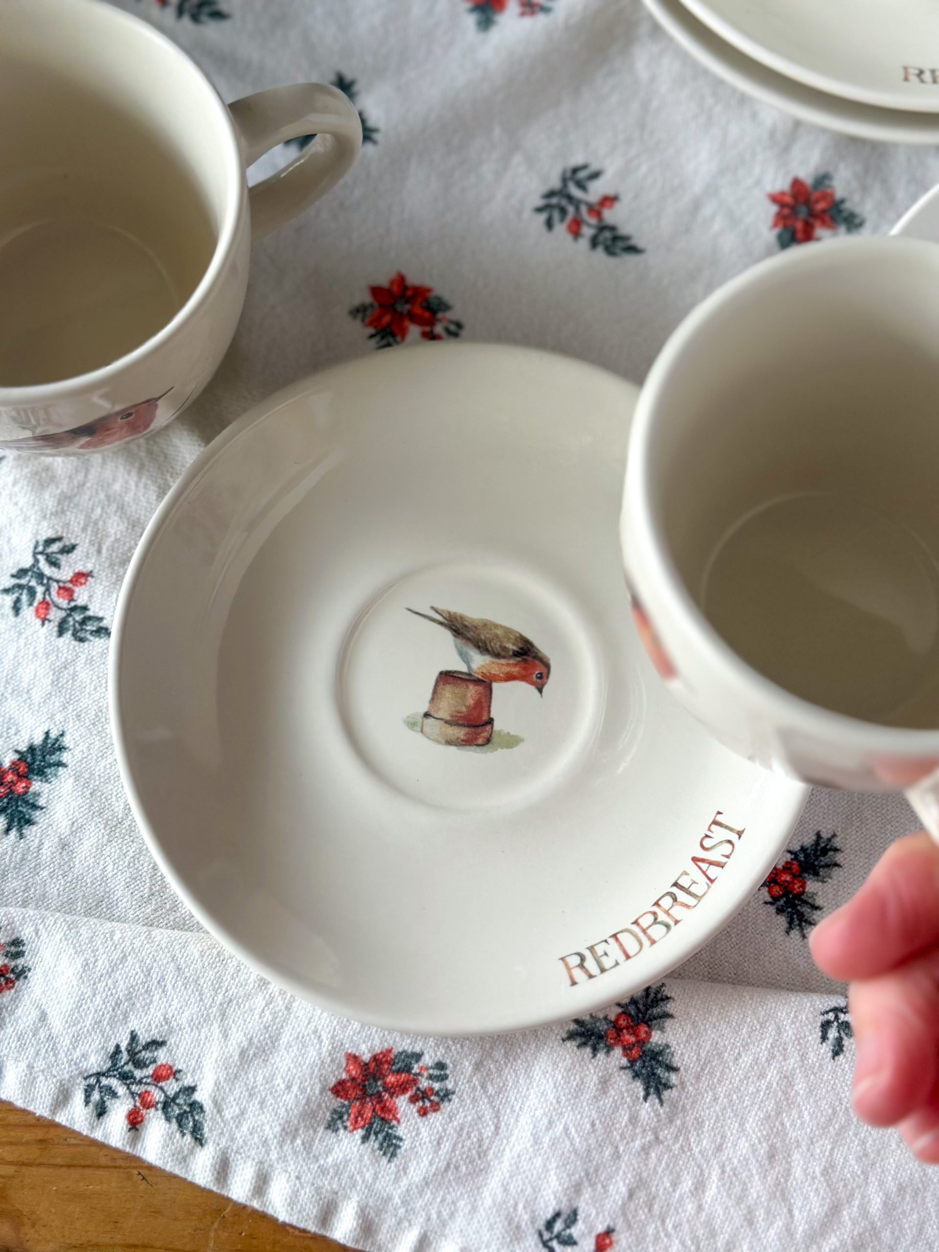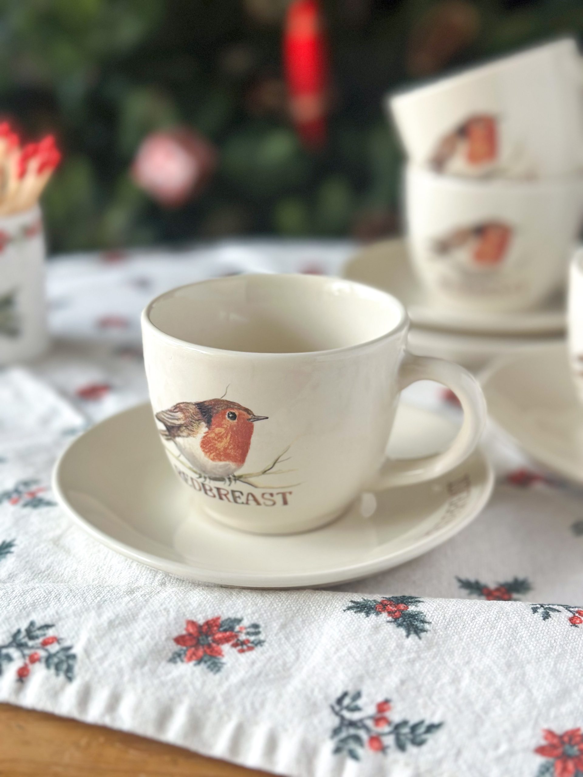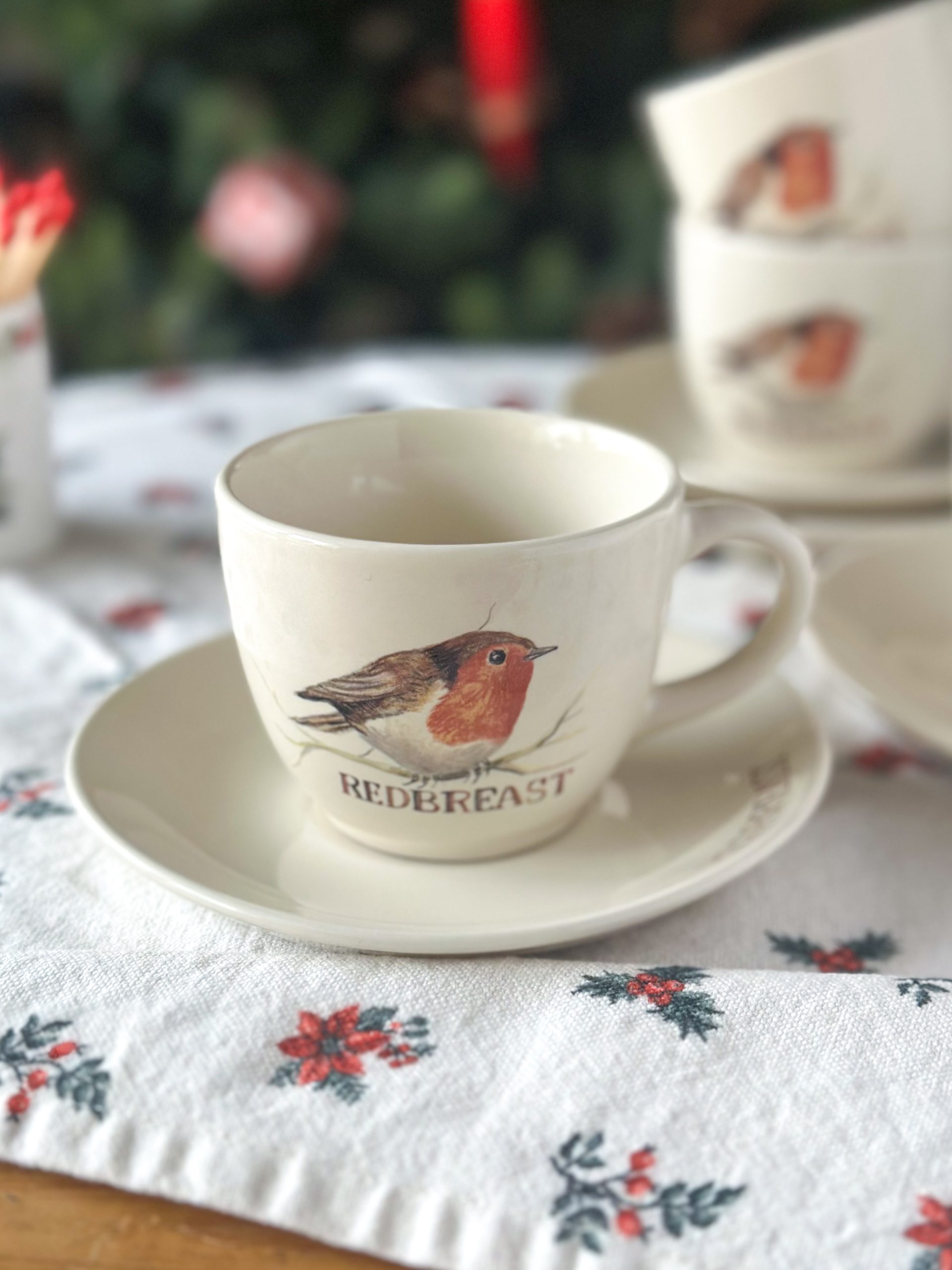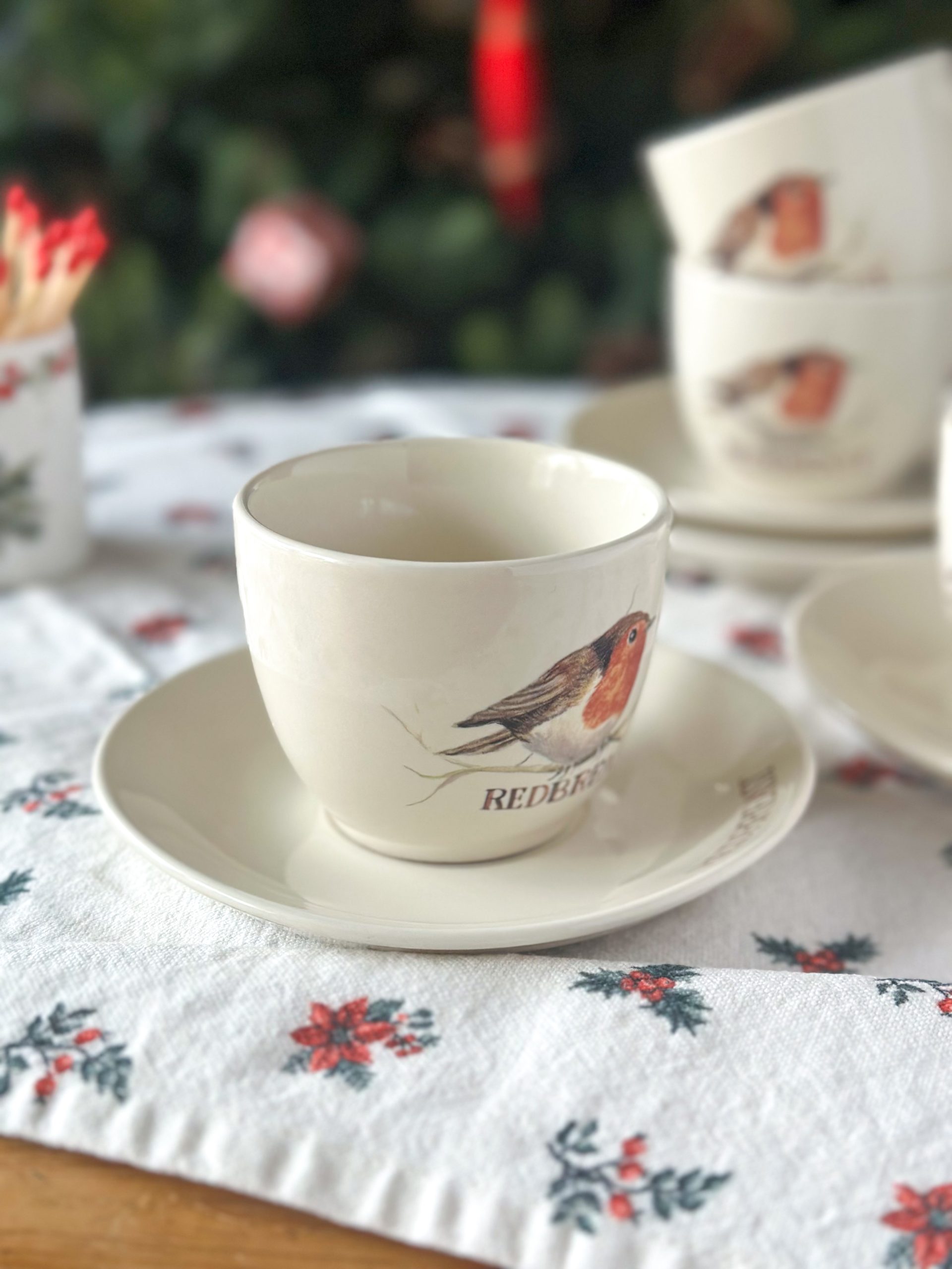 Coup de coeur pour cette tasse ! On adore ses superbes dessins de rouge-gorges, cet oiseau qu’on adore observer au jardin. Sa sous-tasse qui l’accompagne est également décorée, ainsi que le dos de la tasse avec un petit rappel et un oisillon.