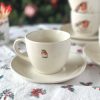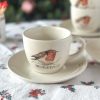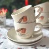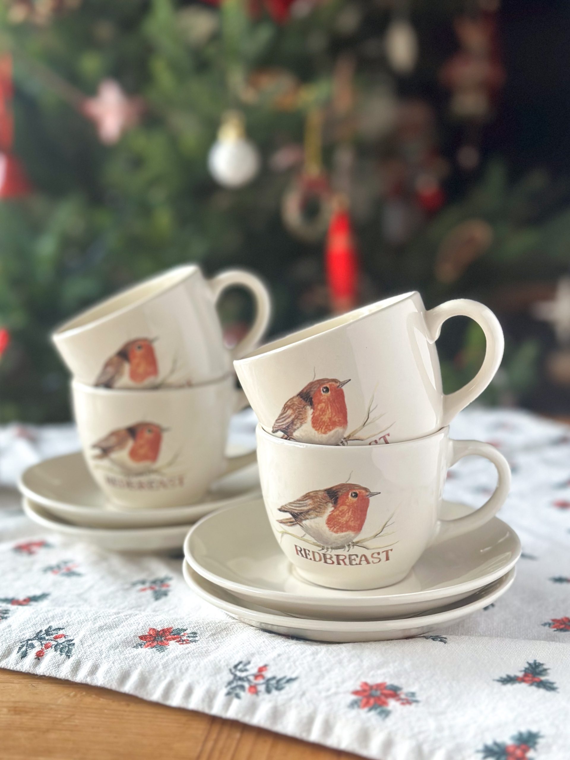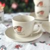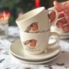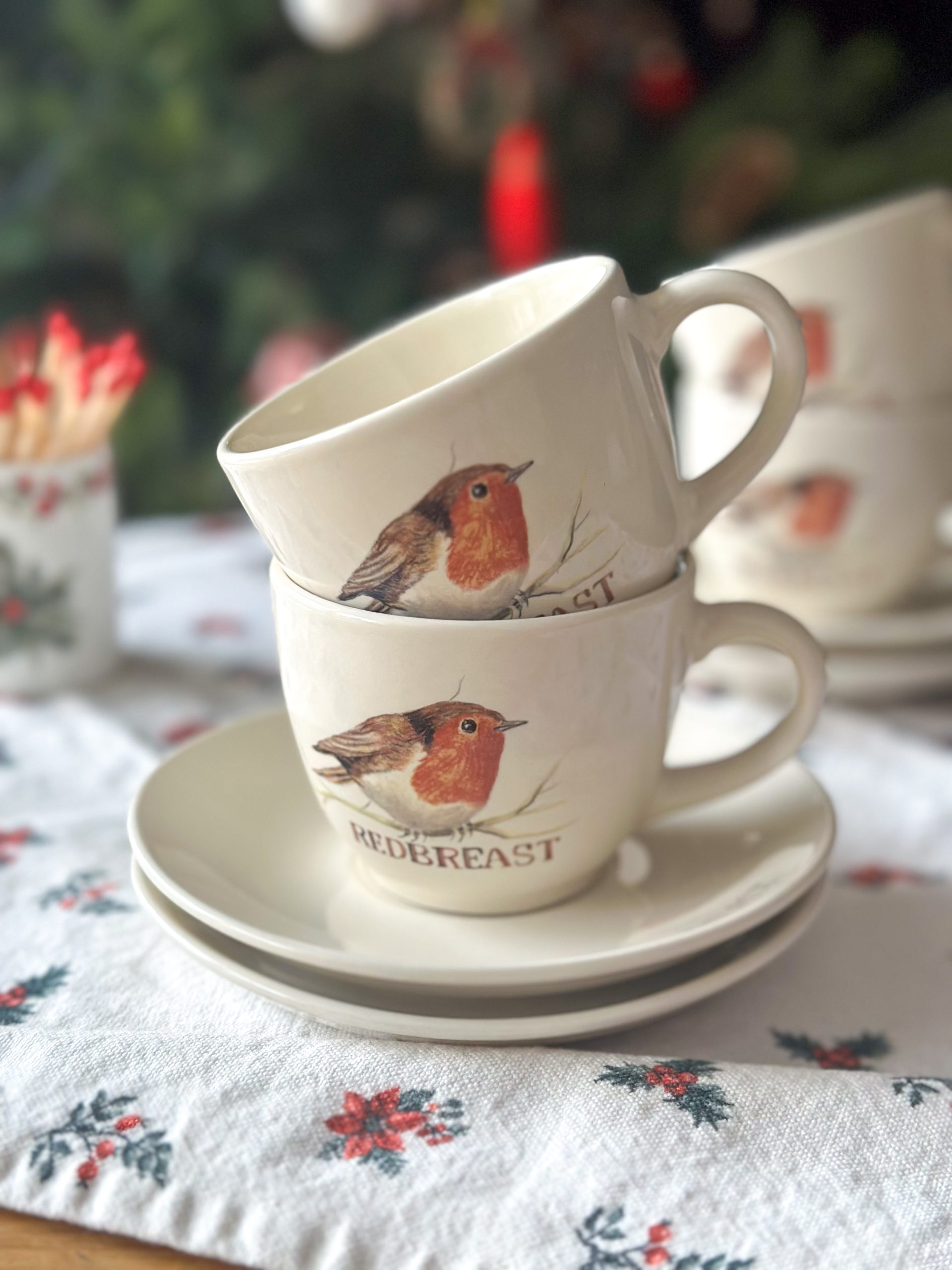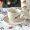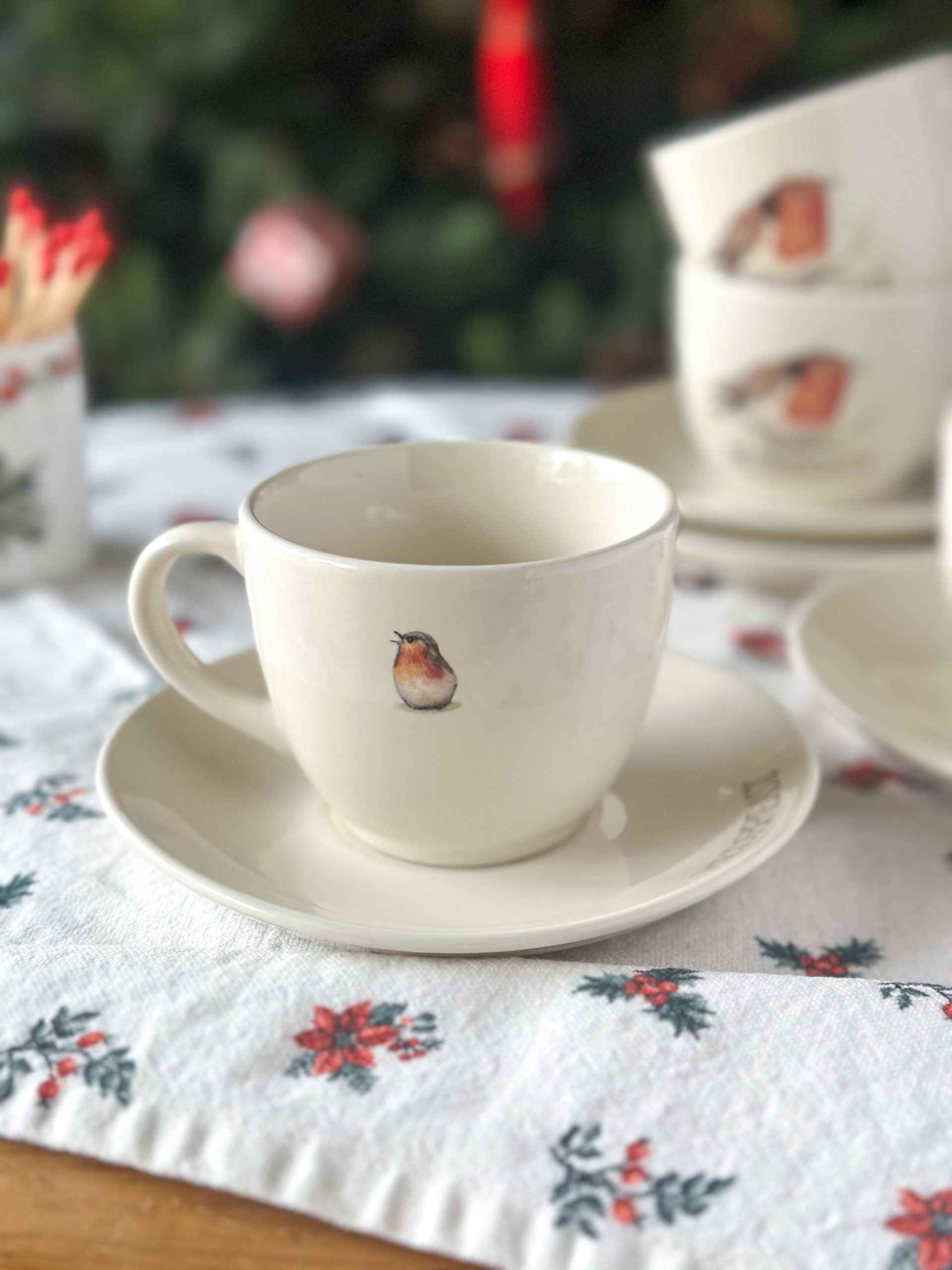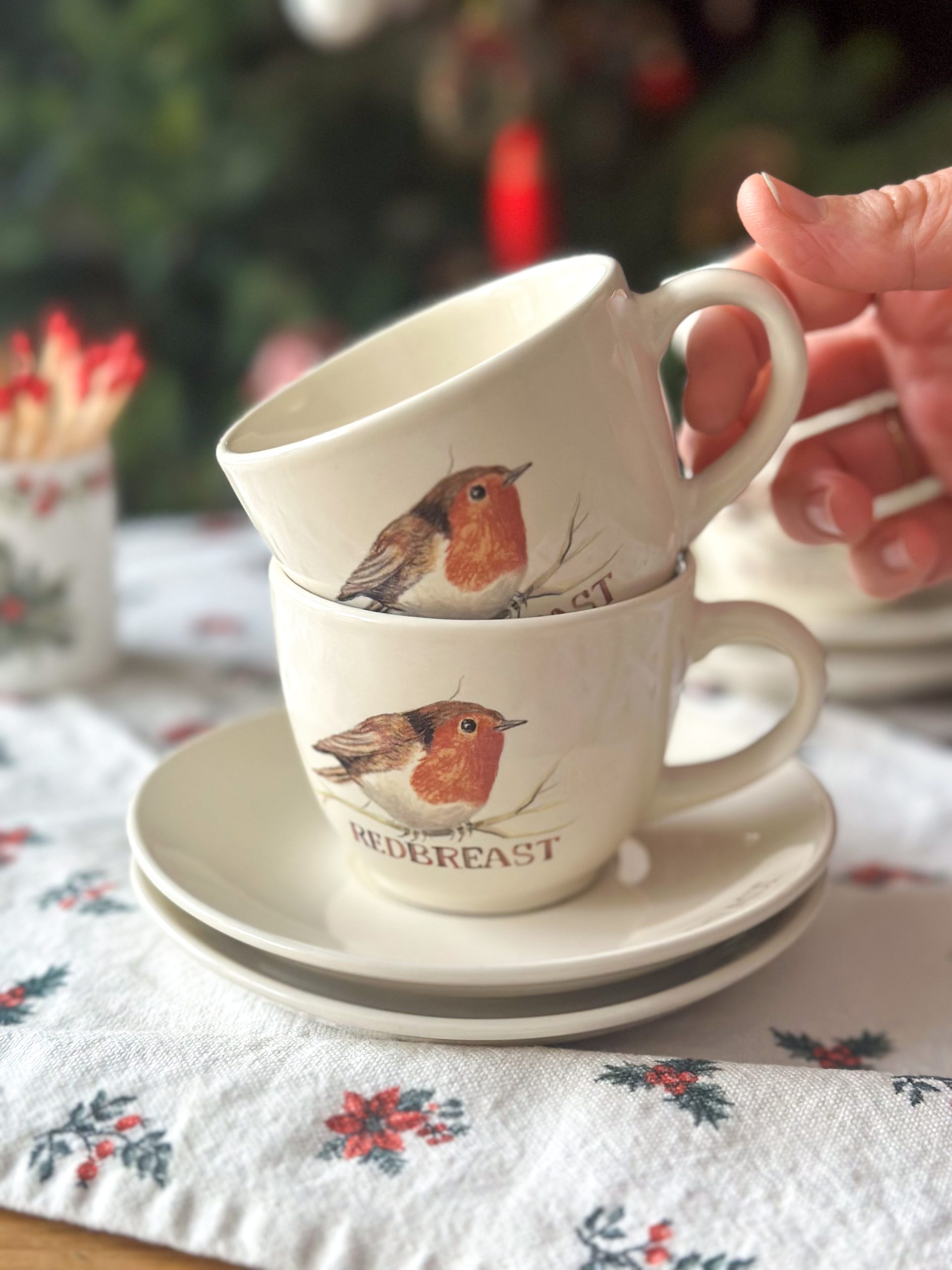 Coup de coeur pour cette tasse ! On adore ses superbes dessins de rouge-gorges, cet oiseau qu’on adore observer au jardin. Sa sous-tasse qui l’accompagne est également décorée, ainsi que le dos de la tasse avec un petit rappel et un oisillon.