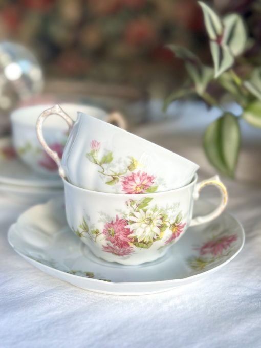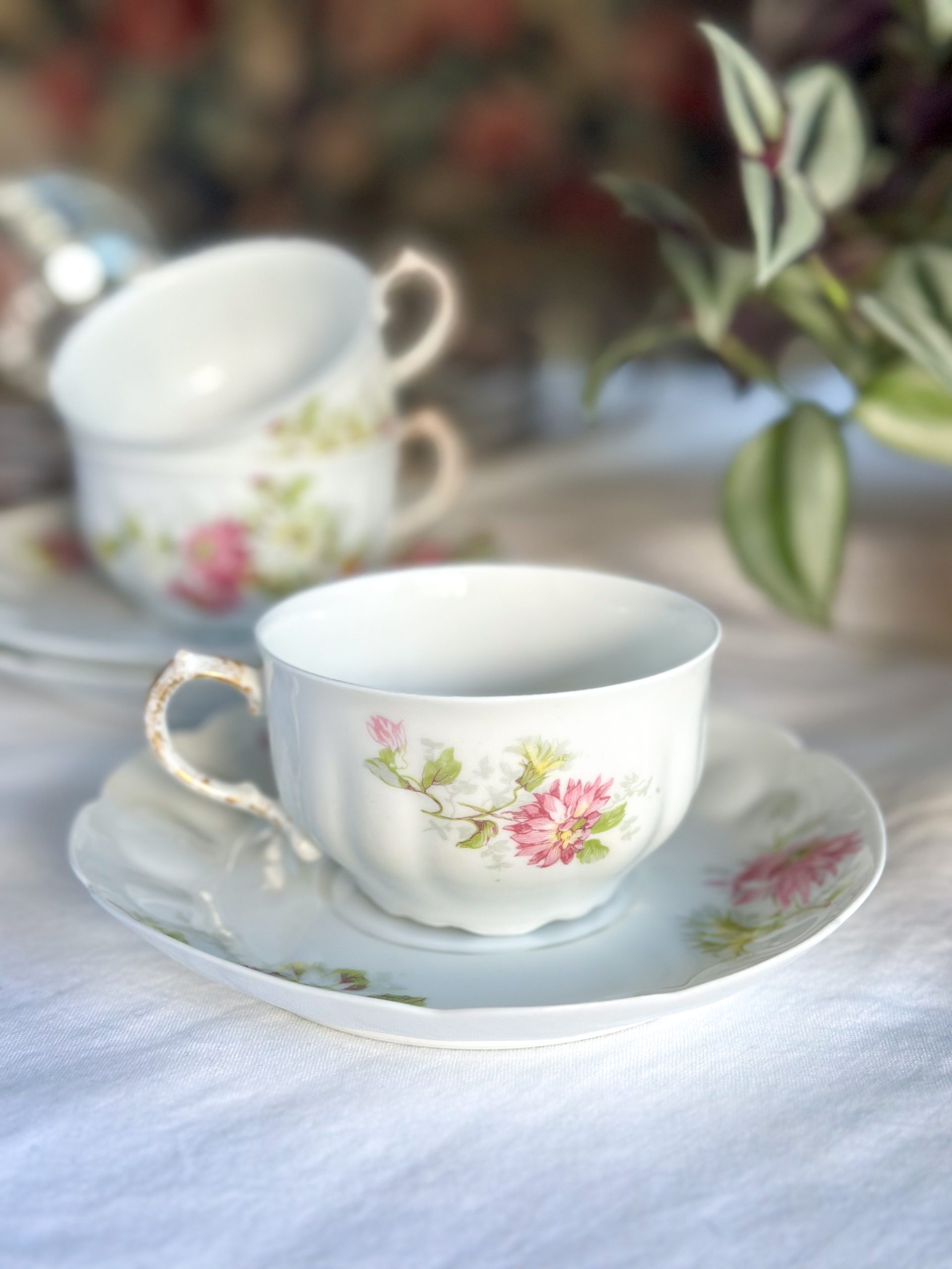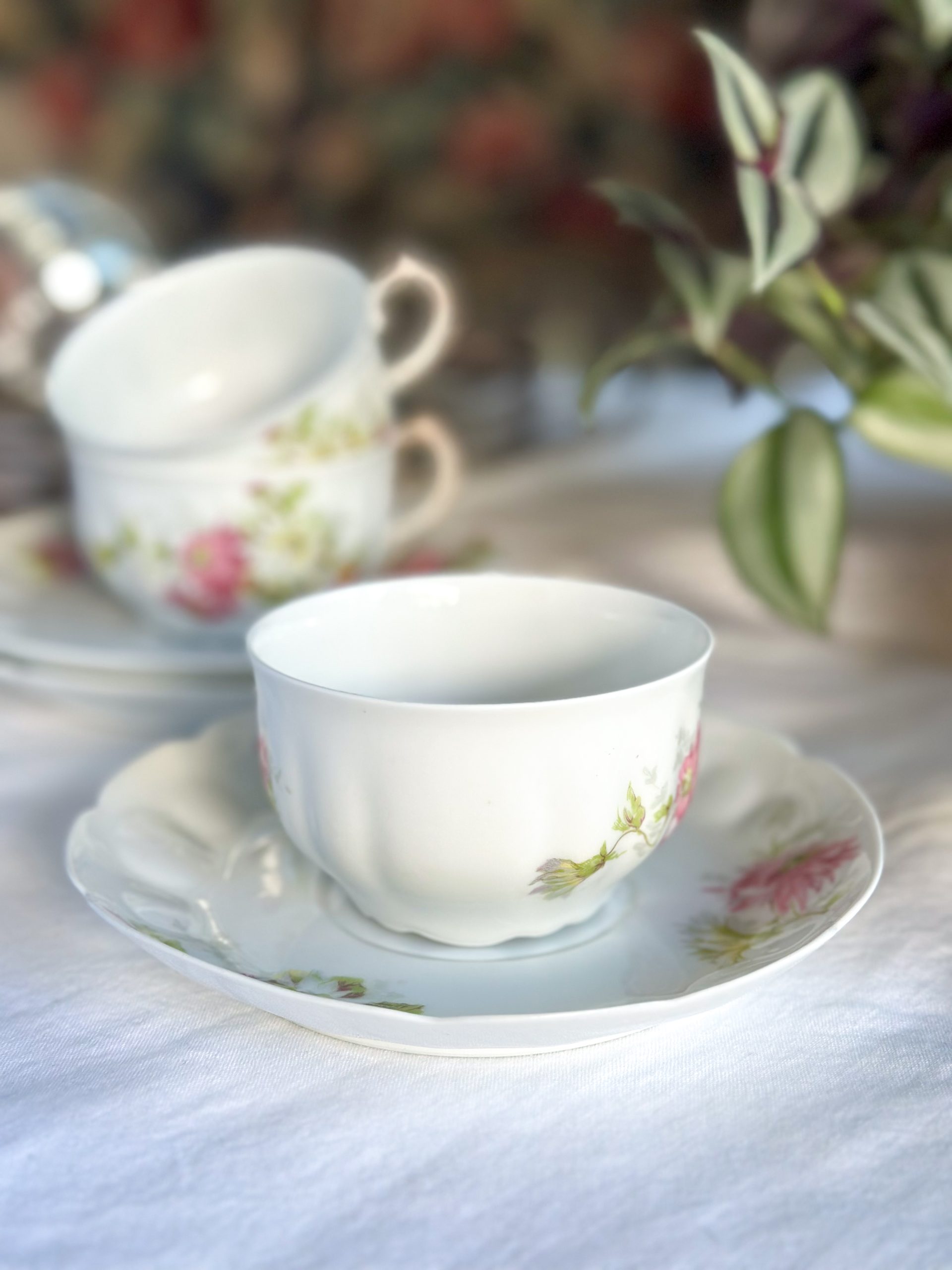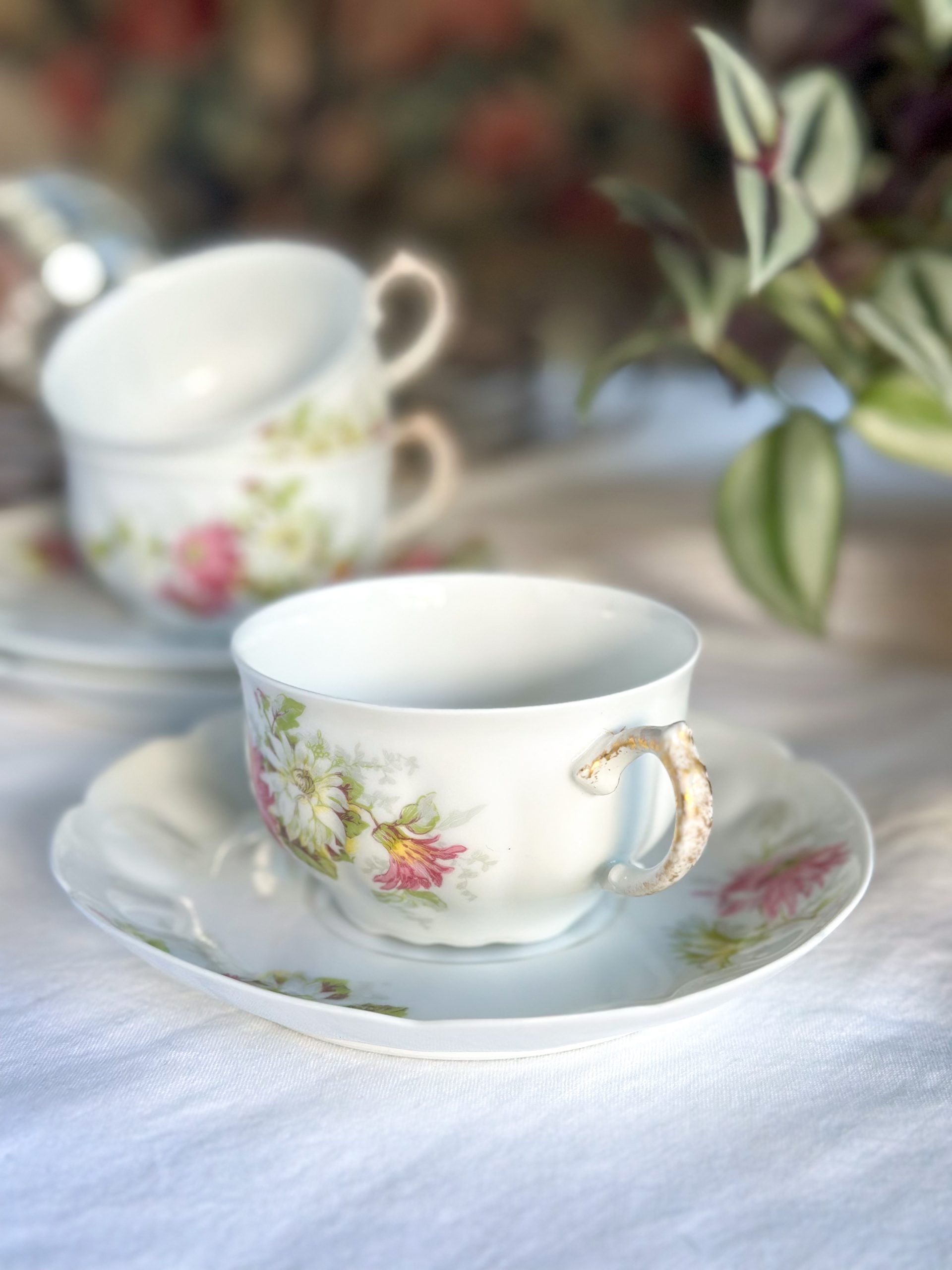 Jolie tasse à café en porcelaine de Limoges ! On aime beaucoup ses dessins floraux dans des tons roses et blancs, tout en douceur. Avec sa sous-tasse assortie en porcelaine fine, et ses dorures, on l’adore !
