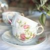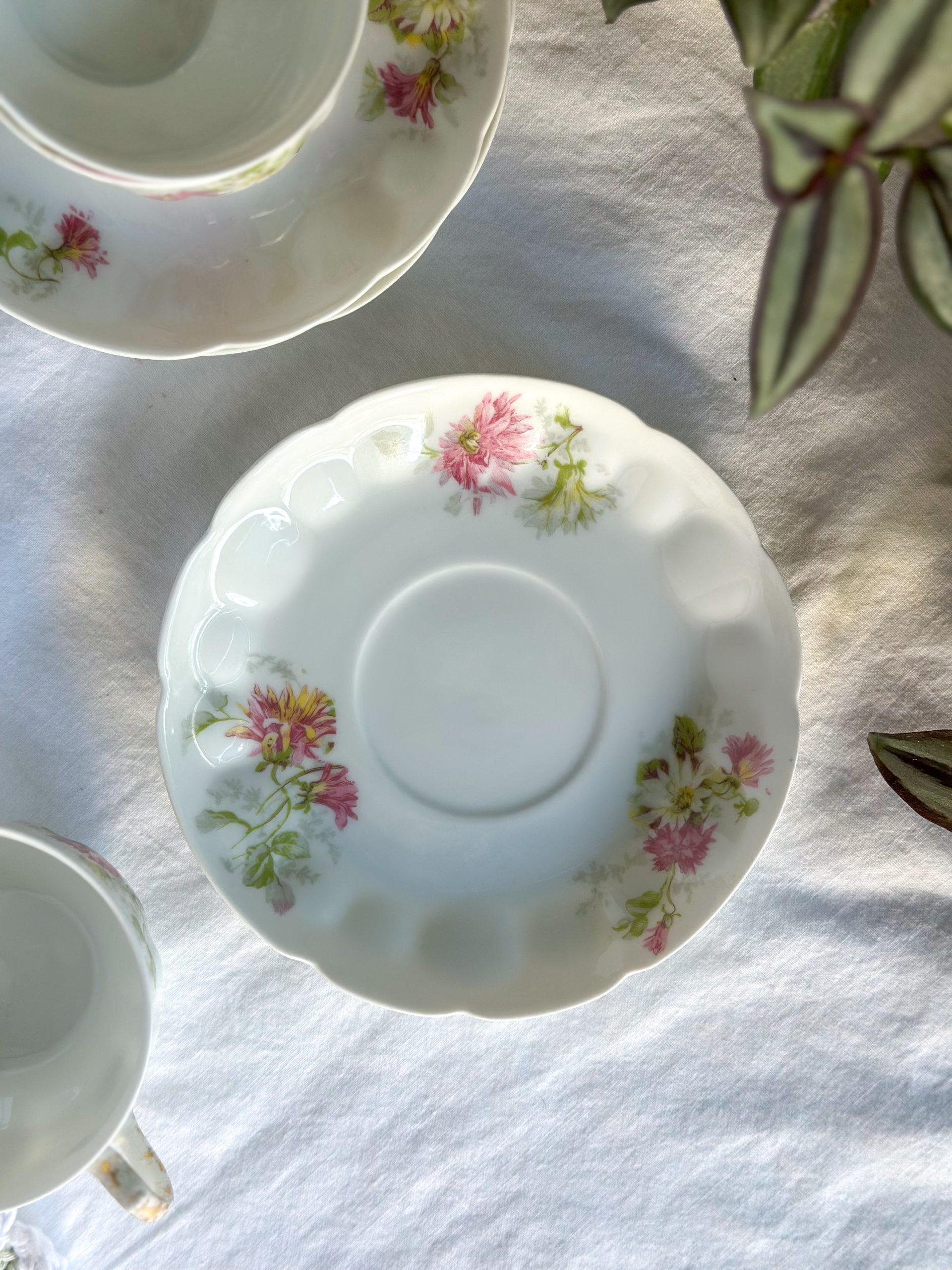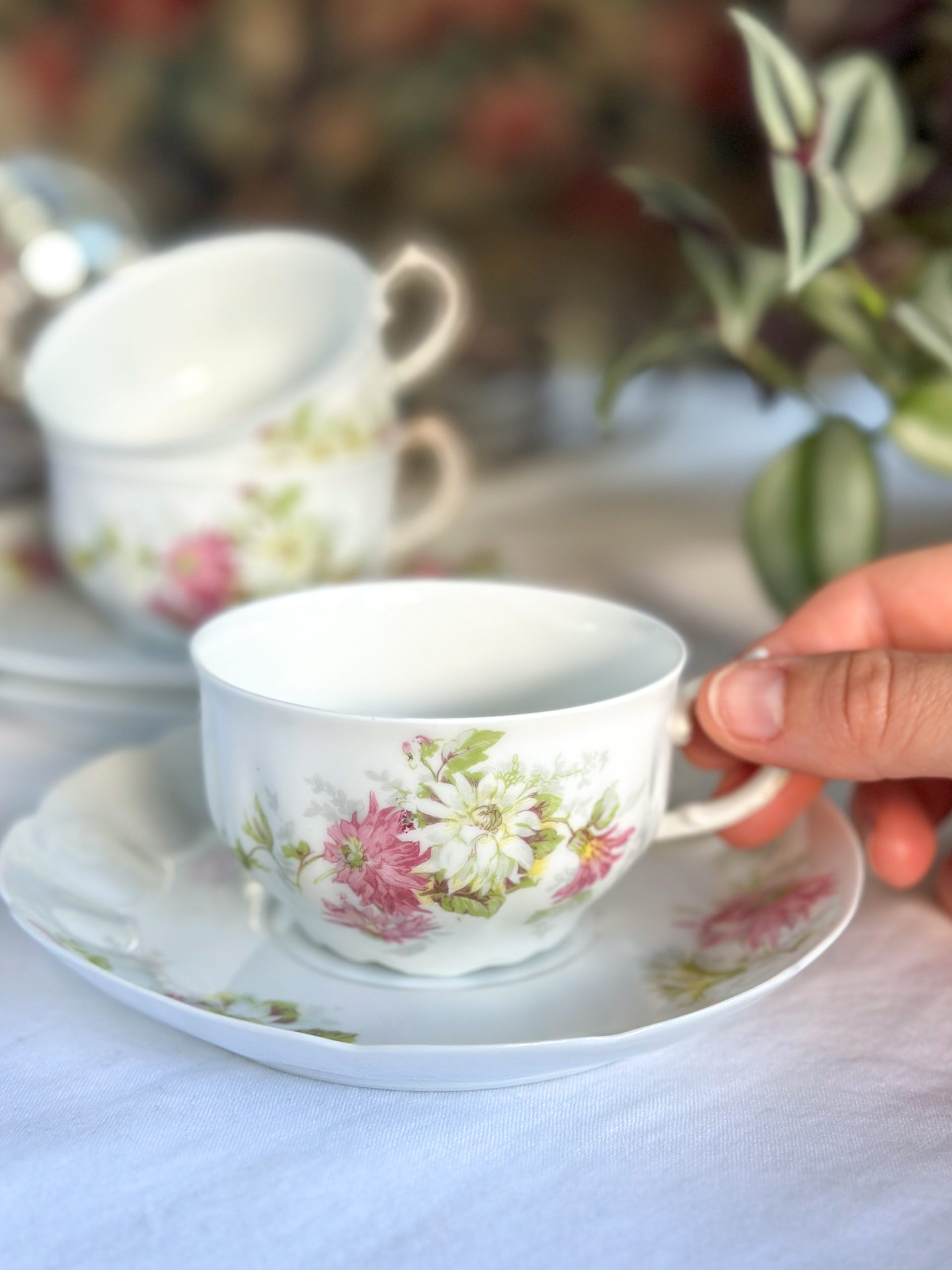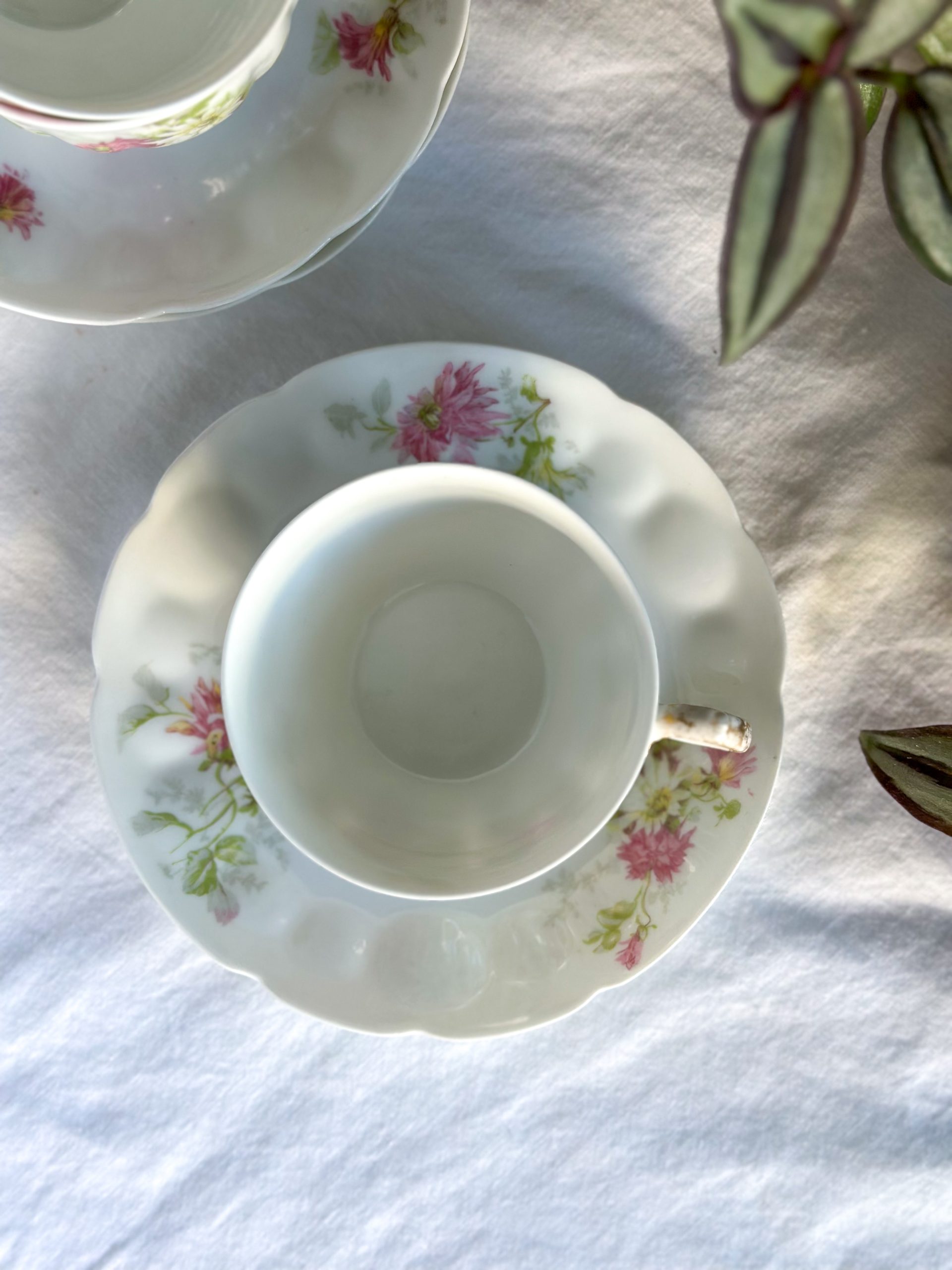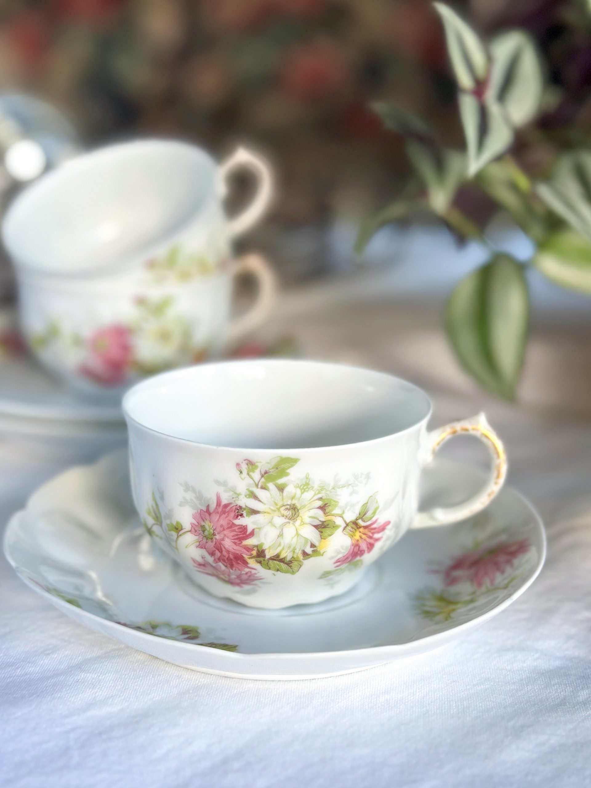 Jolie tasse à café en porcelaine de Limoges ! On aime beaucoup ses dessins floraux dans des tons roses et blancs, tout en douceur. Avec sa sous-tasse assortie en porcelaine fine, et ses dorures, on l’adore !