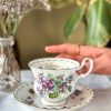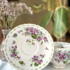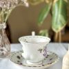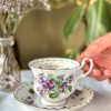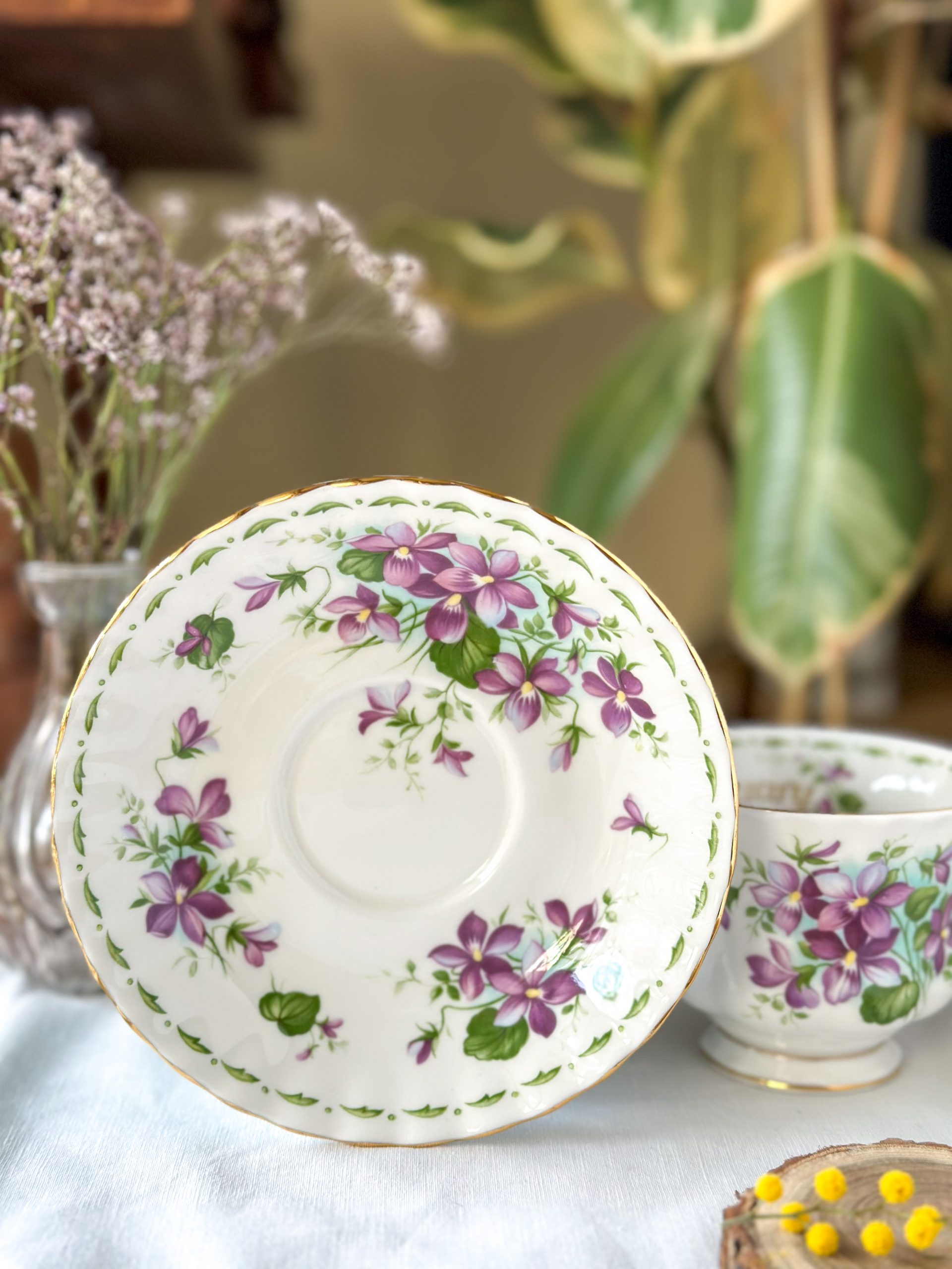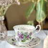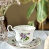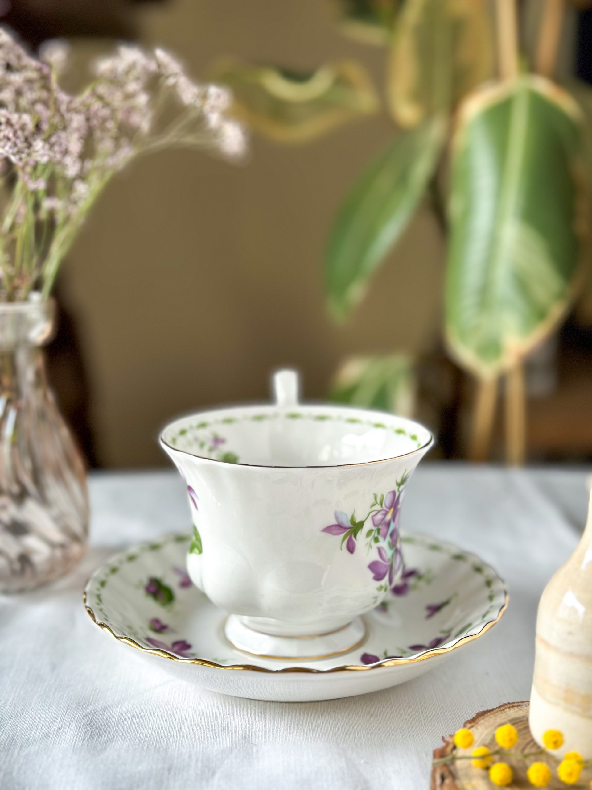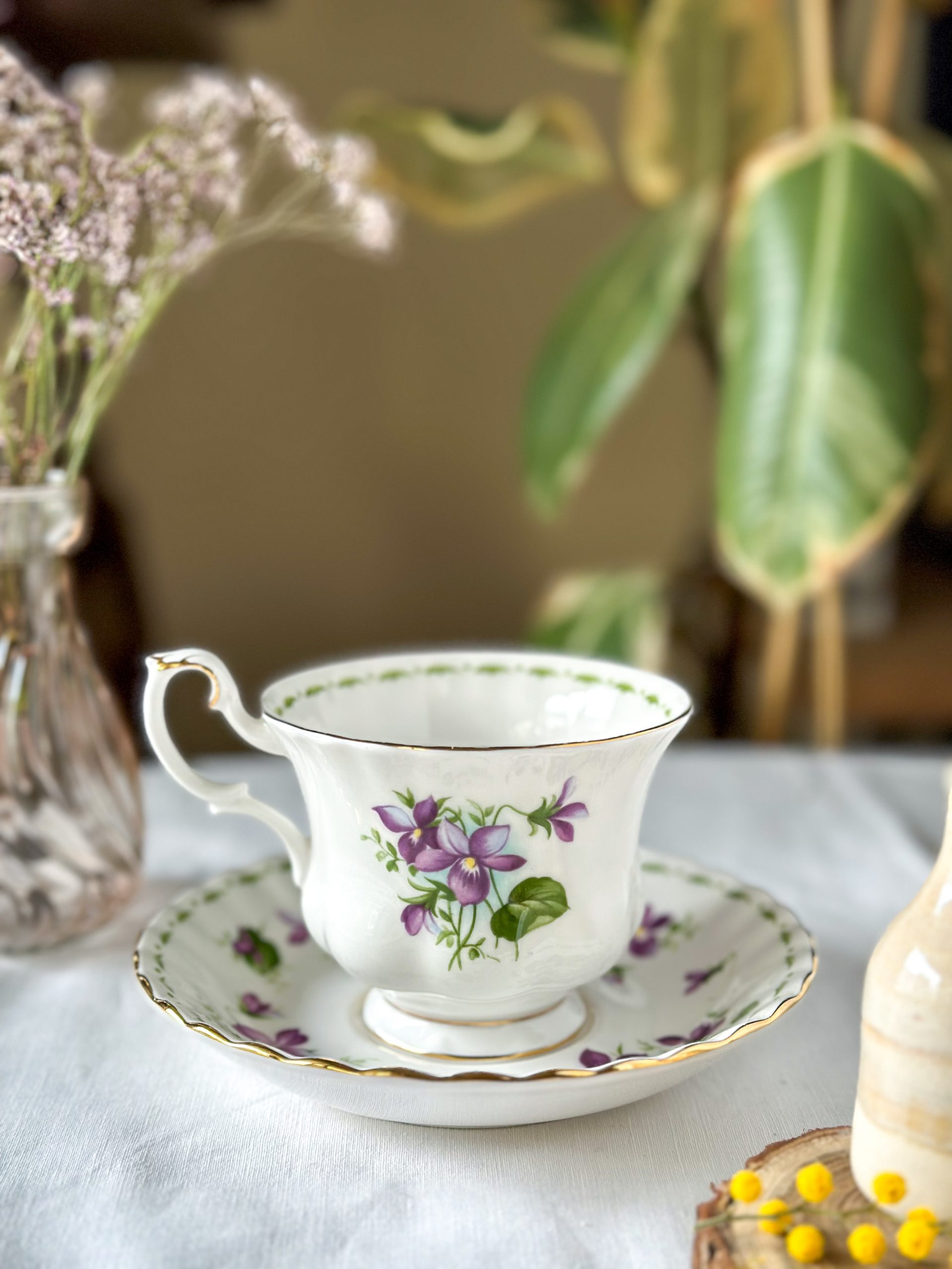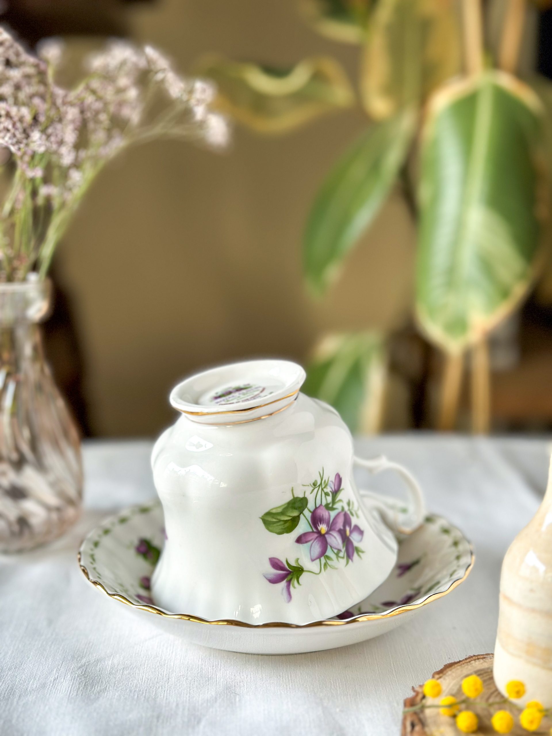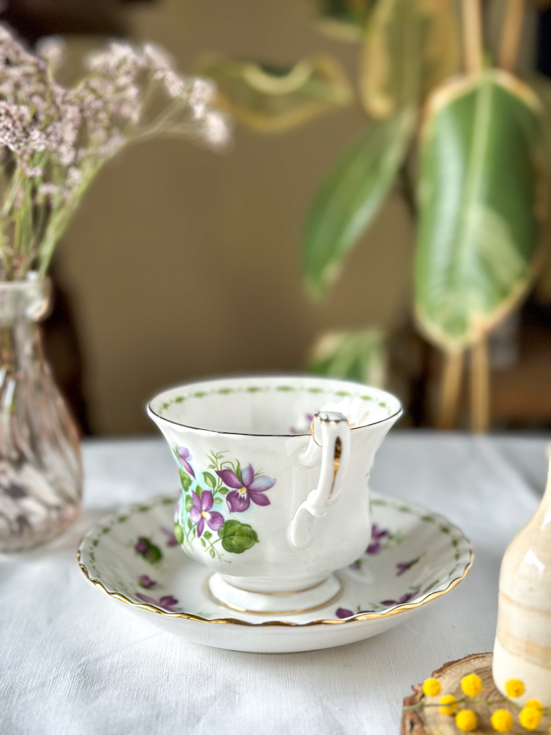 On adore cette collection vintage en porcelaine anglaise Royal Albert avec les fleurs du mois. Cette tasse ancienne est si belle avec ses jolis dessins de violettes, aux formes et couleurs délicates. Ce grand modèle avec sa sous-tasse assortie est parfait pour un tea time tout en douceur.