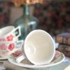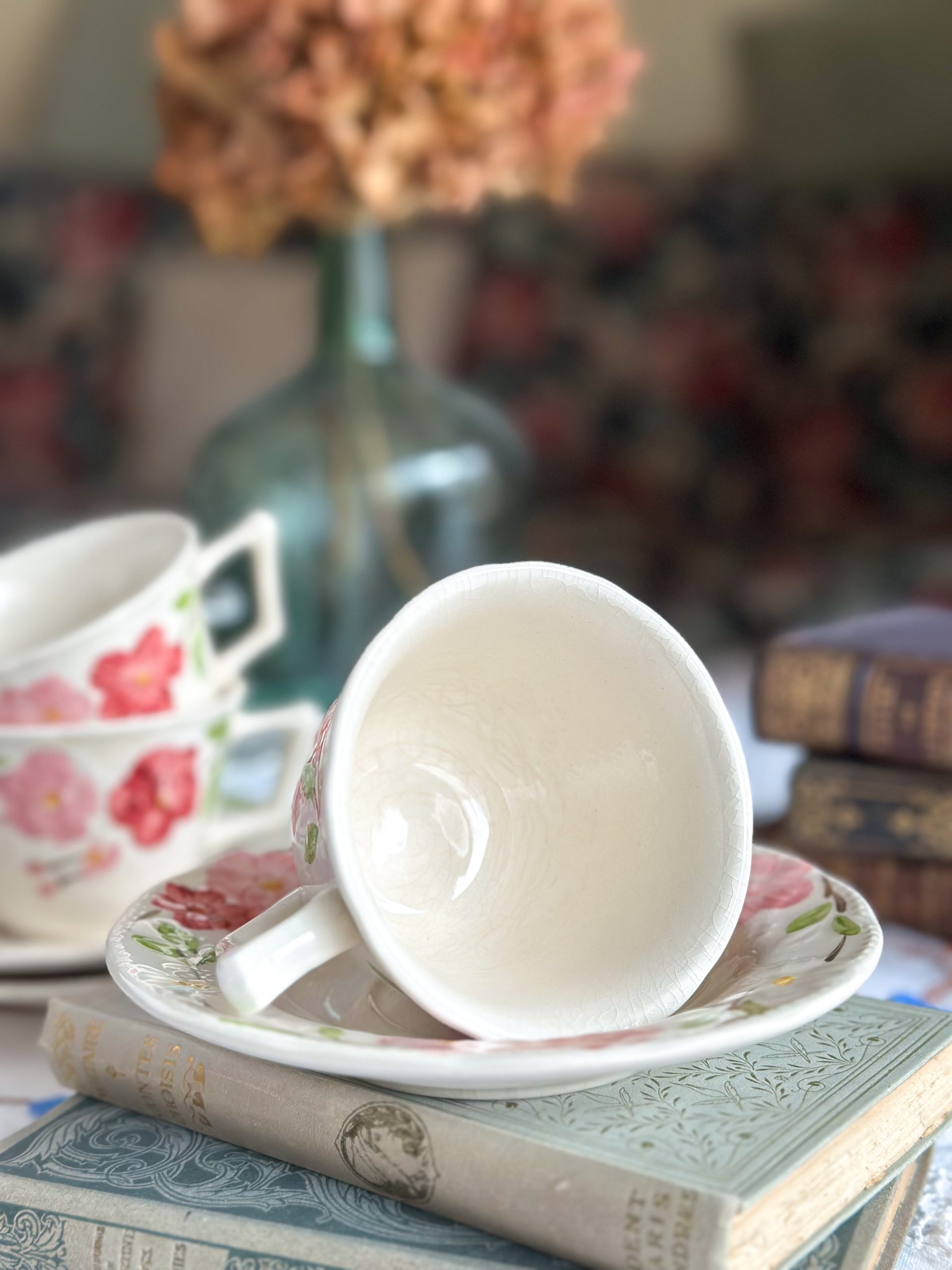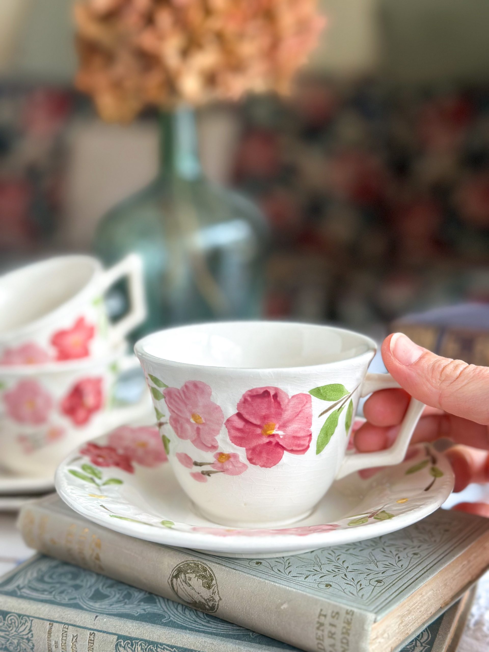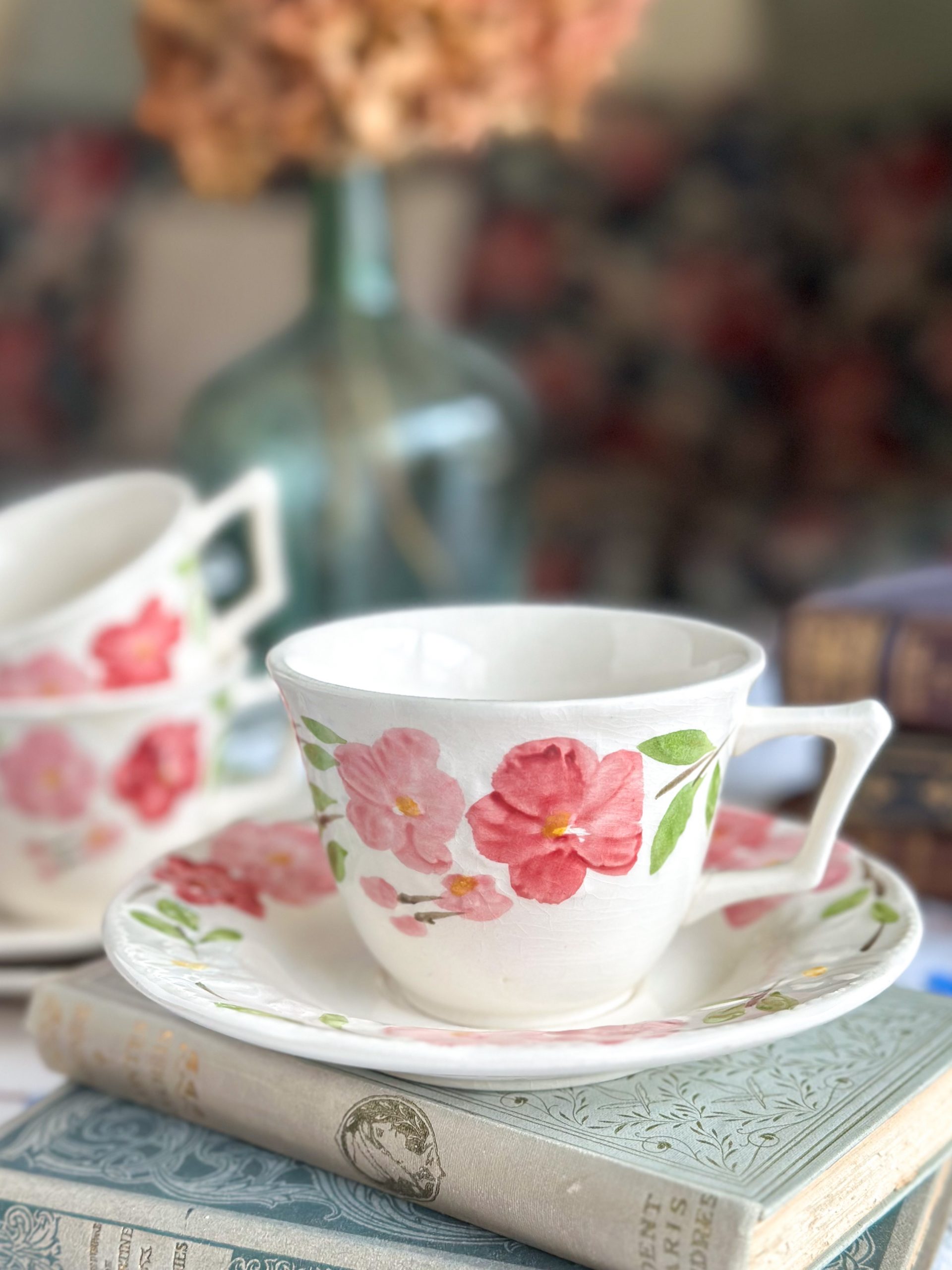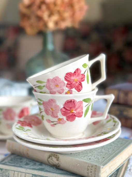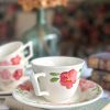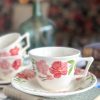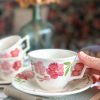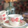 Magnifique ensemble tasse et sous-tasse ! On adore ses fleurs roses peintes à la main, aux tons très doux et poétiques. Cette tasse vintage est parfaite pour vos moments thé ou café, avec sa sous-tasse assortie, décorée tout autour de petites fleurs roses et feuilles vertes.