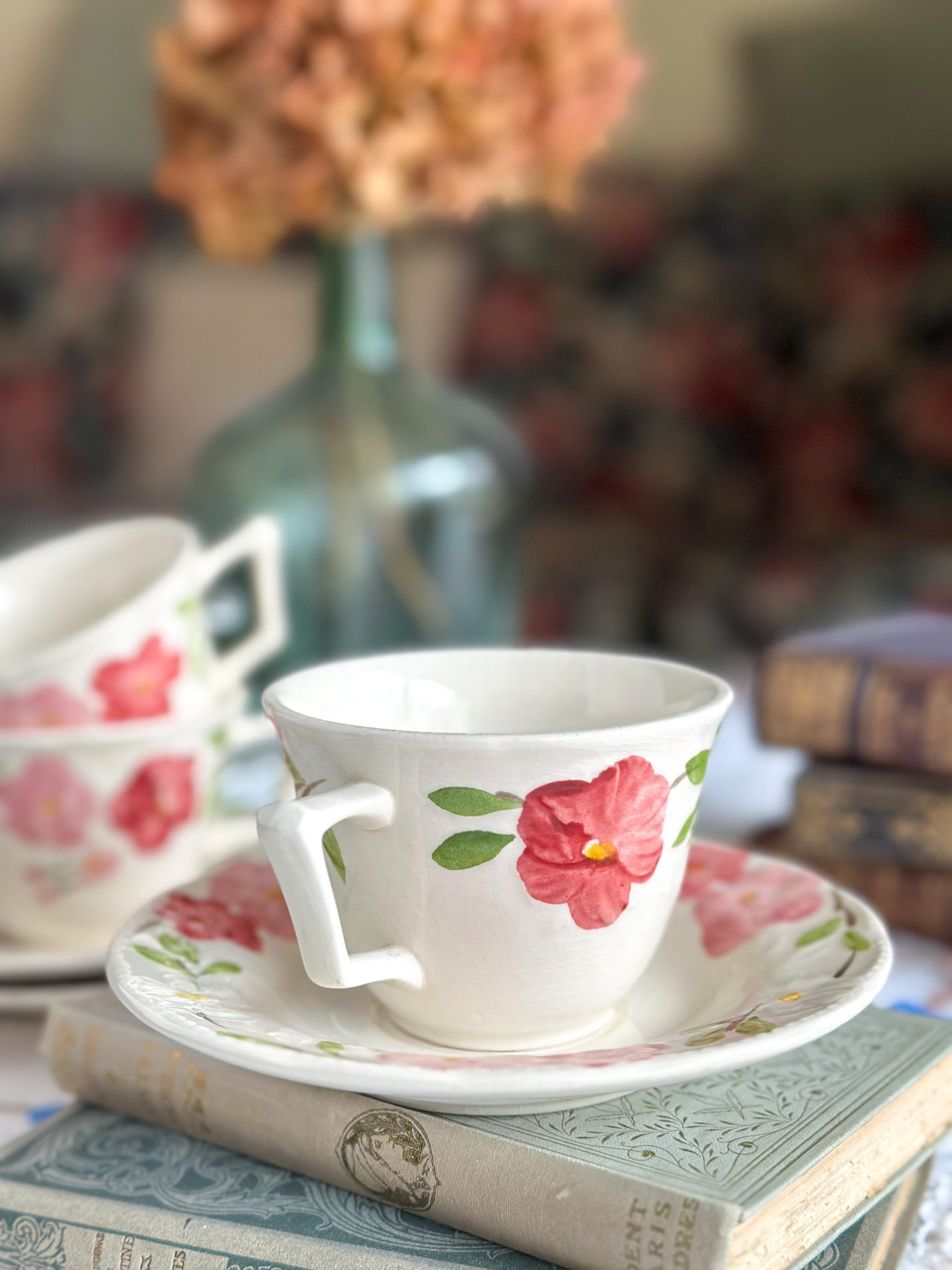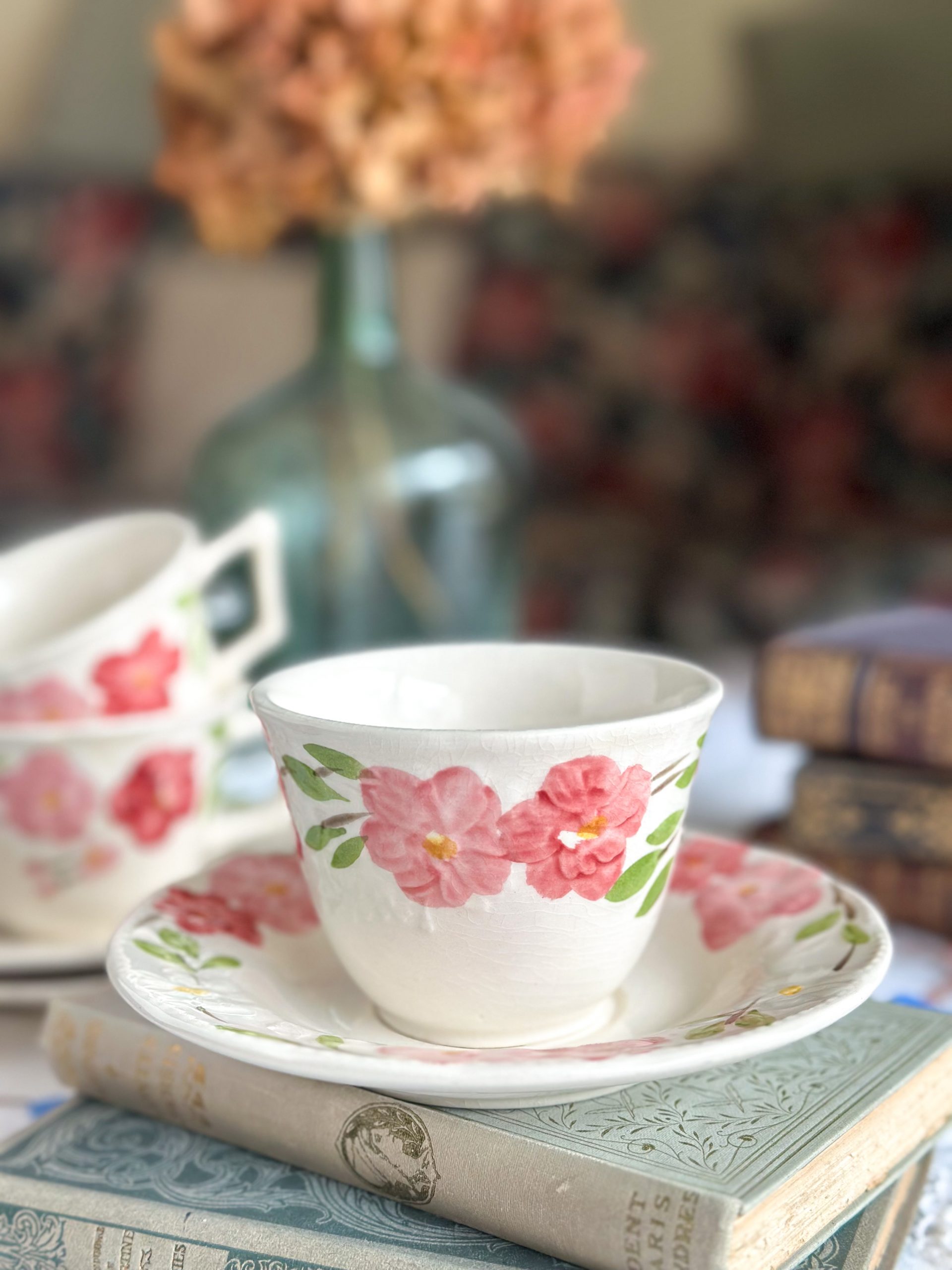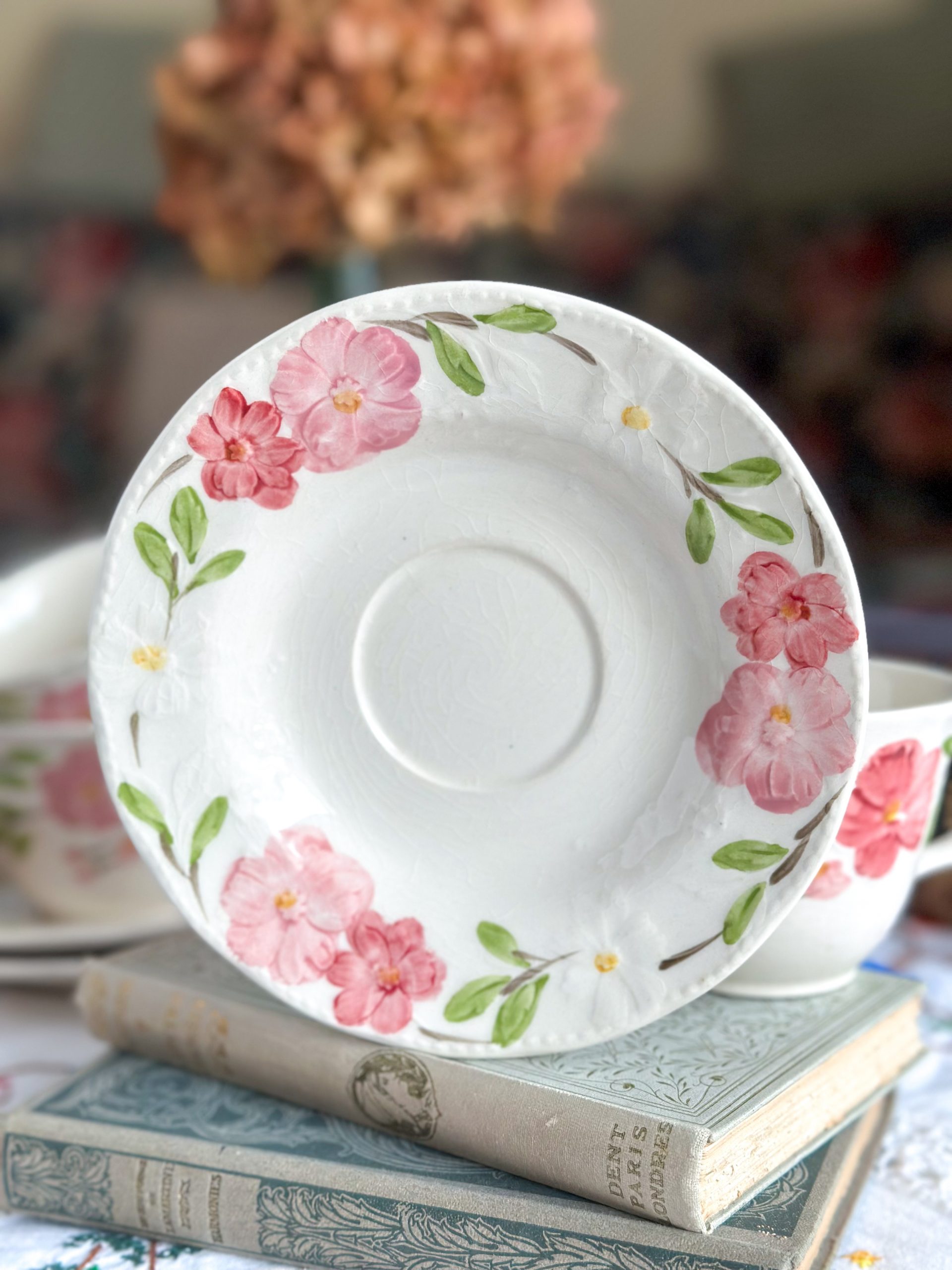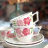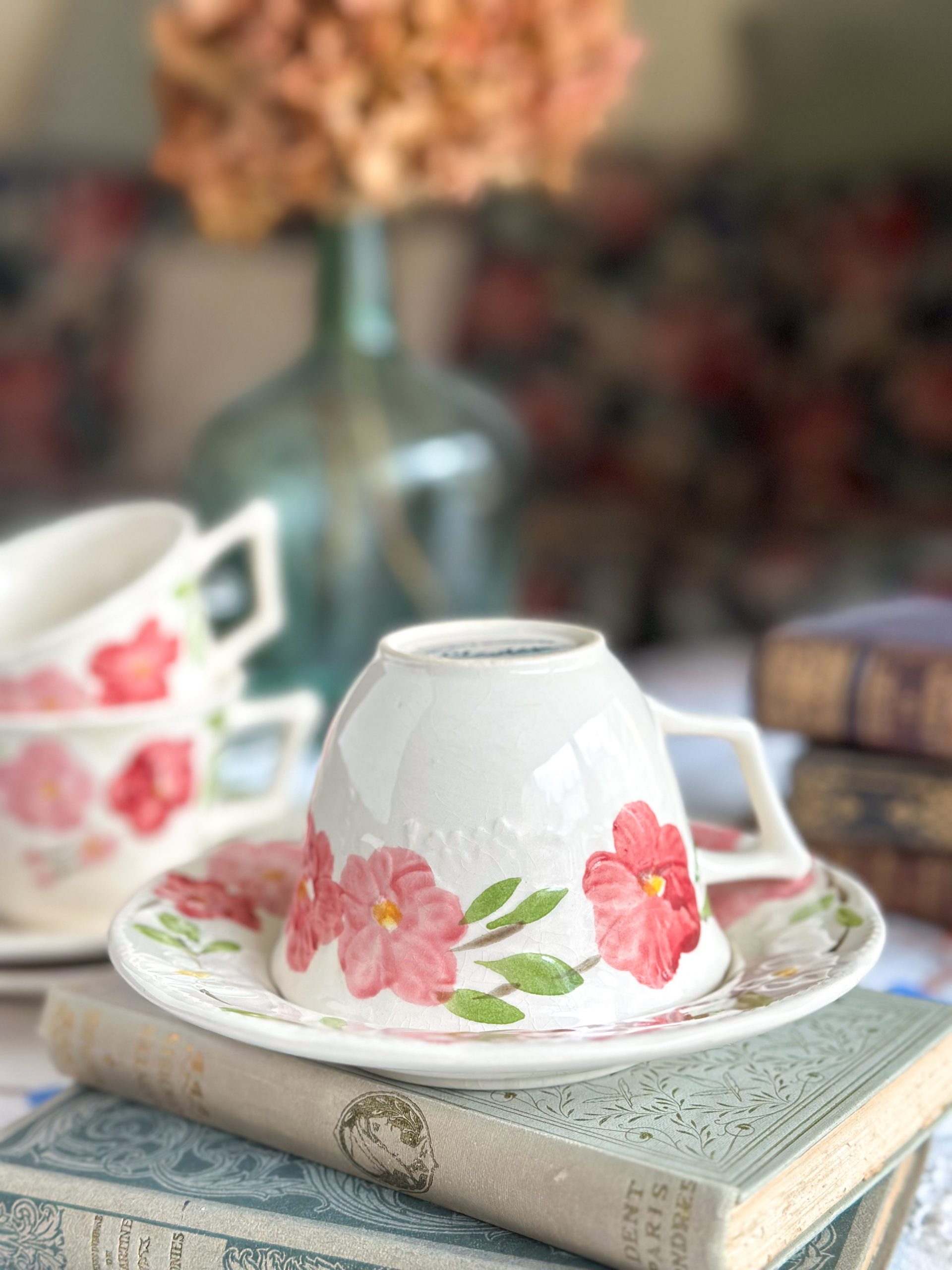 Magnifique ensemble tasse et sous-tasse ! On adore ses fleurs roses peintes à la main, aux tons très doux et poétiques. Cette tasse vintage est parfaite pour vos moments thé ou café, avec sa sous-tasse assortie, décorée tout autour de petites fleurs roses et feuilles vertes.
