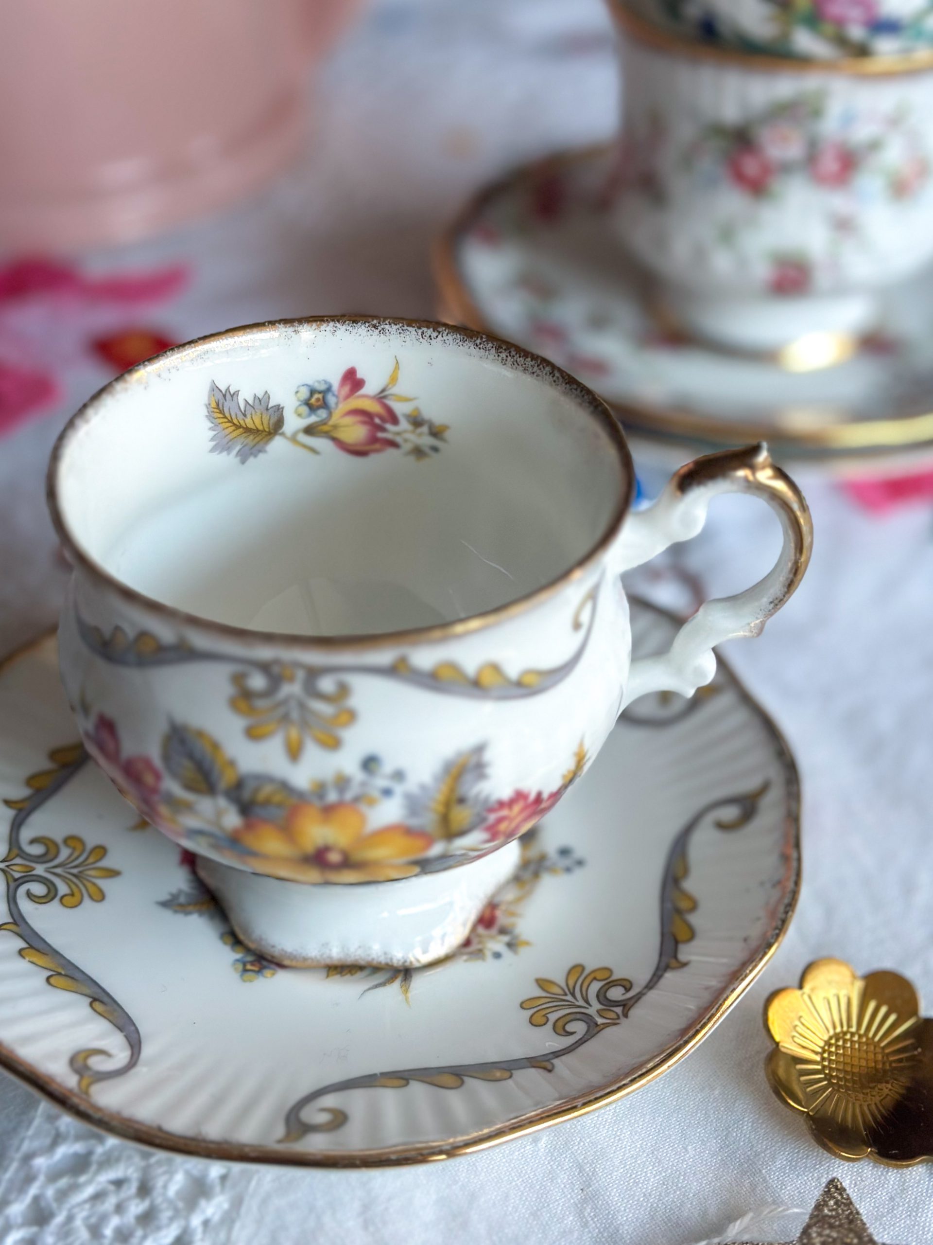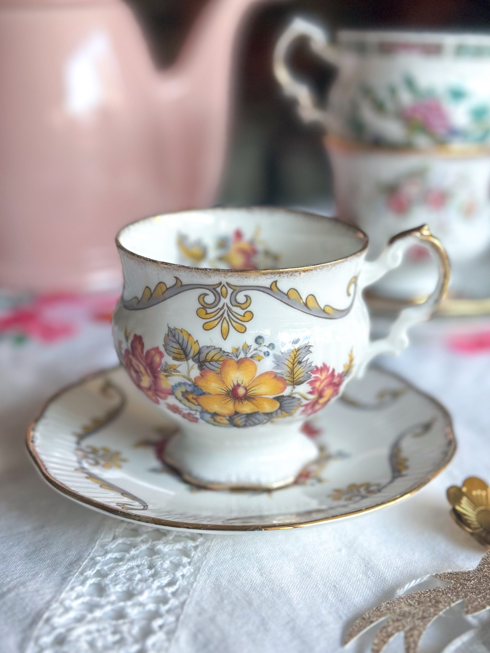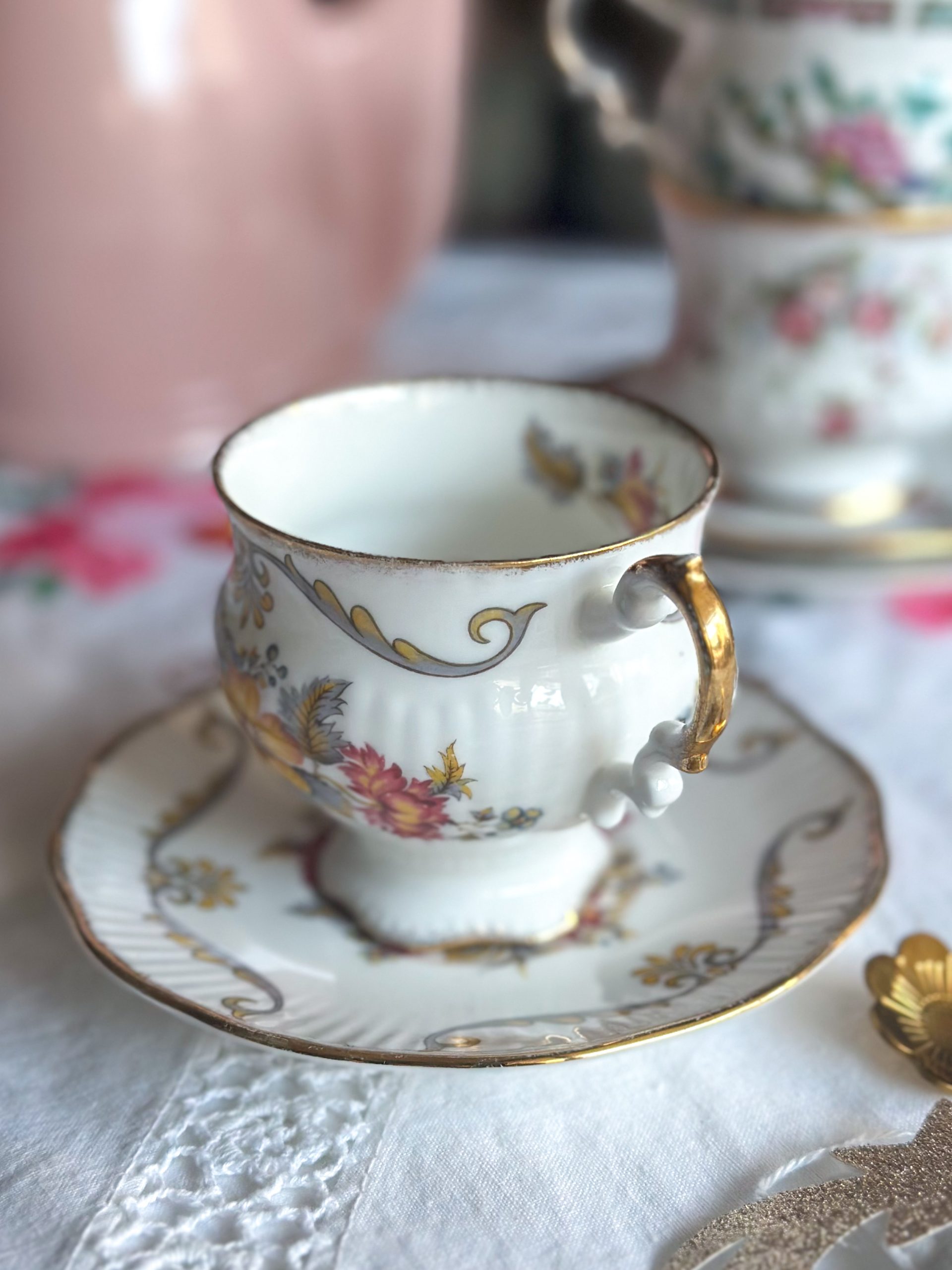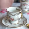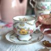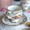 Magnifique tasse anglaise aux jolis dessins de fleurs automnales ! On adore son motif délicat, et sa jolie forme élégante réhaussée par de beaux liserés dorés. C’est la tasse parfaite pour une pause thé ou café pleine de poésie !