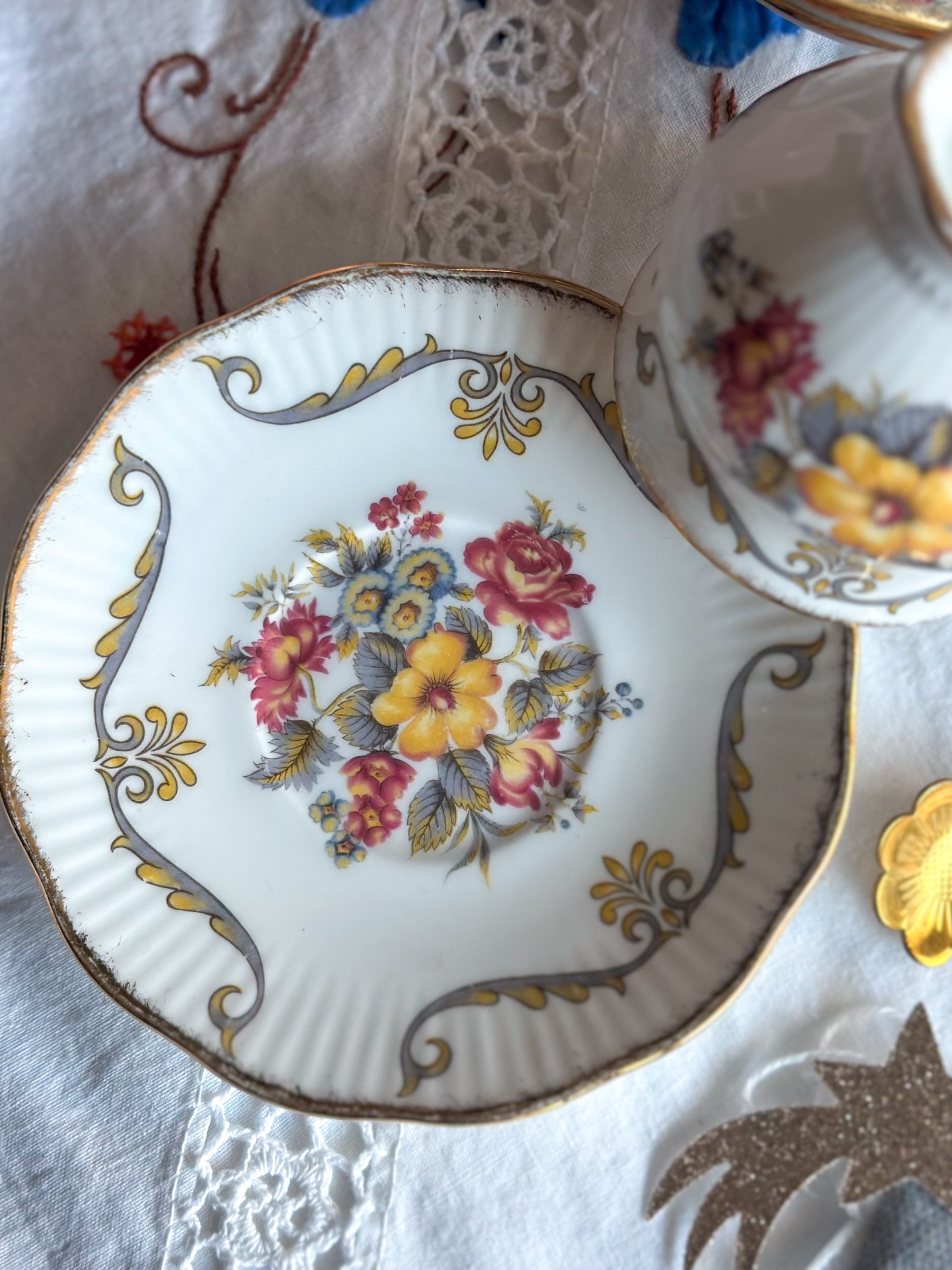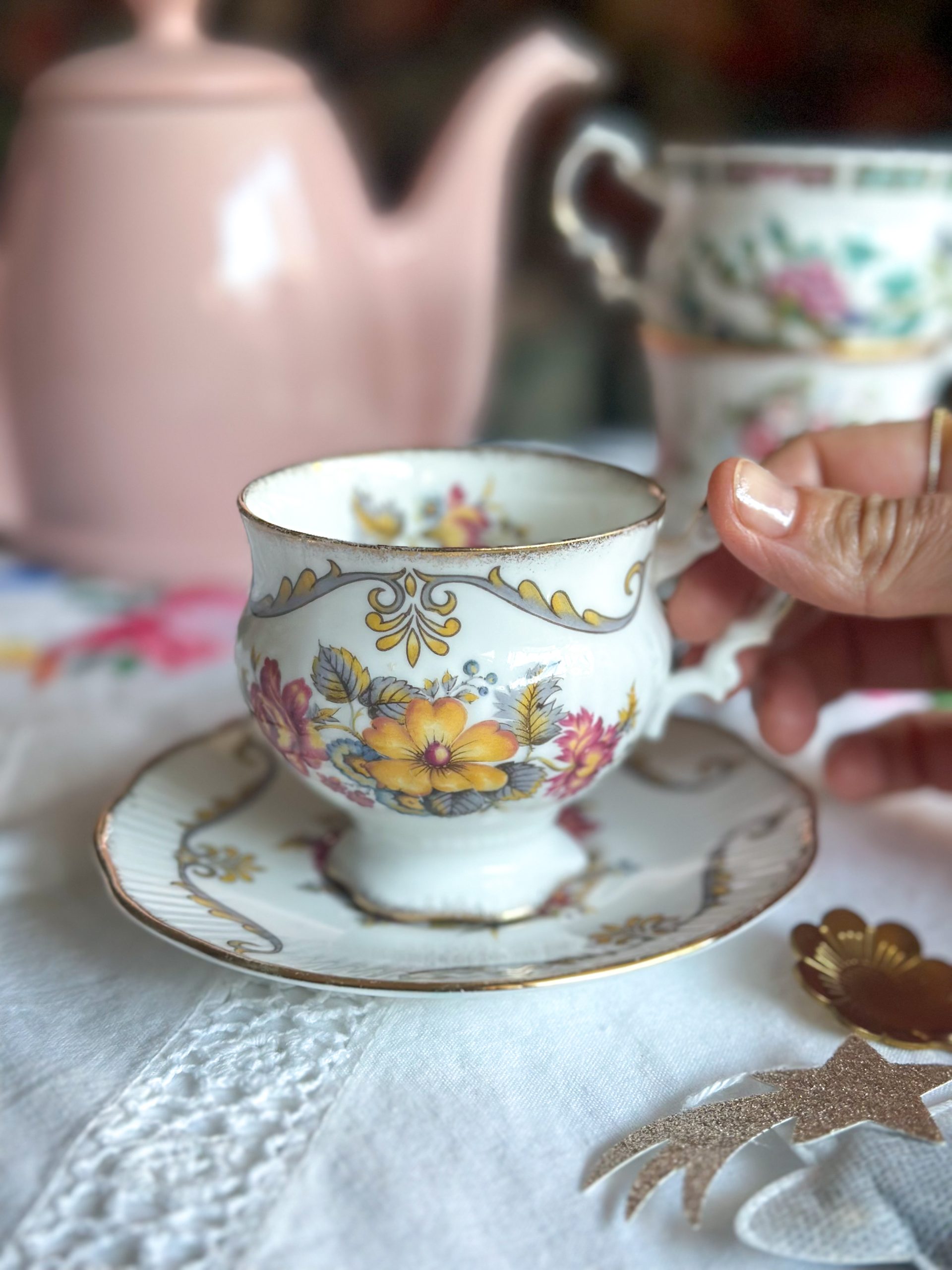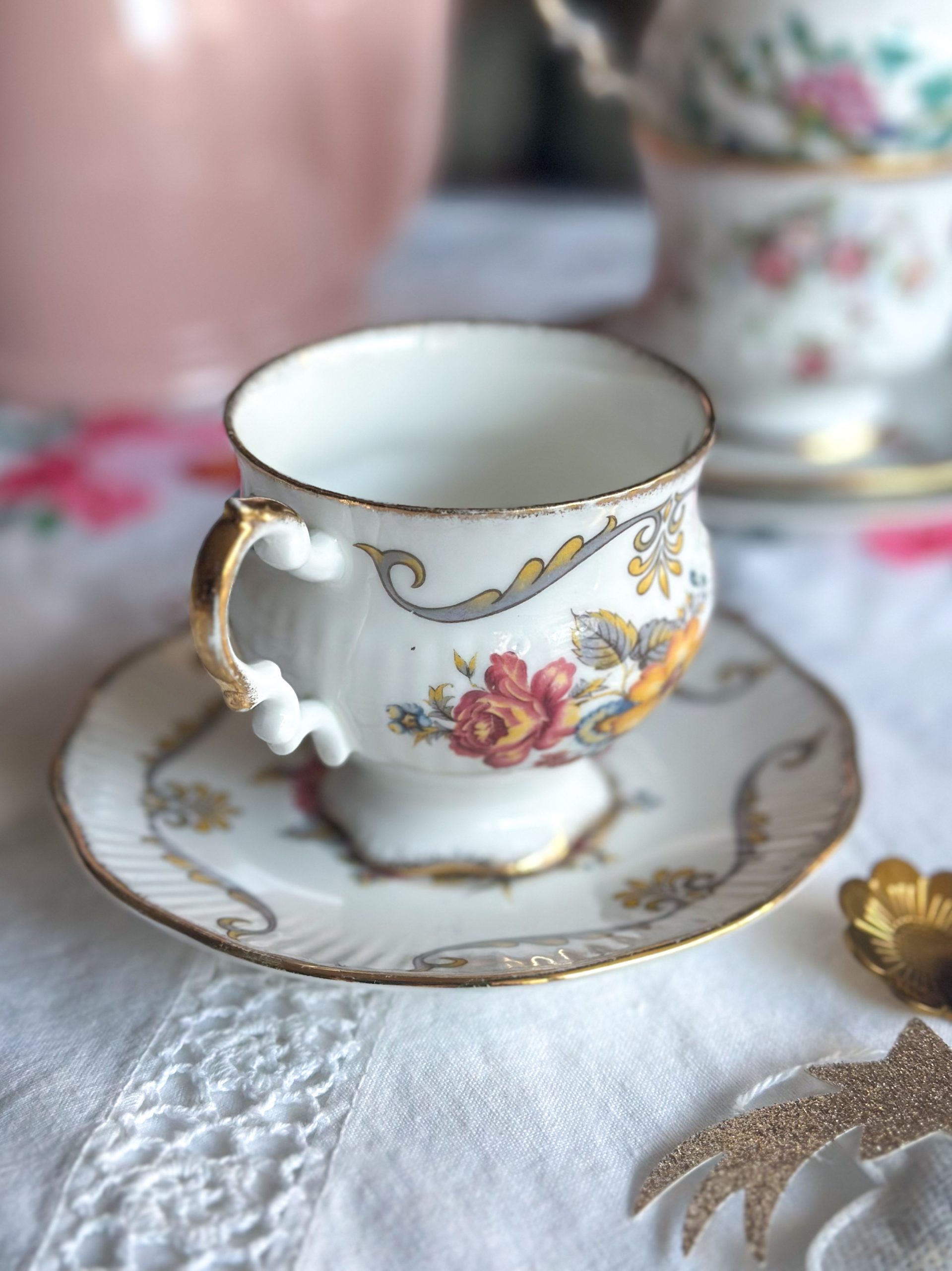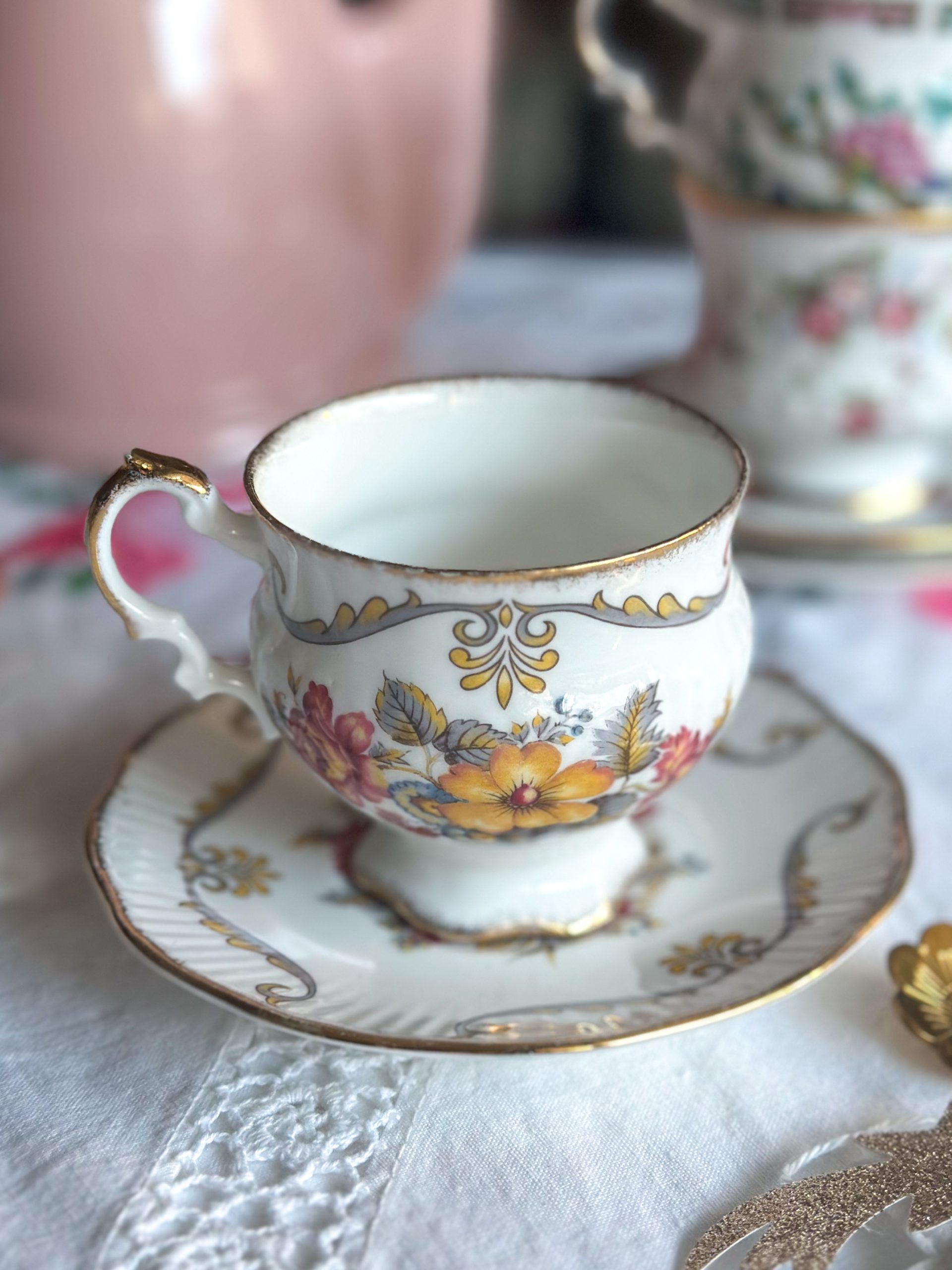 Magnifique tasse anglaise aux jolis dessins de fleurs automnales ! On adore son motif délicat, et sa jolie forme élégante réhaussée par de beaux liserés dorés. C’est la tasse parfaite pour une pause thé ou café pleine de poésie !