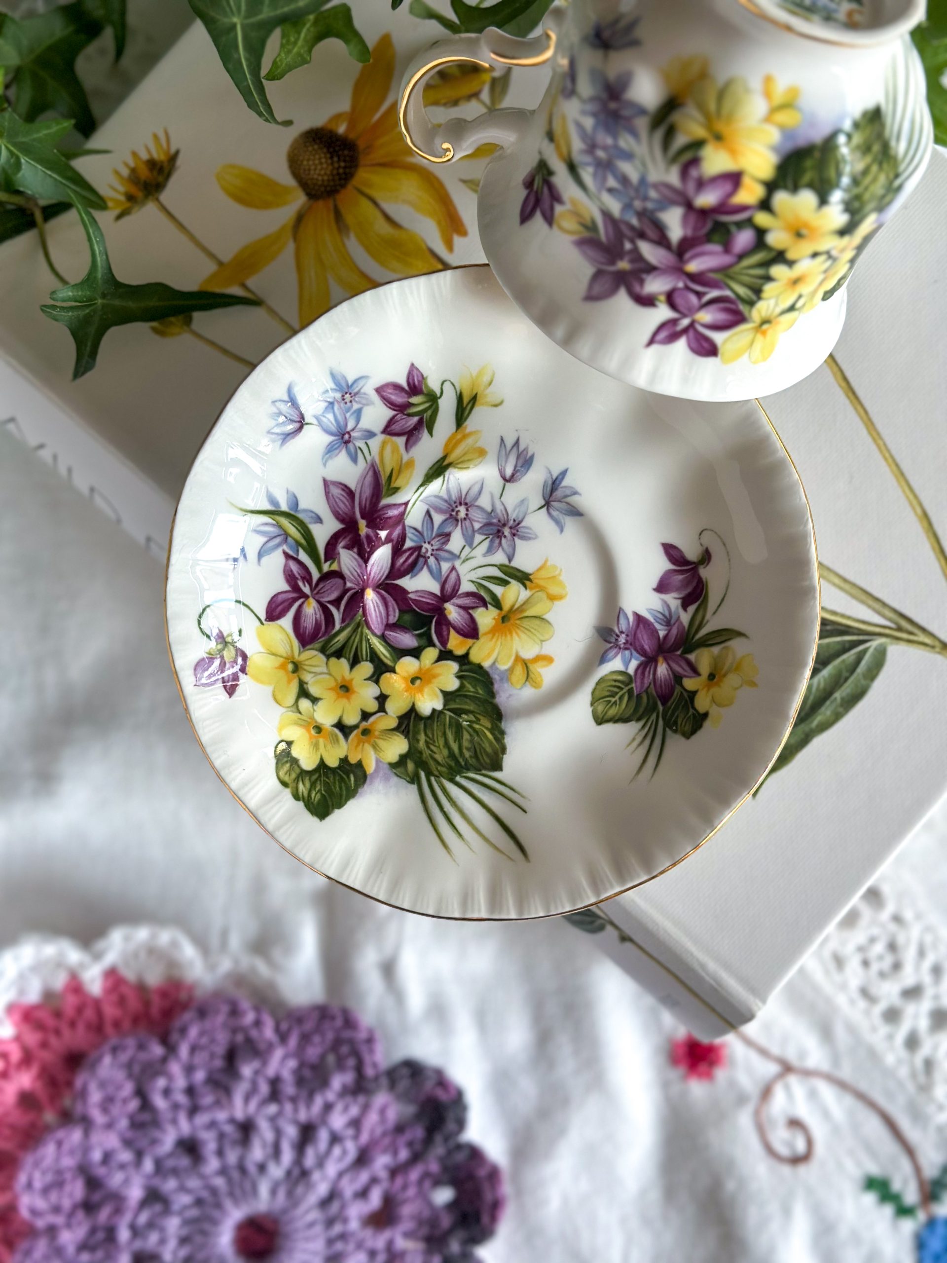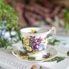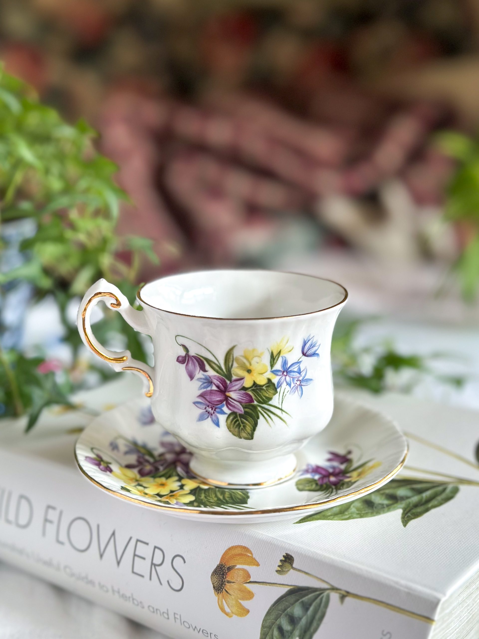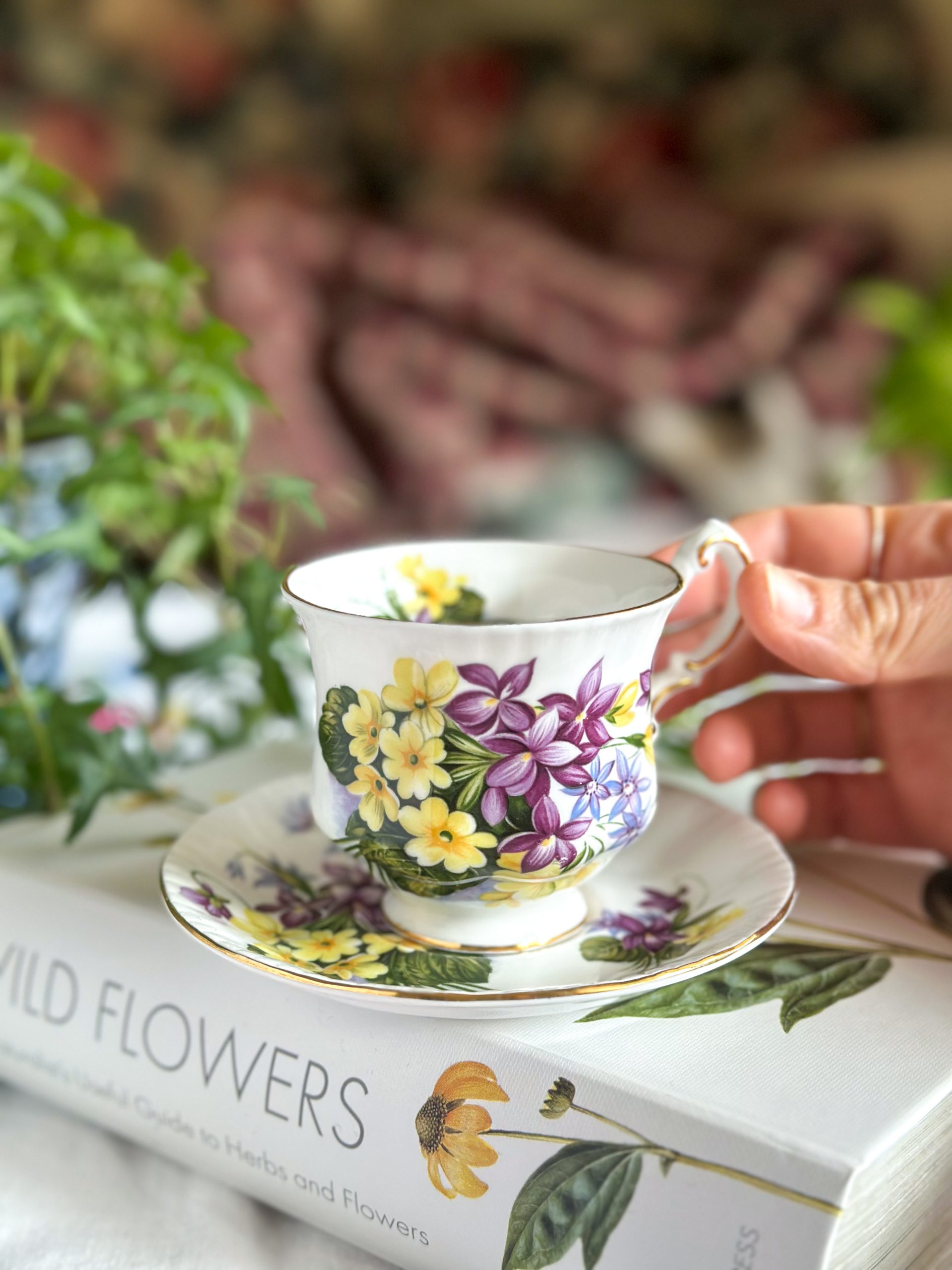 Magnifique tasse anglaise aux superbes dessins printaniers mêlant primevères jaunes et fleurs de violettes ! On adore son motif délicat, et sa jolie forme élégante réhaussée par de beaux liserés dorés. C’est la tasse parfaite pour une pause thé ou café pleine de poésie !