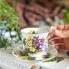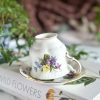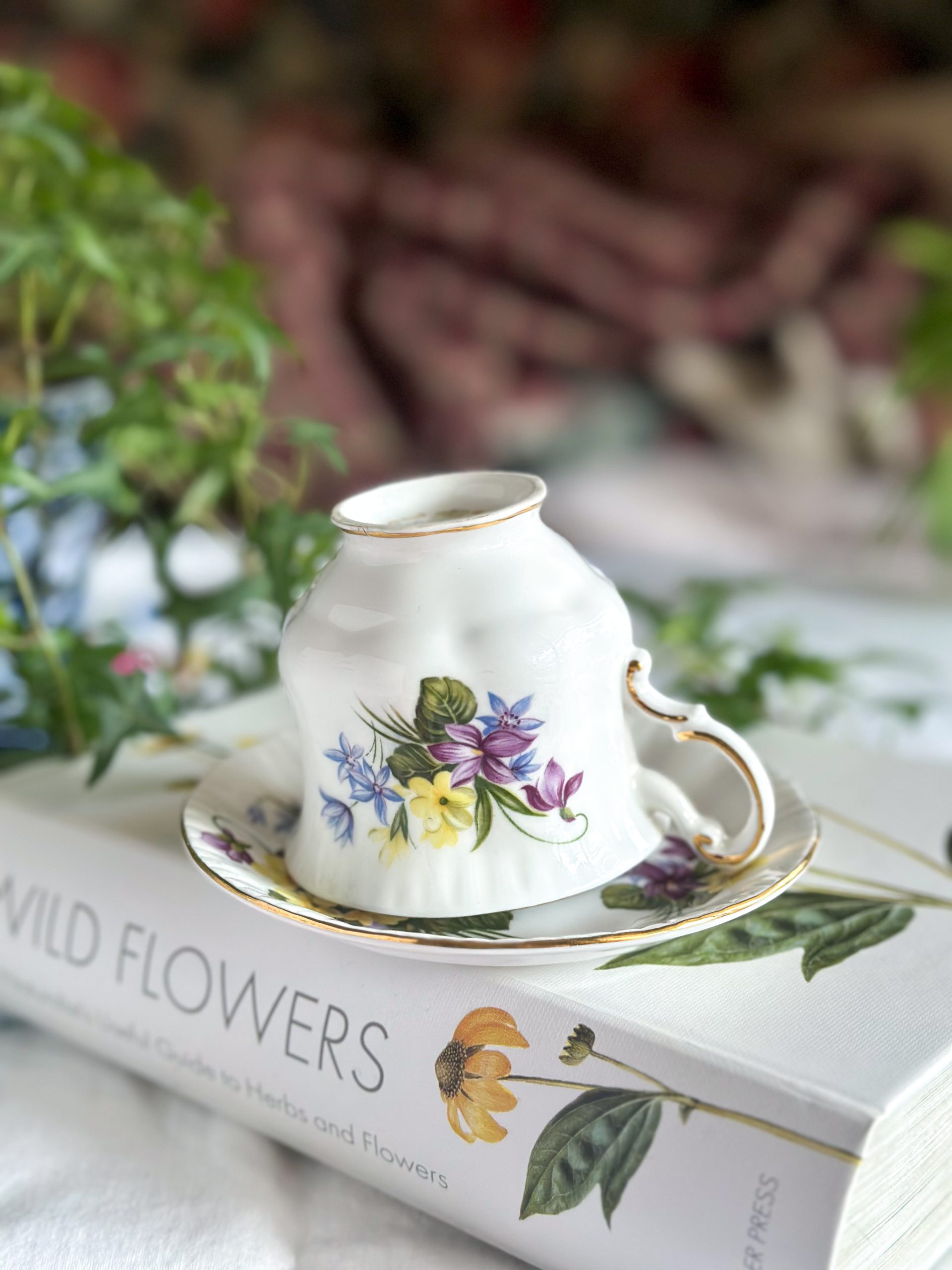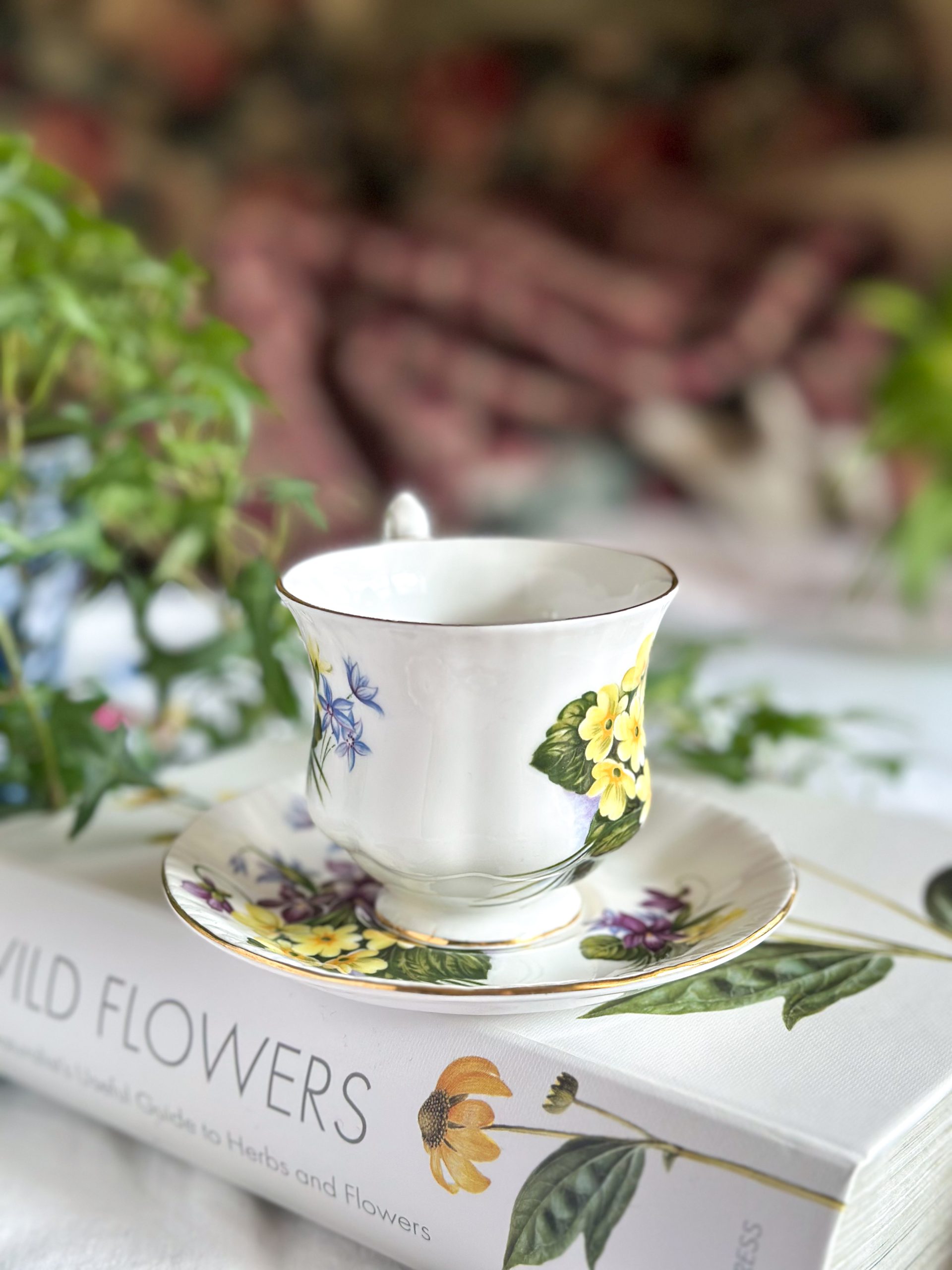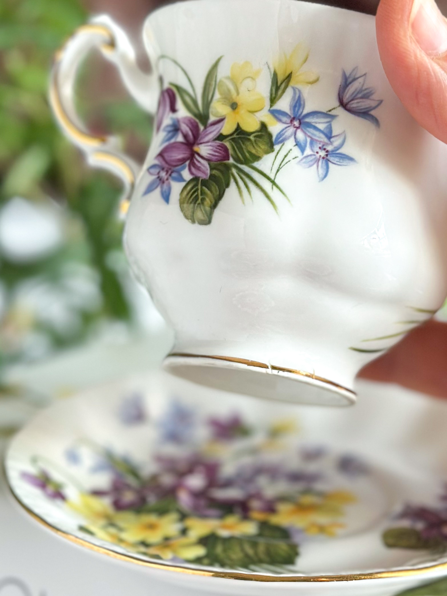 Magnifique tasse anglaise aux superbes dessins printaniers mêlant primevères jaunes et fleurs de violettes ! On adore son motif délicat, et sa jolie forme élégante réhaussée par de beaux liserés dorés. C’est la tasse parfaite pour une pause thé ou café pleine de poésie !