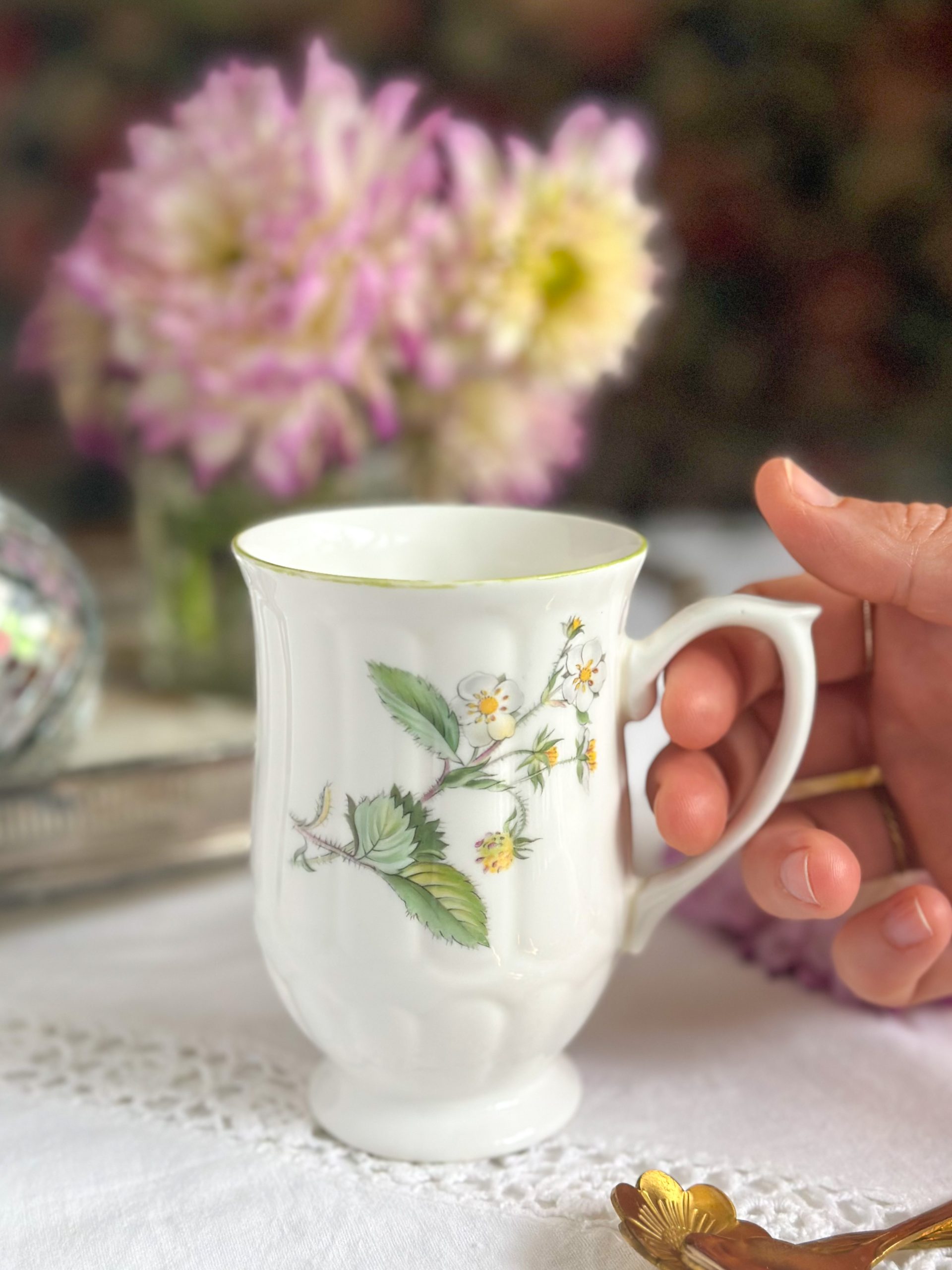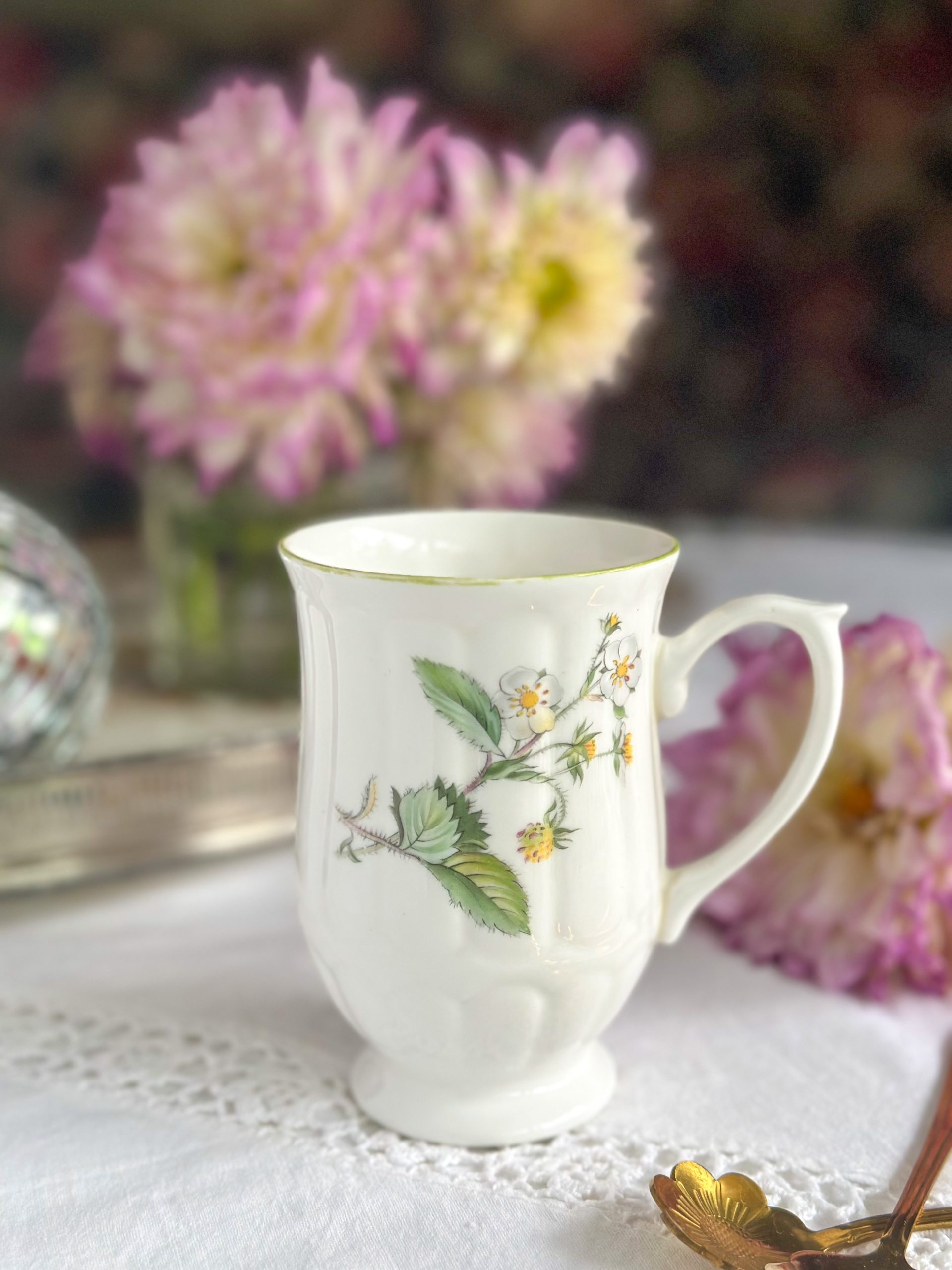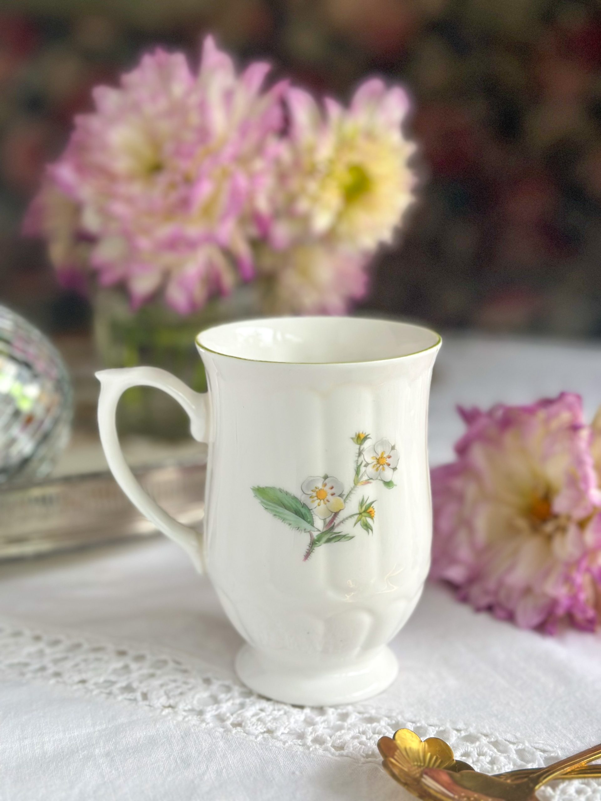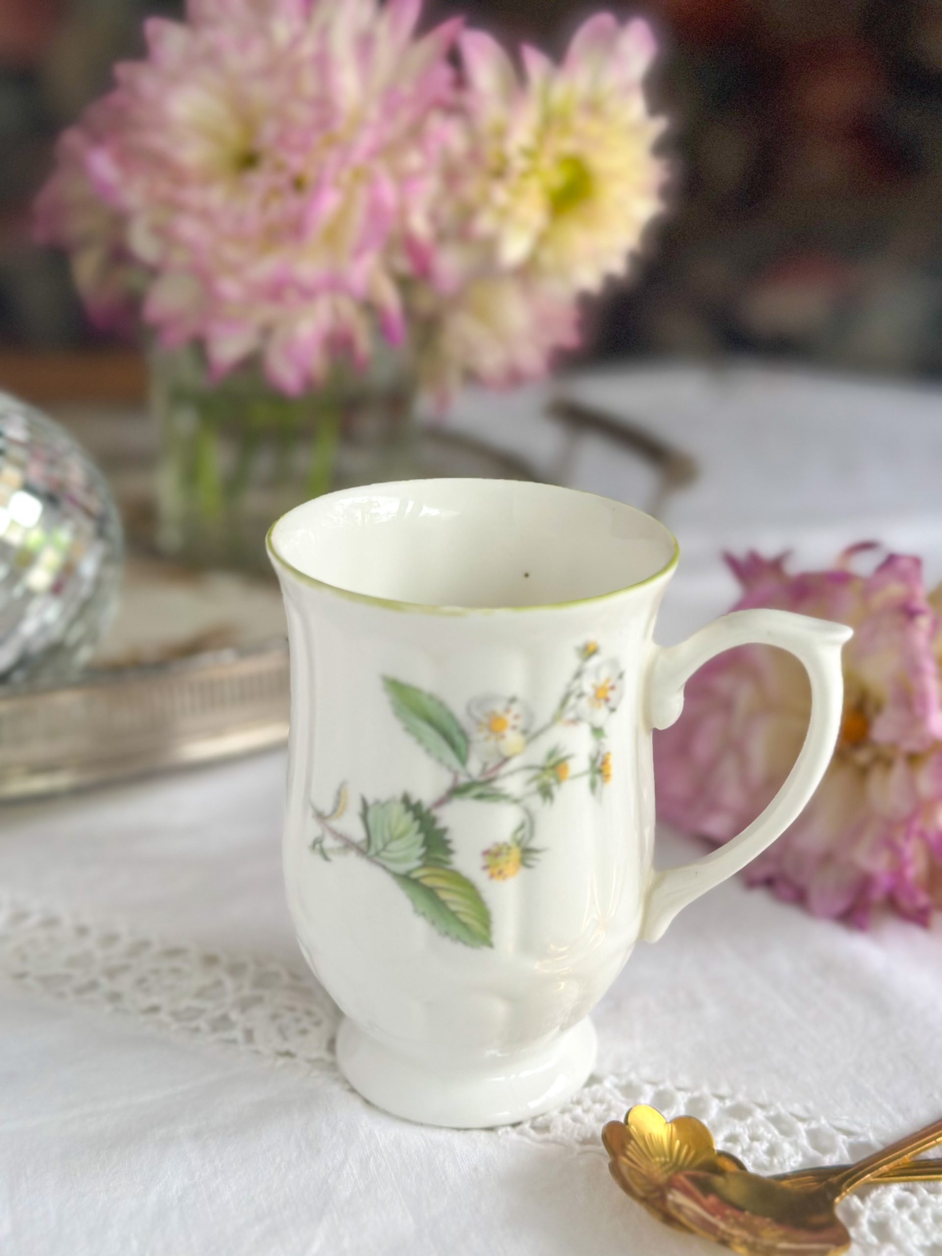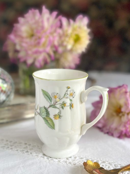 Une jolie tasse en porcelaine anglaise pour vos pauses thé ou café ! On adore ses jolis dessins remplis de douceur et de poésie : des fraisiers en fleurs des deux côtés de la tasse.