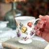 Une superbe tasse anglaise ! Coup de coeur pour cette tasse vintage parsemée de jolis dessins de fruits : cerises, poires, fraises, prunes…