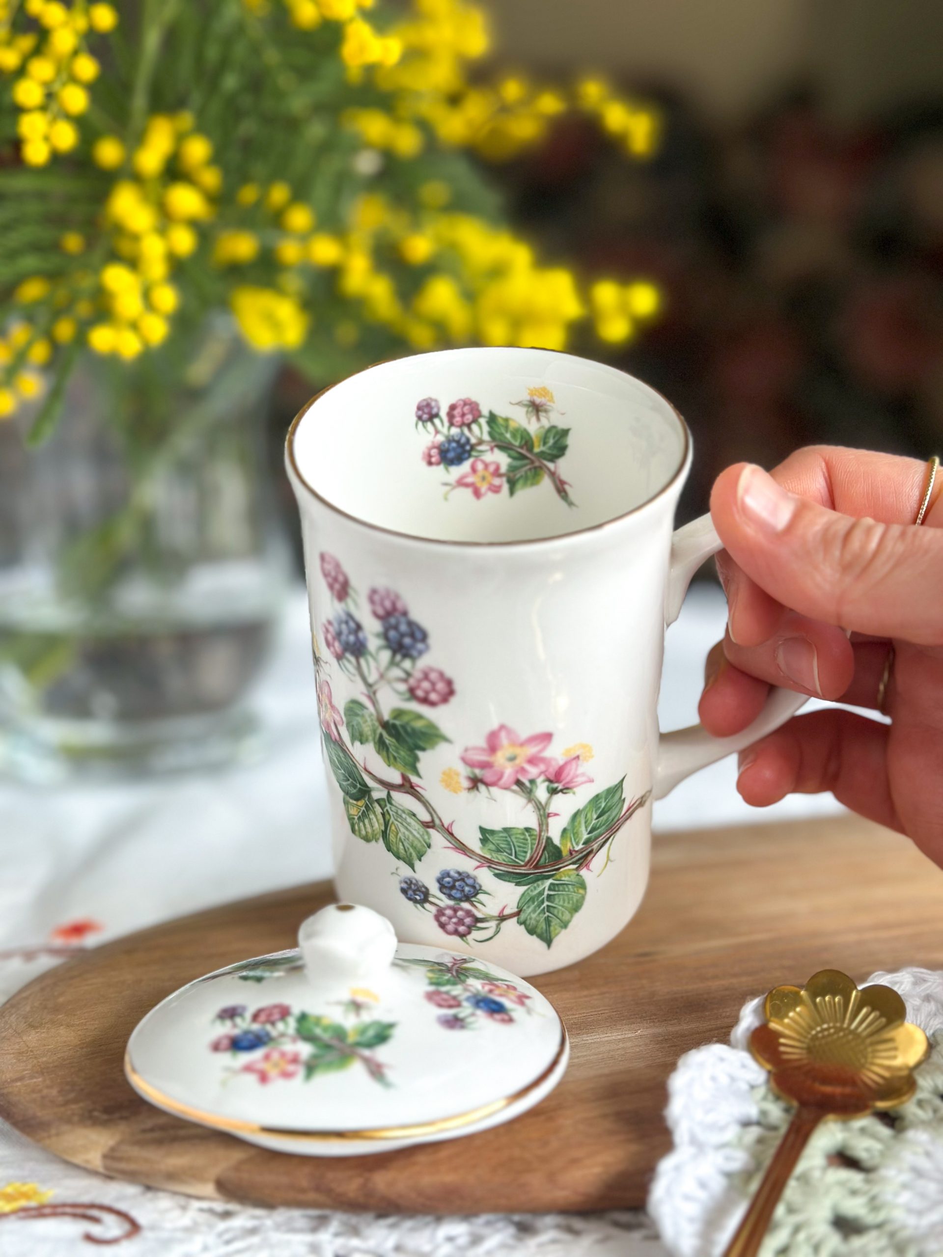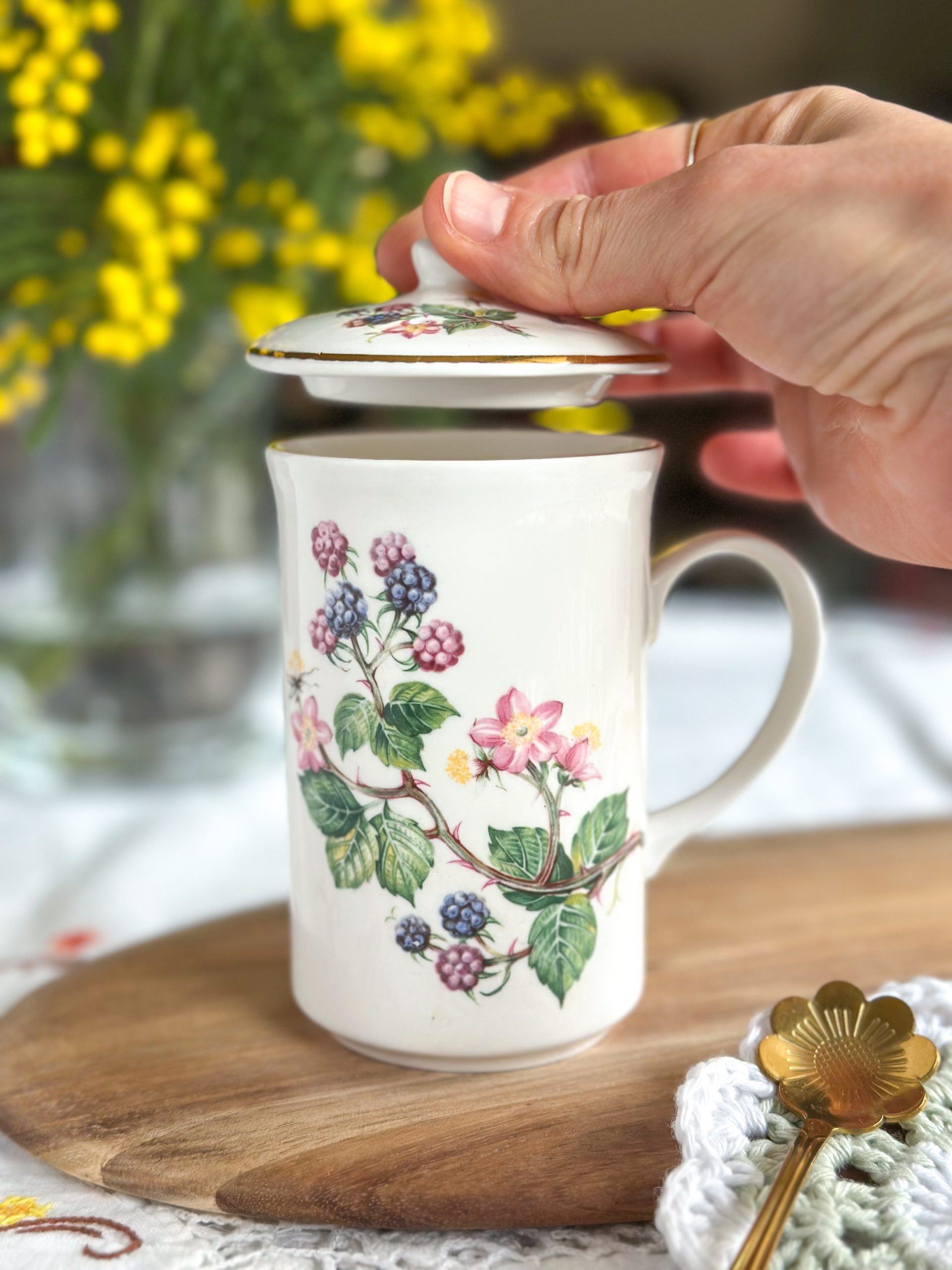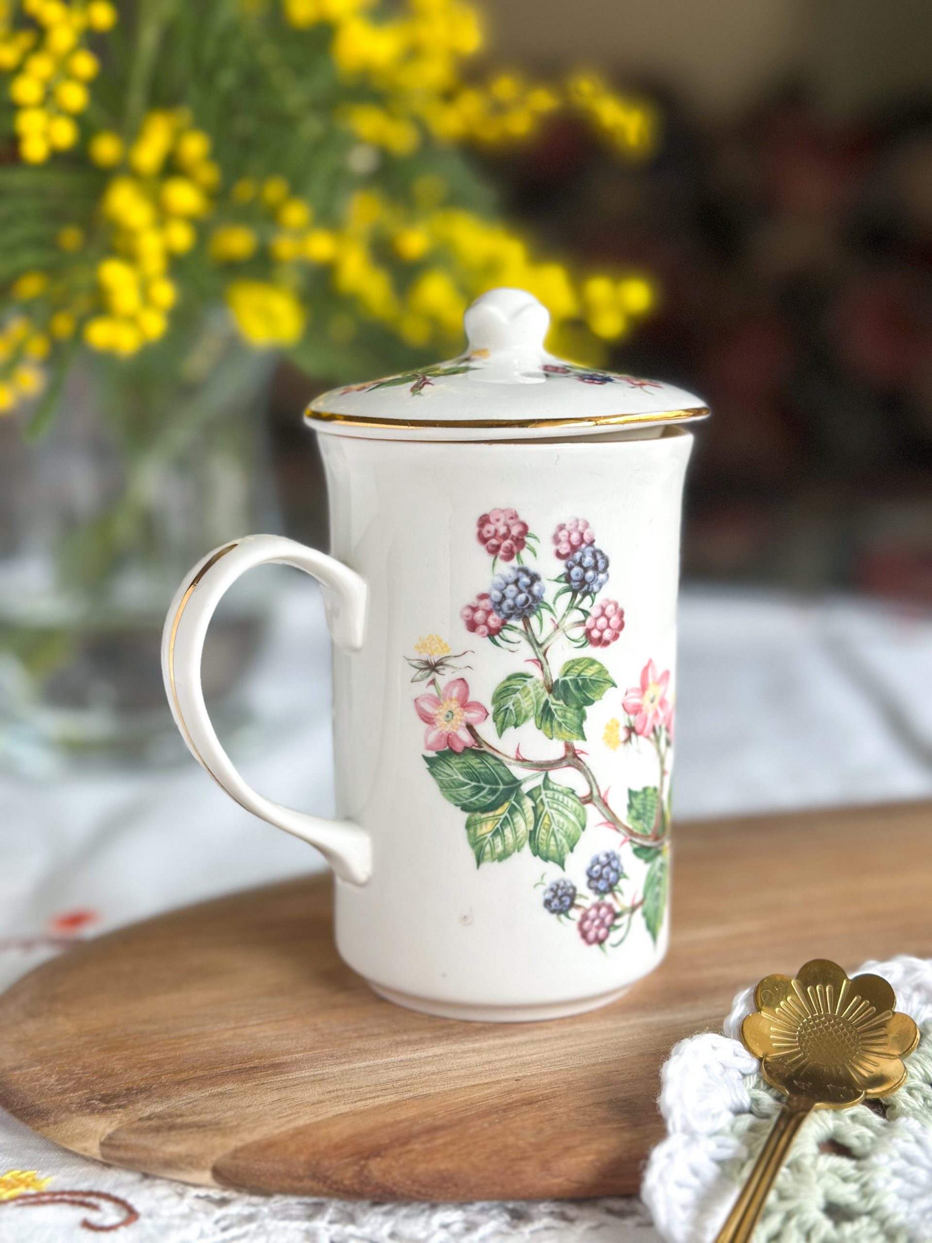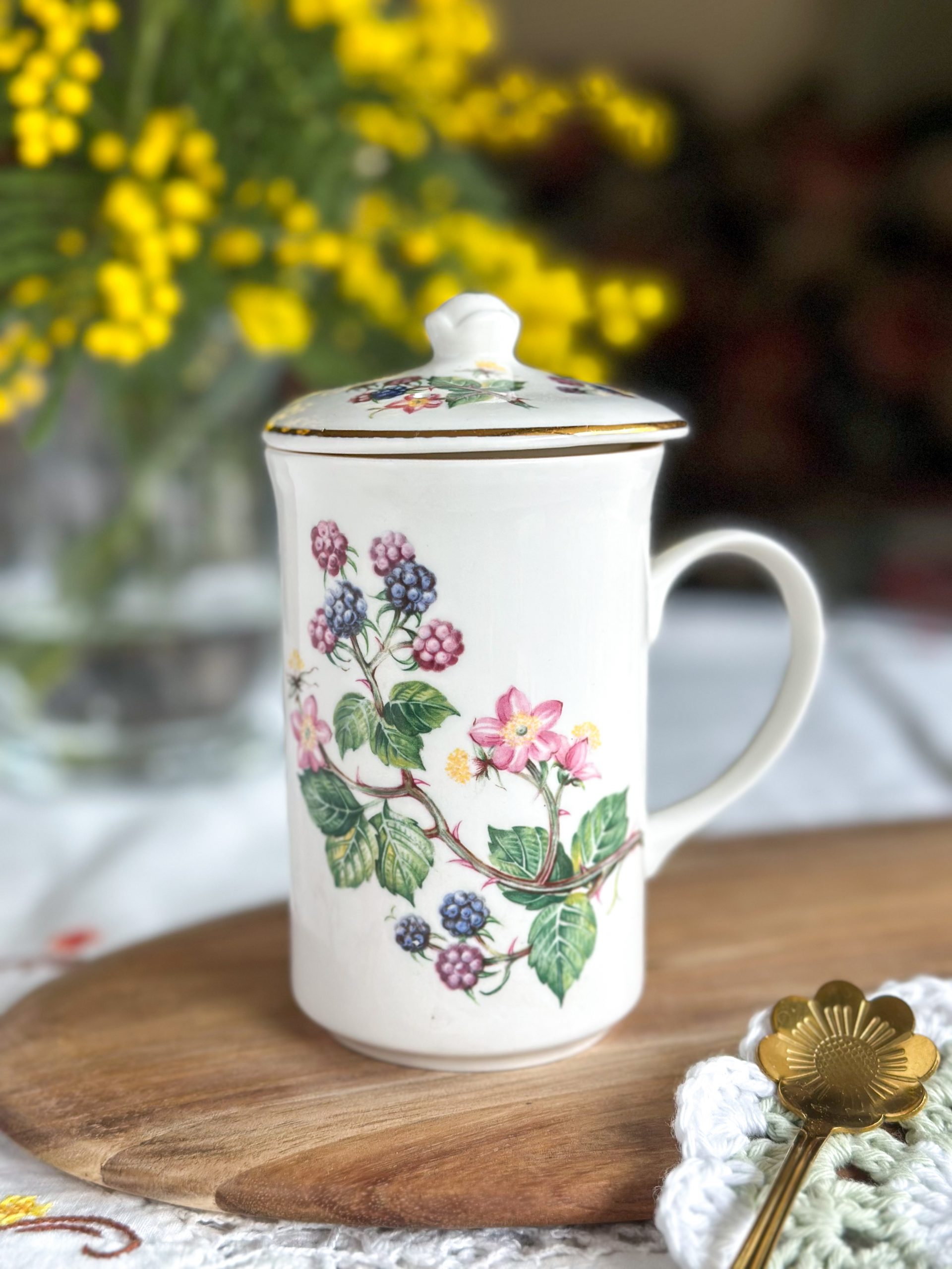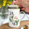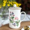 Une très belle tasse en porcelaine anglaise pour vos pauses thé ou café ! On adore ses jolis dessins de mûres avec leur feuillages, et son couvercle assorti parfait pour garder votre boisson au chaud.