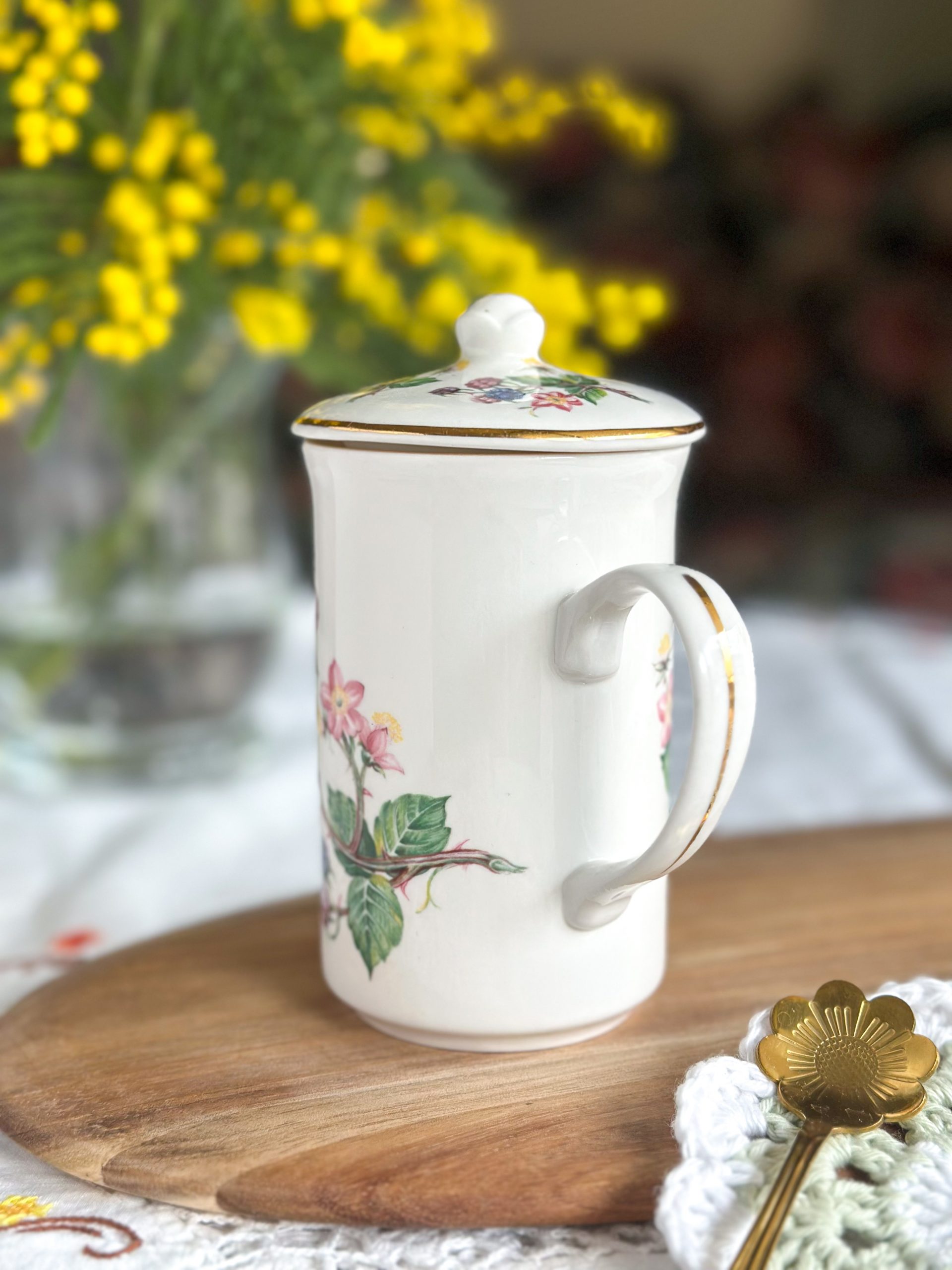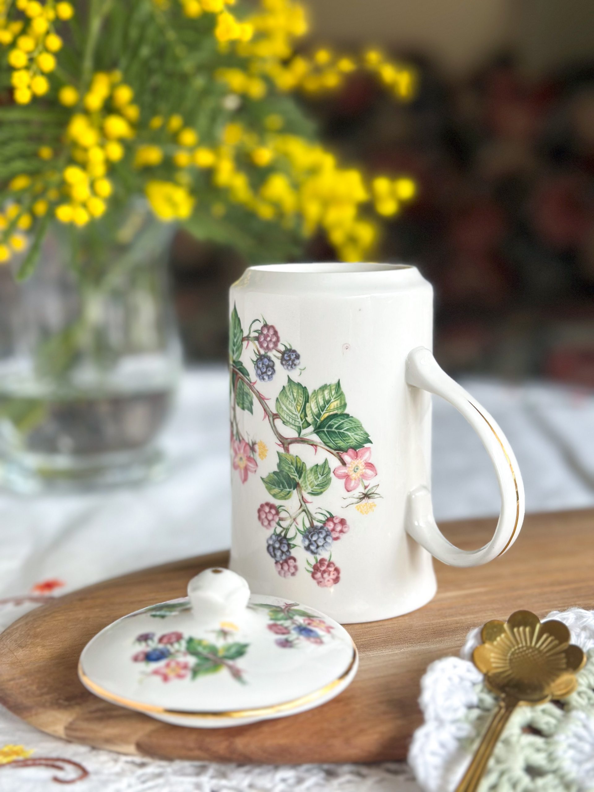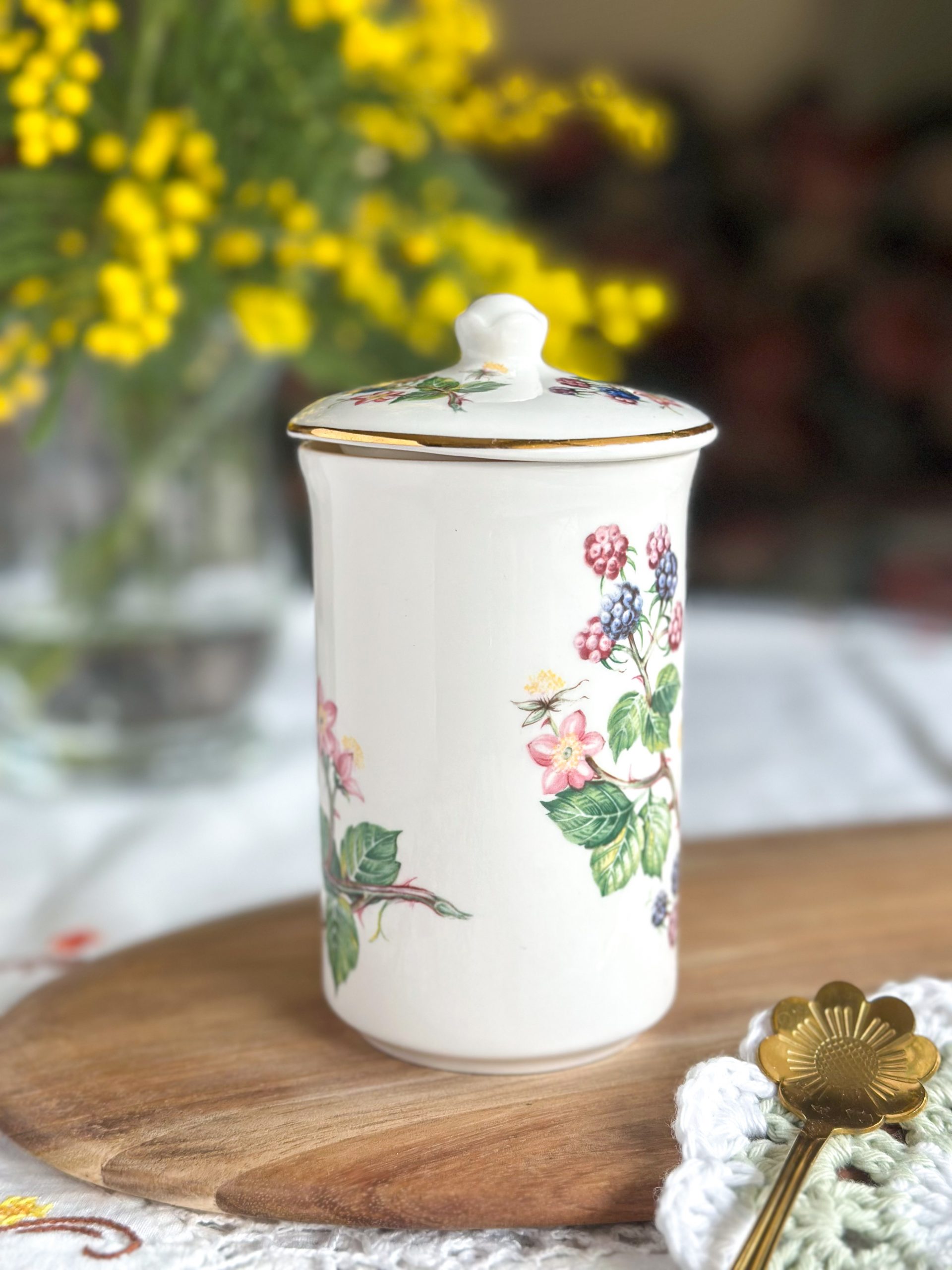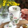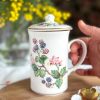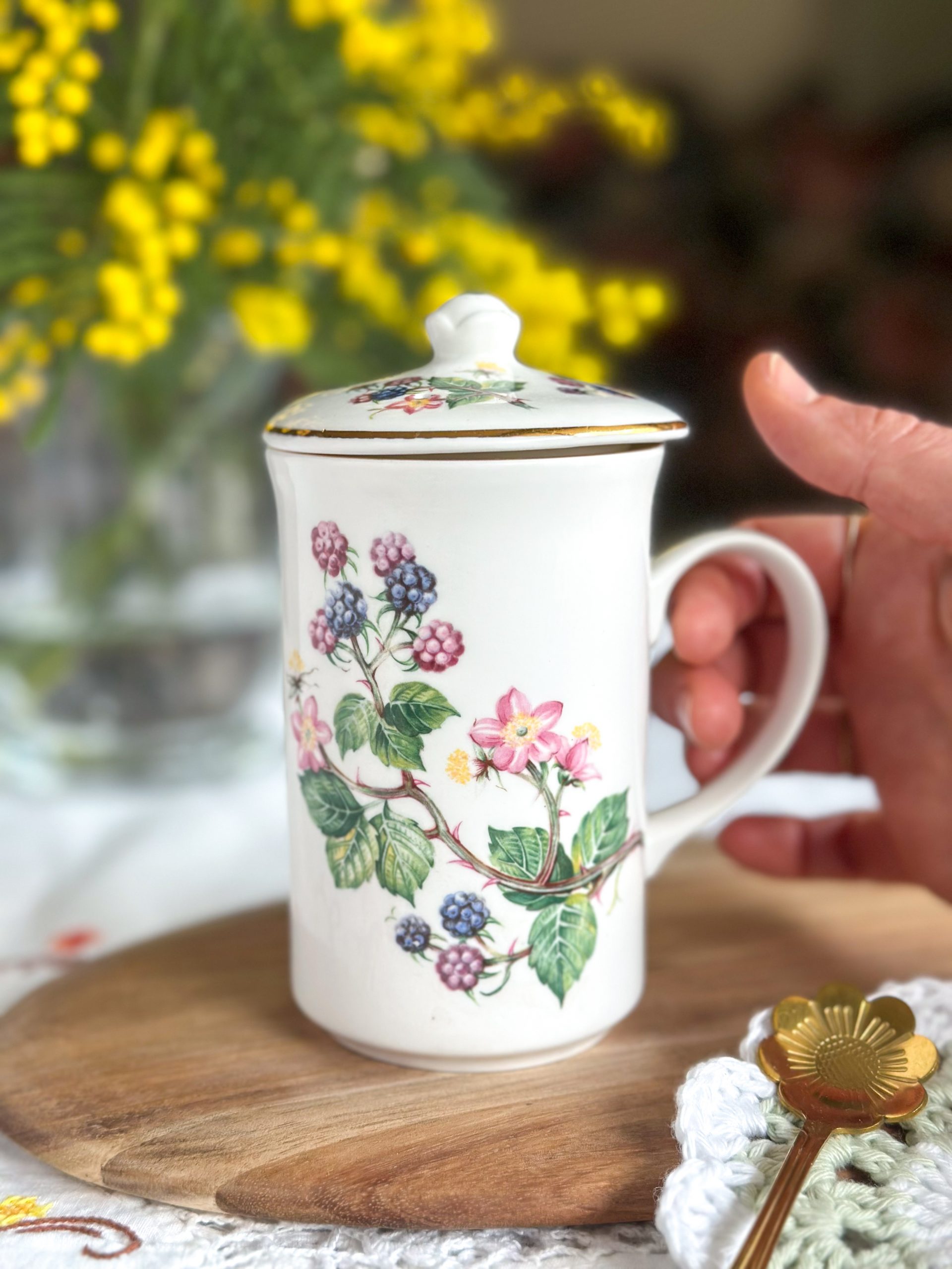 Une très belle tasse en porcelaine anglaise pour vos pauses thé ou café ! On adore ses jolis dessins de mûres avec leur feuillages, et son couvercle assorti parfait pour garder votre boisson au chaud.