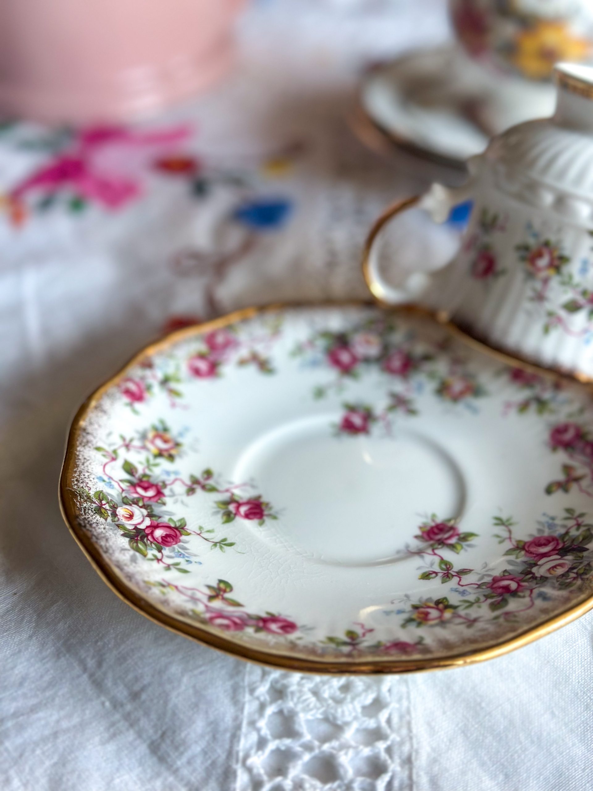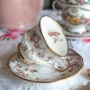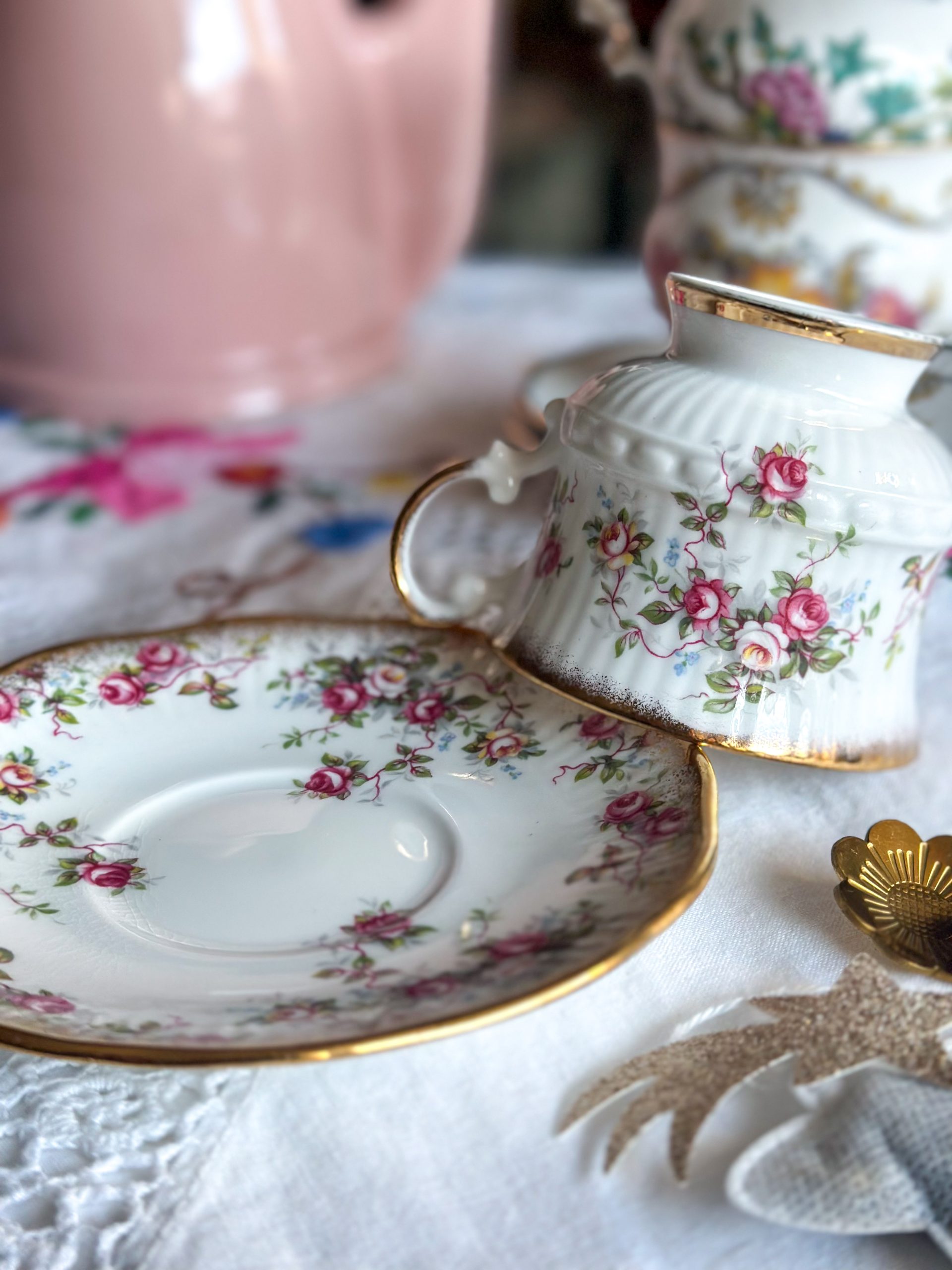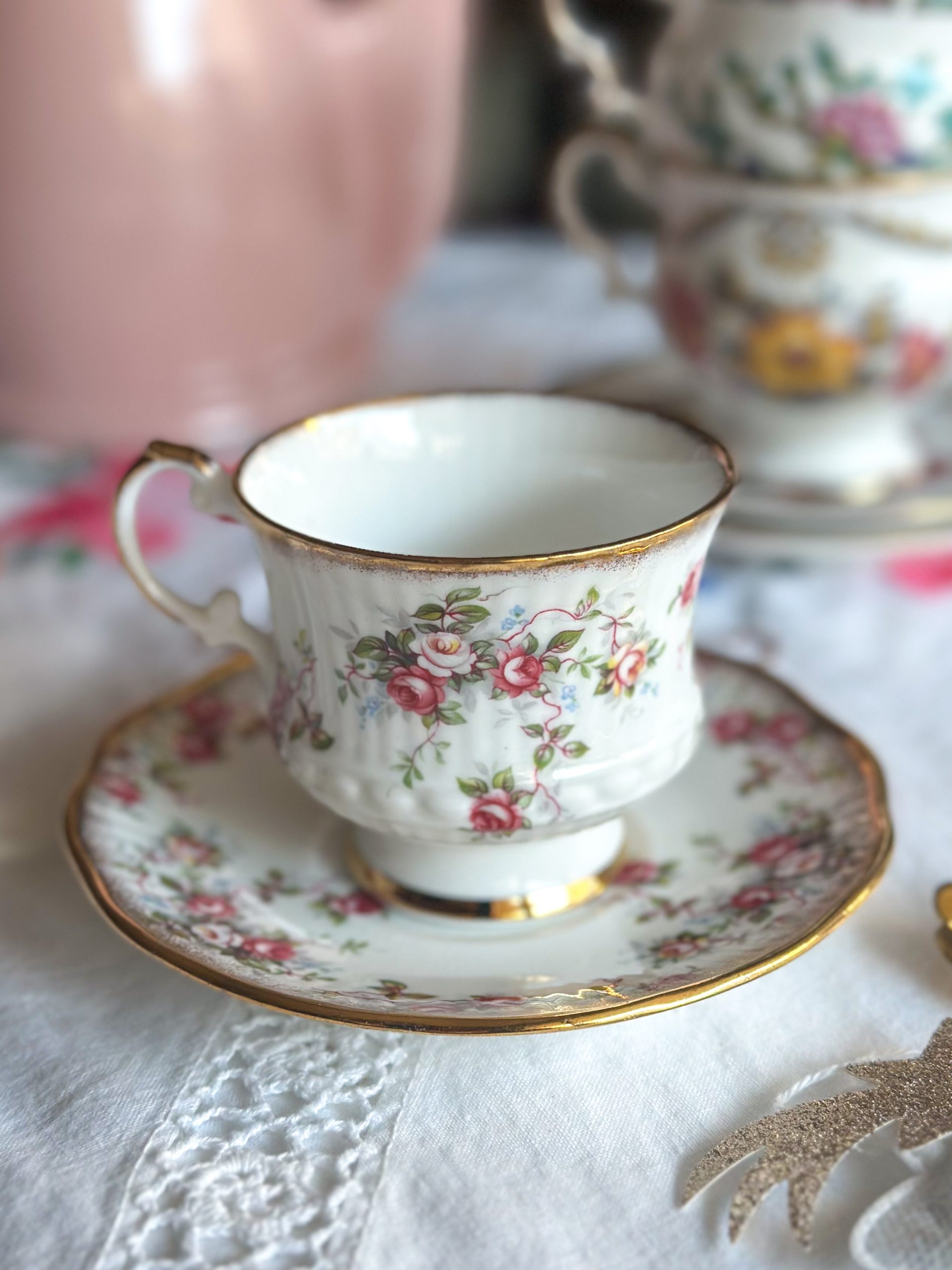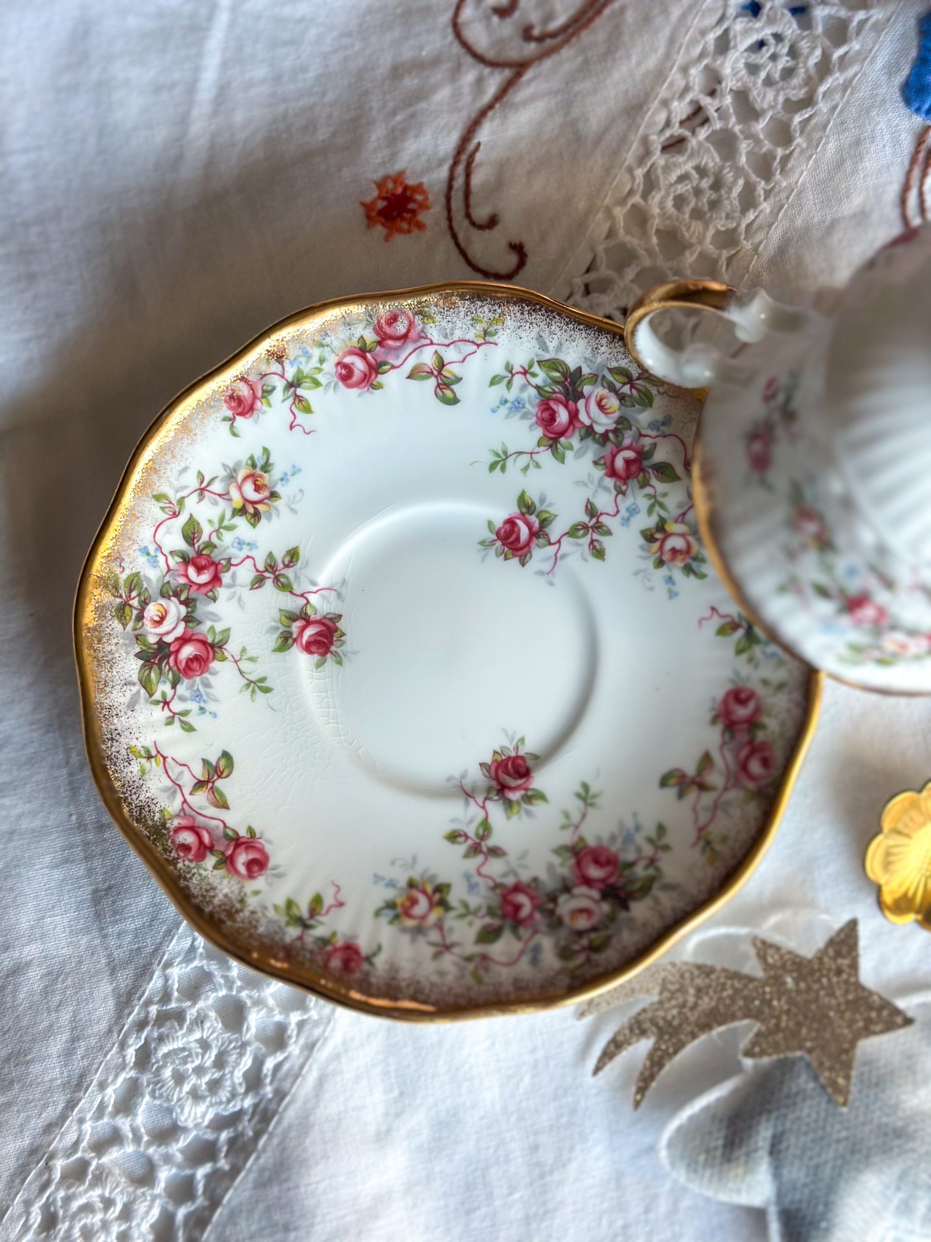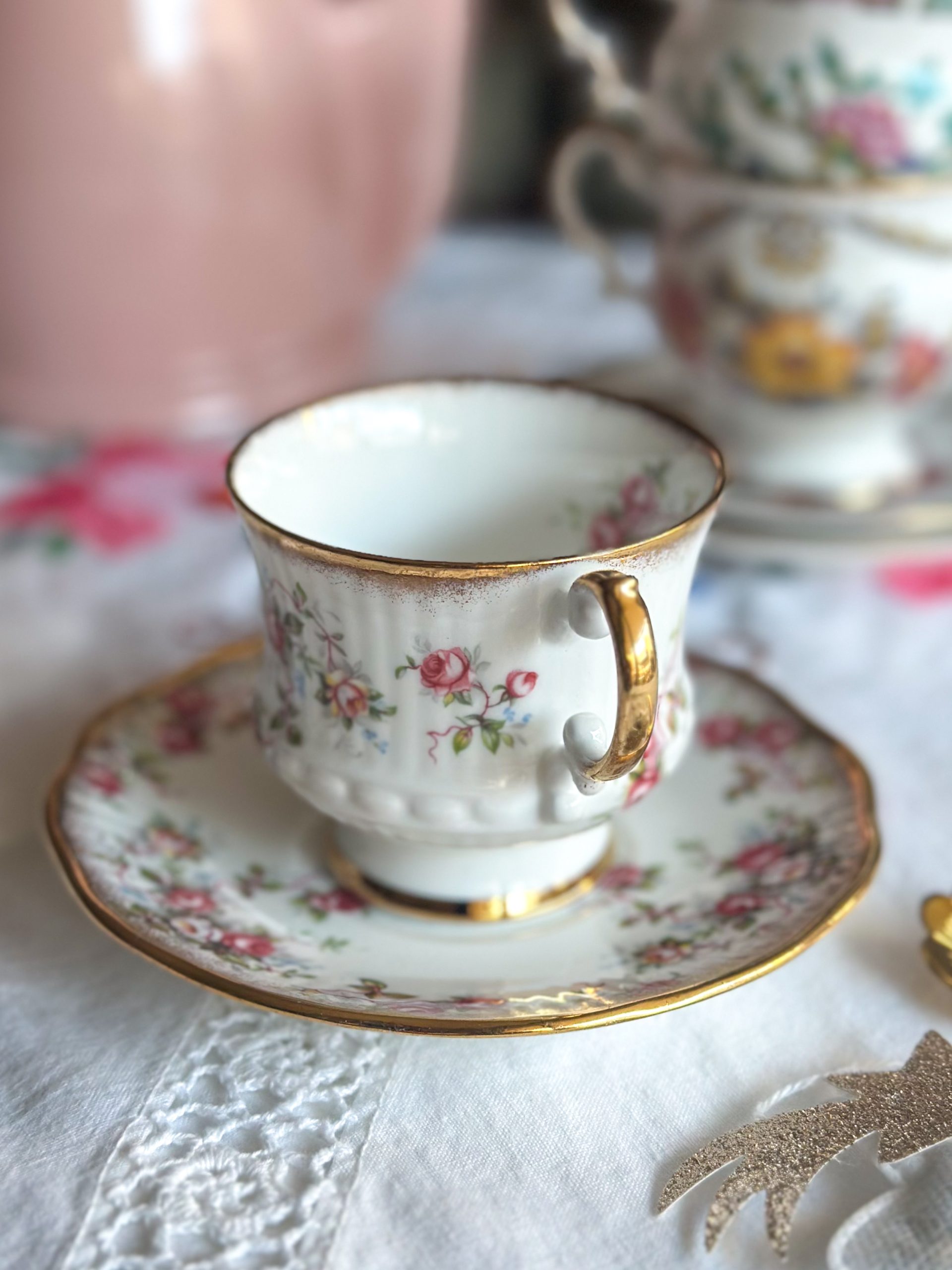 Magnifique tasse anglaise aux jolis dessins de petites roses ! On adore son motif délicat, et sa jolie forme élégante réhaussée par de beaux liserés dorés. C’est la tasse parfaite pour une pause thé ou café pleine de poésie !