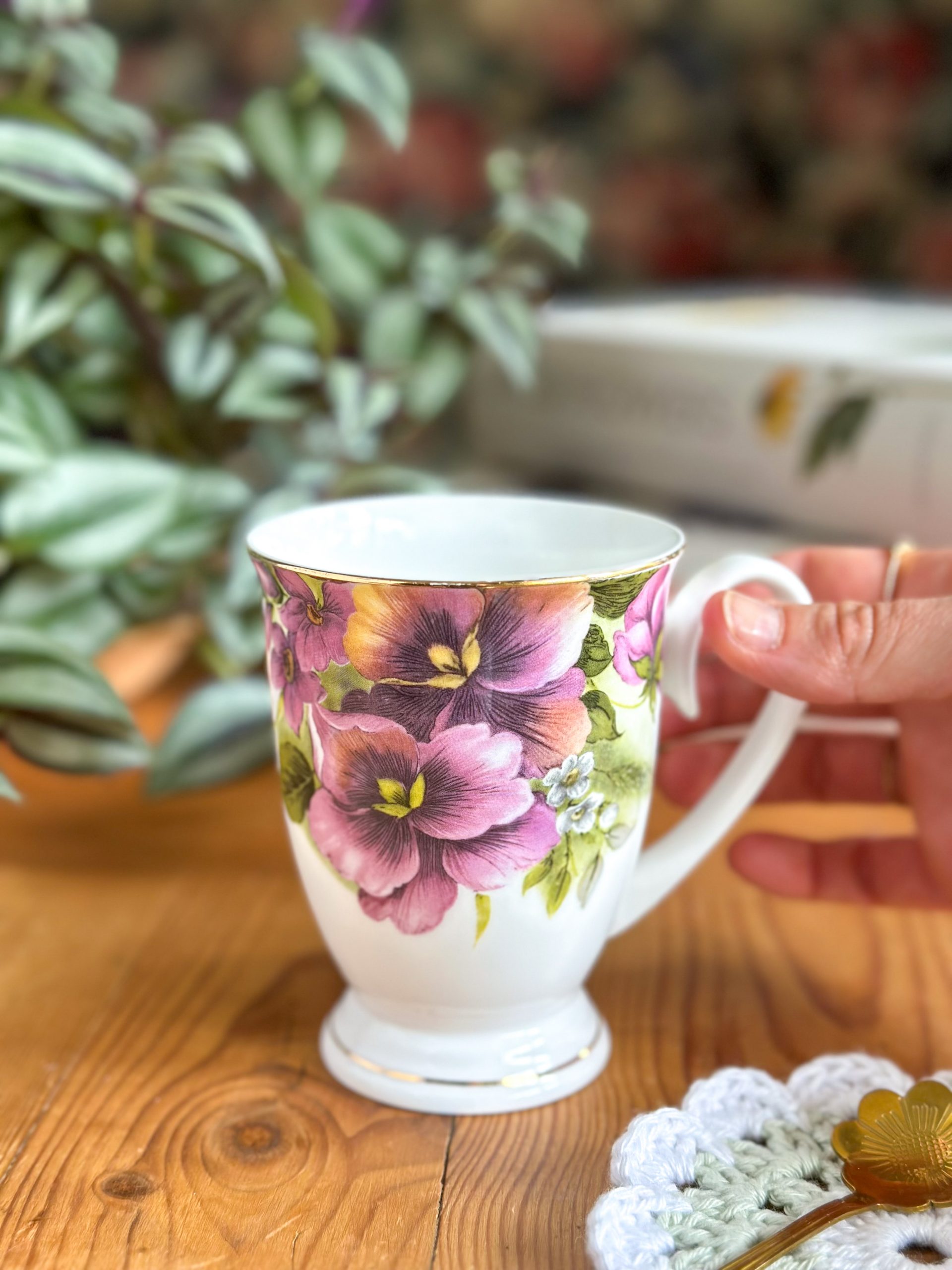 Une superbe tasse anglaise ! Coup de coeur pour cette tasse en porcelaine fine avec ses jolies pensées violettes et ses liserés dorés.