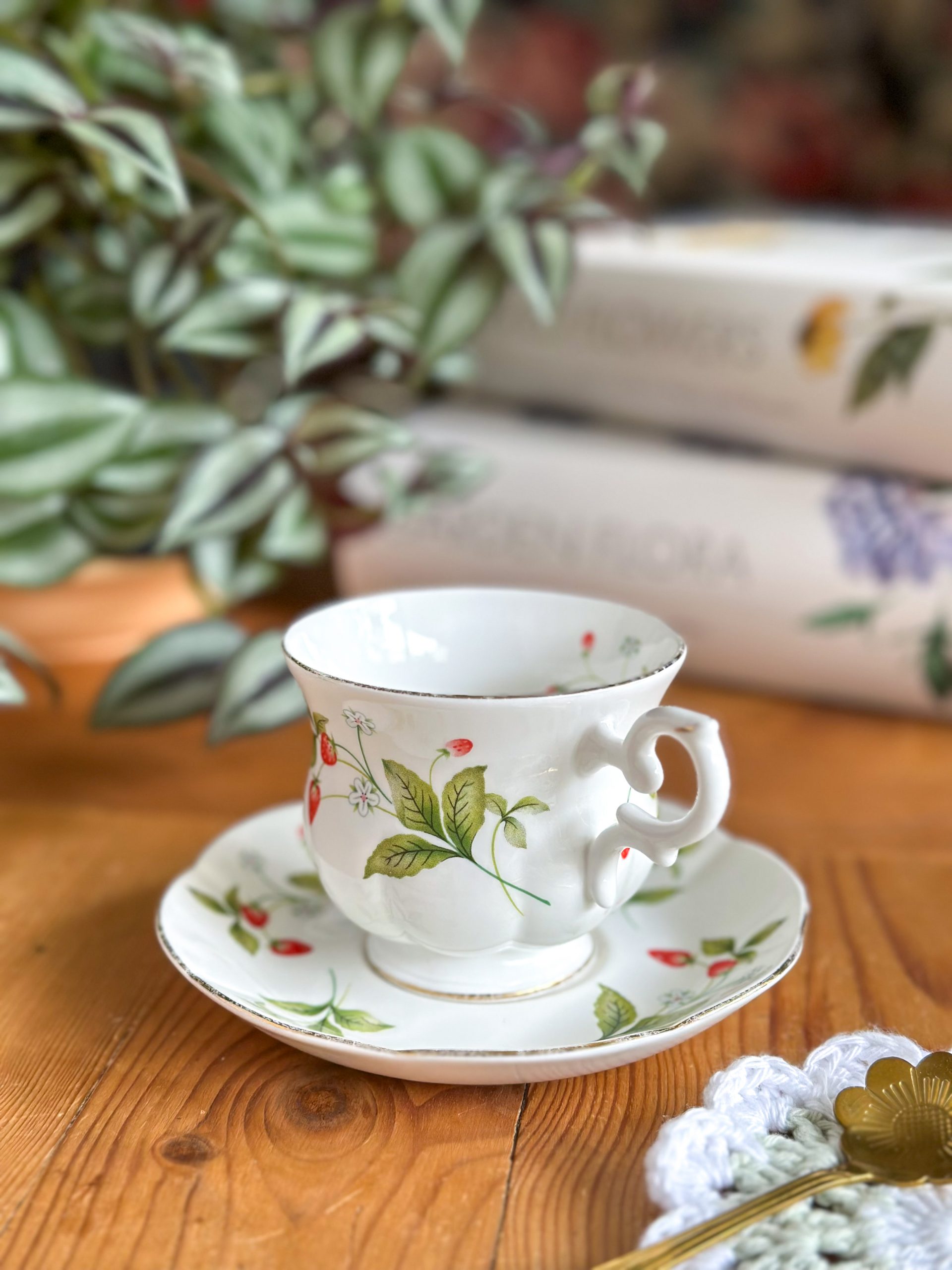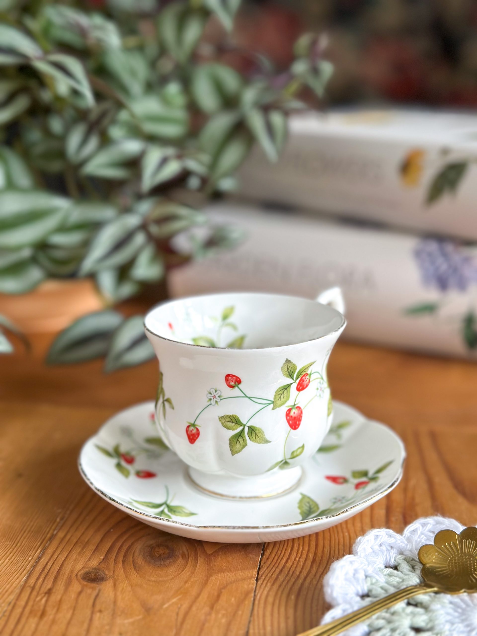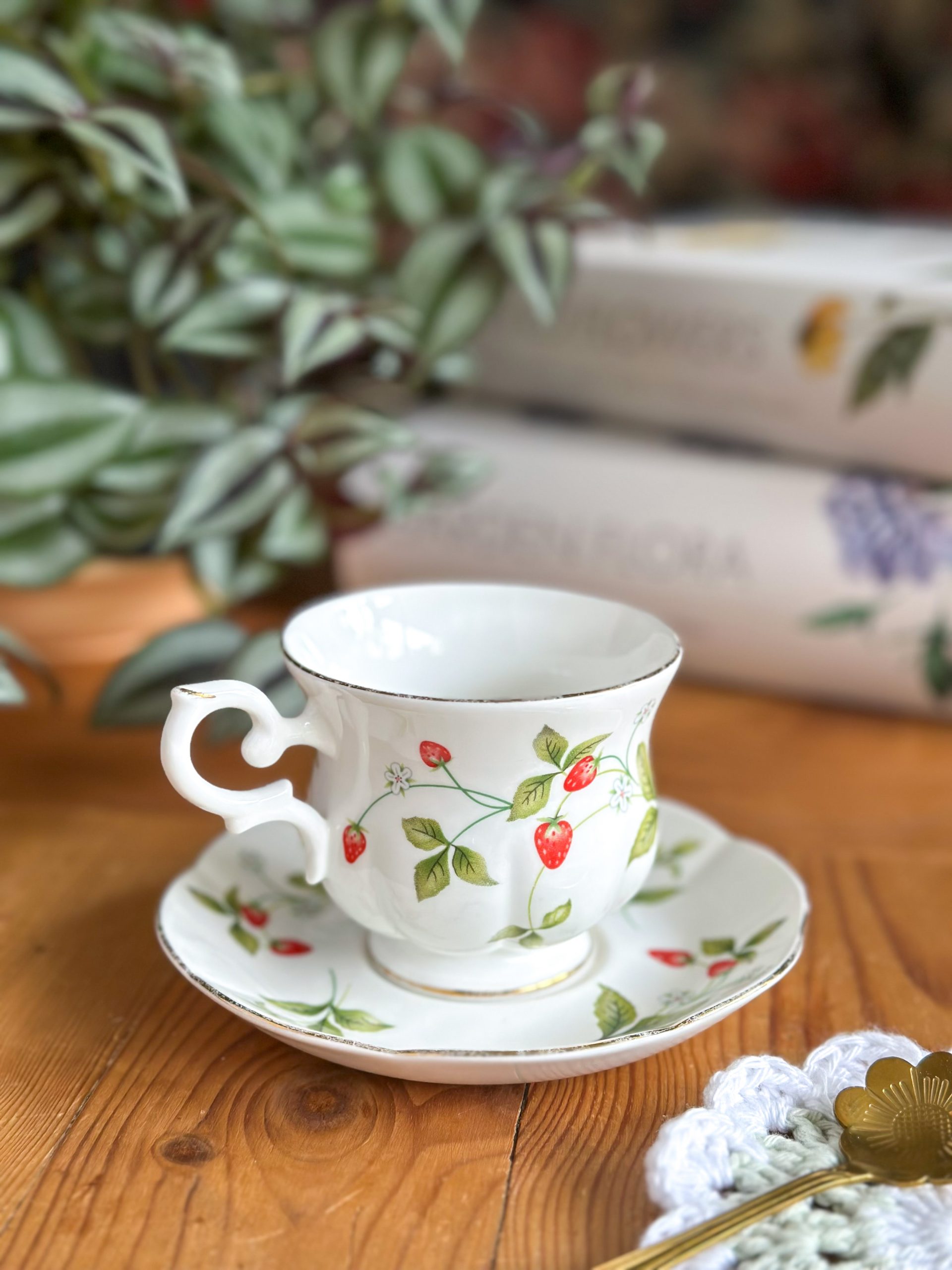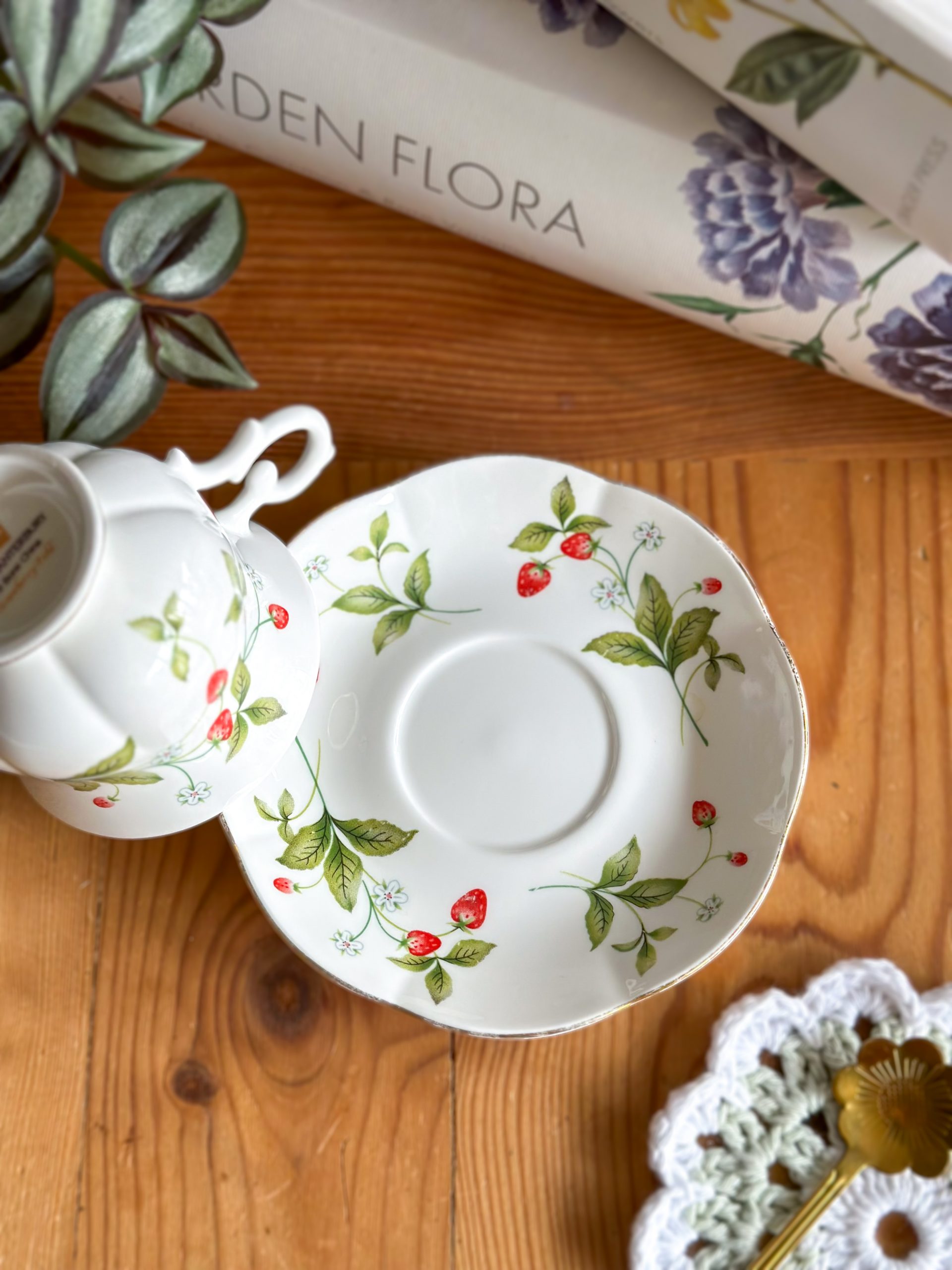 Magnifique tasse anglaise aux jolis dessins de fraises et leurs feuillages ! On adore son motif délicat, et sa jolie forme élégante réhaussée par de beaux liserés dorés. C’est la tasse parfaite pour une pause thé ou café pleine de poésie !