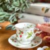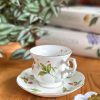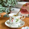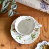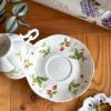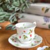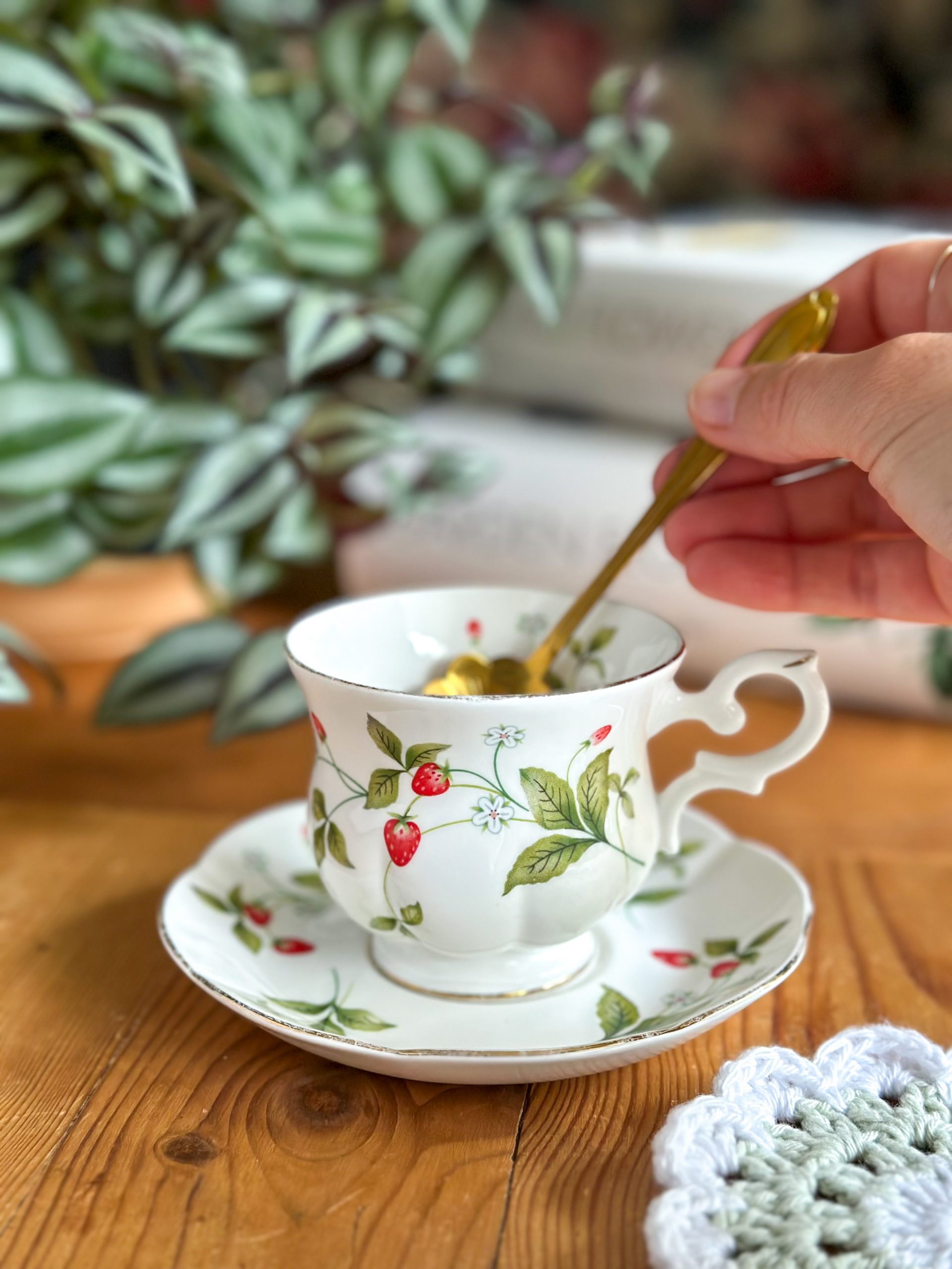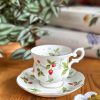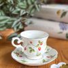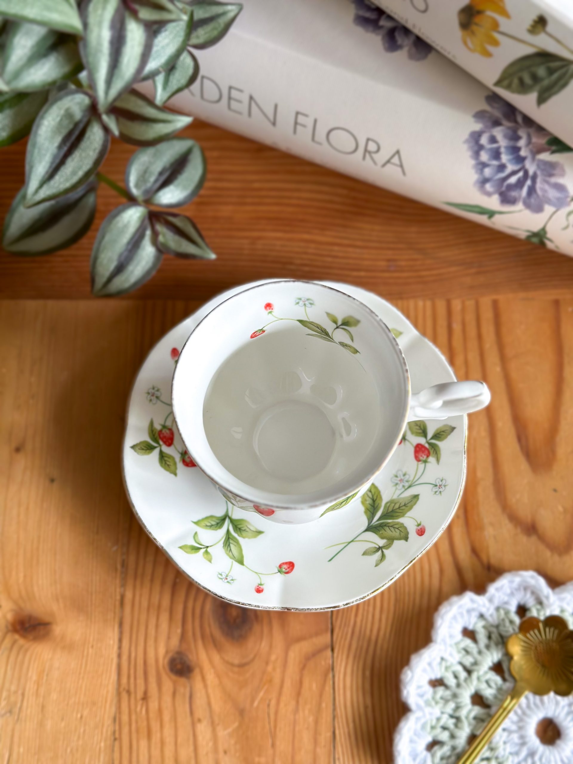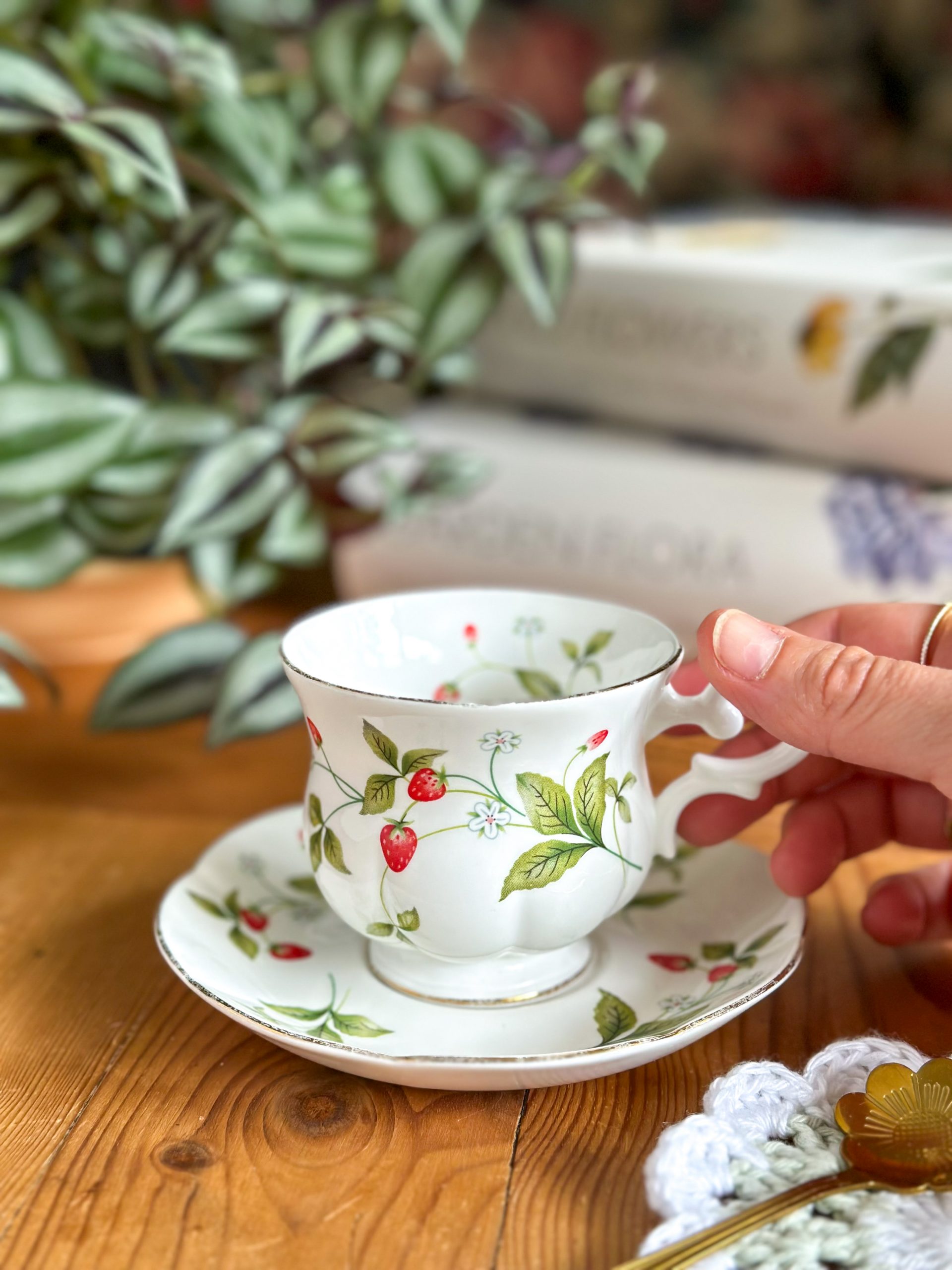Magnifique tasse anglaise aux jolis dessins de fraises et leurs feuillages ! On adore son motif délicat, et sa jolie forme élégante réhaussée par de beaux liserés dorés. C’est la tasse parfaite pour une pause thé ou café pleine de poésie !