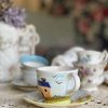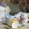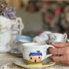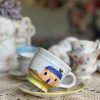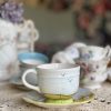 Cette tasse en céramique peinte à la main a une jolie sous-tasse assortie.