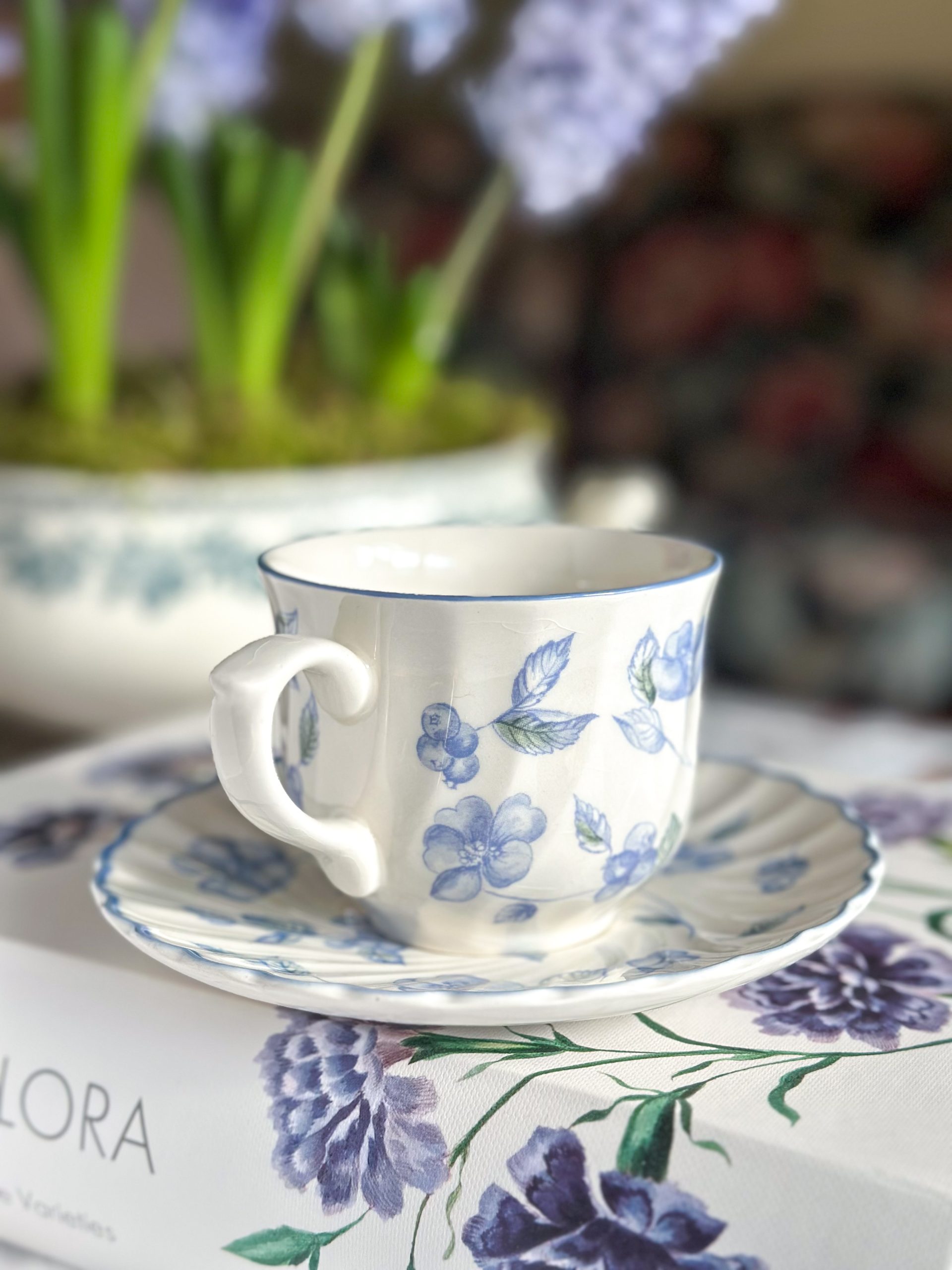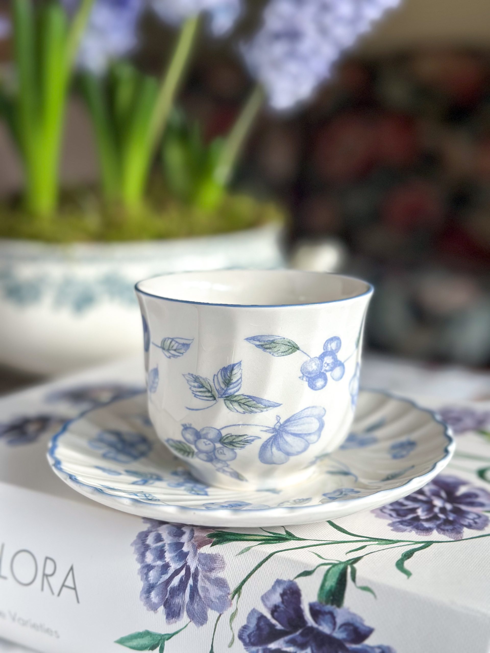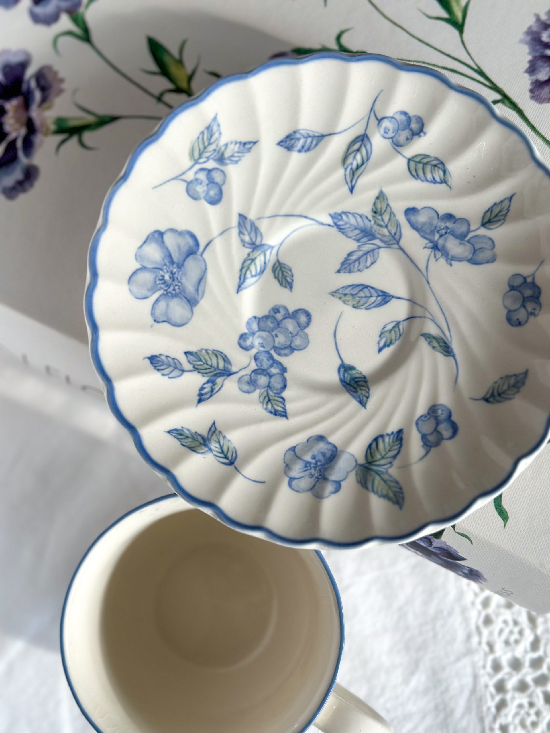 Magnifique tasse anglaise aux jolis dessins bleus mêlant fleurs et baies ! On adore la délicatesse de ses motifs et sa forme élégante en porcelaine torse. Accompagnée de sa sous-tasse assortie, cete tasse à thé anglaise vous fera passé un moment rempli de douceur et de poésie.