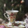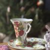 Magnifique tasse fleurie en porcelaine ! On aime beaucoup ses imprimés de fleurs colorés, aux jolis tons rouges orangés. Elle est accompagnée de son assiette assortie, pour une jolie pause thé gourmande. Sa porcelaine est joliment travaillée et réhaussée de liserés dorés.
