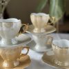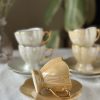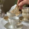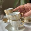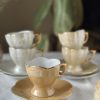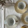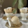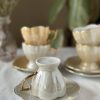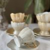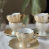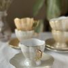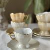Superbe tasse à café nacrée ! Un petit bijou pour un moment café tout en poésie. Cette tasse à café vintage signée Geneviève Lethu est très élégante, avec sa porcelaine nacrée et sa jolie forme sur pied. Ses dorures sont en très bel état, et sa sous-tasse assortie en forme de fleur vient la compléter.