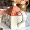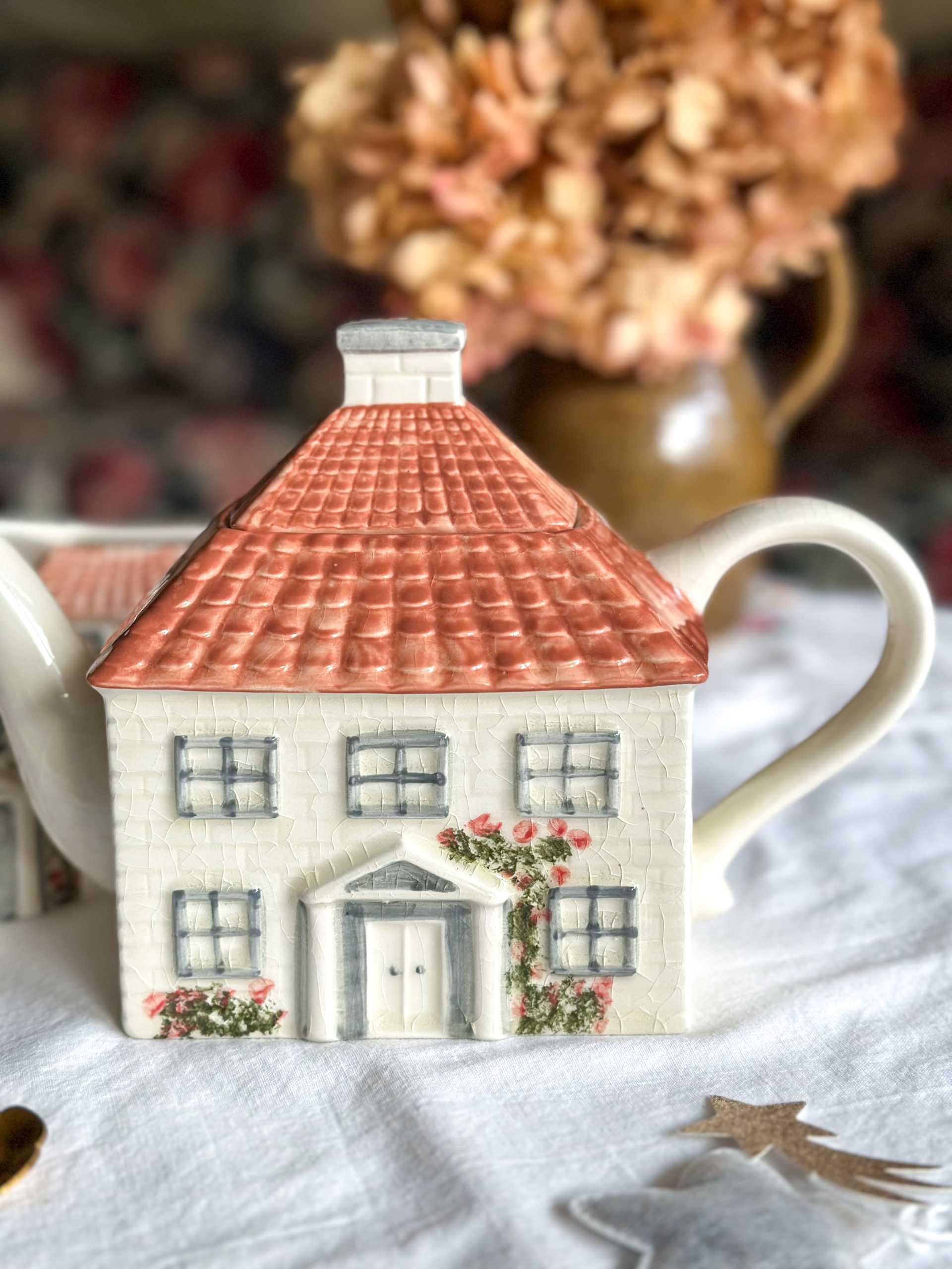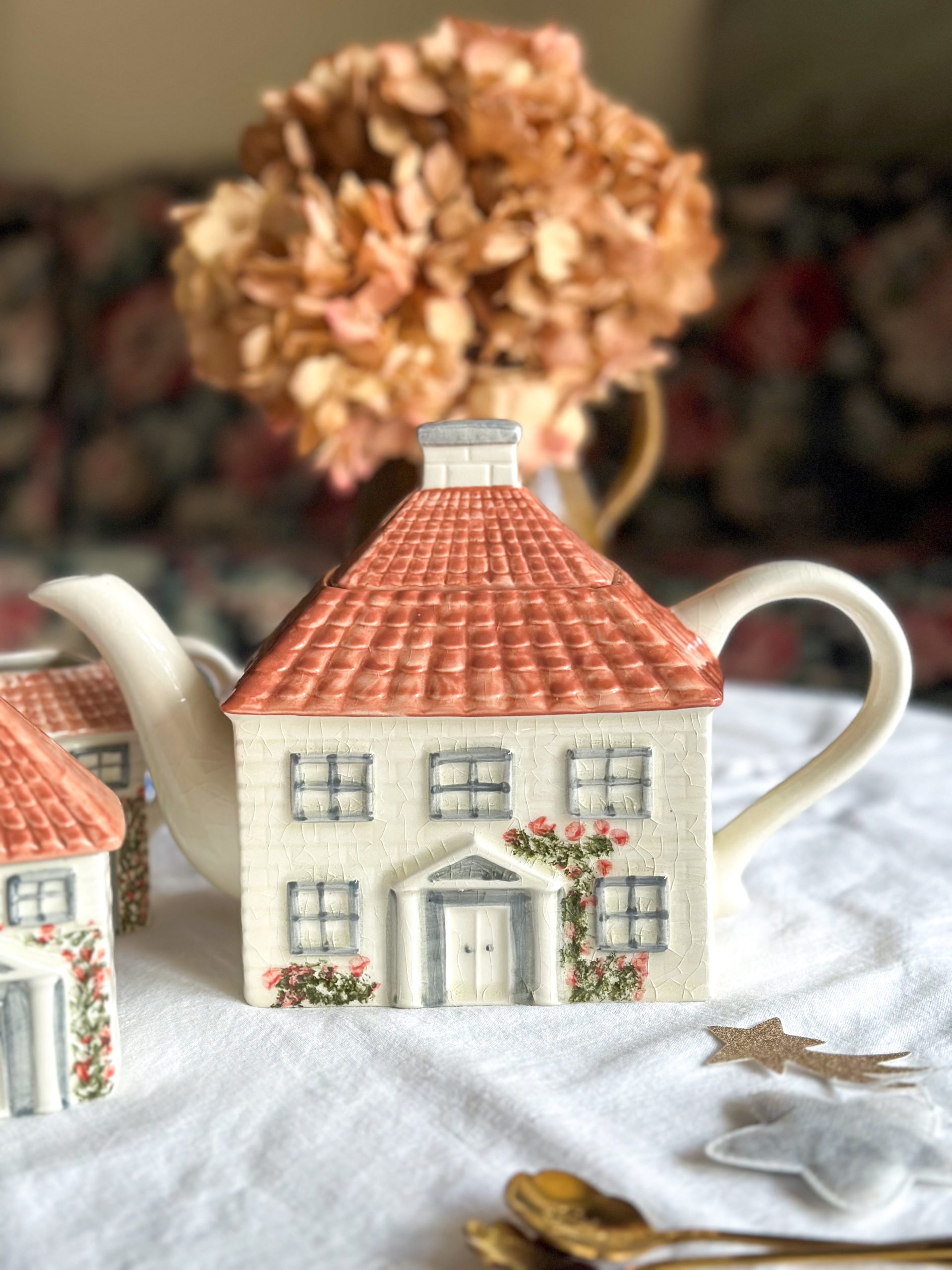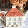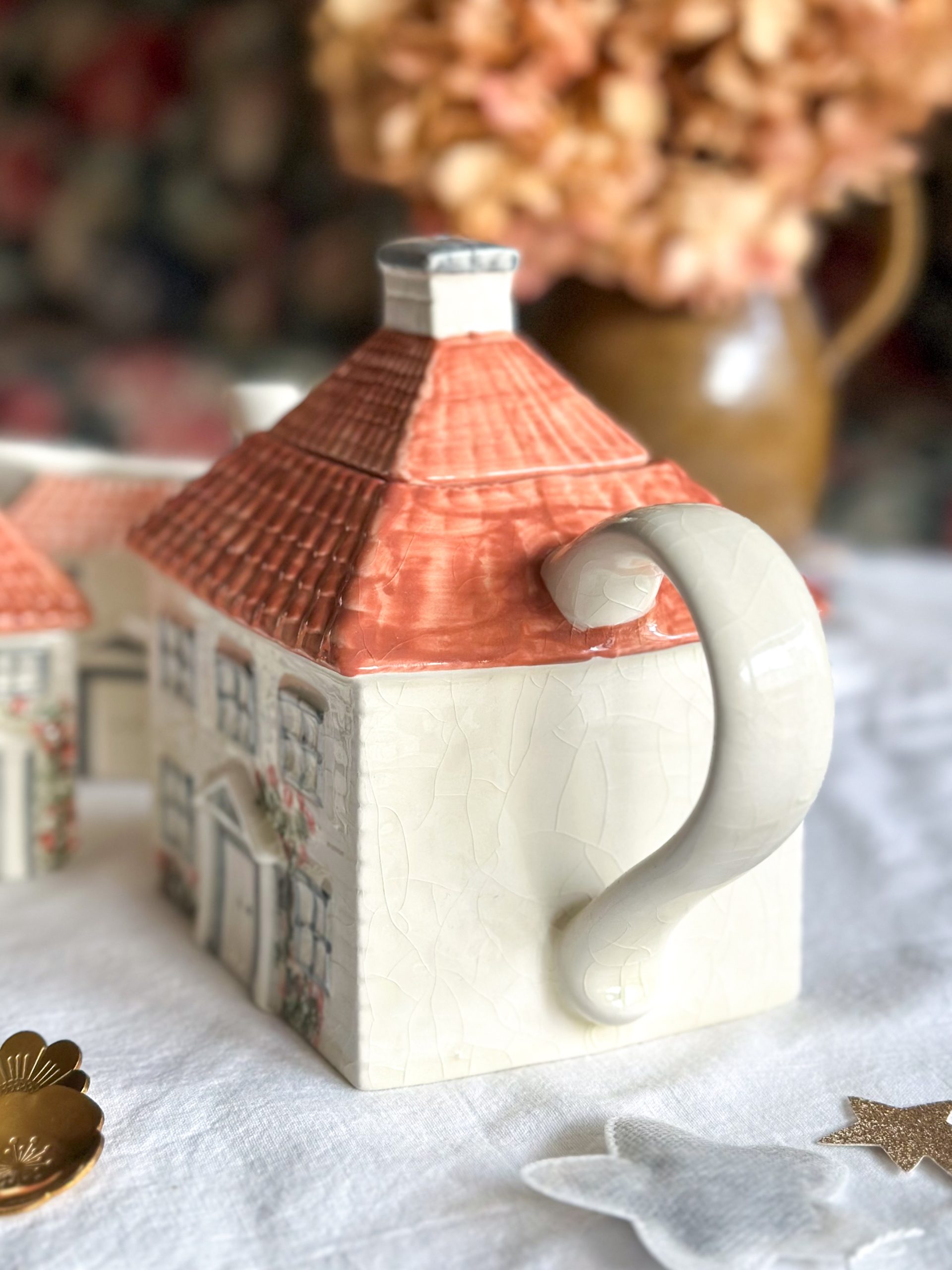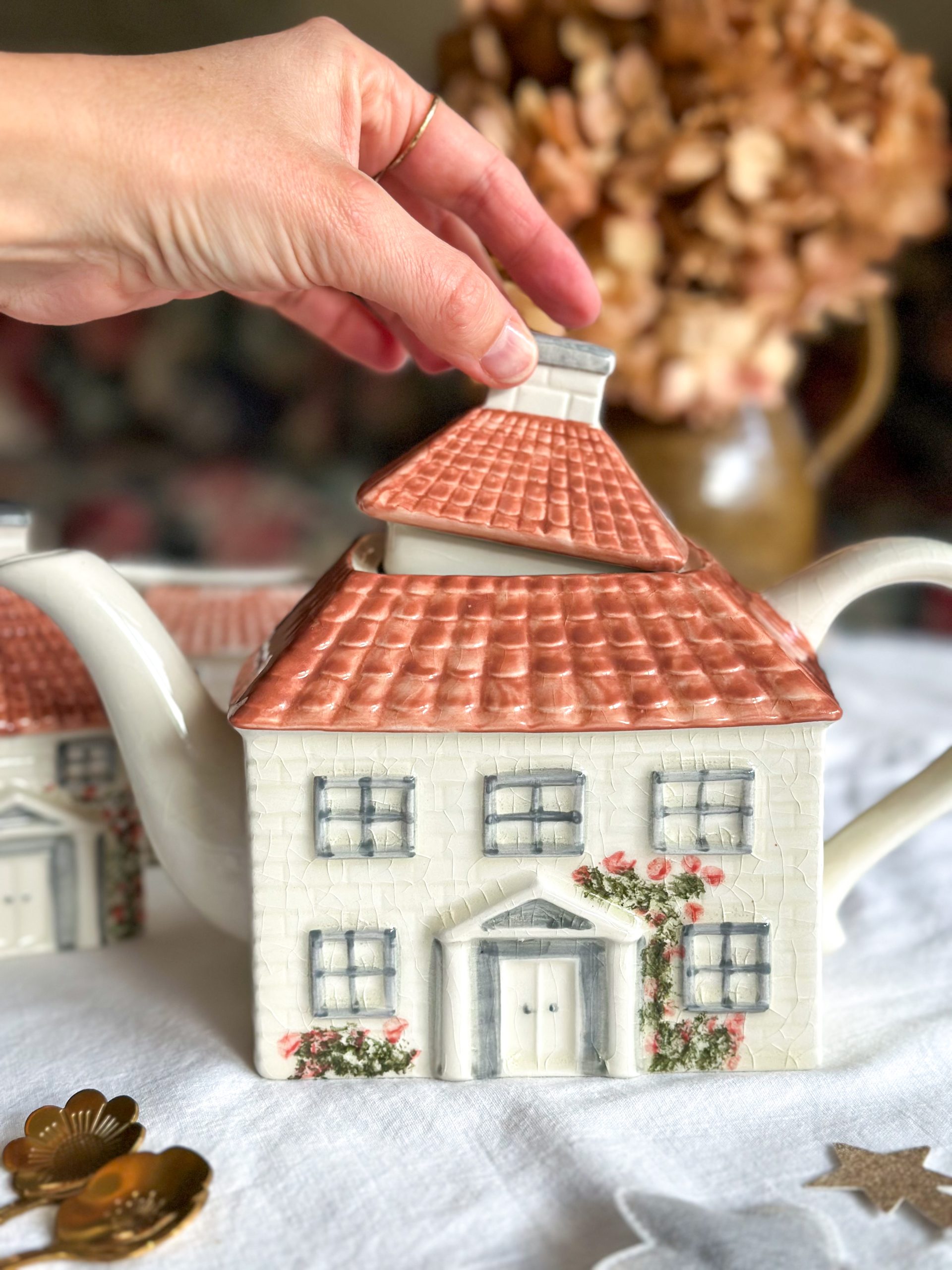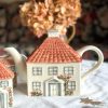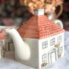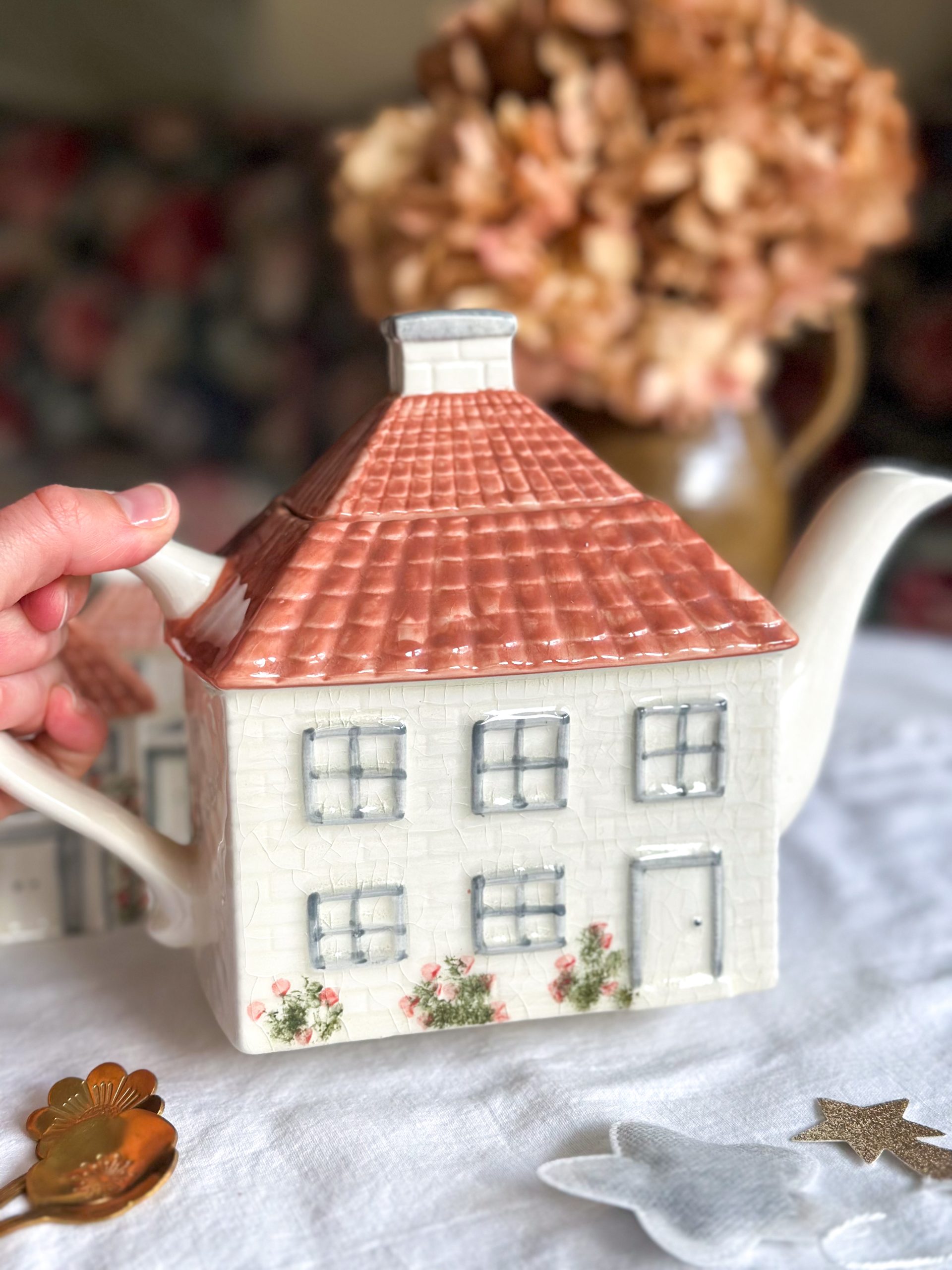 Coup de coeur pour cette théière ! Avec sa forme de joli cottage anglais, cette théière ravira les fans de teatime et de décoration cottagecore. Le toit se transforme en couvercle, le décor est différent des deux côtés de la théière : un petit cottage anglais avec de beaux parterres fleuris et un rosier grimpant à l’entrée. Une vraie invitation à rêver de campagne anglaise !