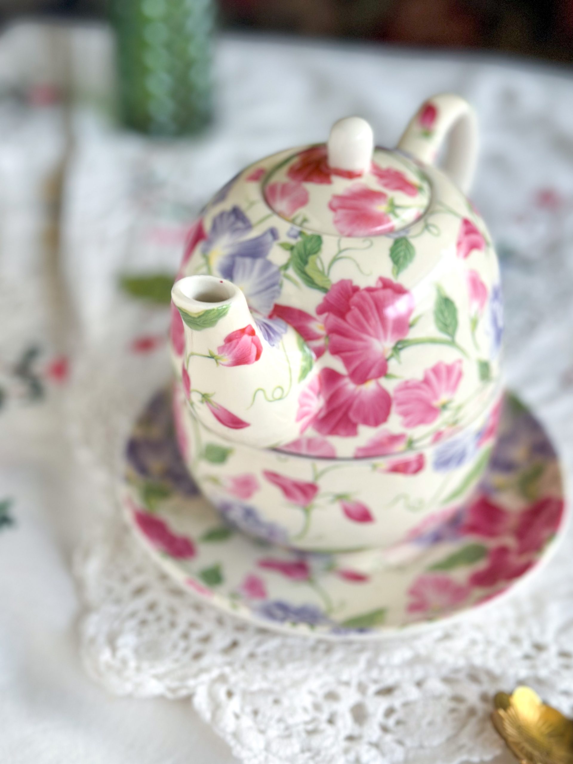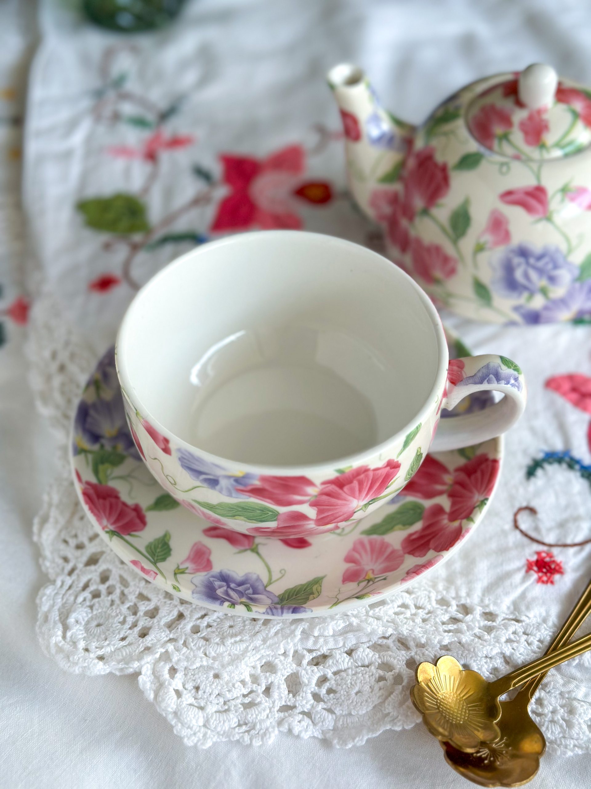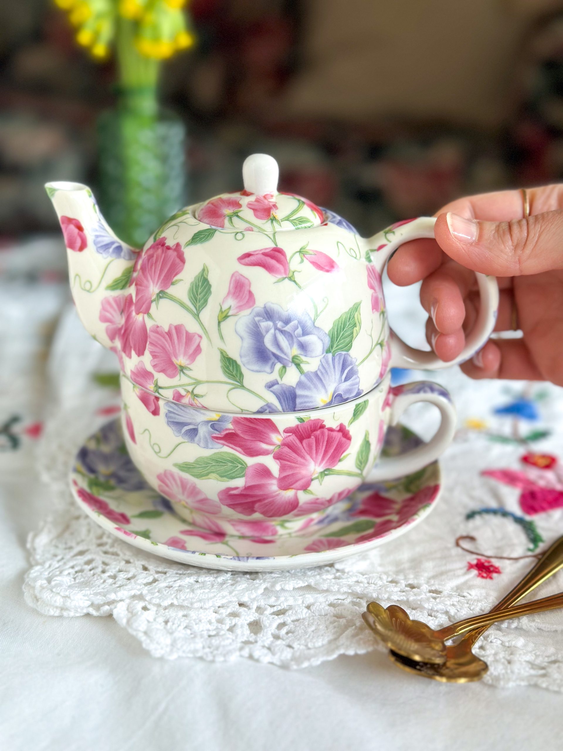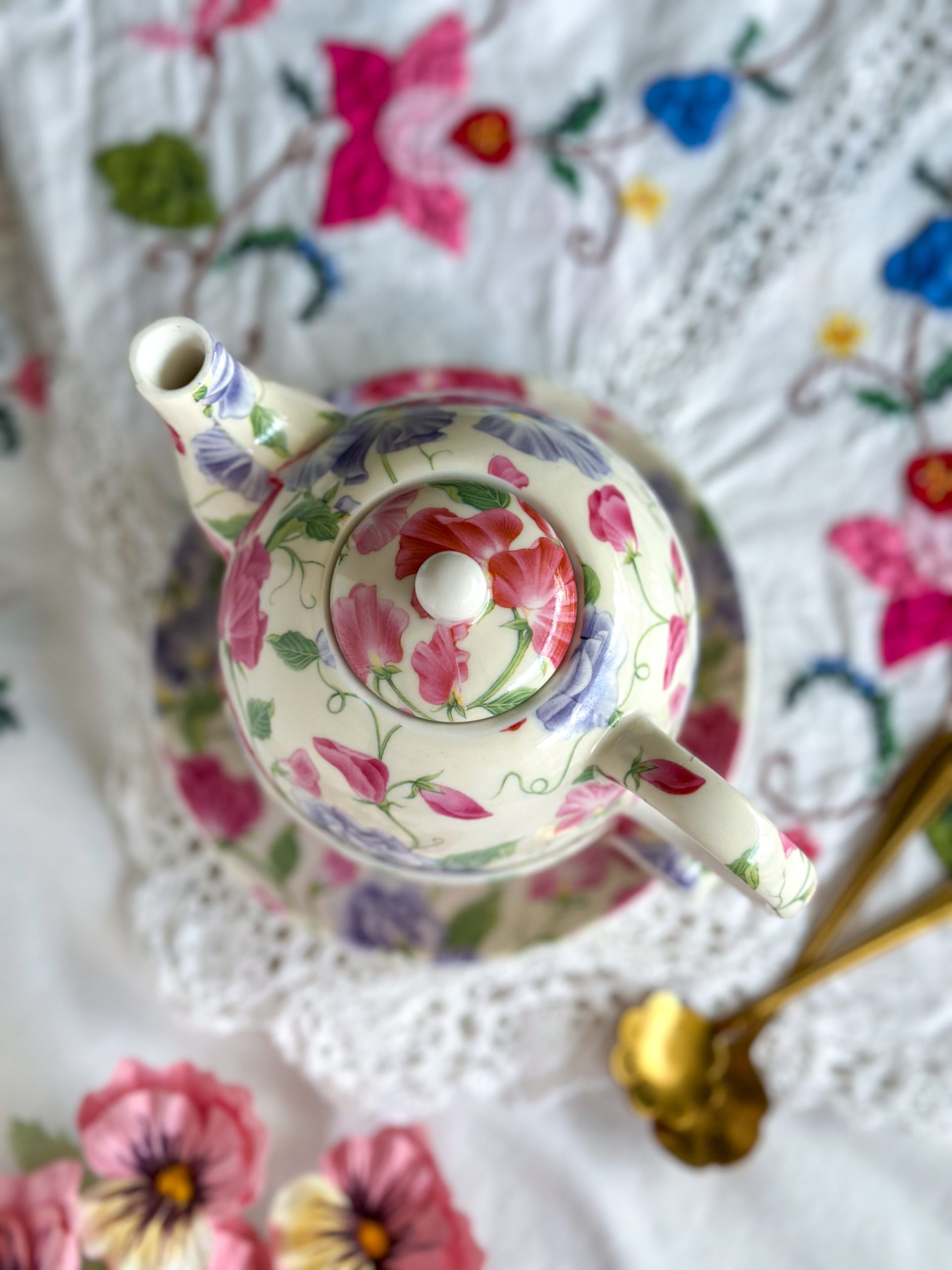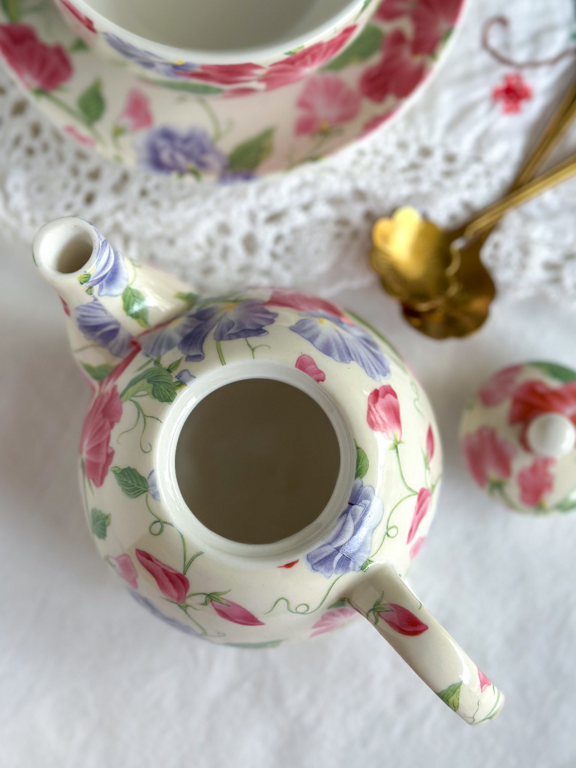 Une très belle théière solitaire en porcelaine ! On adore son superbe décor rempli de pois de senteurs colorés.