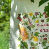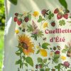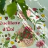 Parsemé de fleurs d’été (tournesols, pivoines, cosmos, boutons d’or, trèfles…), et de paniers remplis des saveurs estivales : citrons, fraises… Inscription » Cueillette d’Été » en haut.